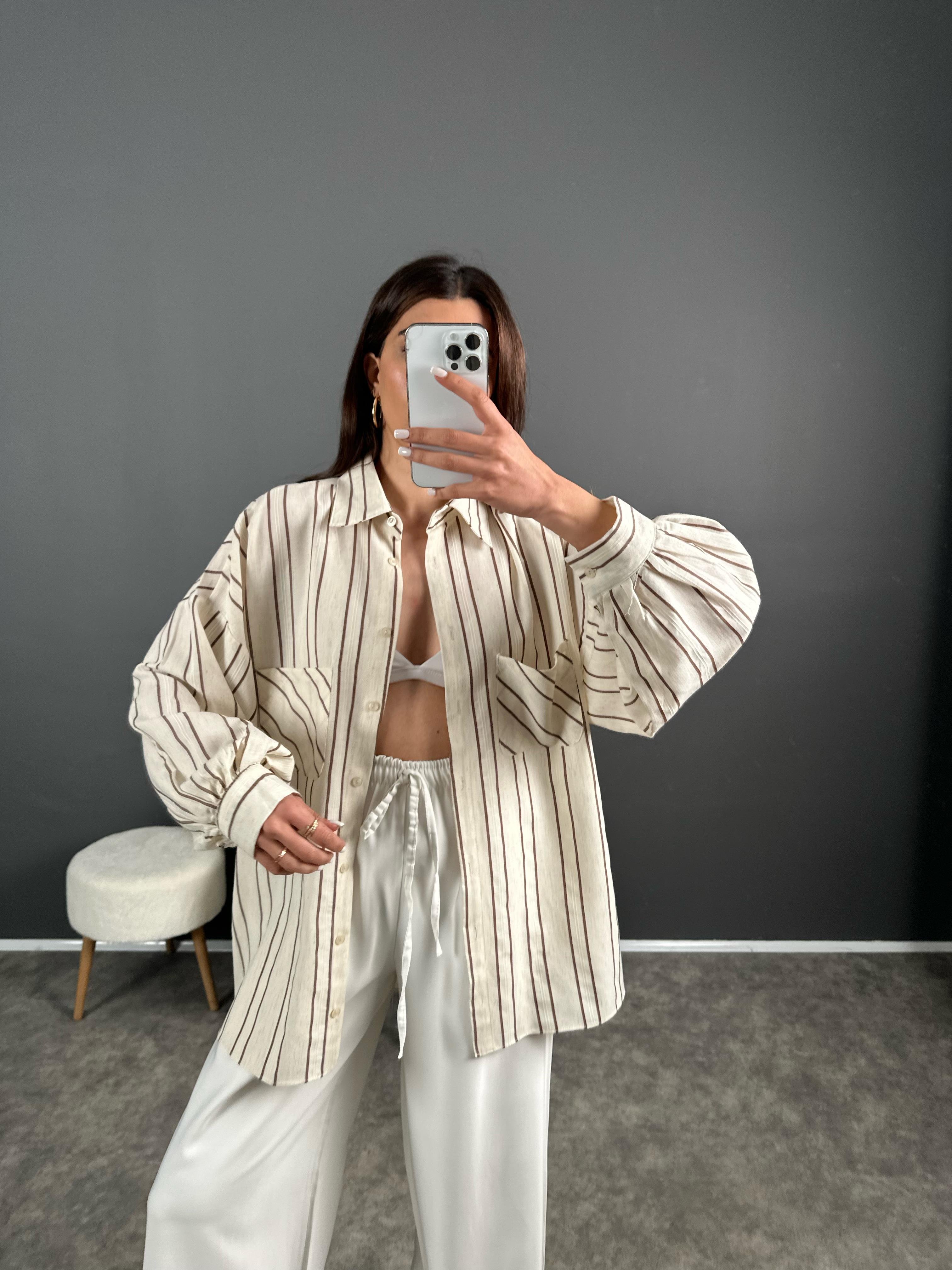 Kahve Çizgili Keten Oversize Gömlek