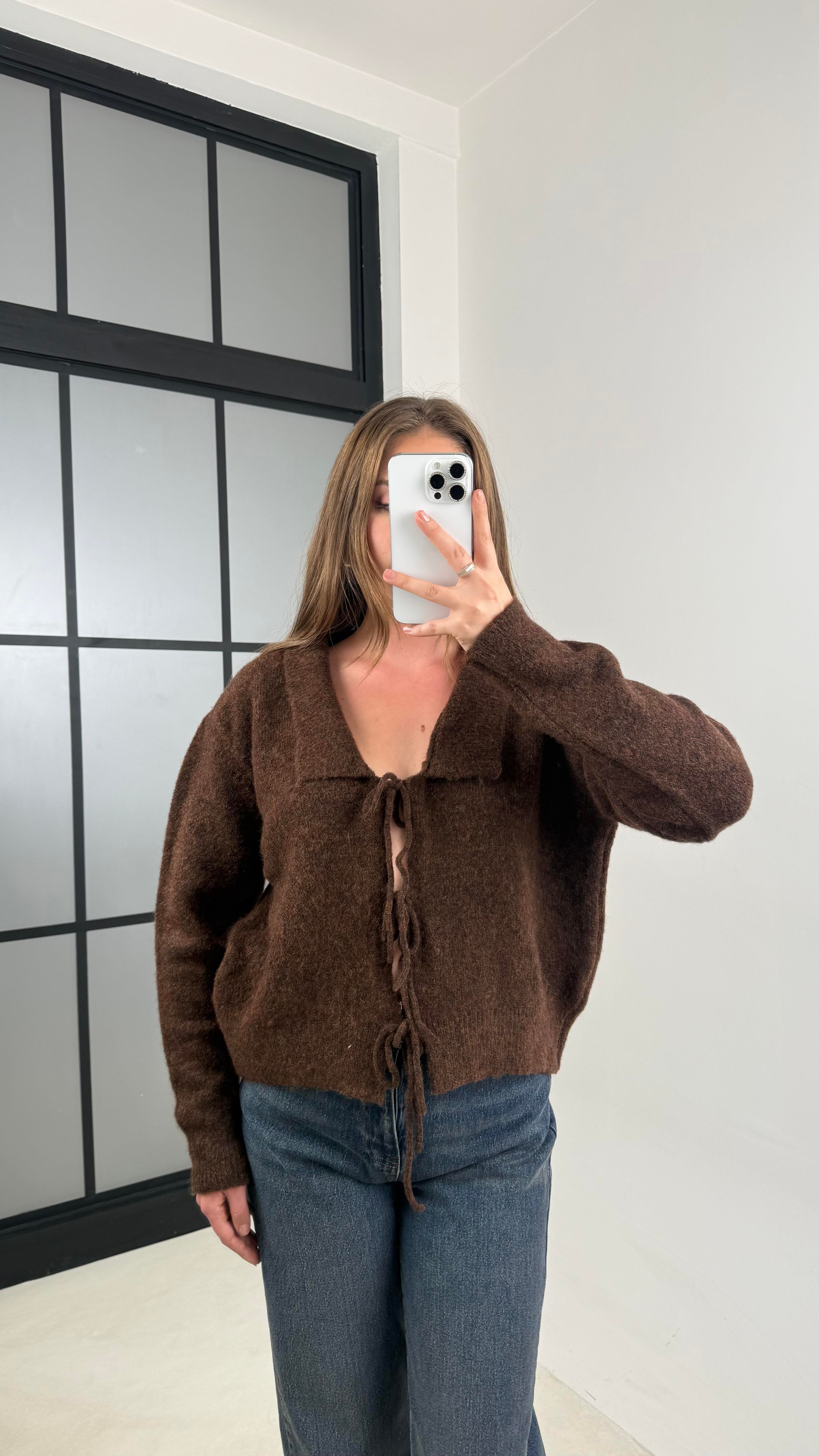 Kahve Önü Bağlama Detaylı Triko Hırka GAUS-00552