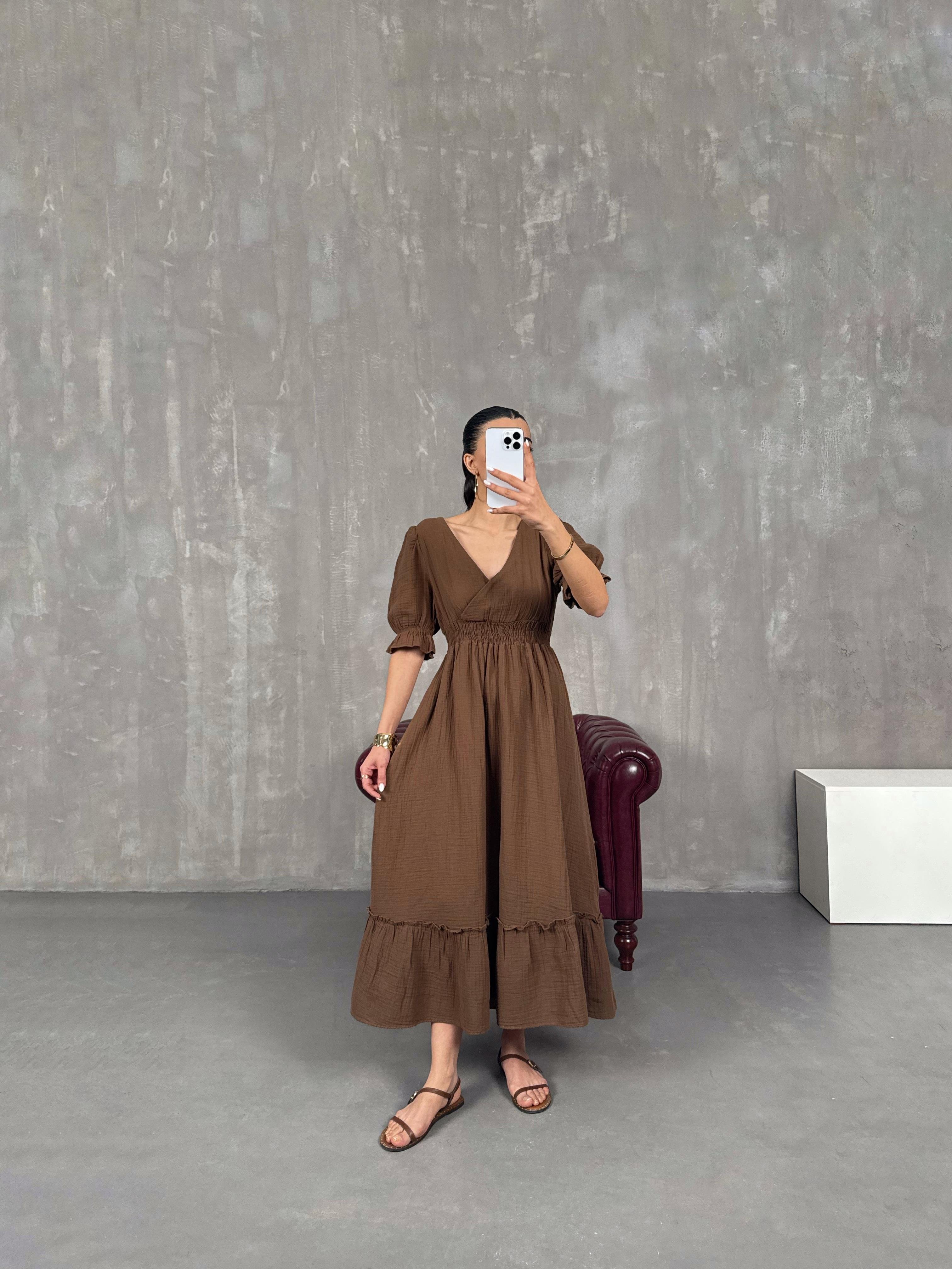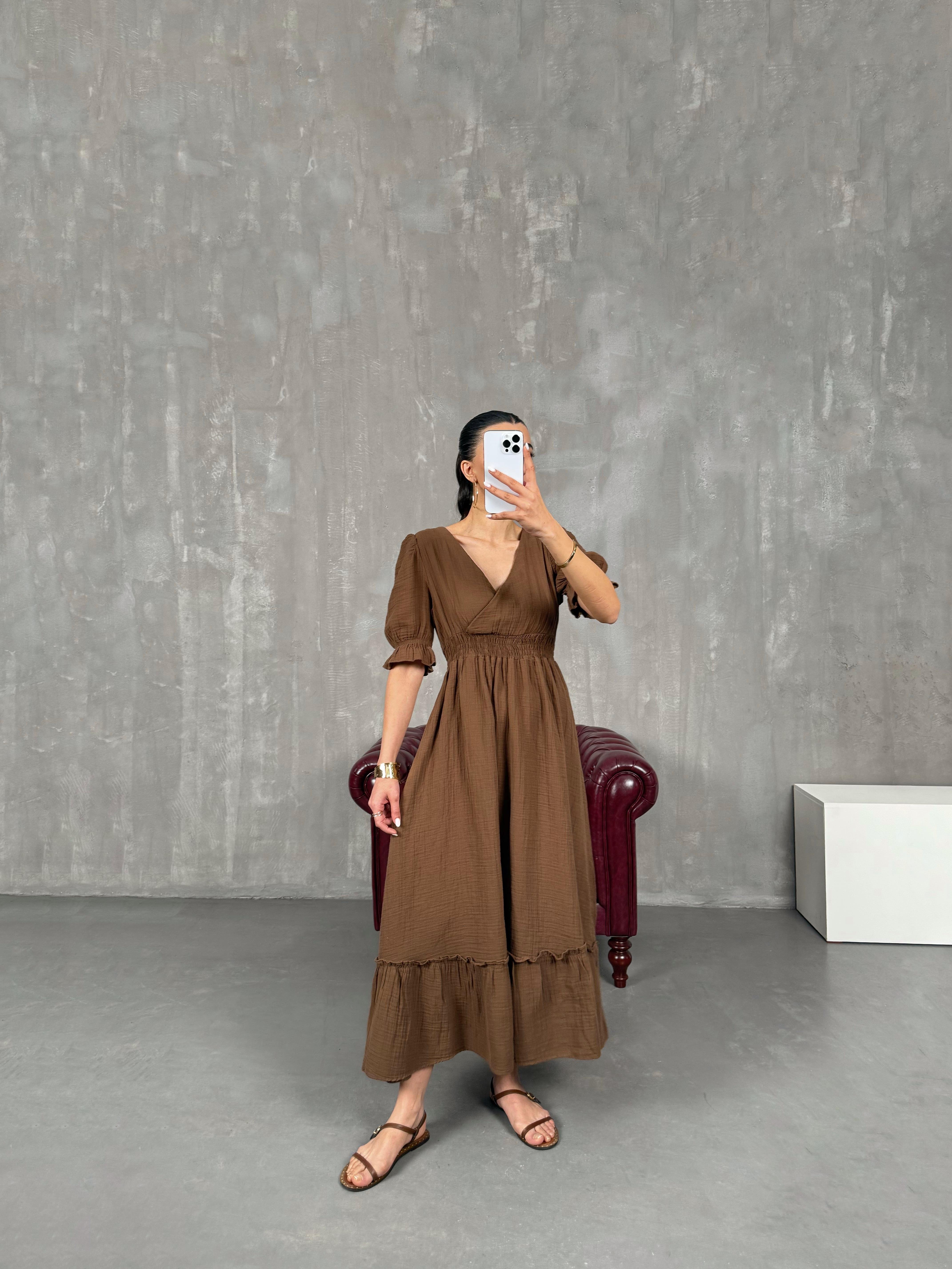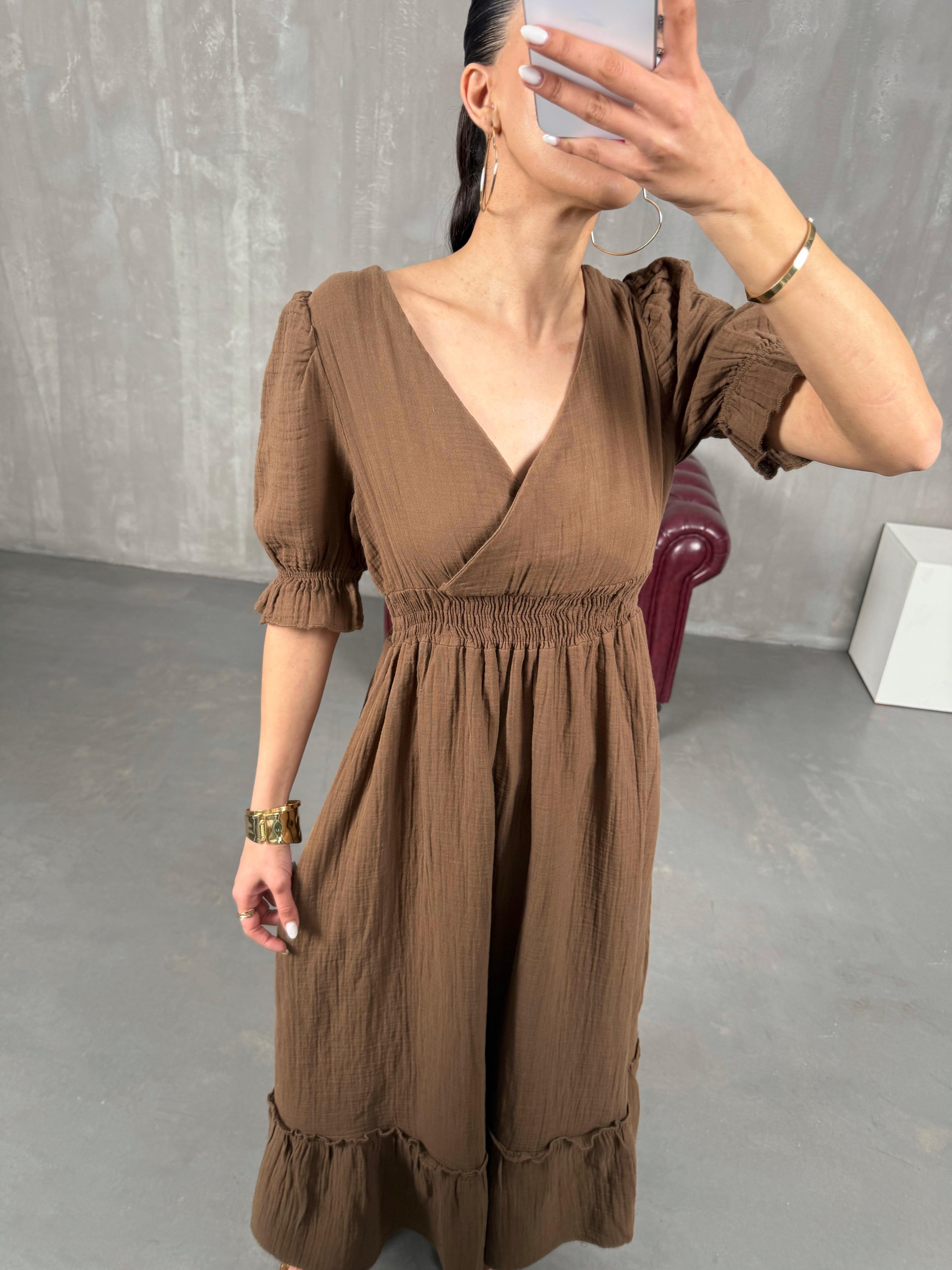 فستان بينتيريست بني قماش موسلين بثنيات مع خصر مطاطي وياقة شكل V Gaus00022