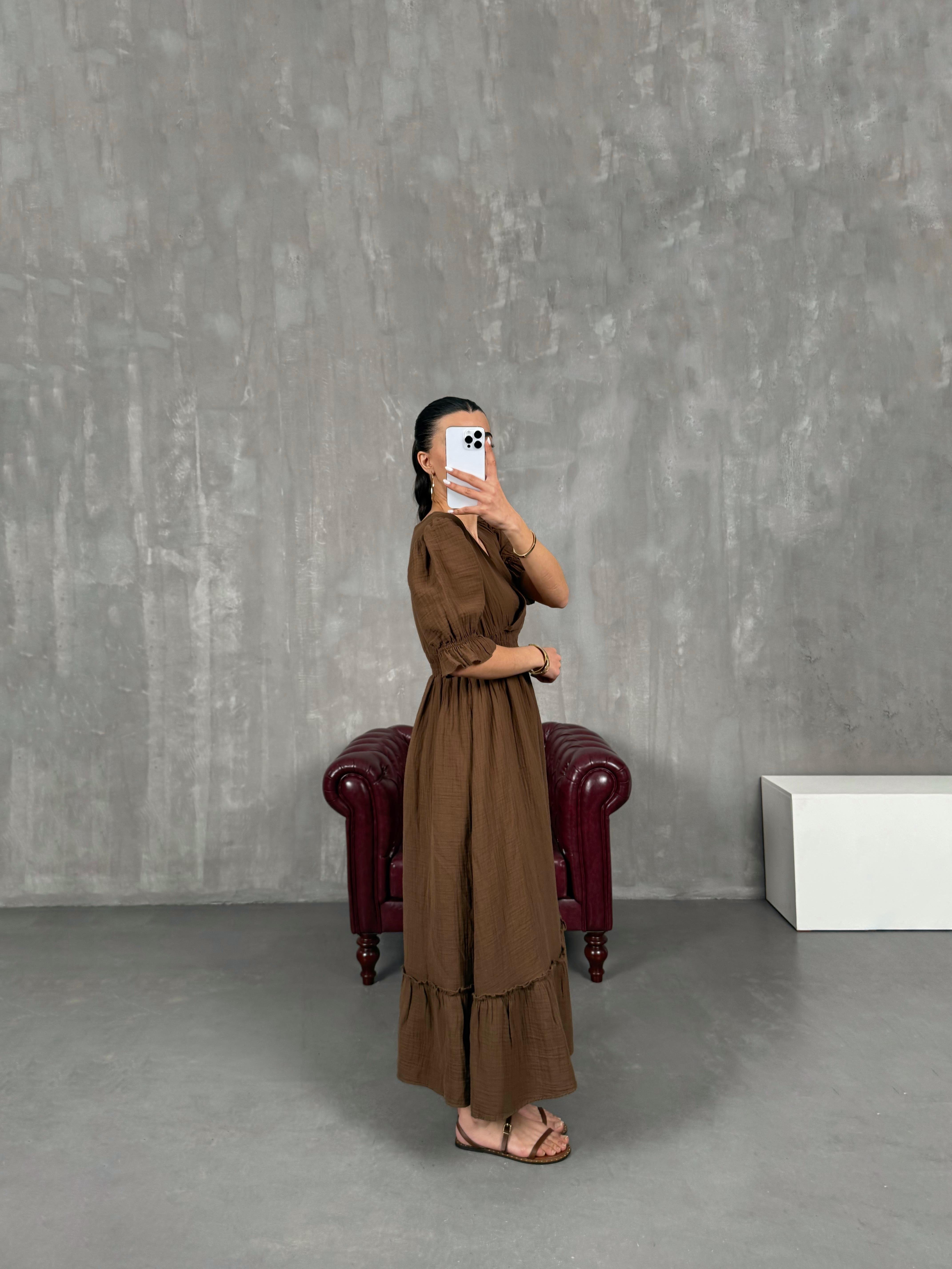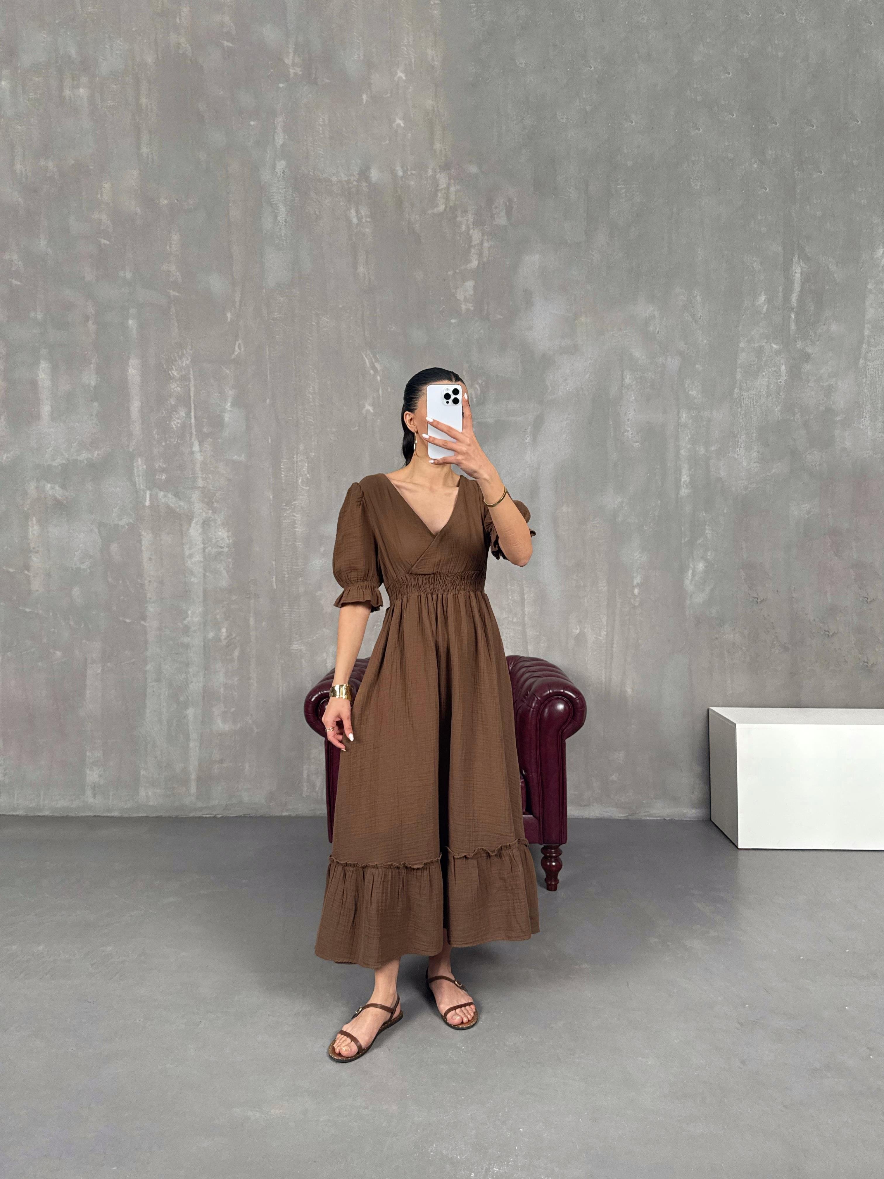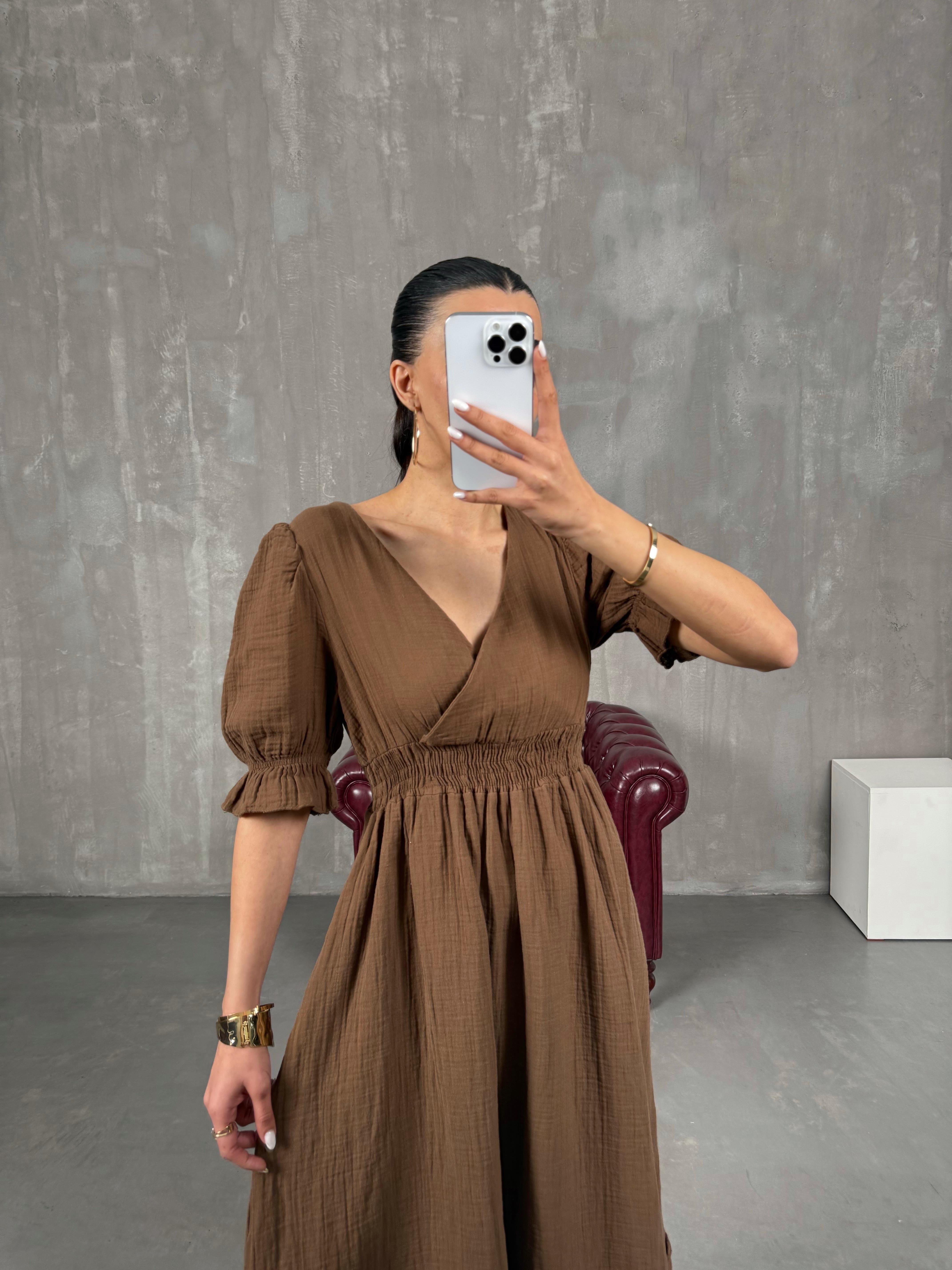 فستان بينتيريست بني قماش موسلين بثنيات مع خصر مطاطي وياقة شكل V Gaus00022