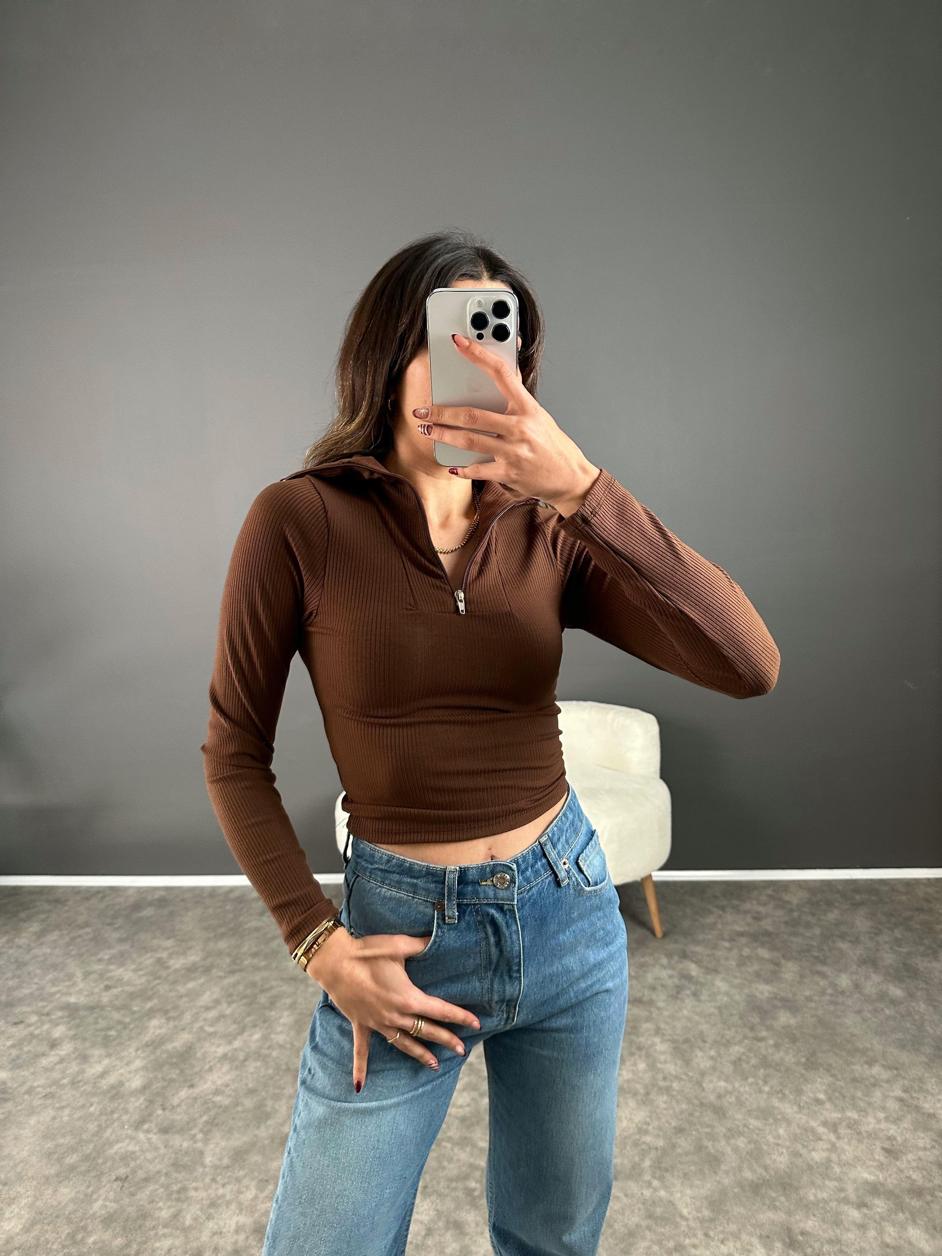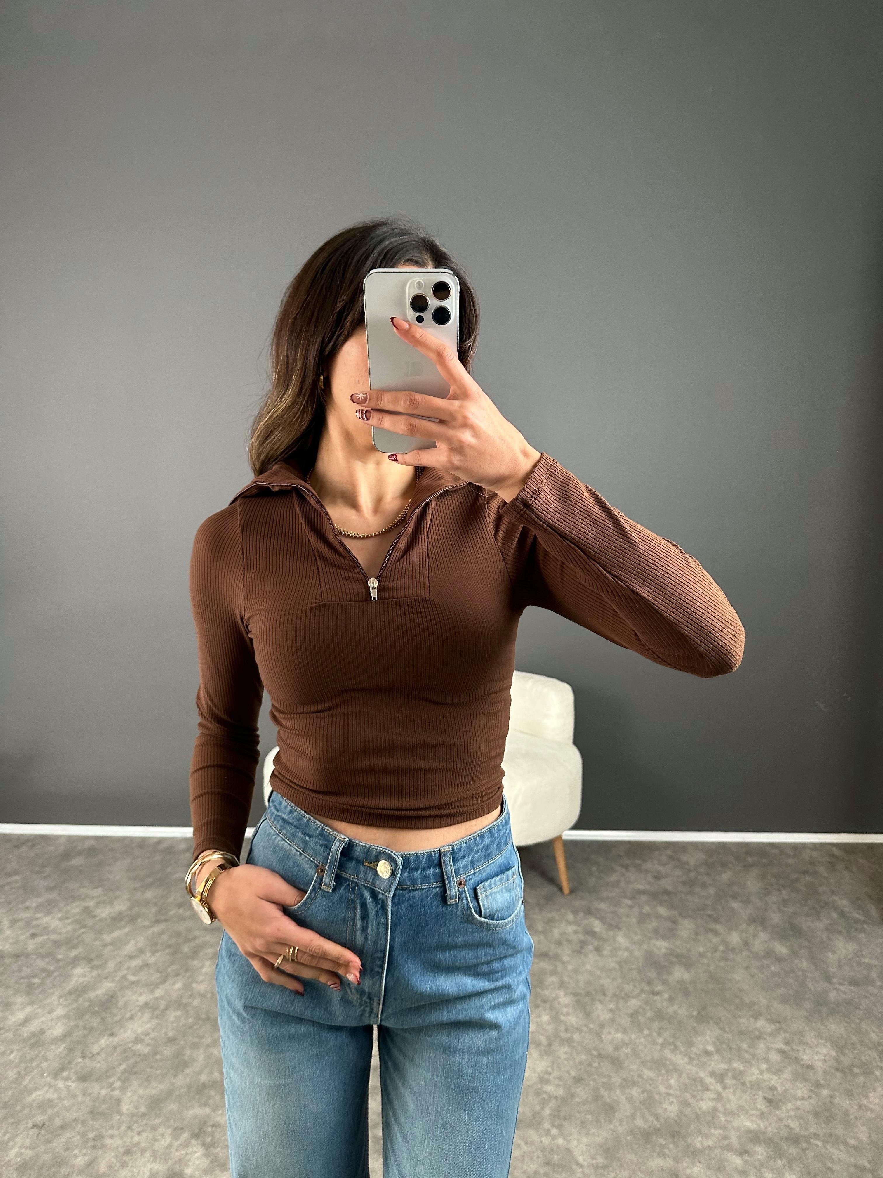 Kahverengi Fermuarlı Triko Crop