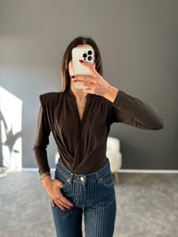 Kahverengi V yaka Vatkalı Drapeli Bodysuit