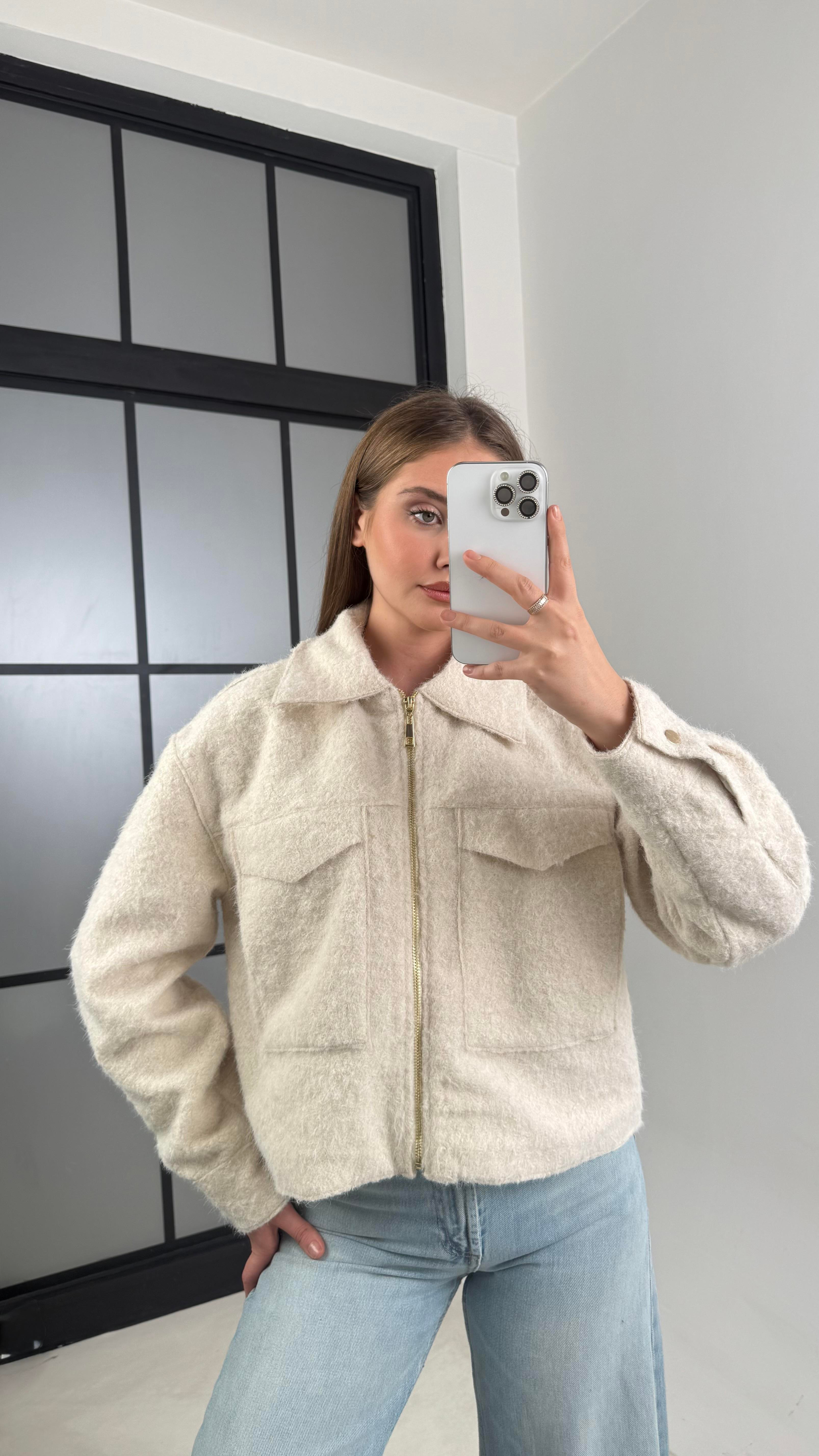 Krem Astarlı Fermuarlı Muadil Keçe Kumaş Ceket GAUS-00603