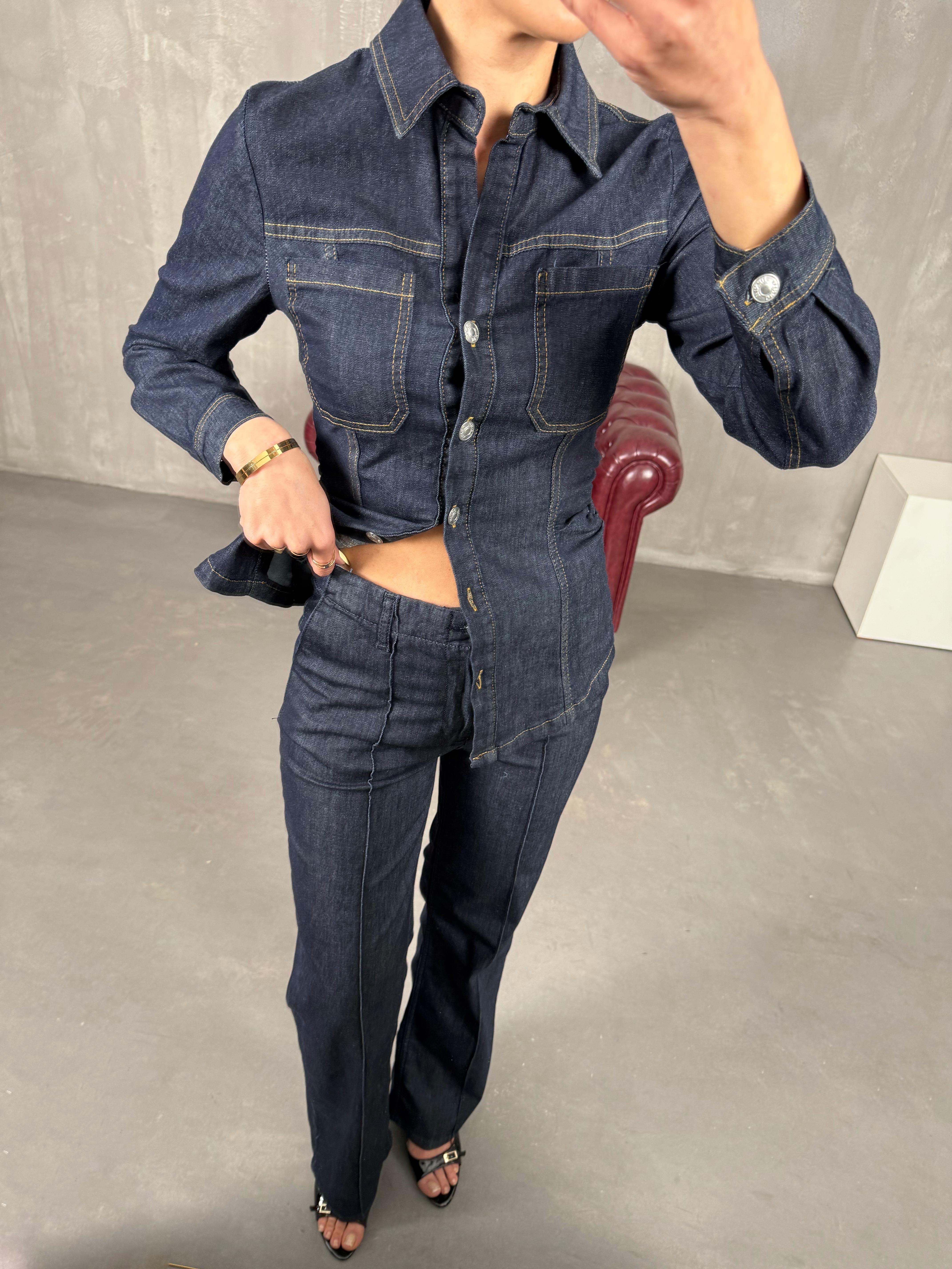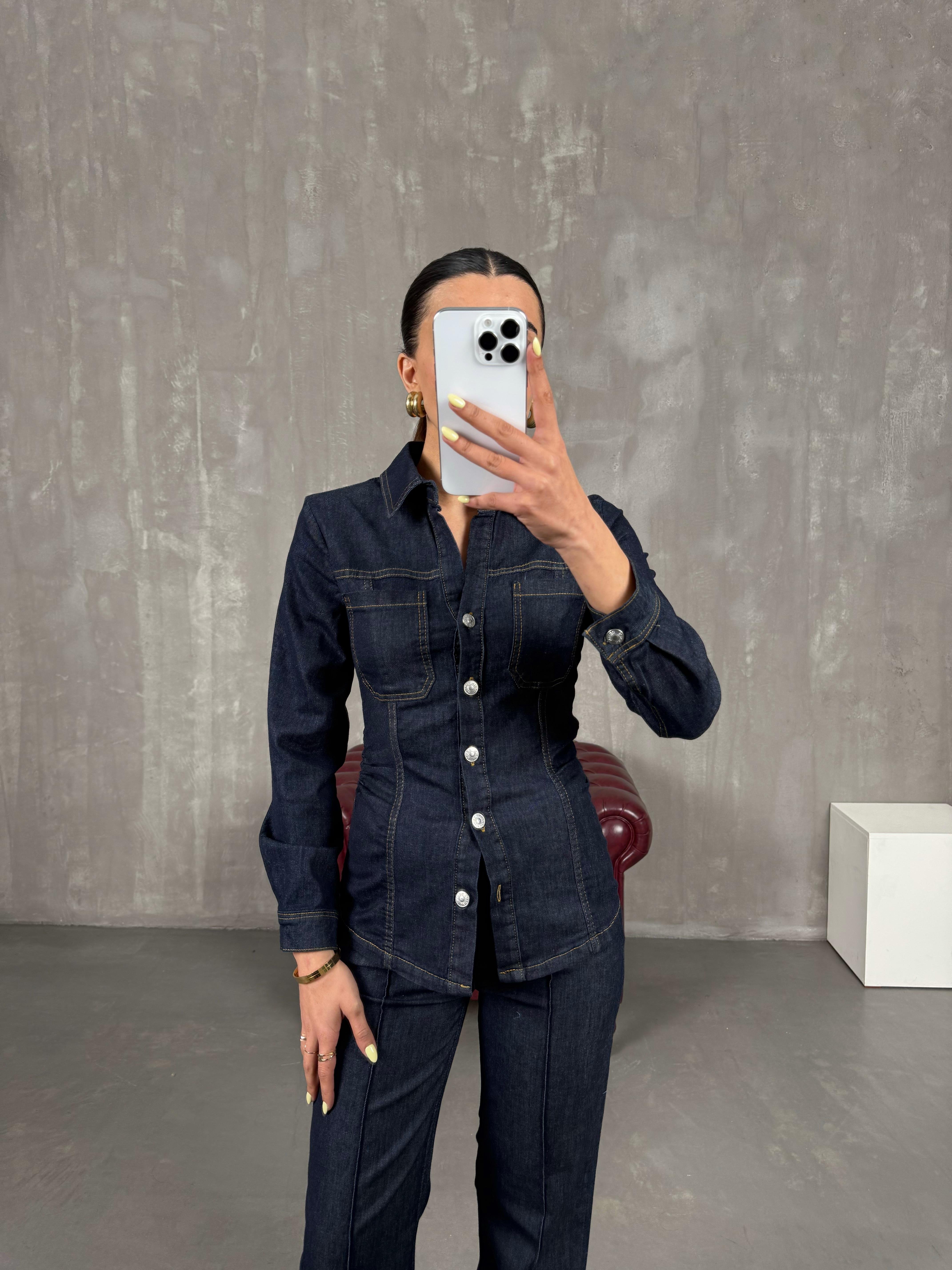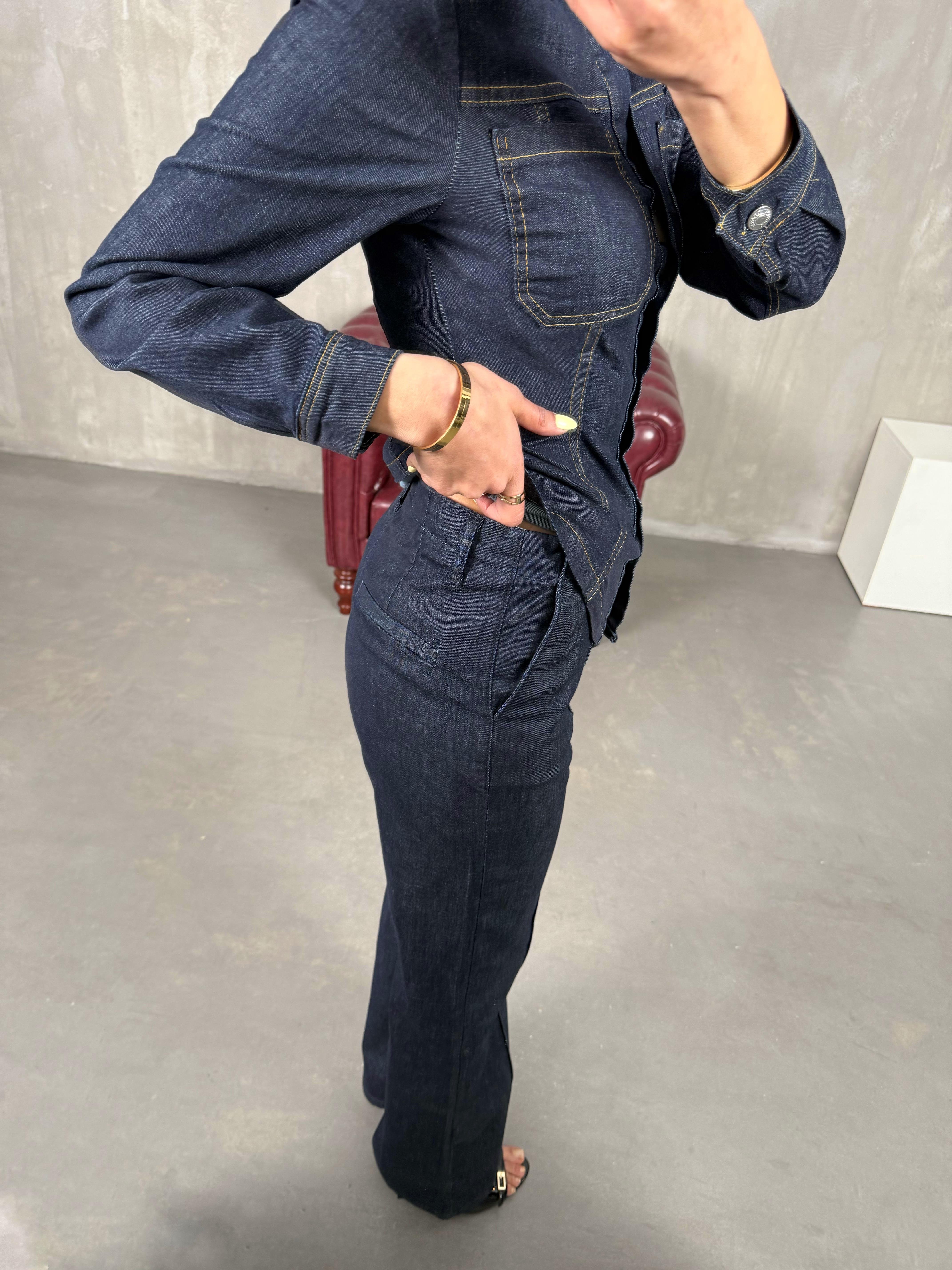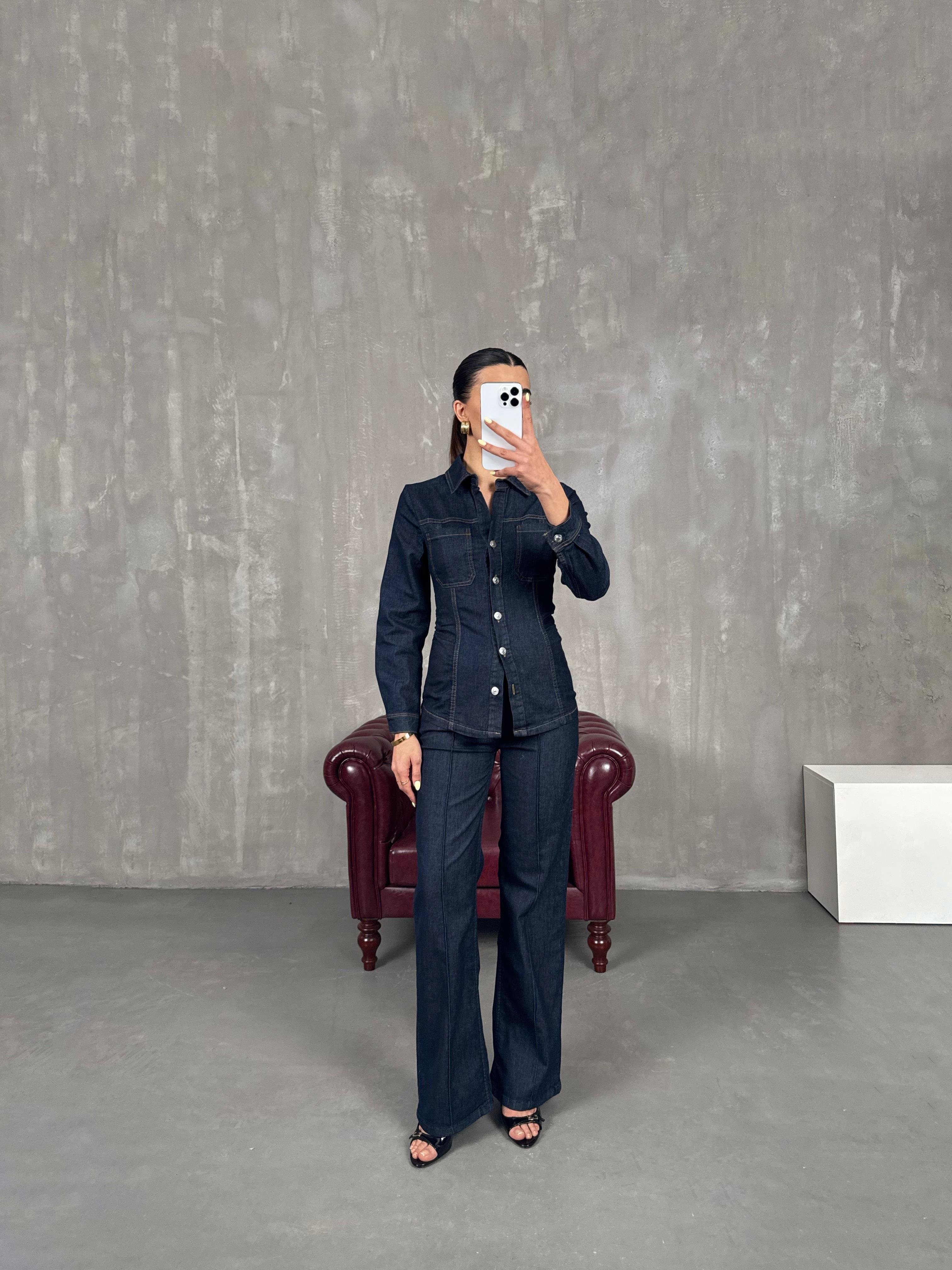 طقم دينيم كحلي بنطال جاكيت ضيق عند الخصر Gaus00084