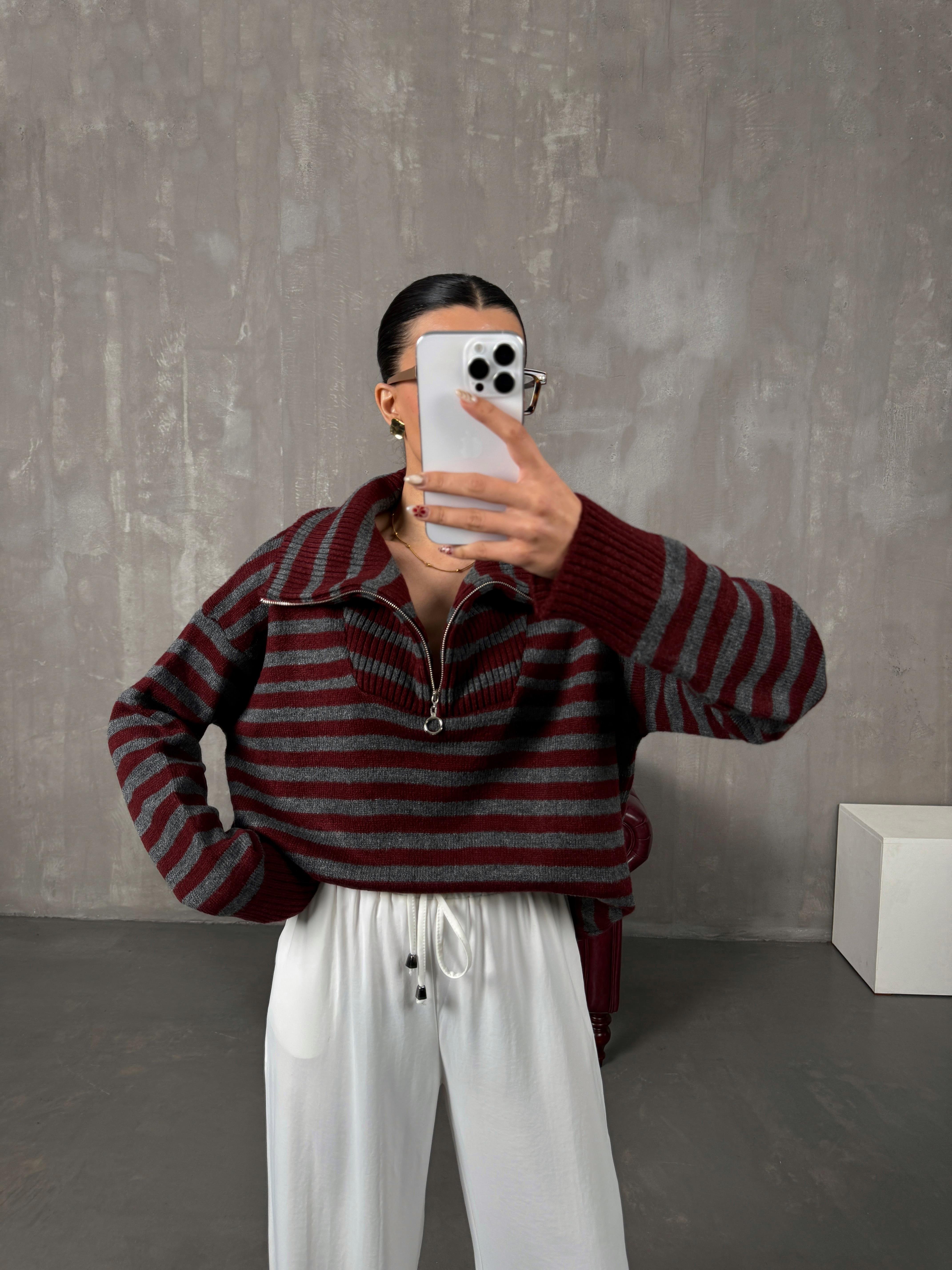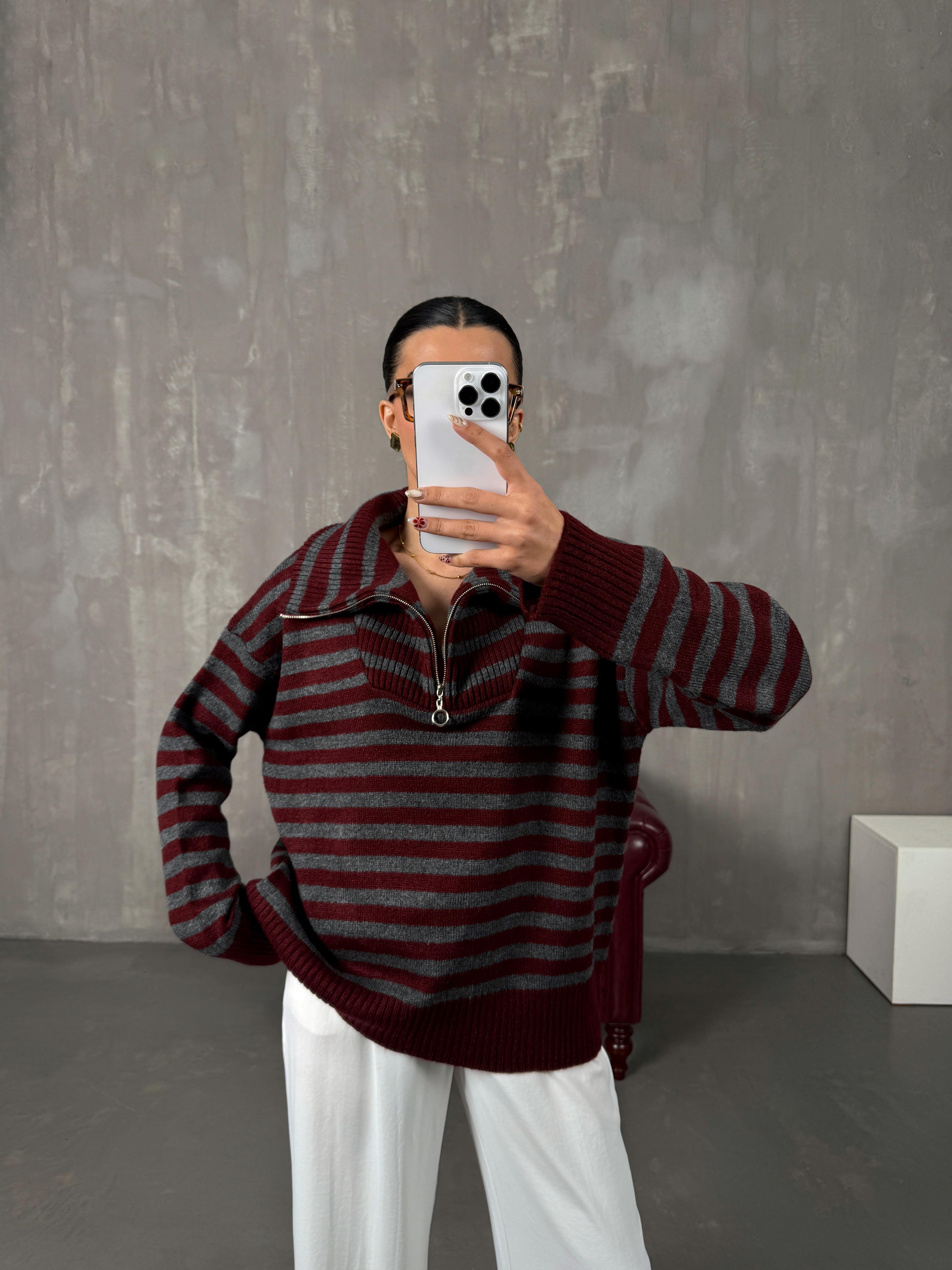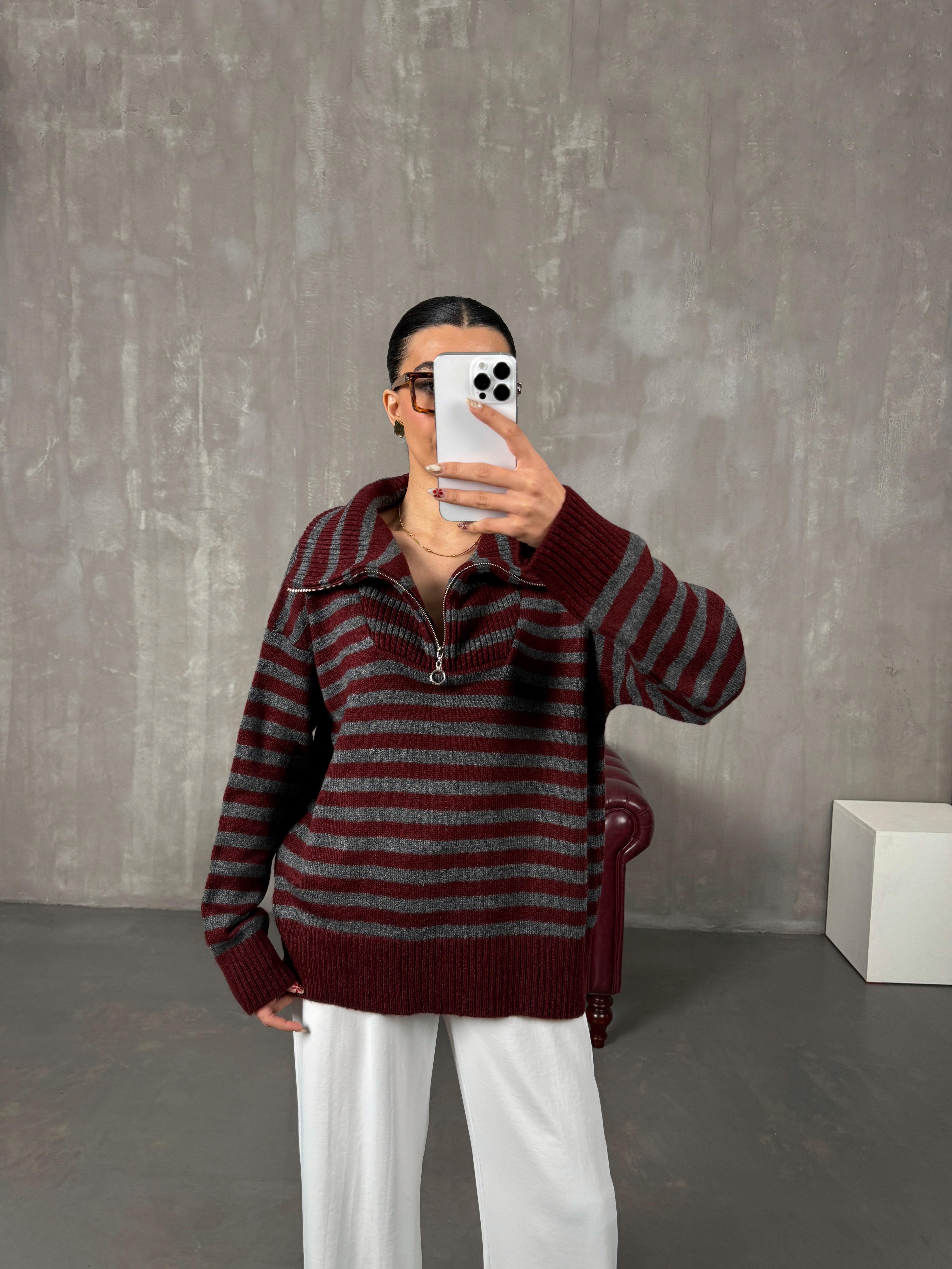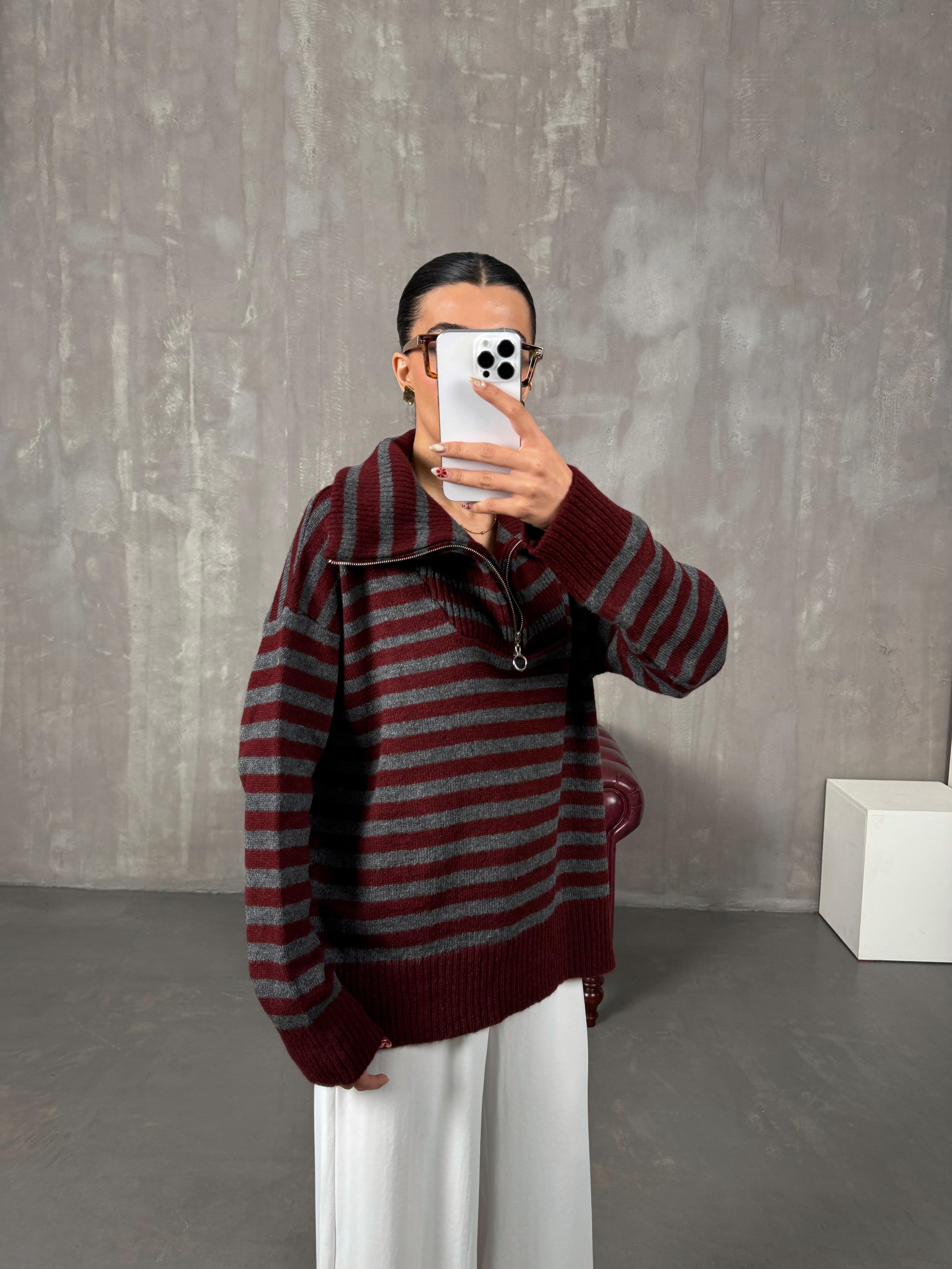Layla Bordo Gri Çizgili Fermuarlı Kazak