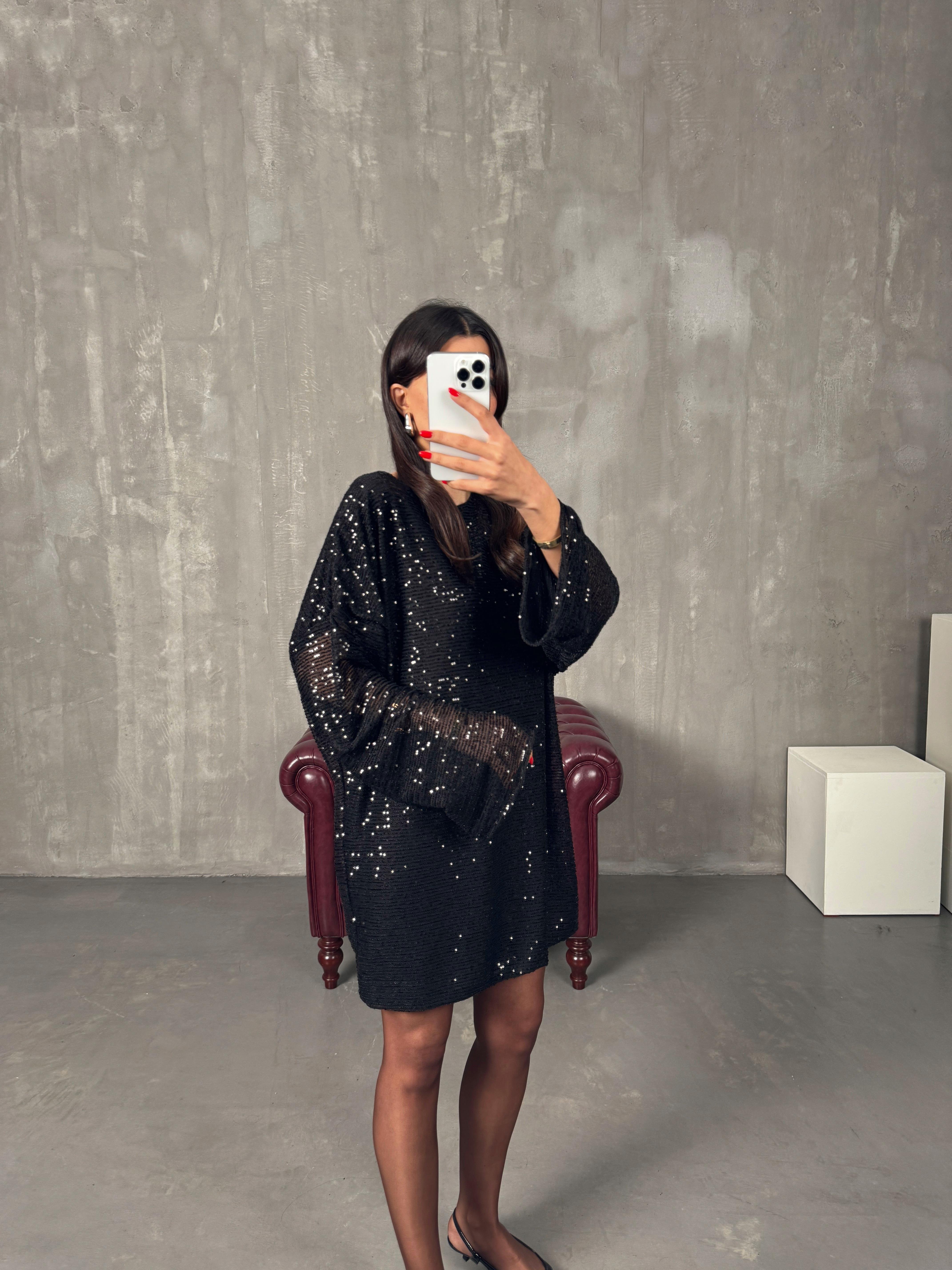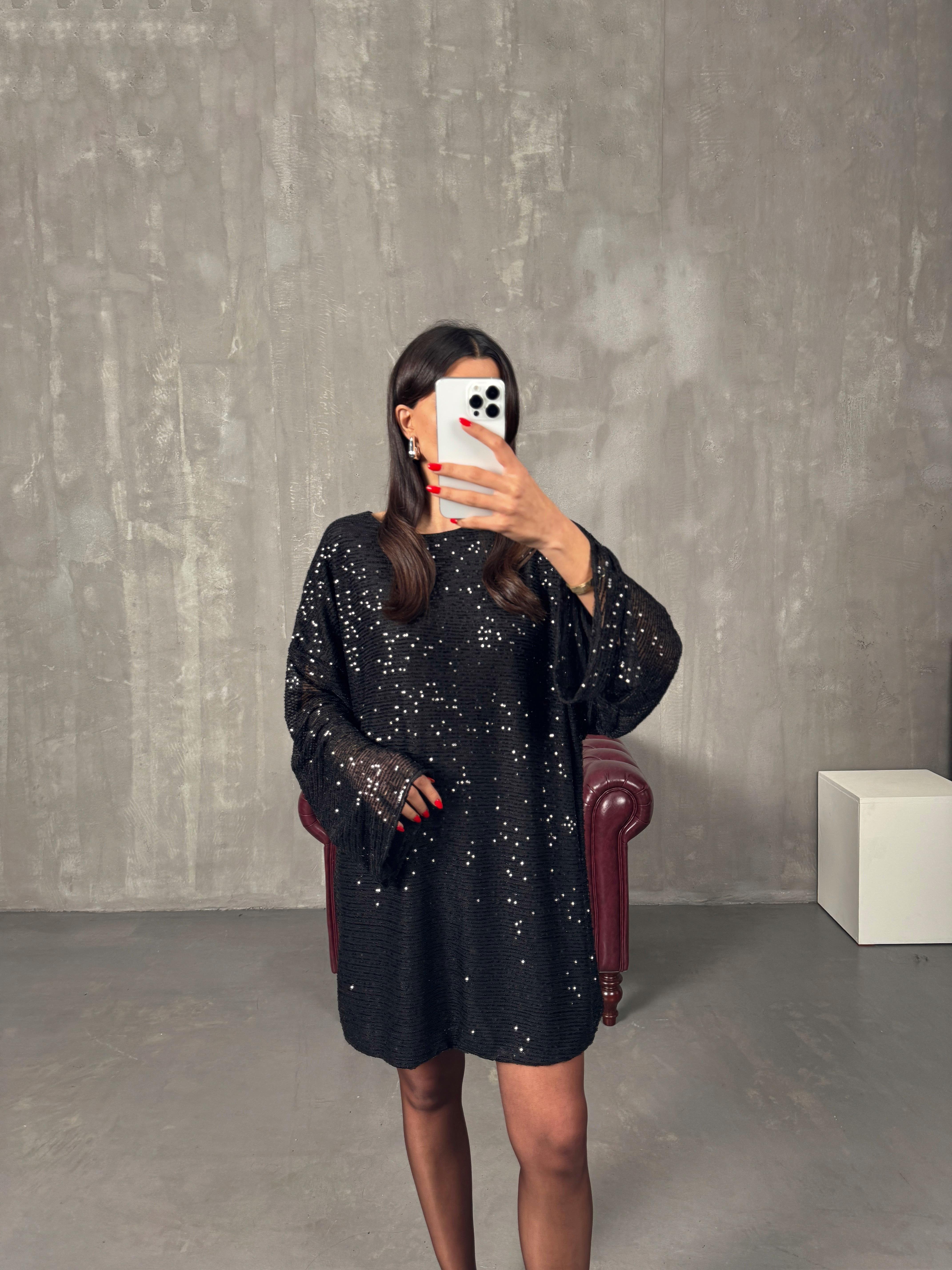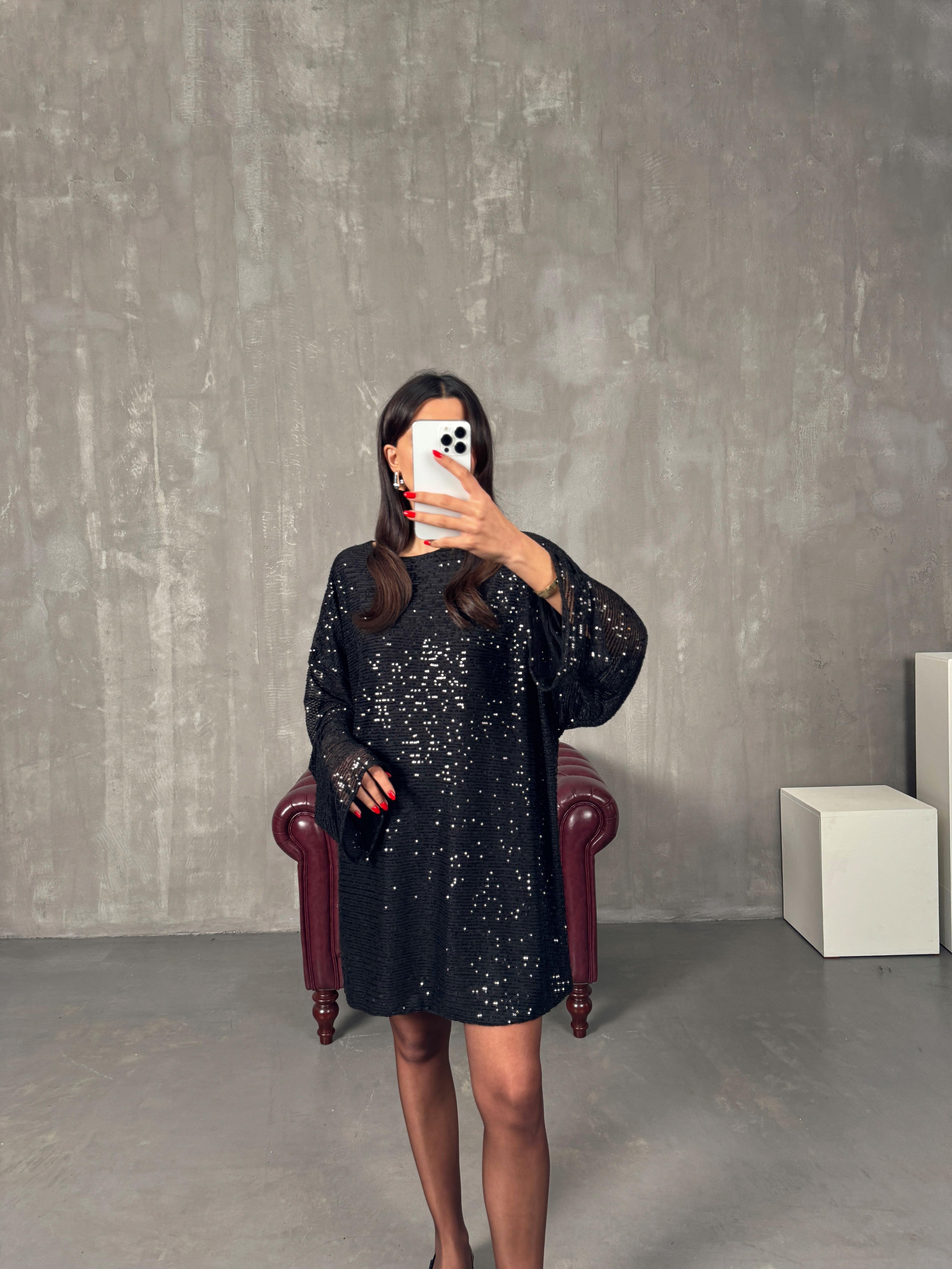 Lisso Siyah Astarlı Pullu Payet Elbise