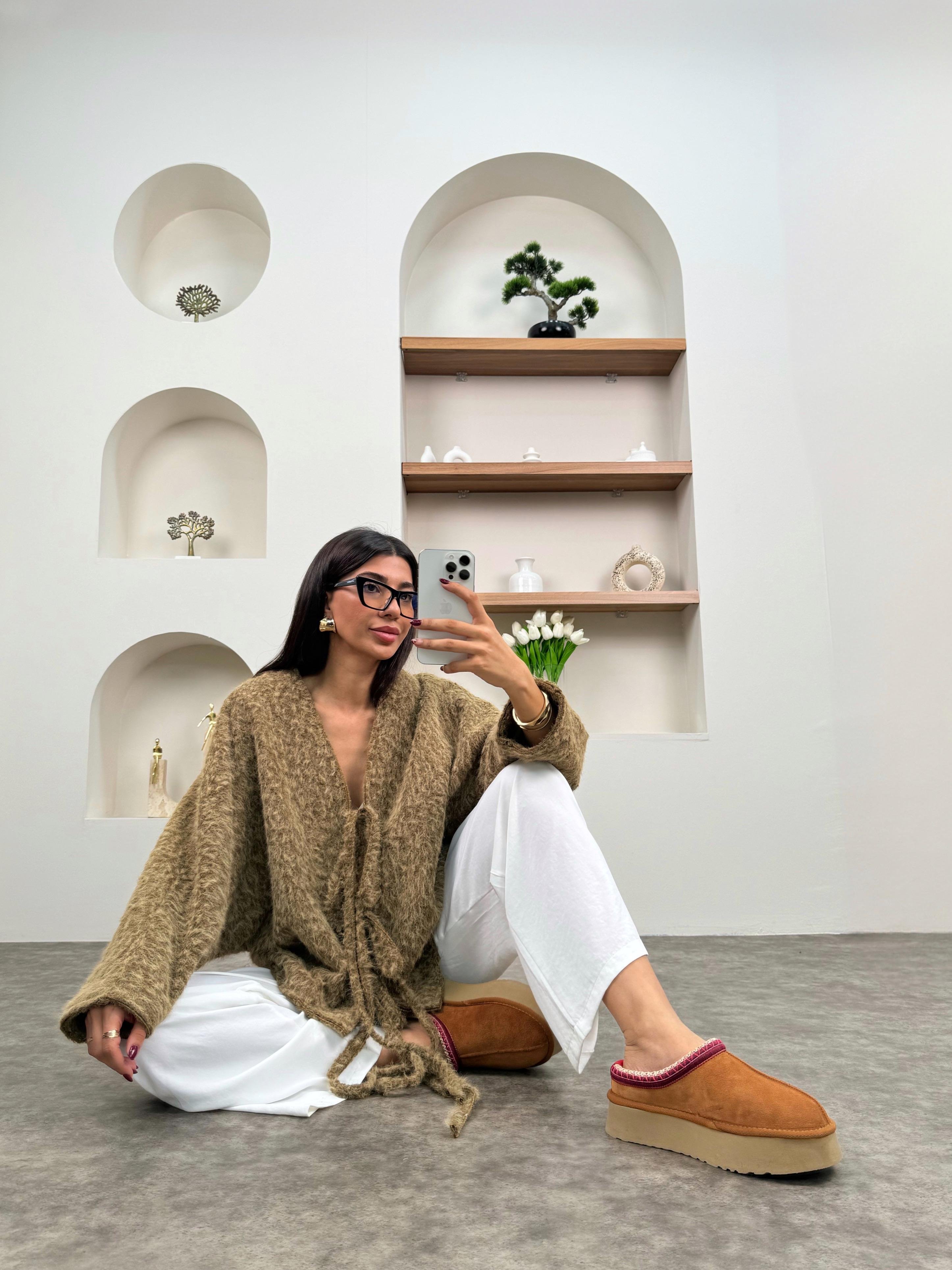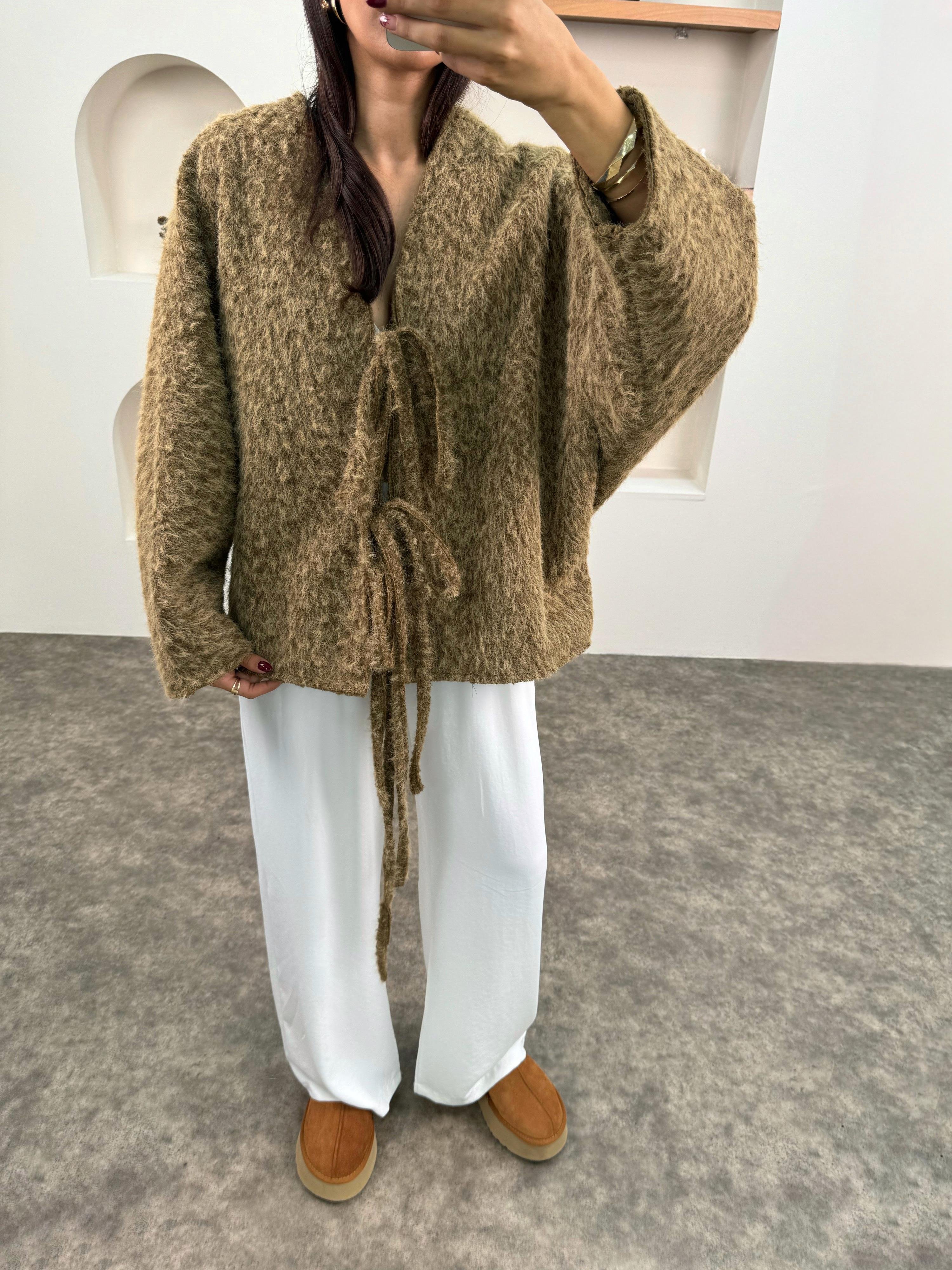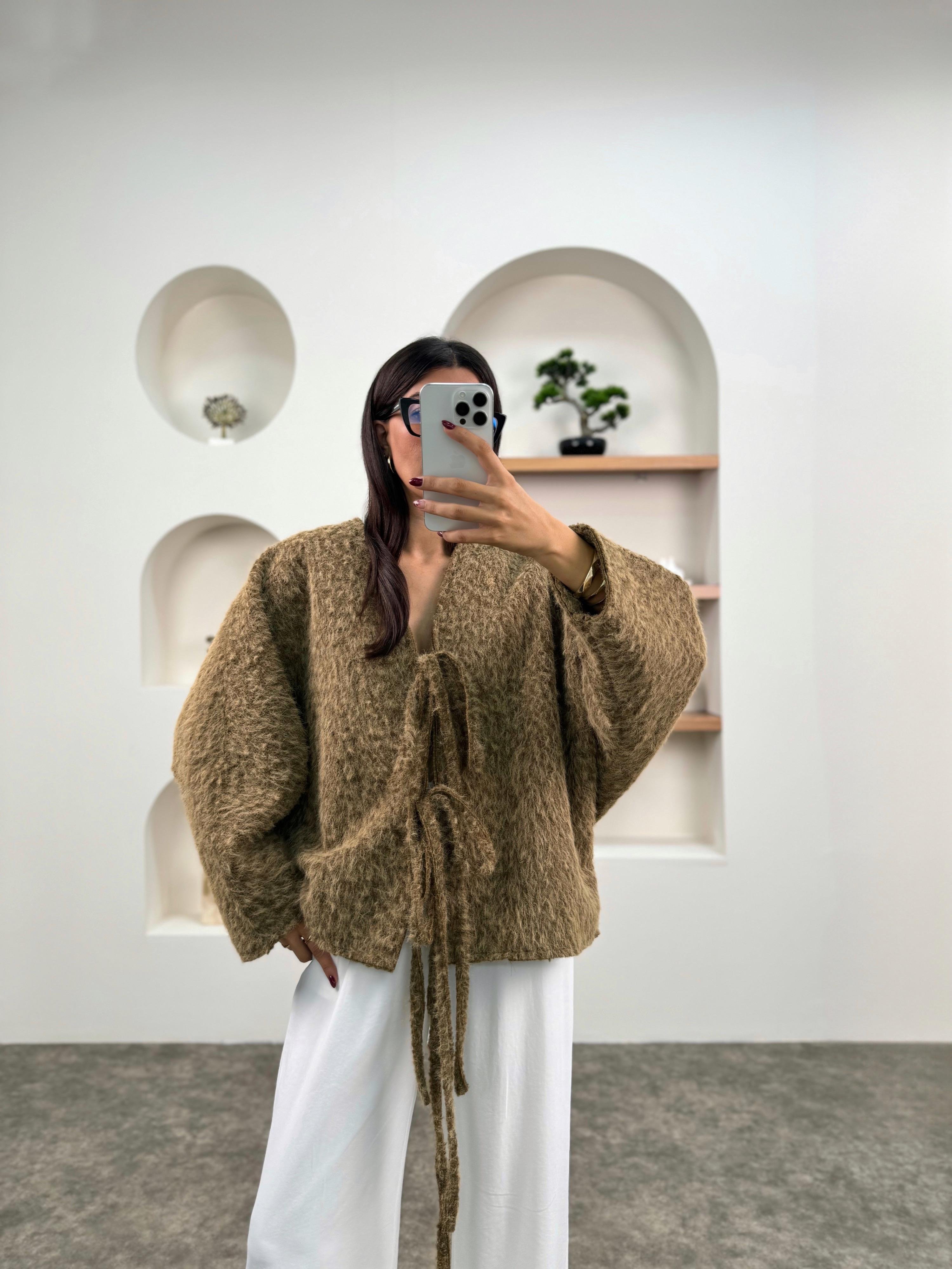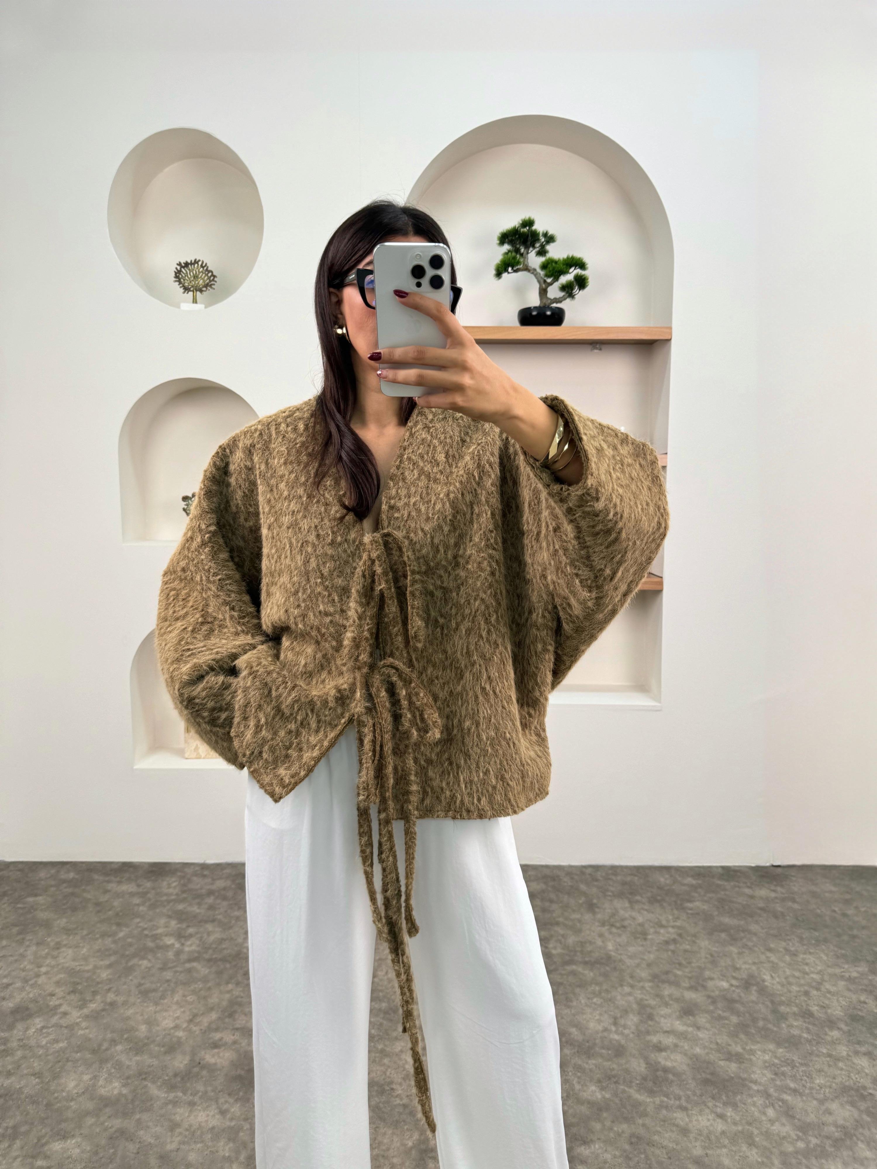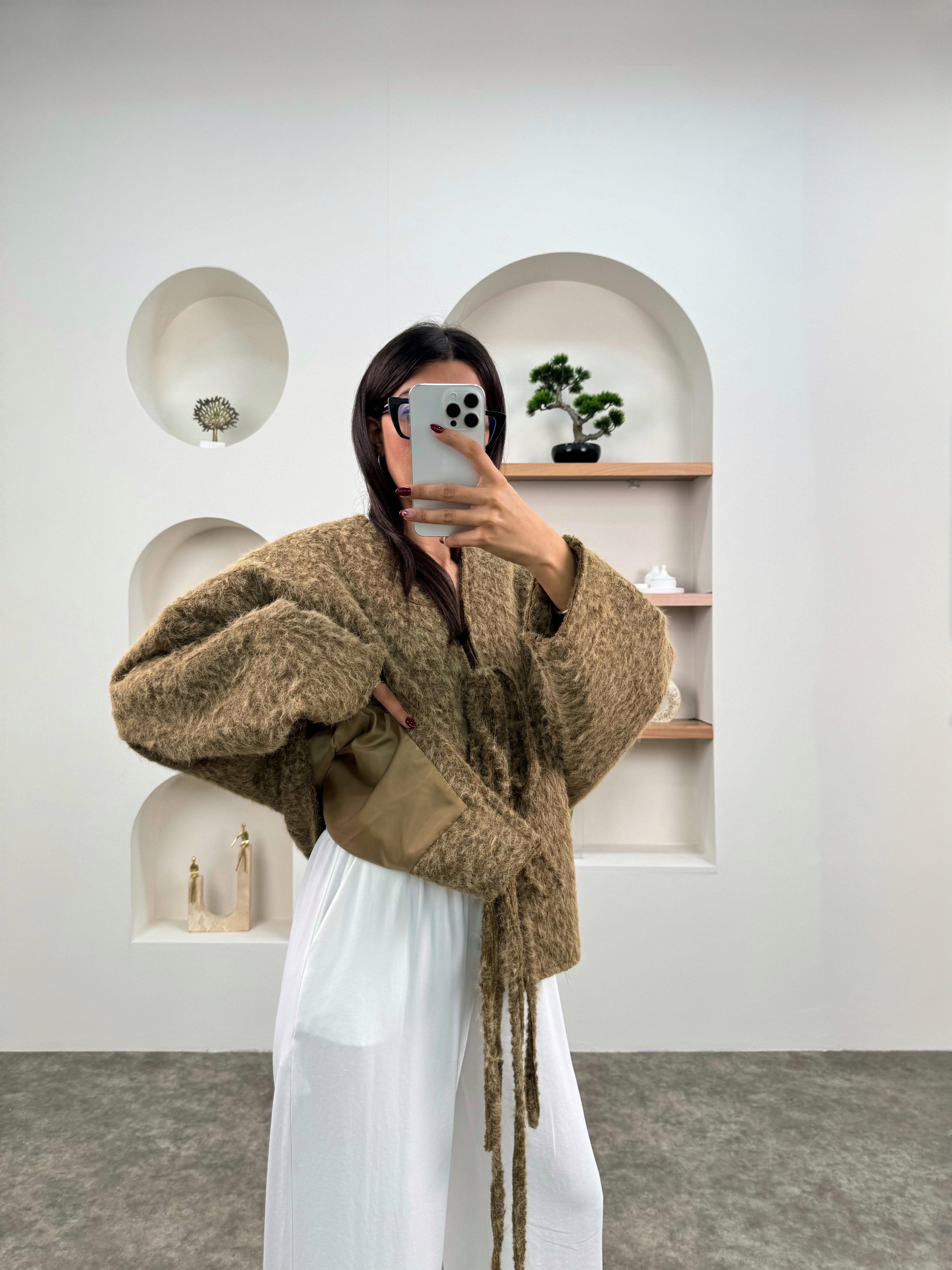 Loren Kahve Kırçıllı Astarlı Önden Bağlamalı Premium Ceket