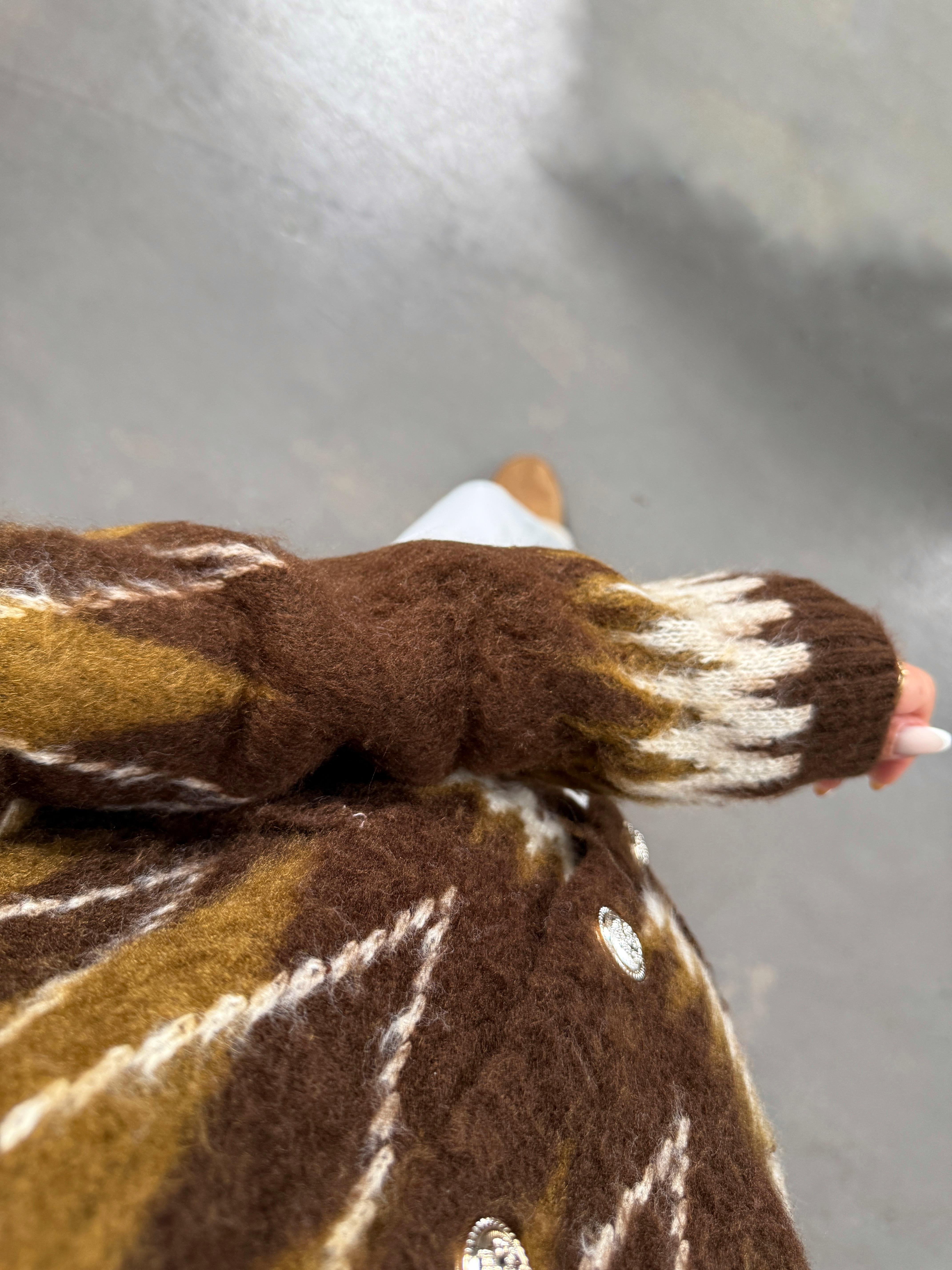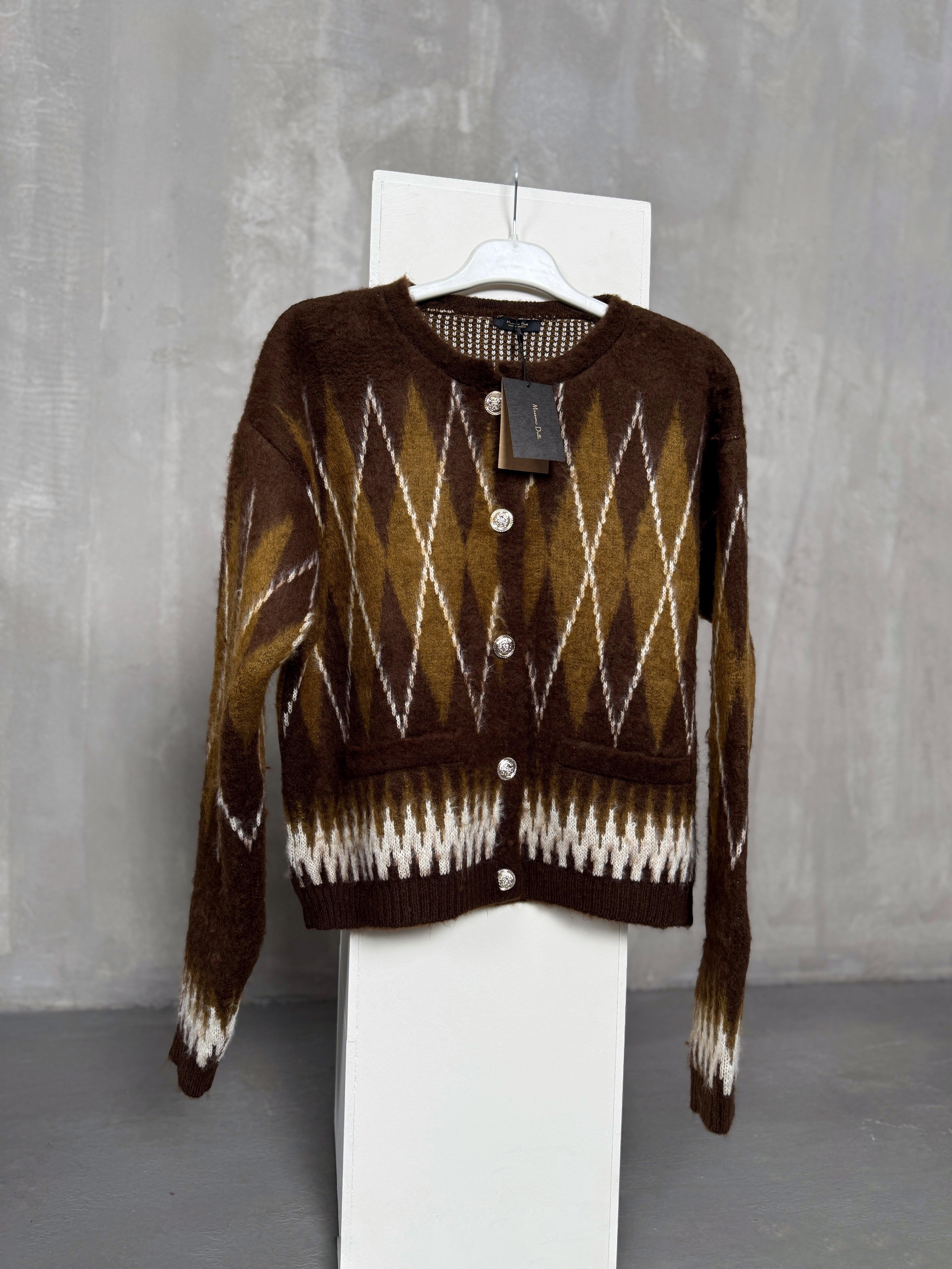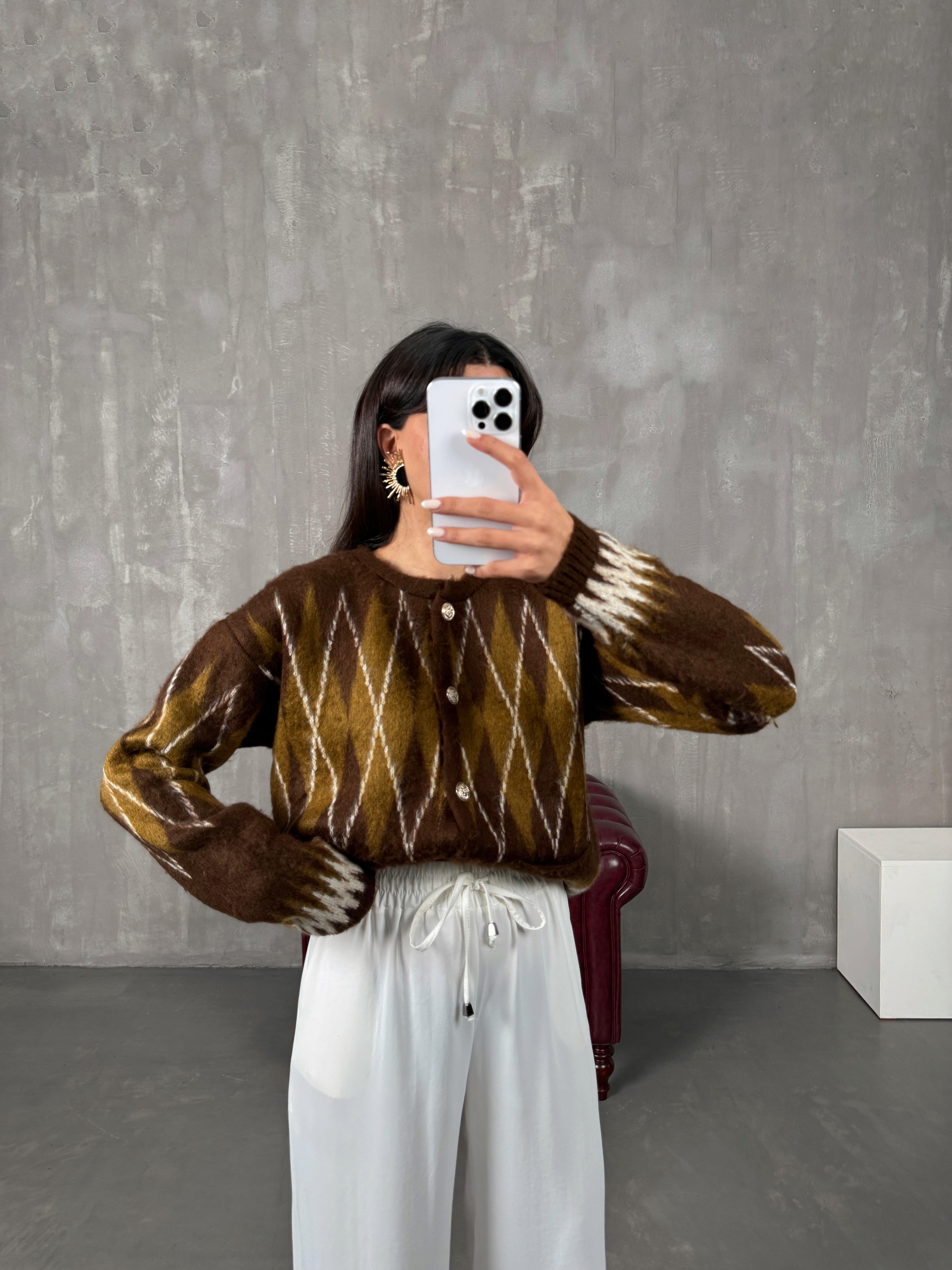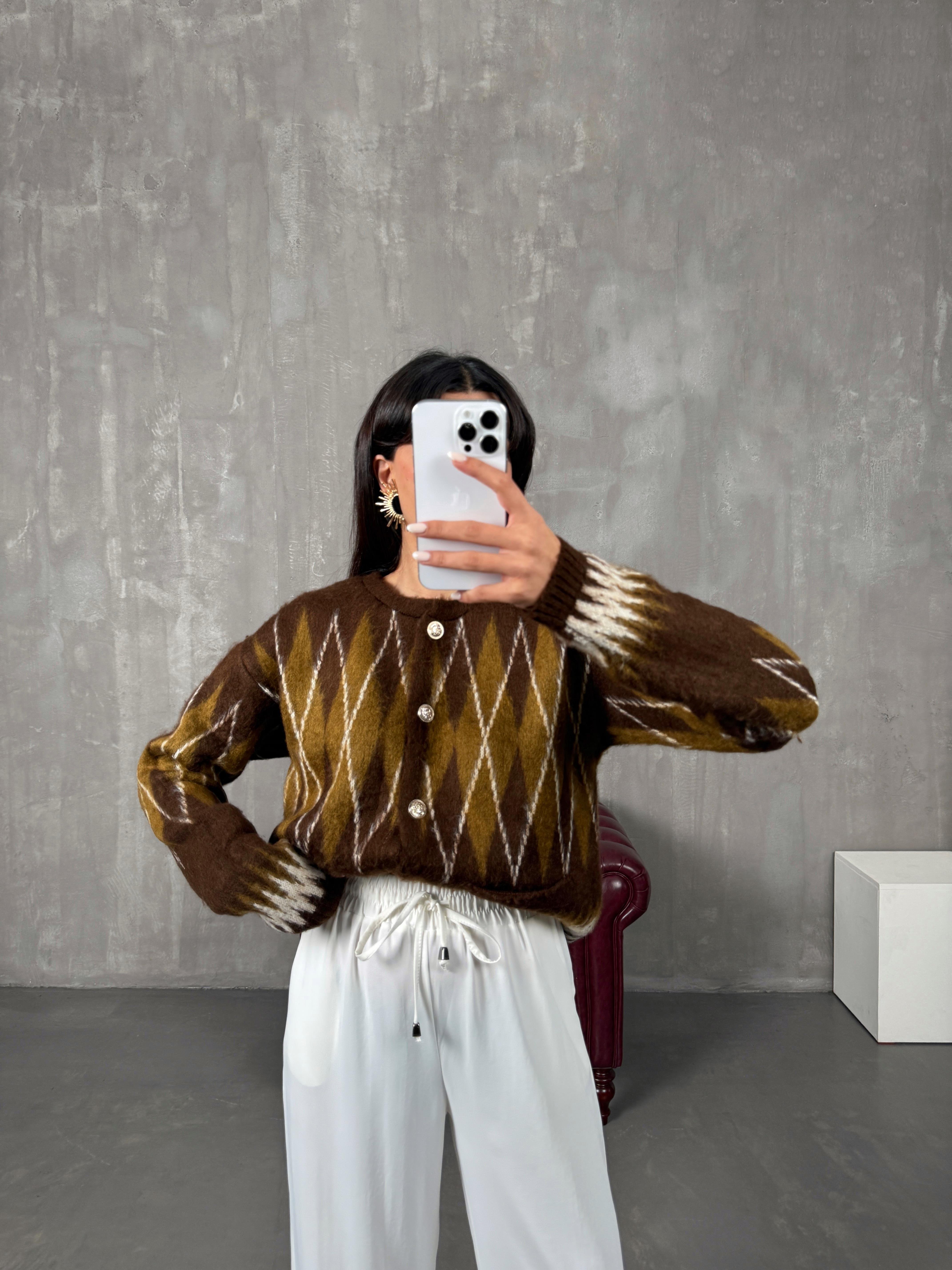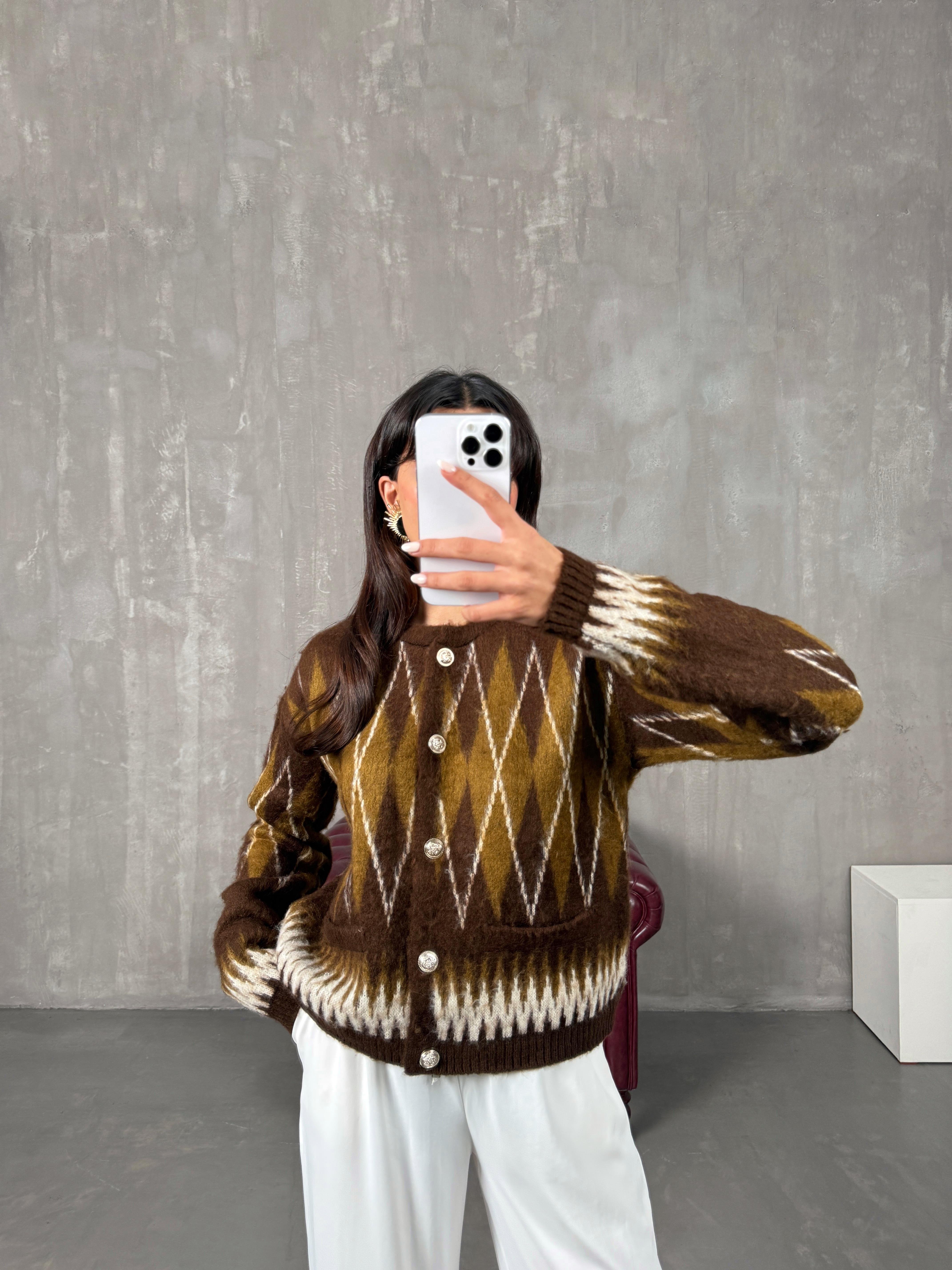 Manusa Ekru Kahve Sakallı Desenli Düğmeli MD Hırka
