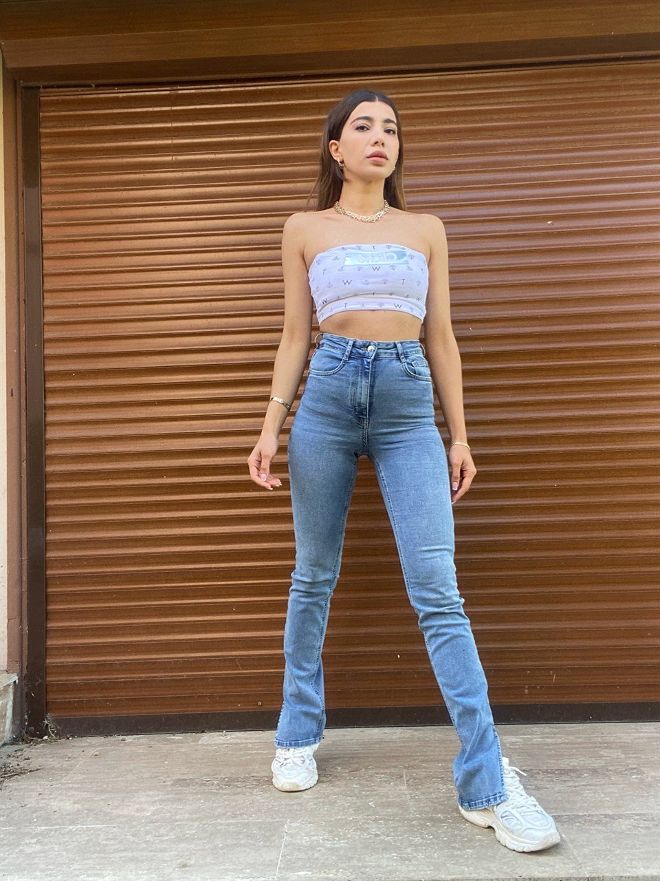 Mavi Yüksek Bel Yırtmaç Detaylı Jean
