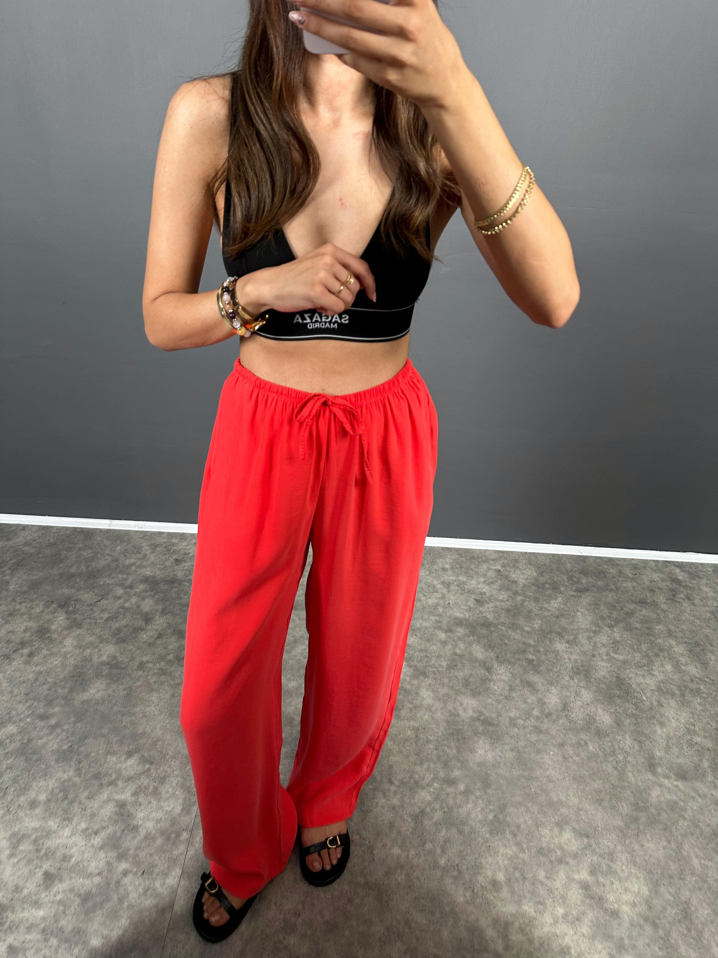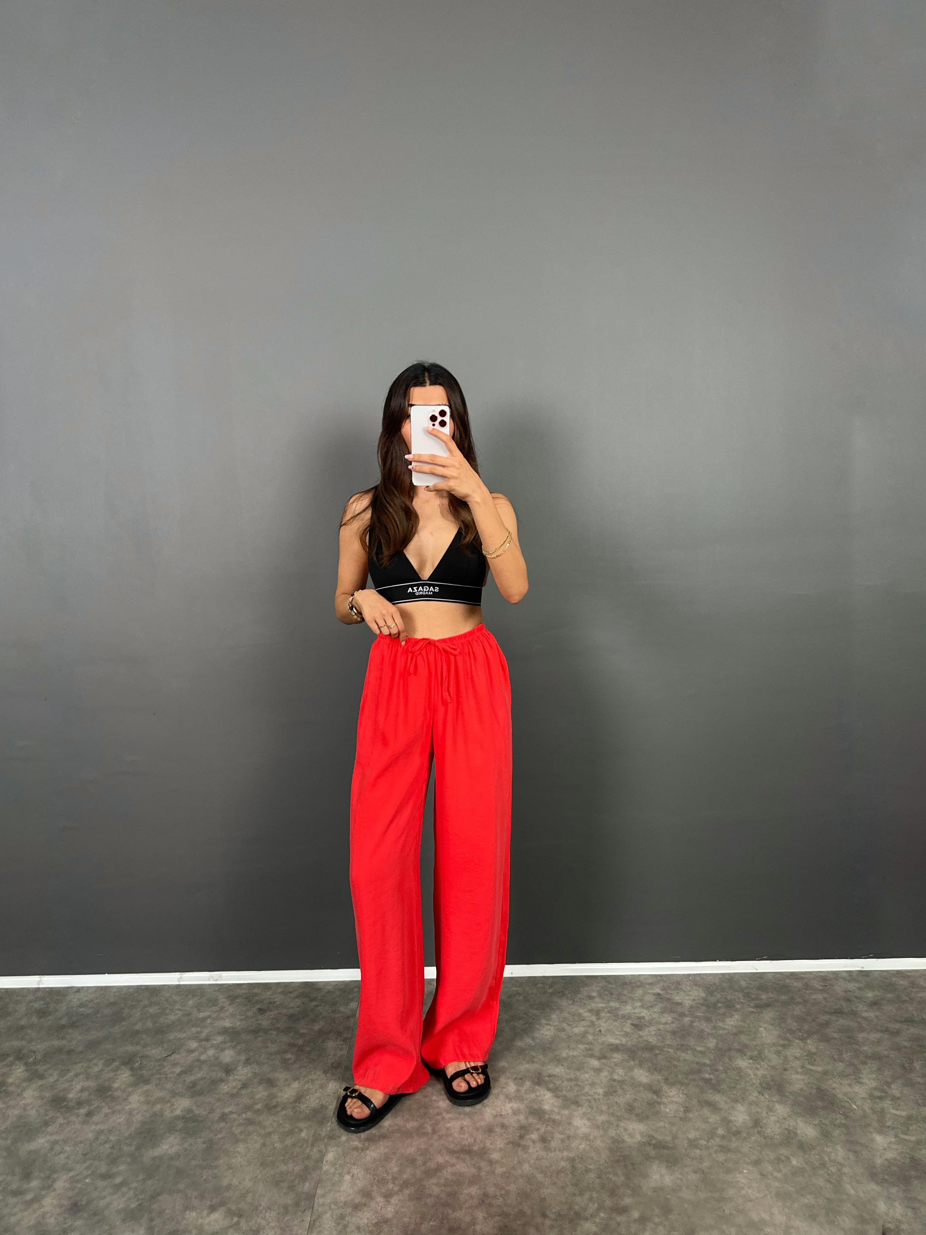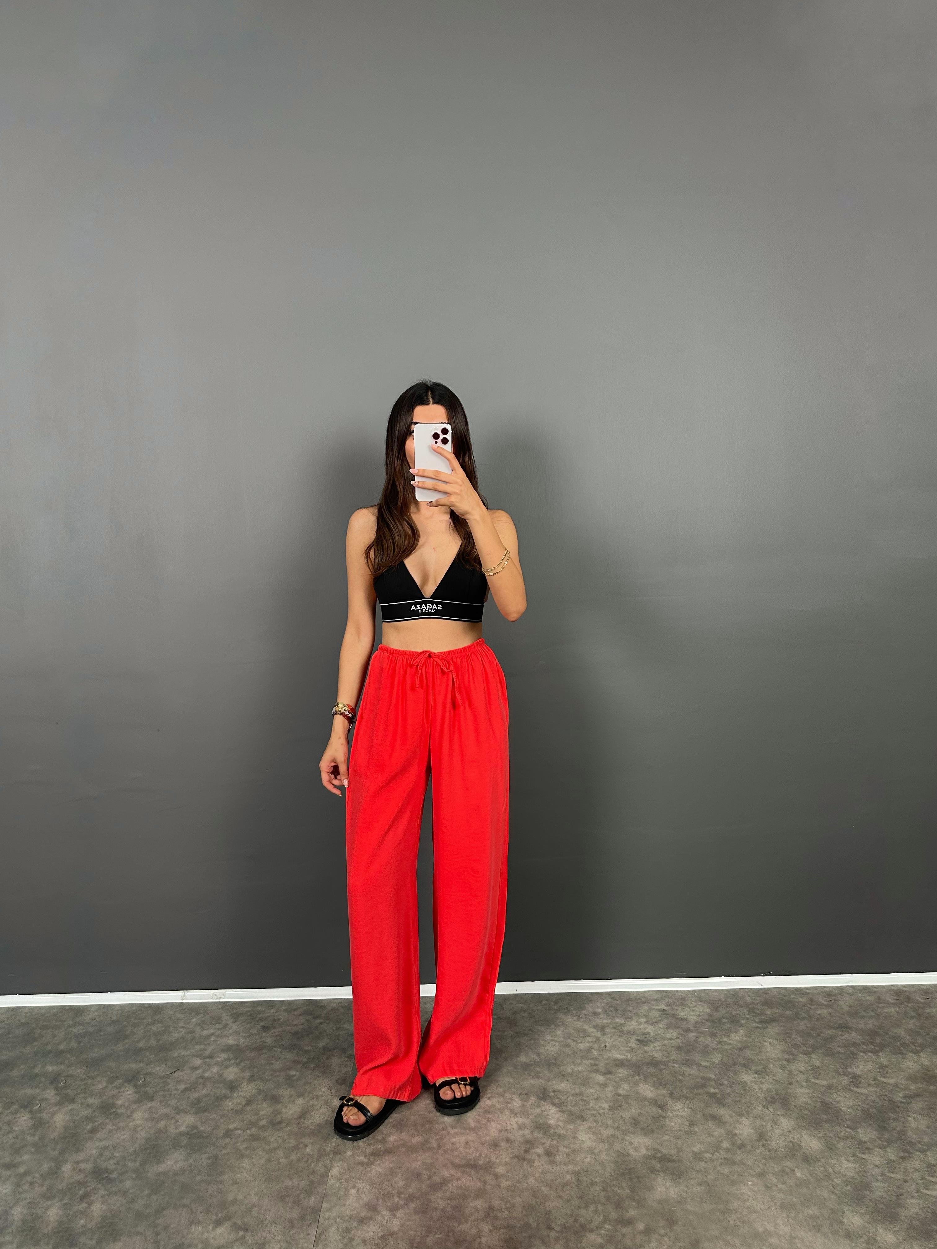 MD Nar Çiçeği Beli Lastikli Cepli İthal Kumaş Rahat Dokuma Muadil Pantolon