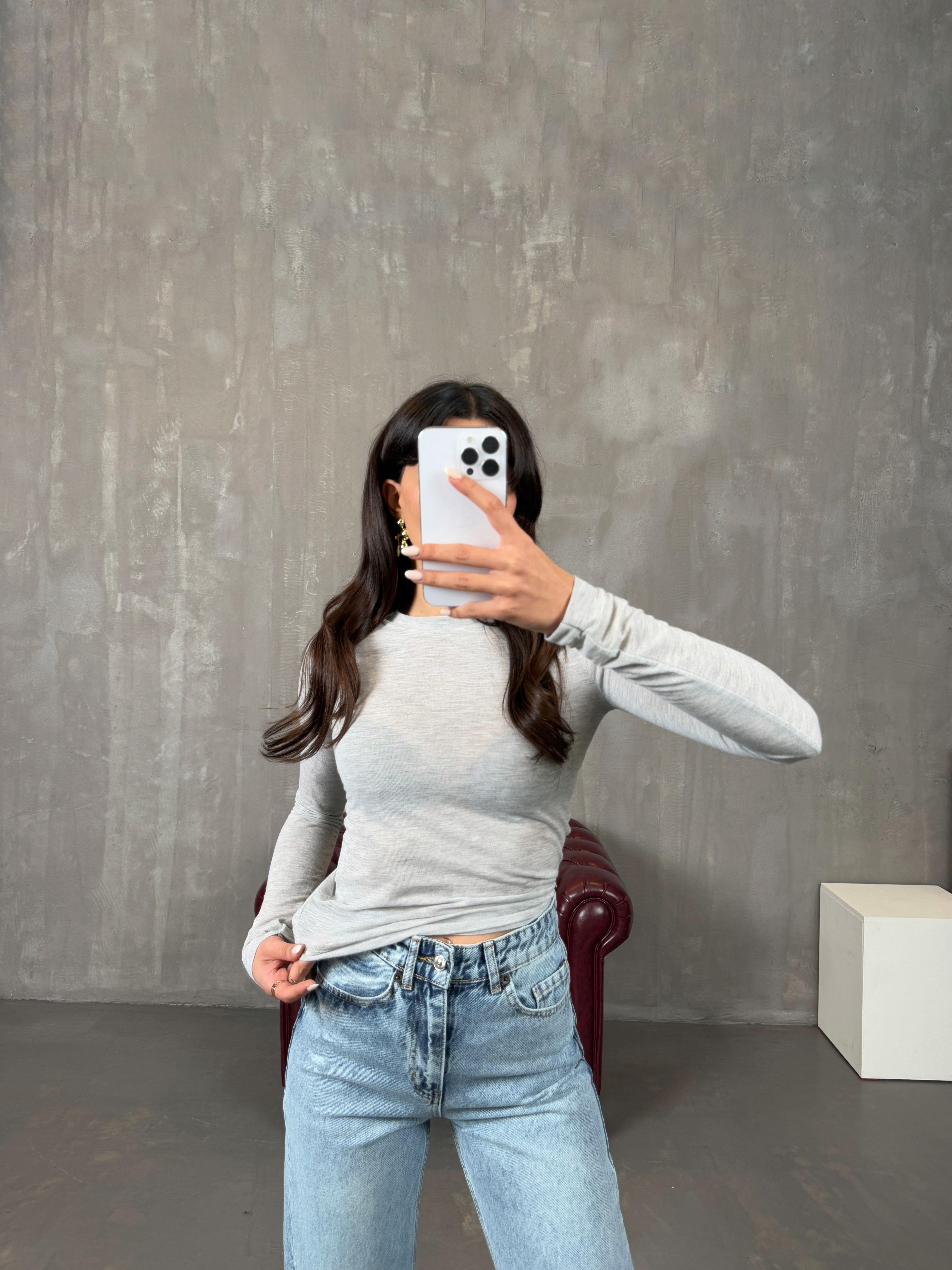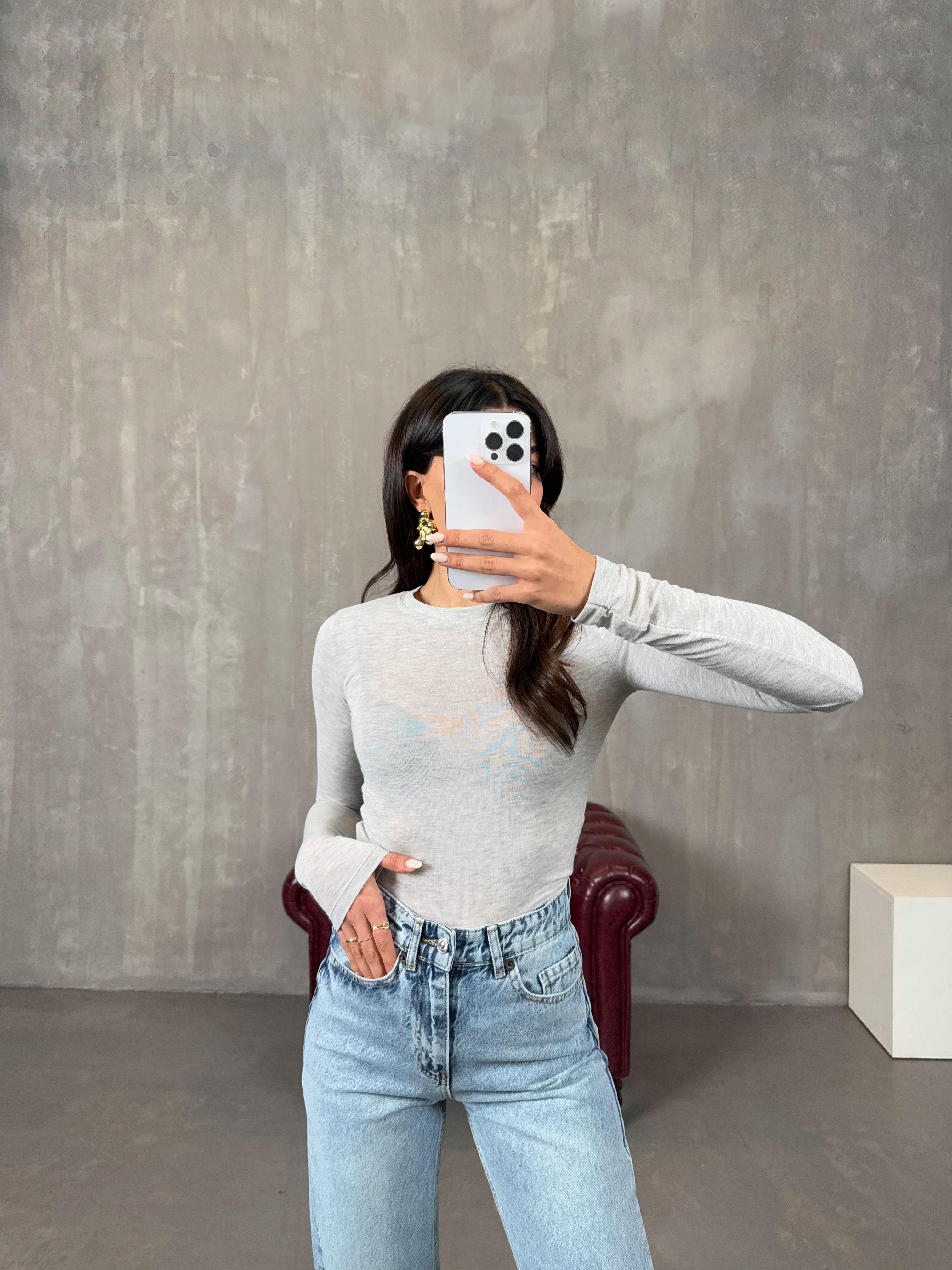 ميدي بلوزة لون رمادي ‎شفافة قليلاً بياقة دائرية