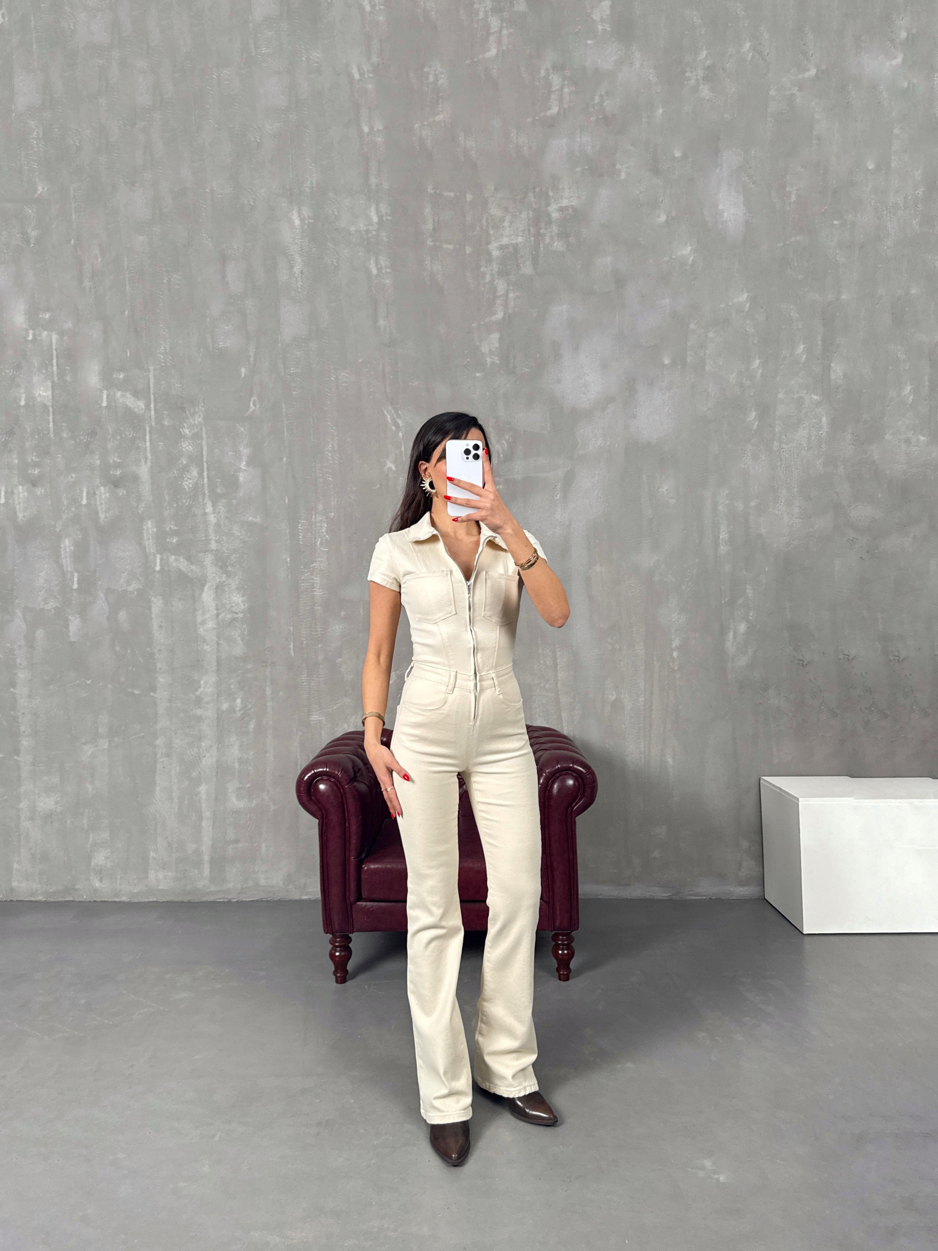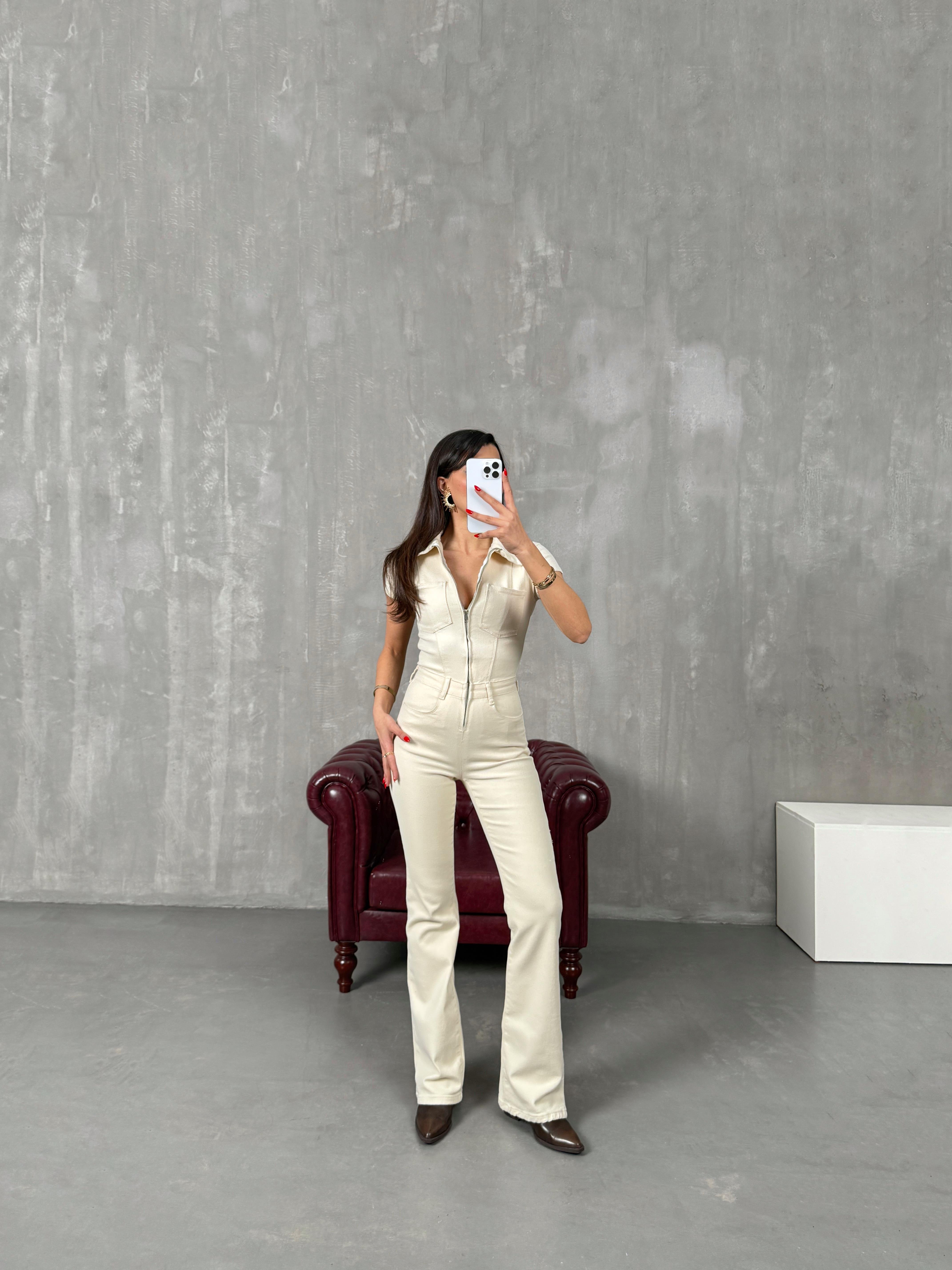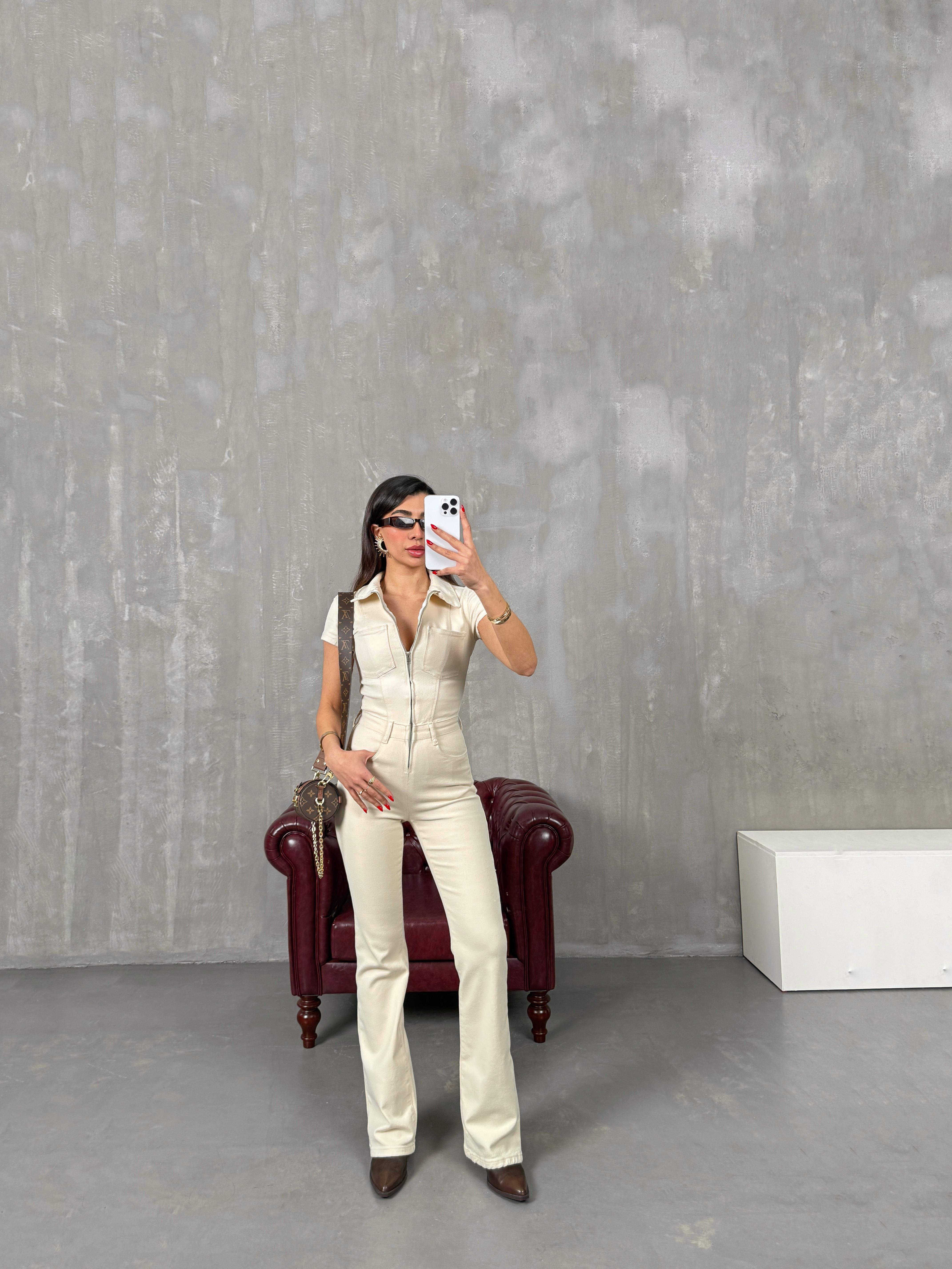 ميلين جمبسوت لون إكرو قماش جبردين مع سحّاب
