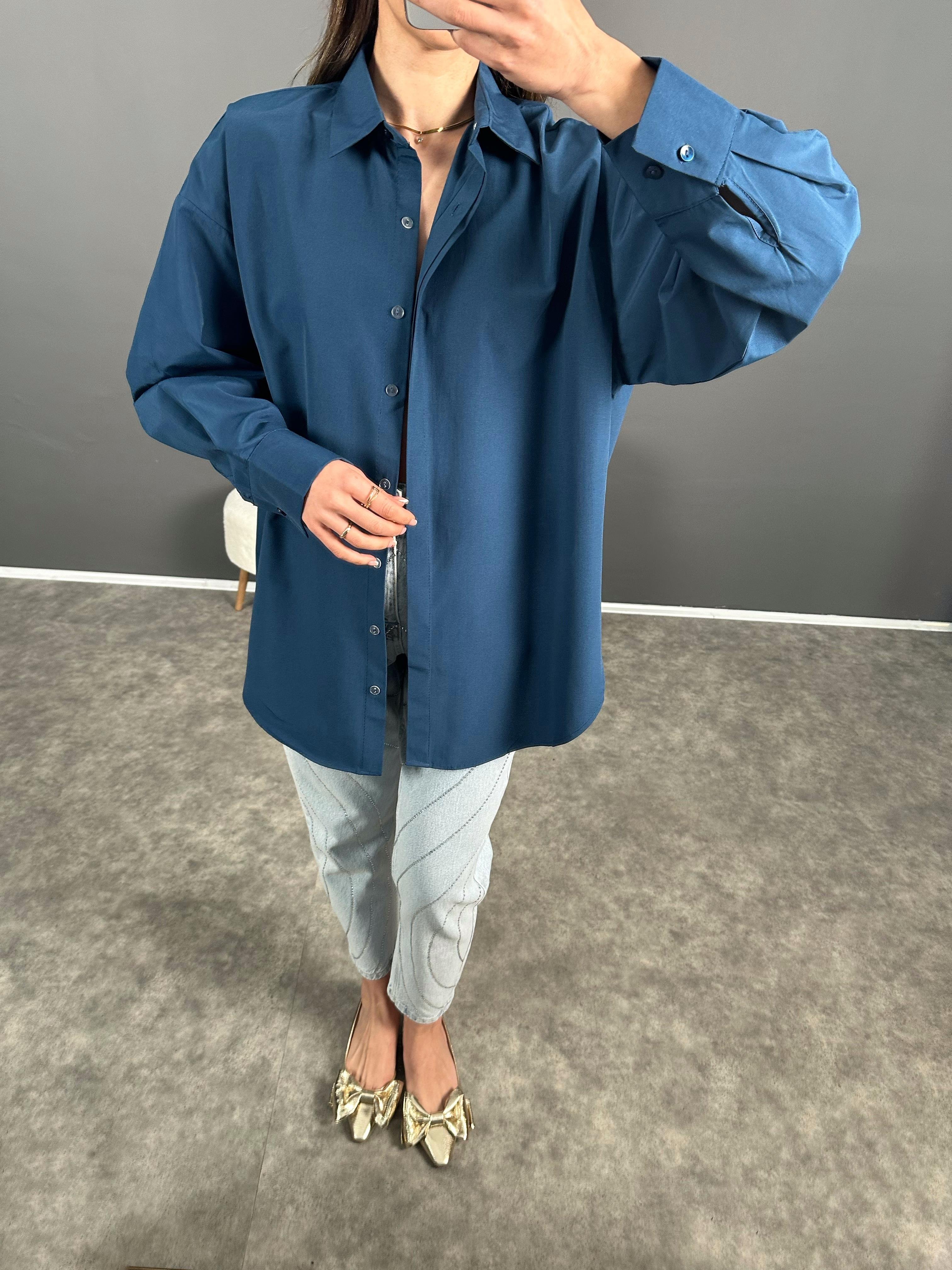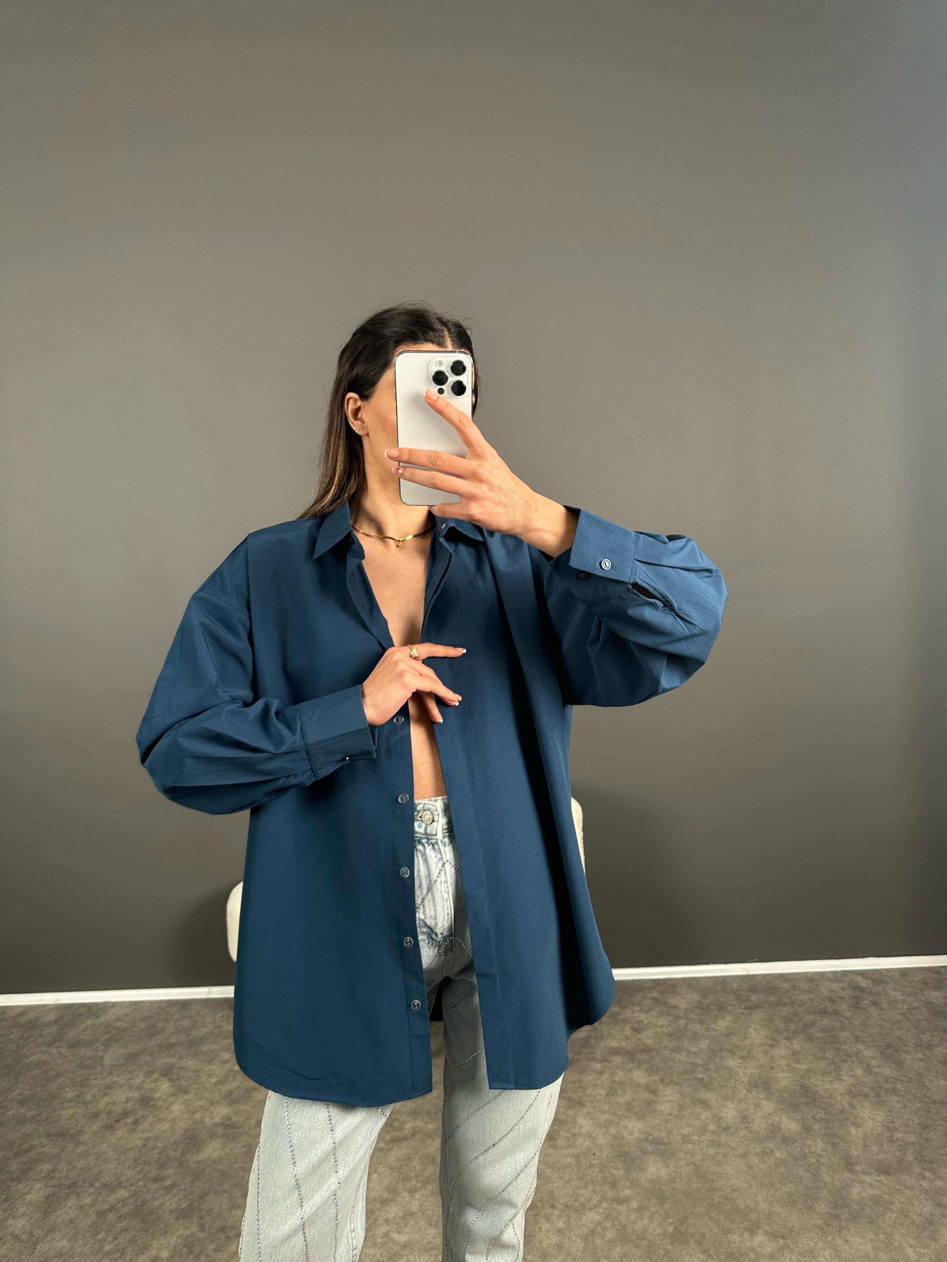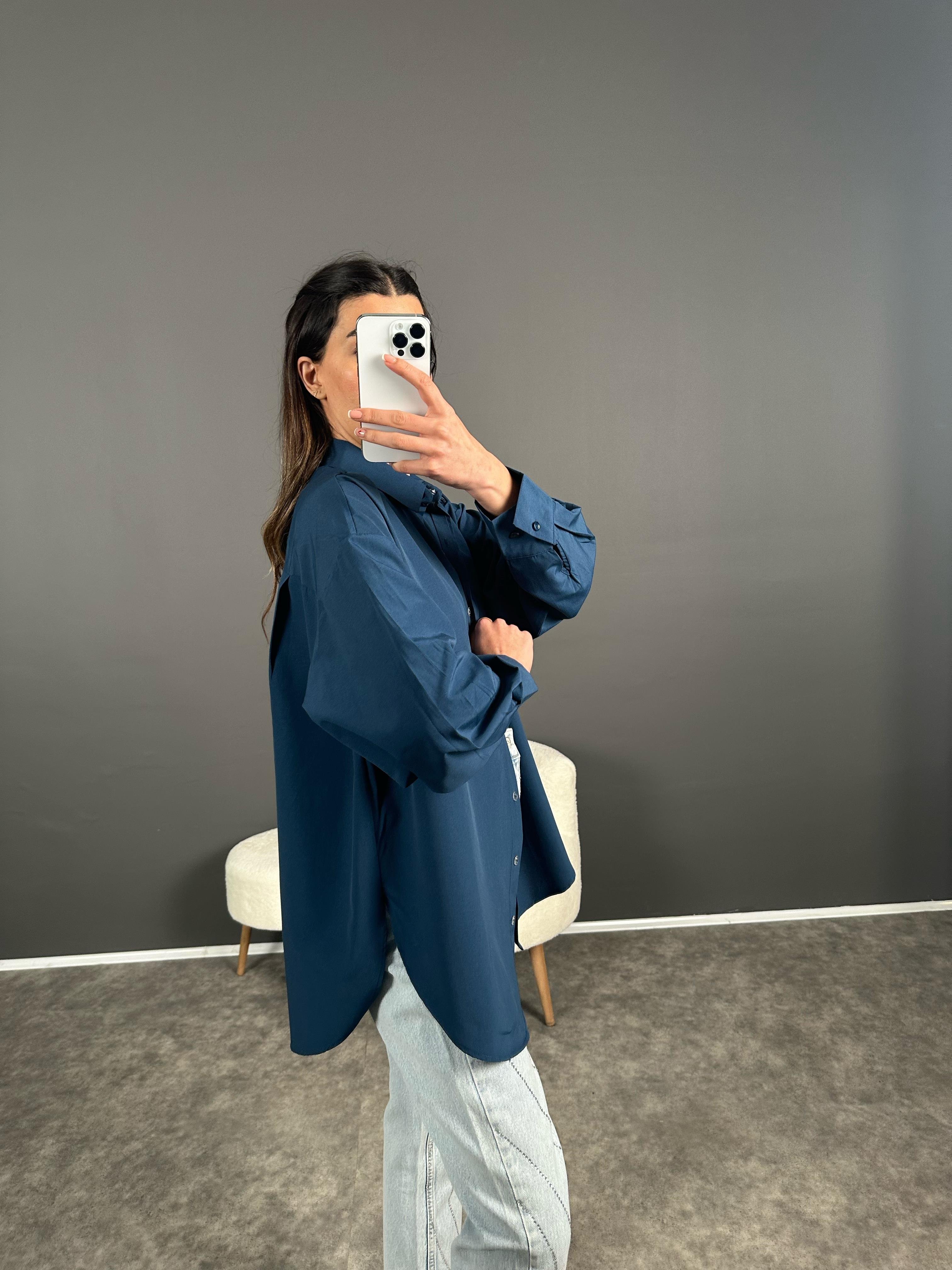 Min Lacivert Oversize Gizli Düğmeli Gömlek