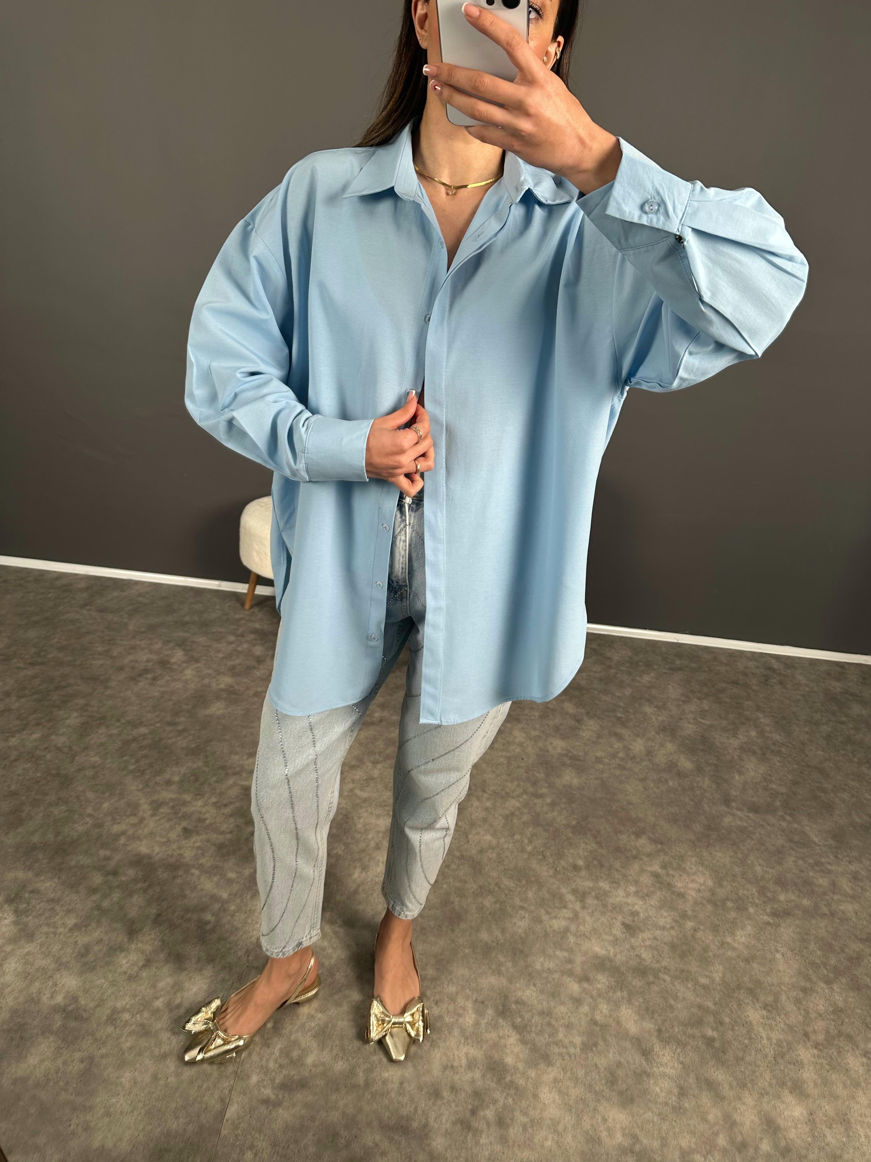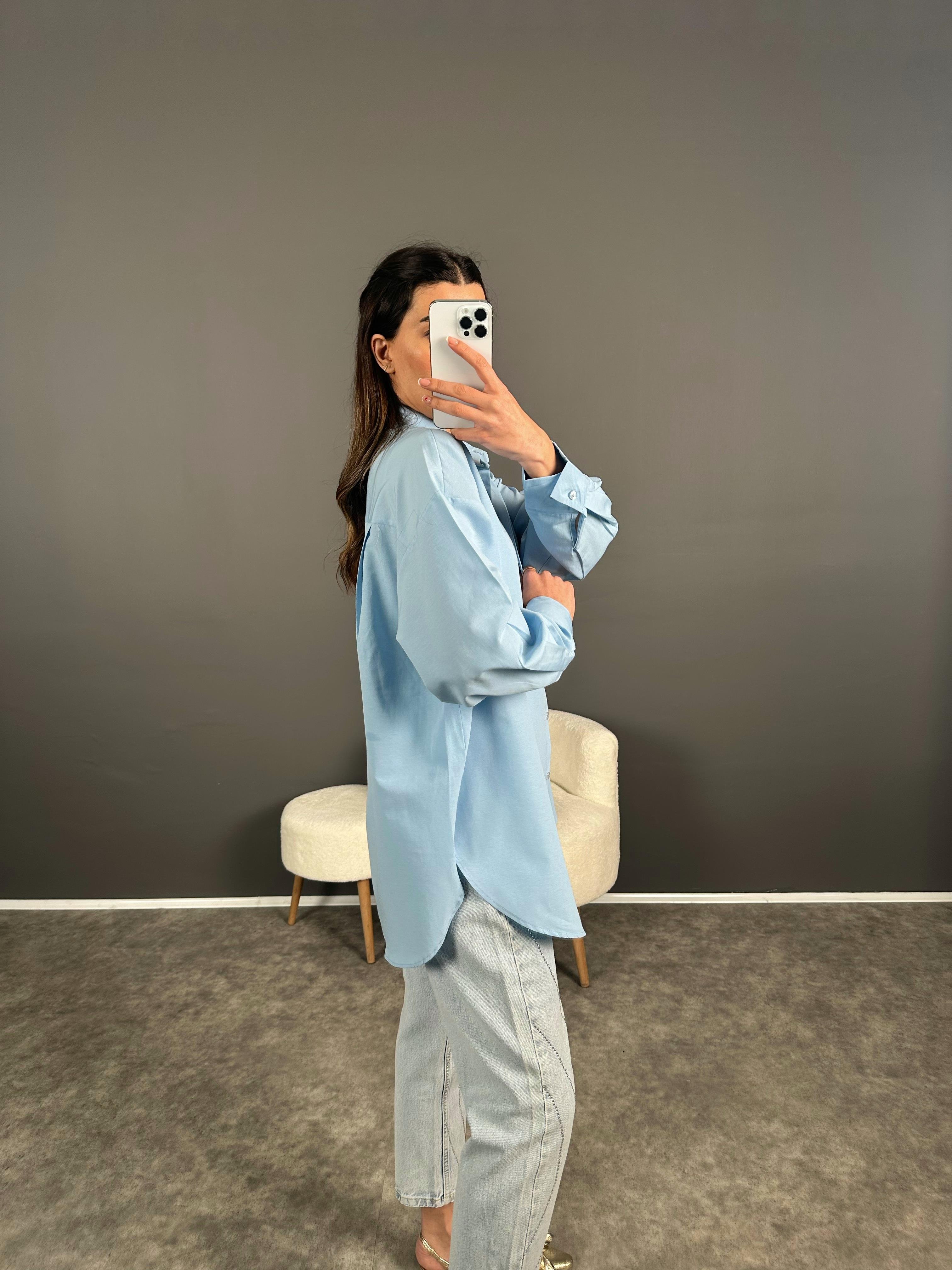 Min Mavi Oversize Gizli Düğmeli Gömlek