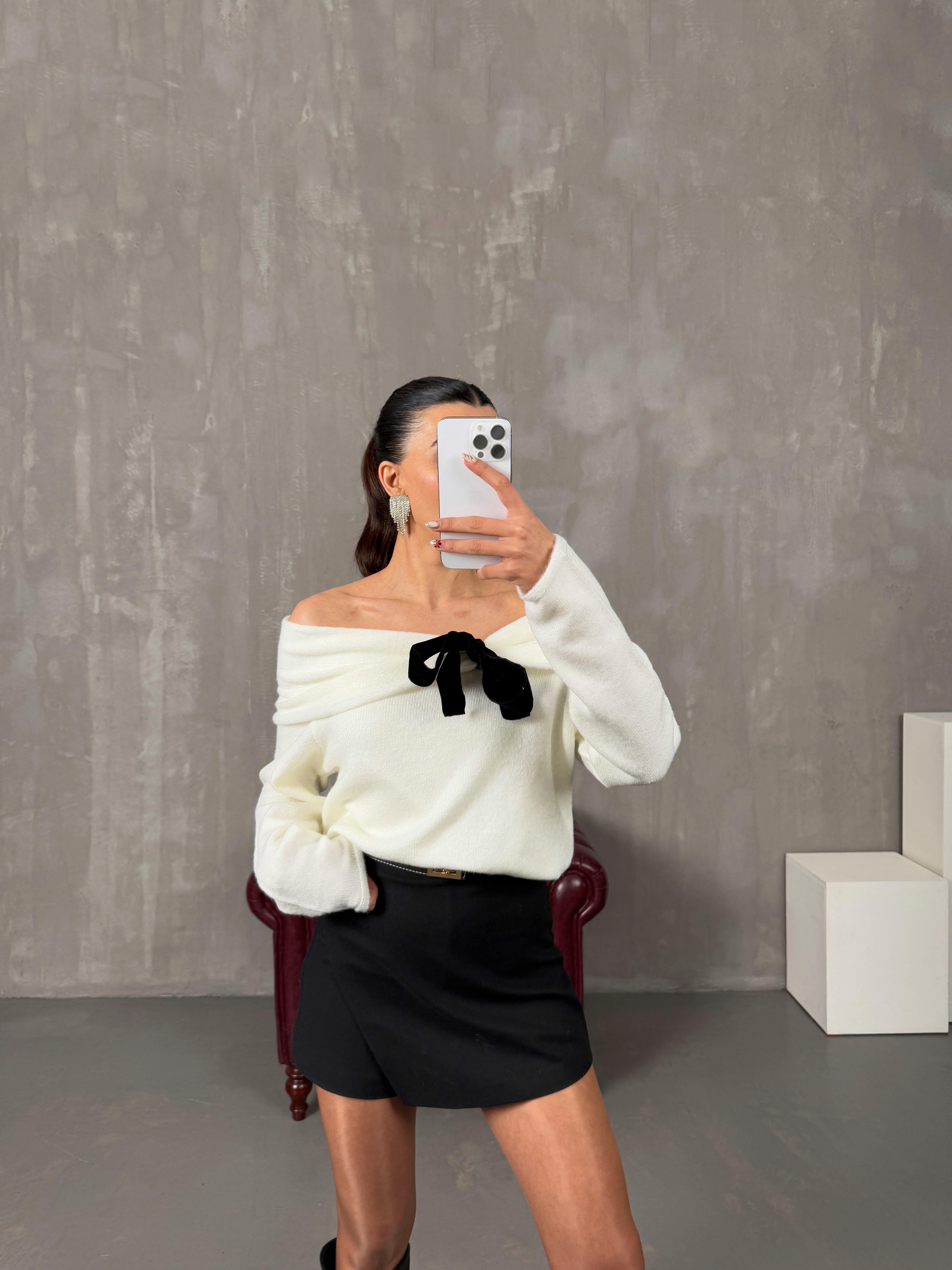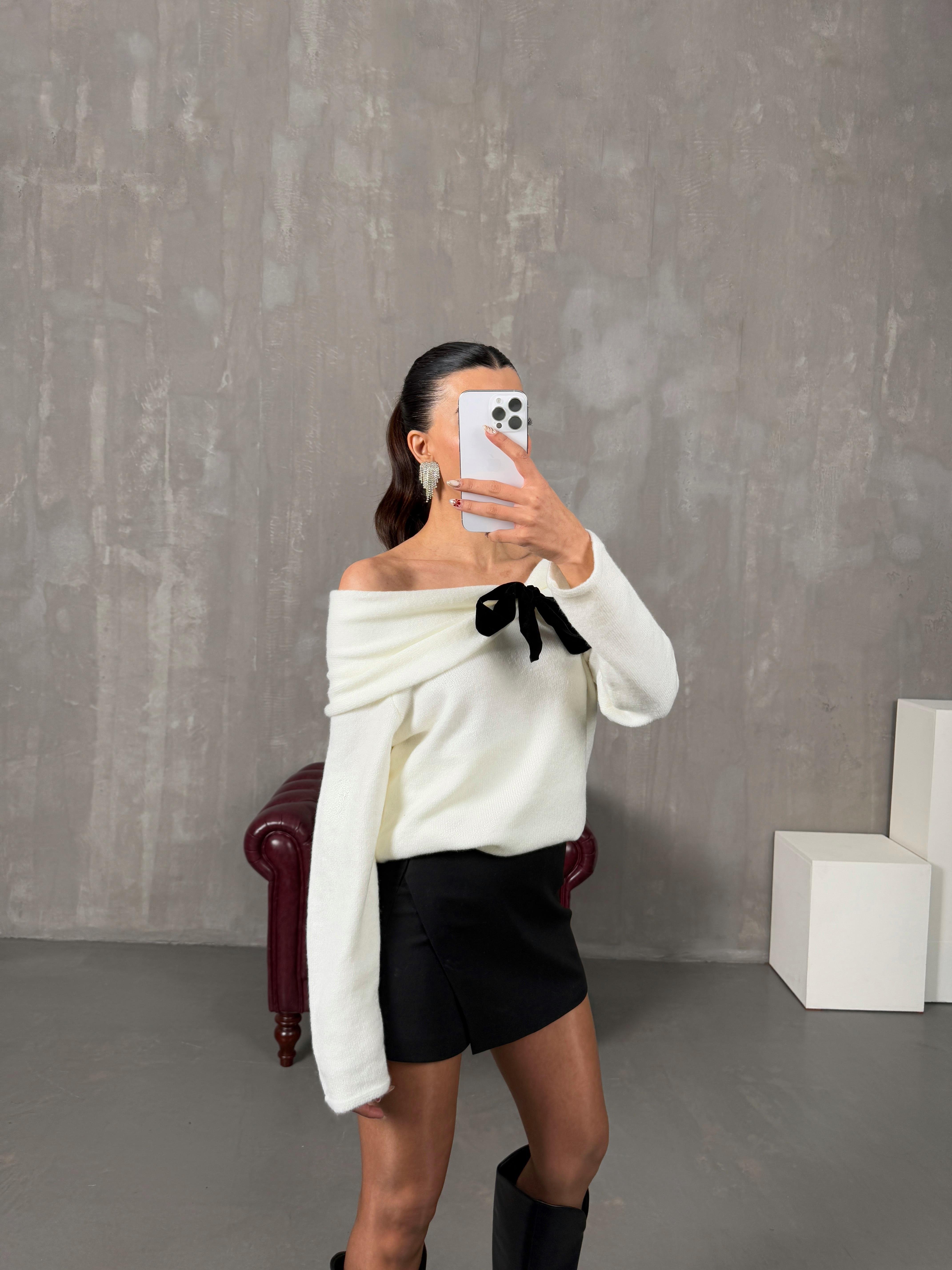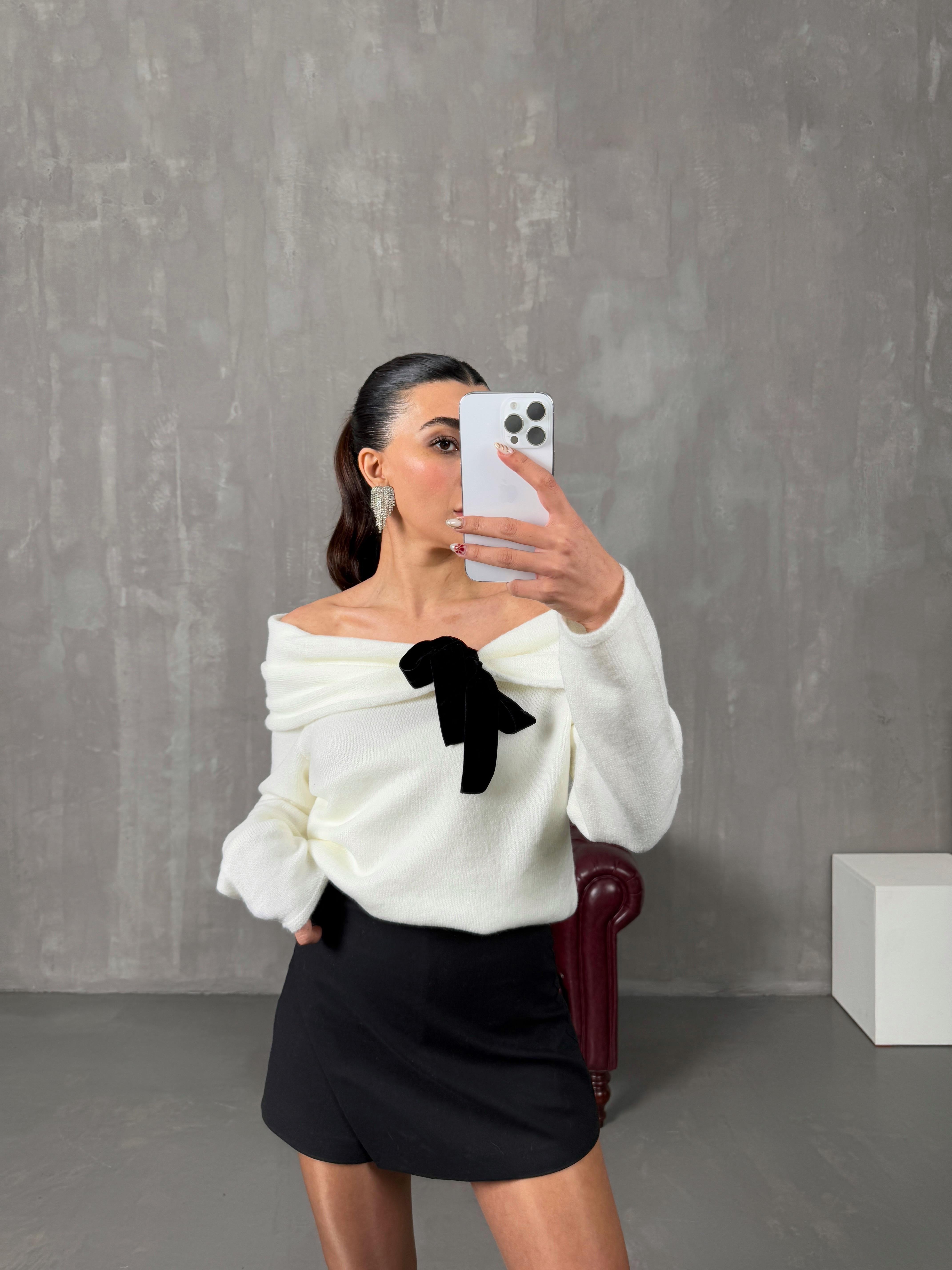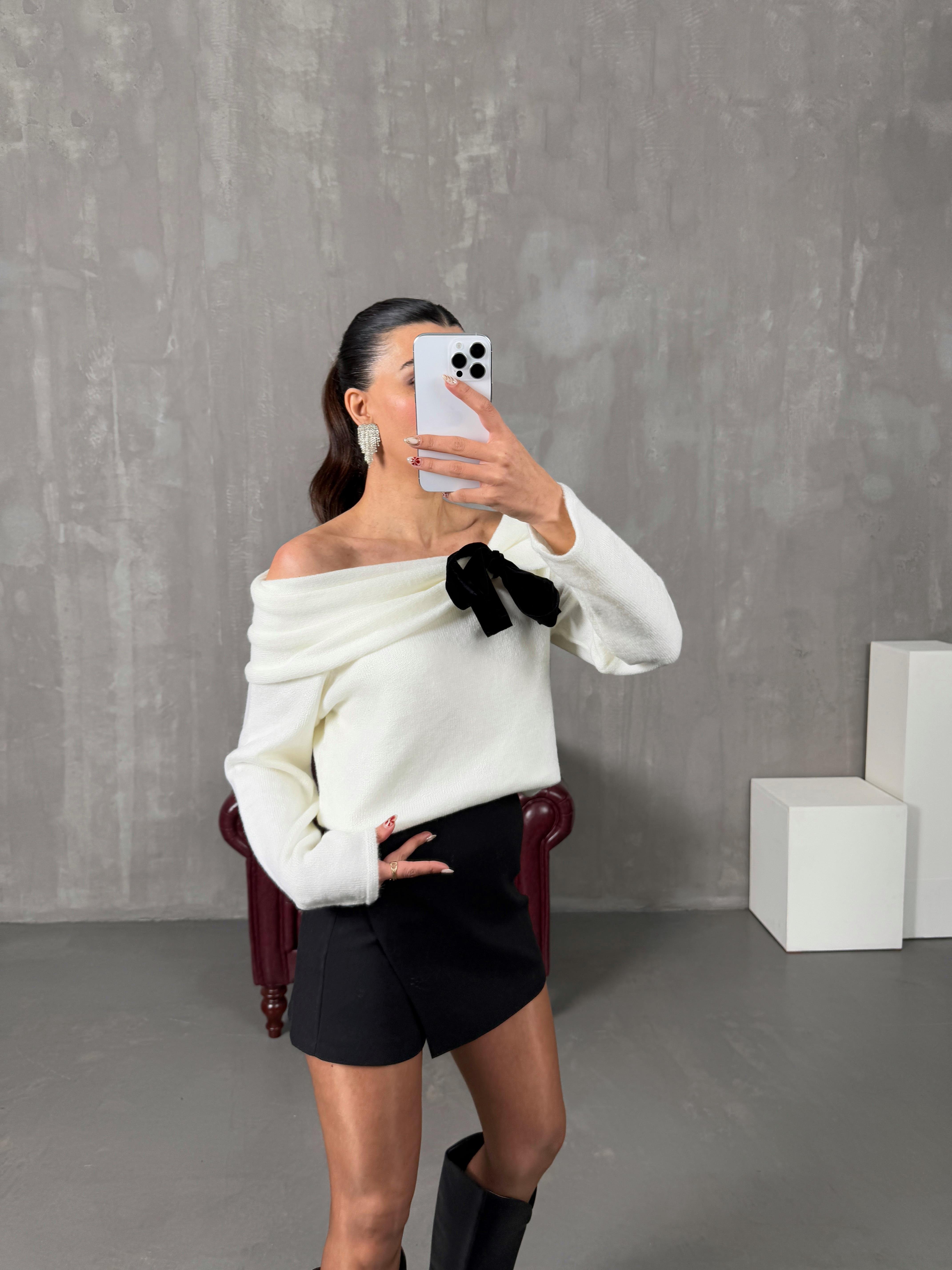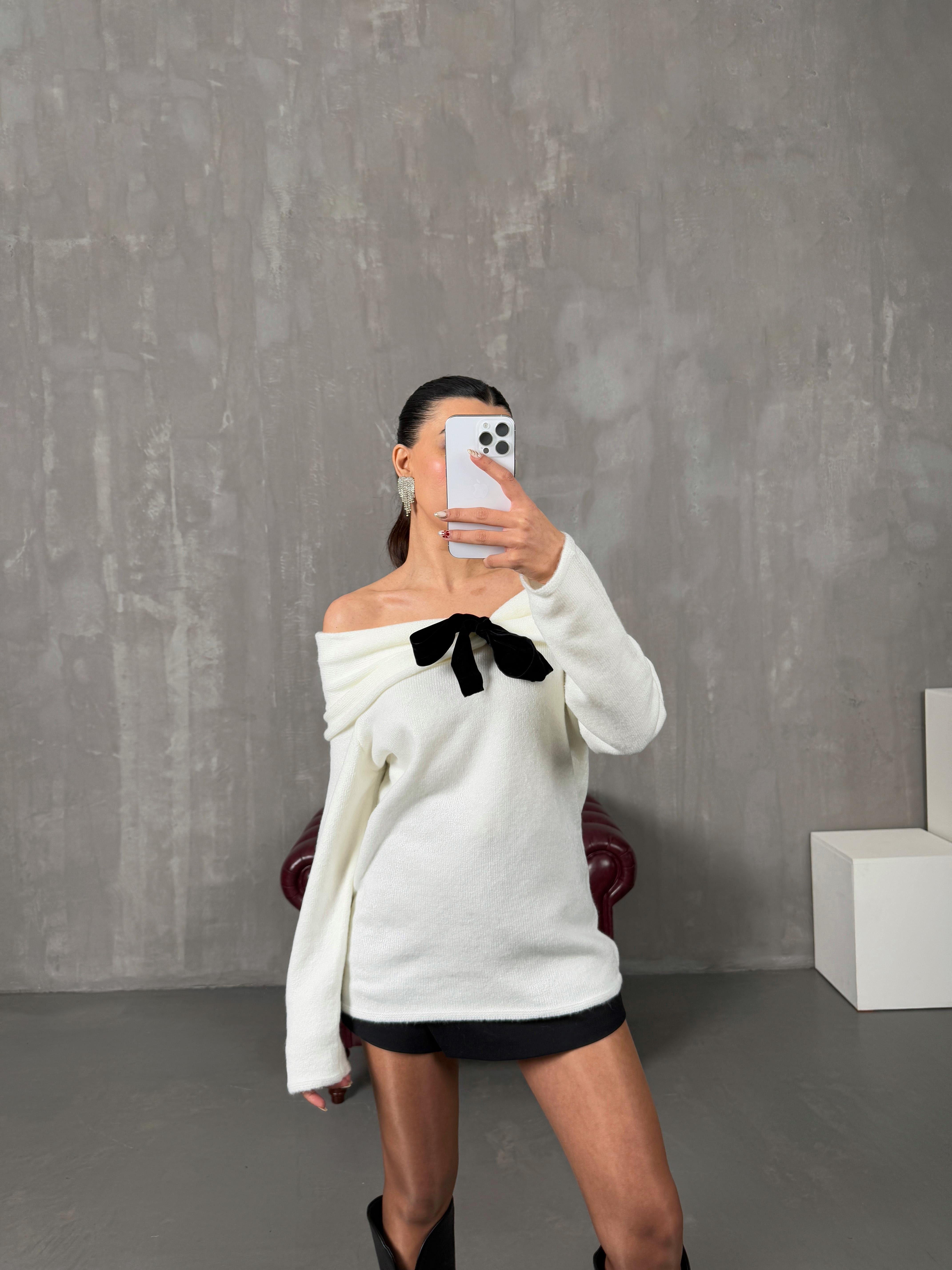 مينسا كنزة بيضاء ياقة مادونا مع تفاصيل فيونكة