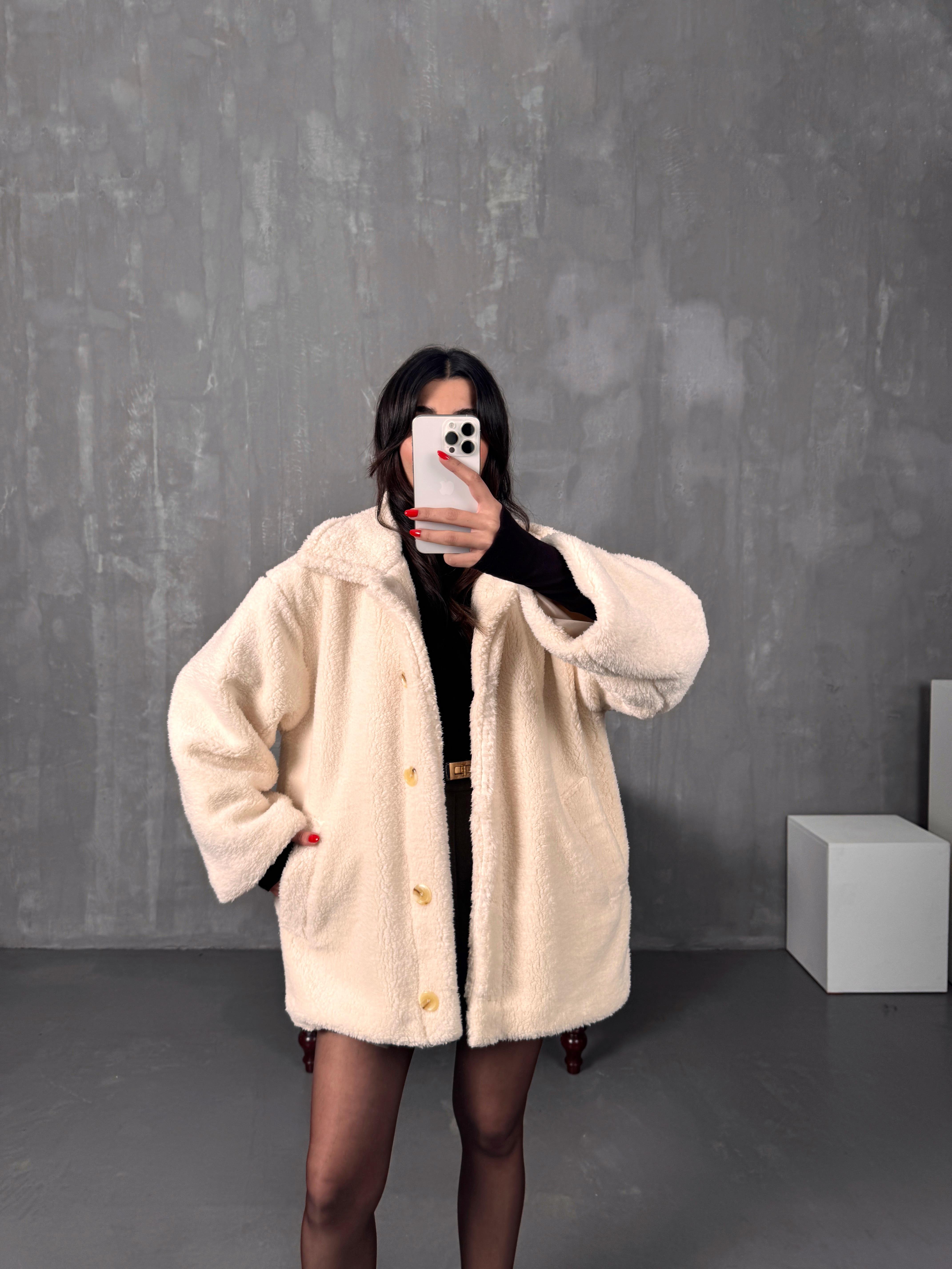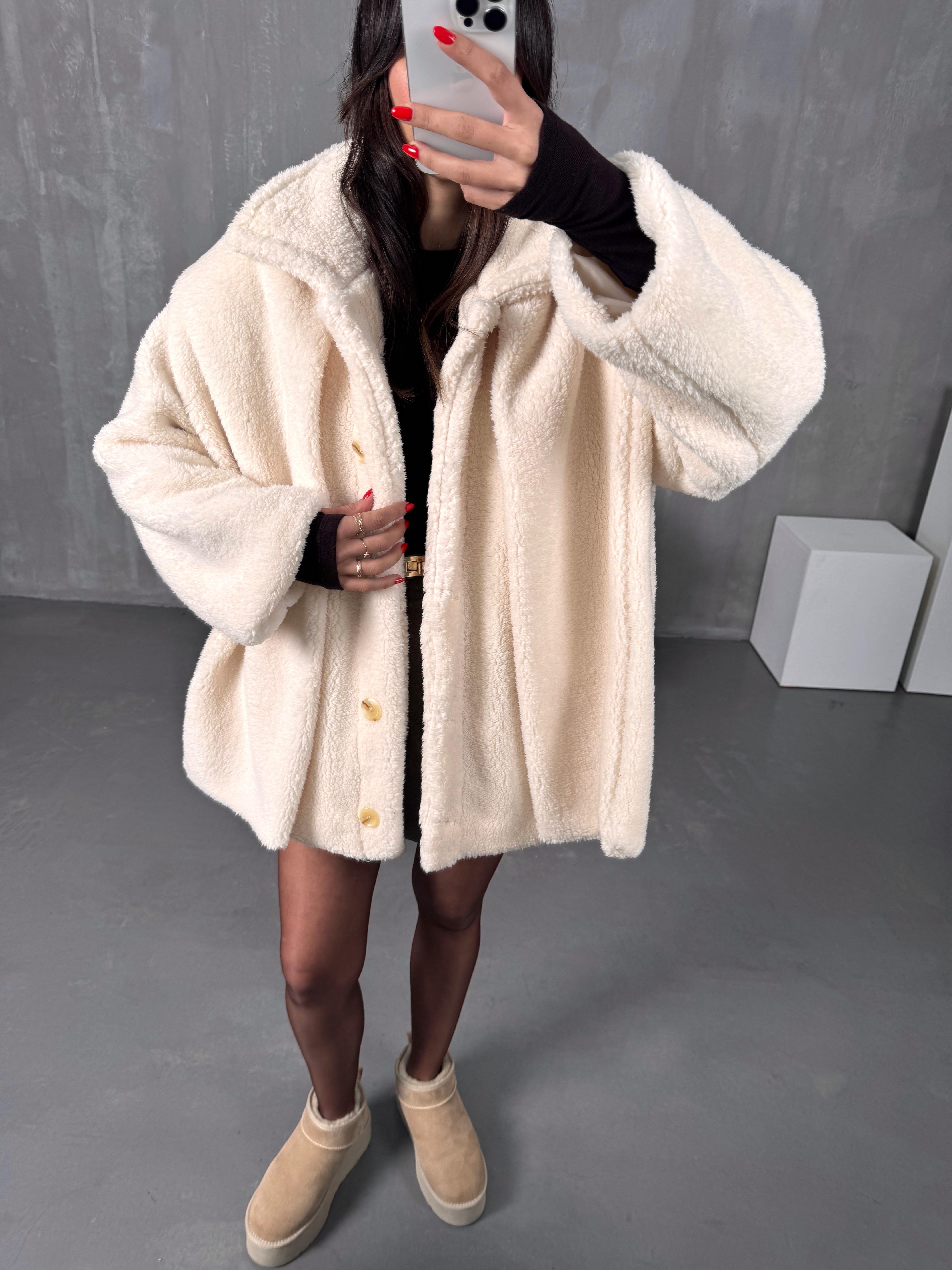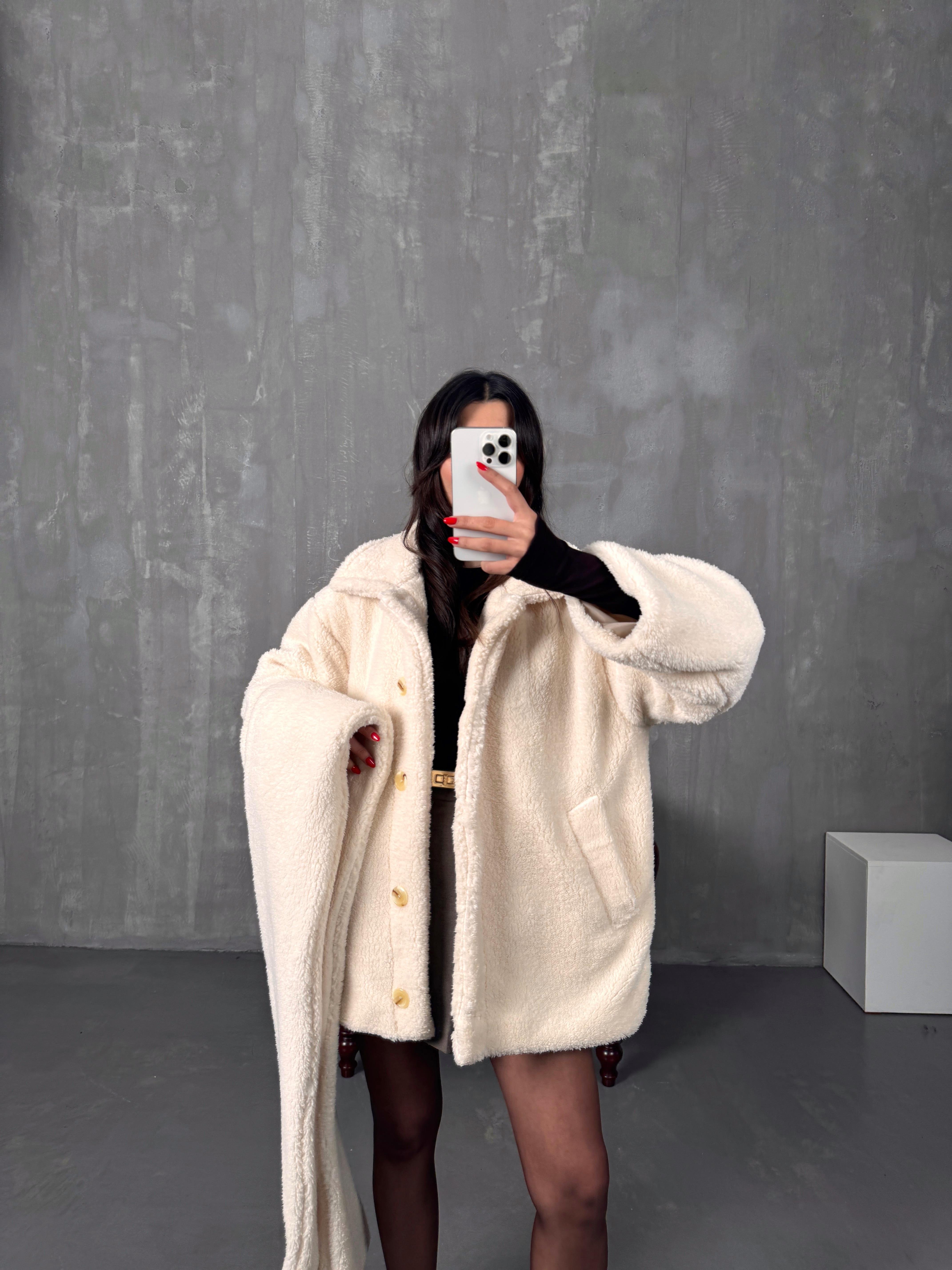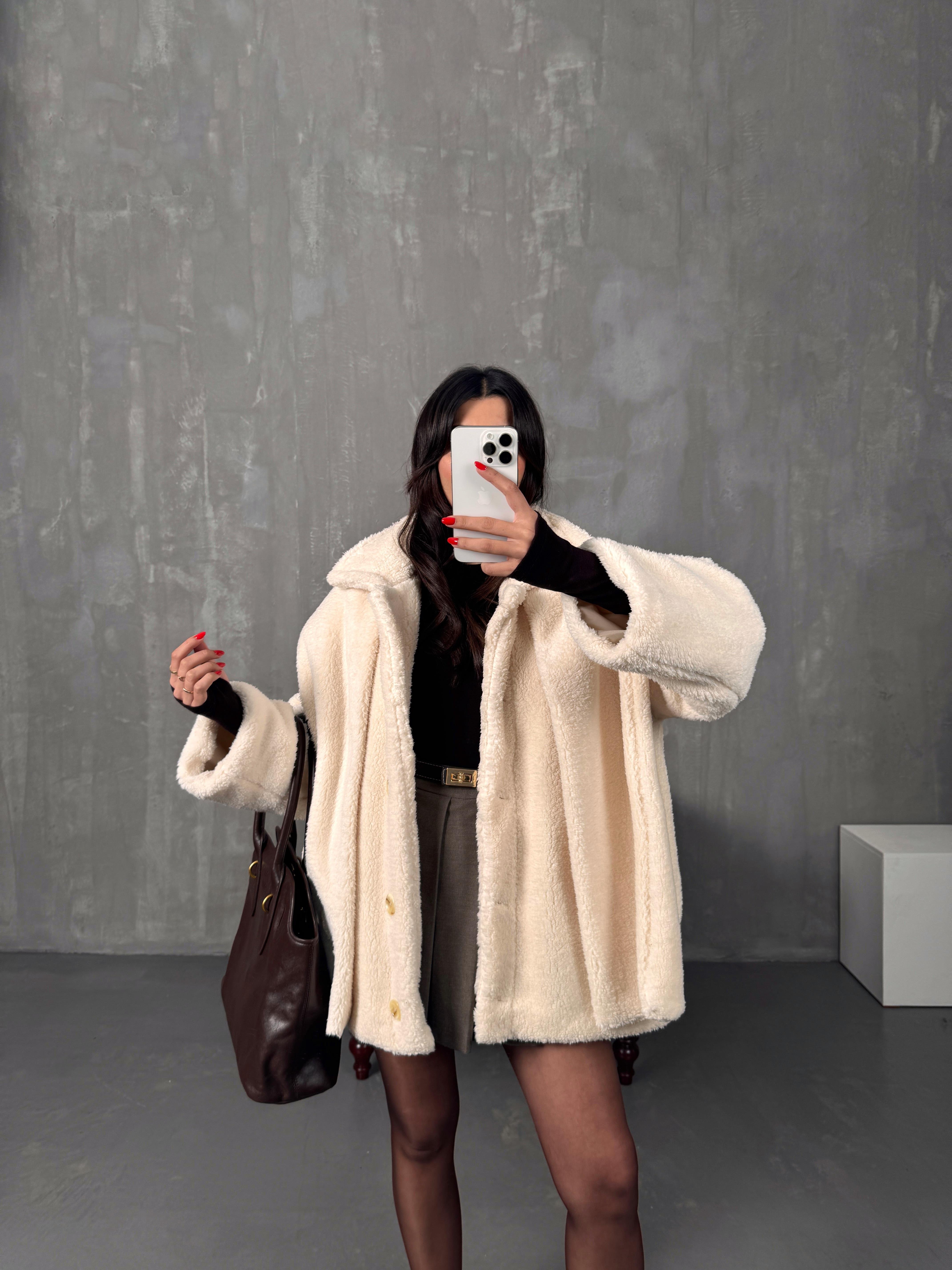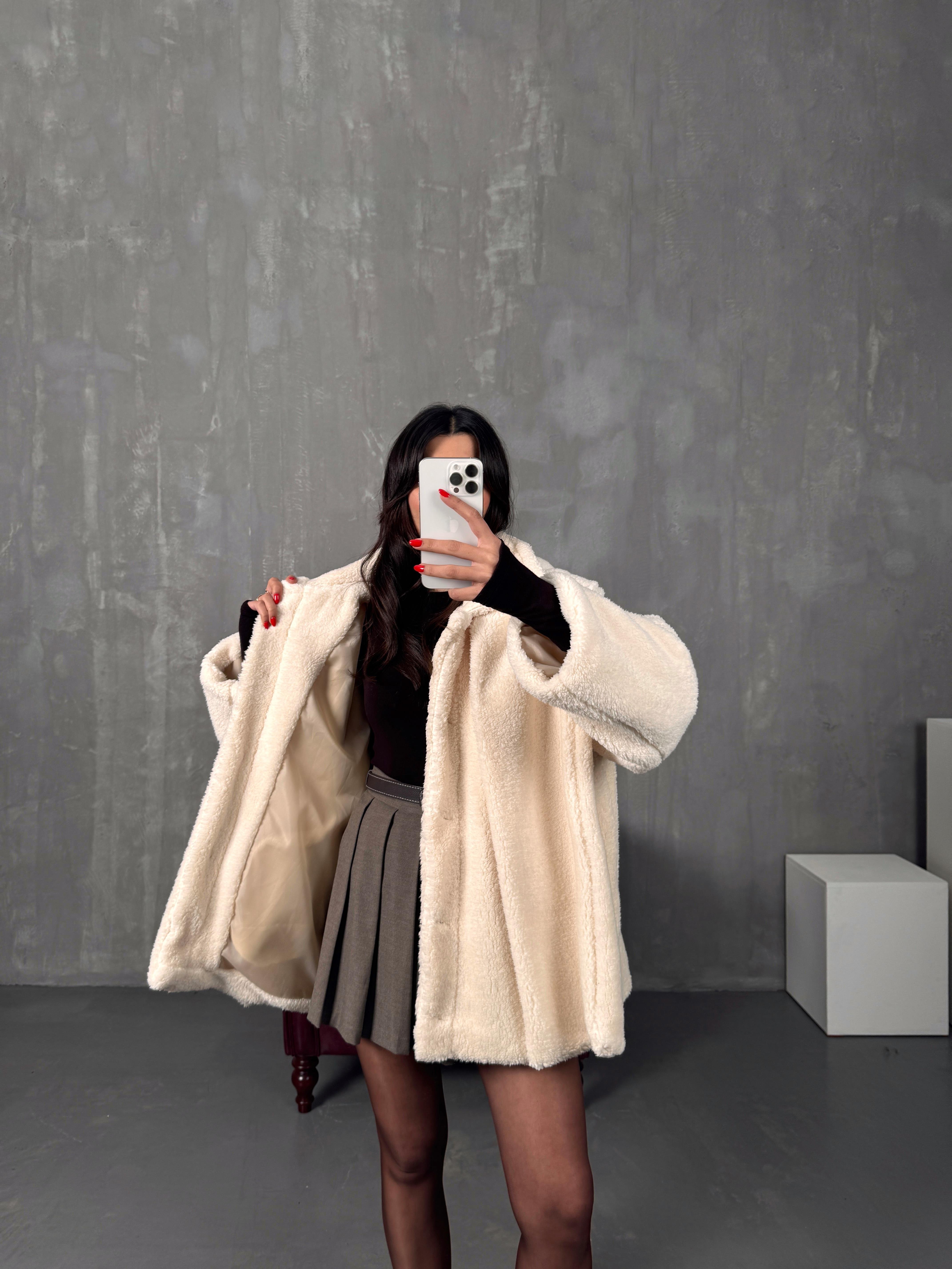 Monce Krem Astarlı Atkı Detaylı Peluş Kaban