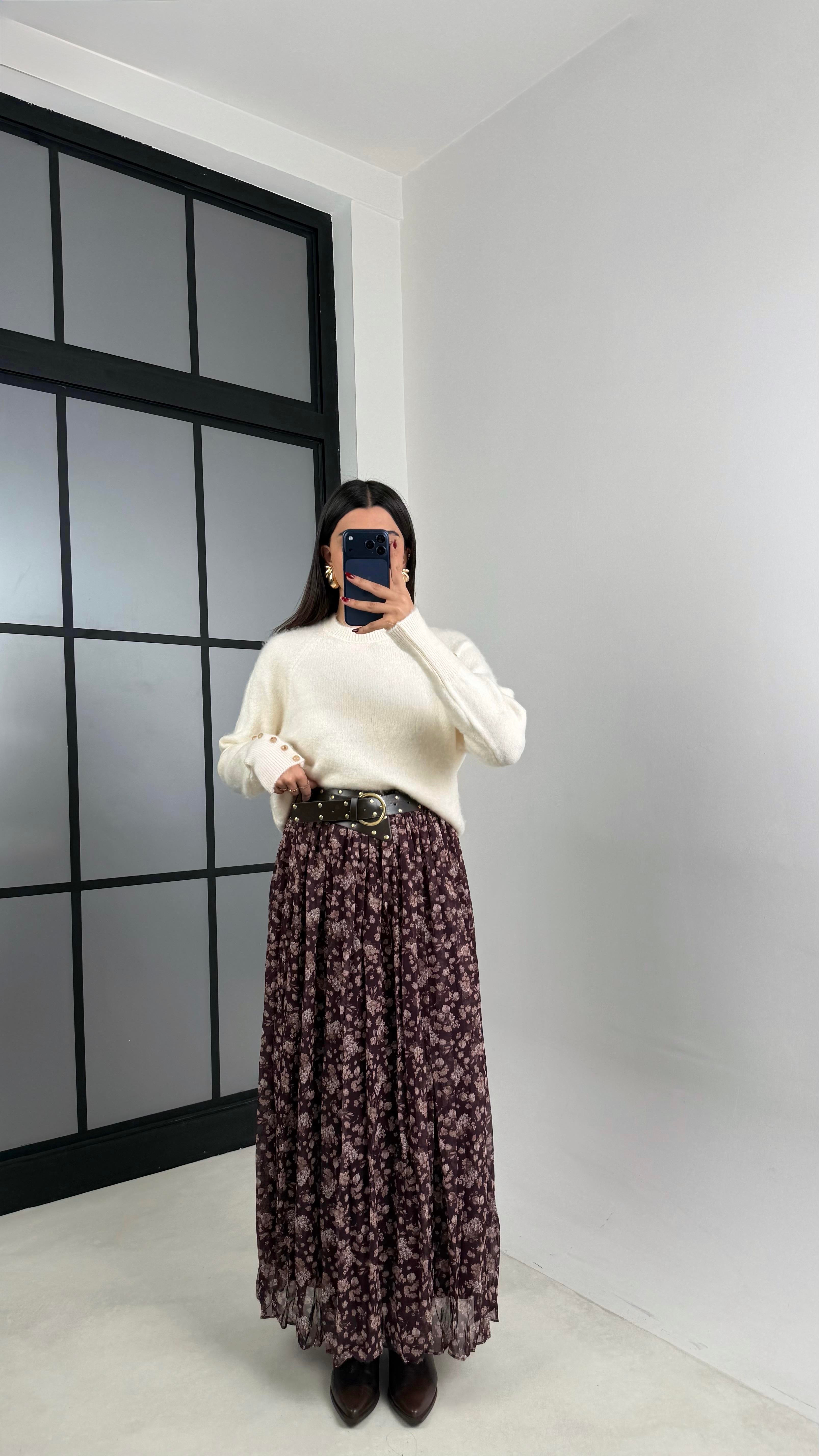 Mürdüm Çiçek Desenli Kemerli Astarlı Etek GAUS-00643