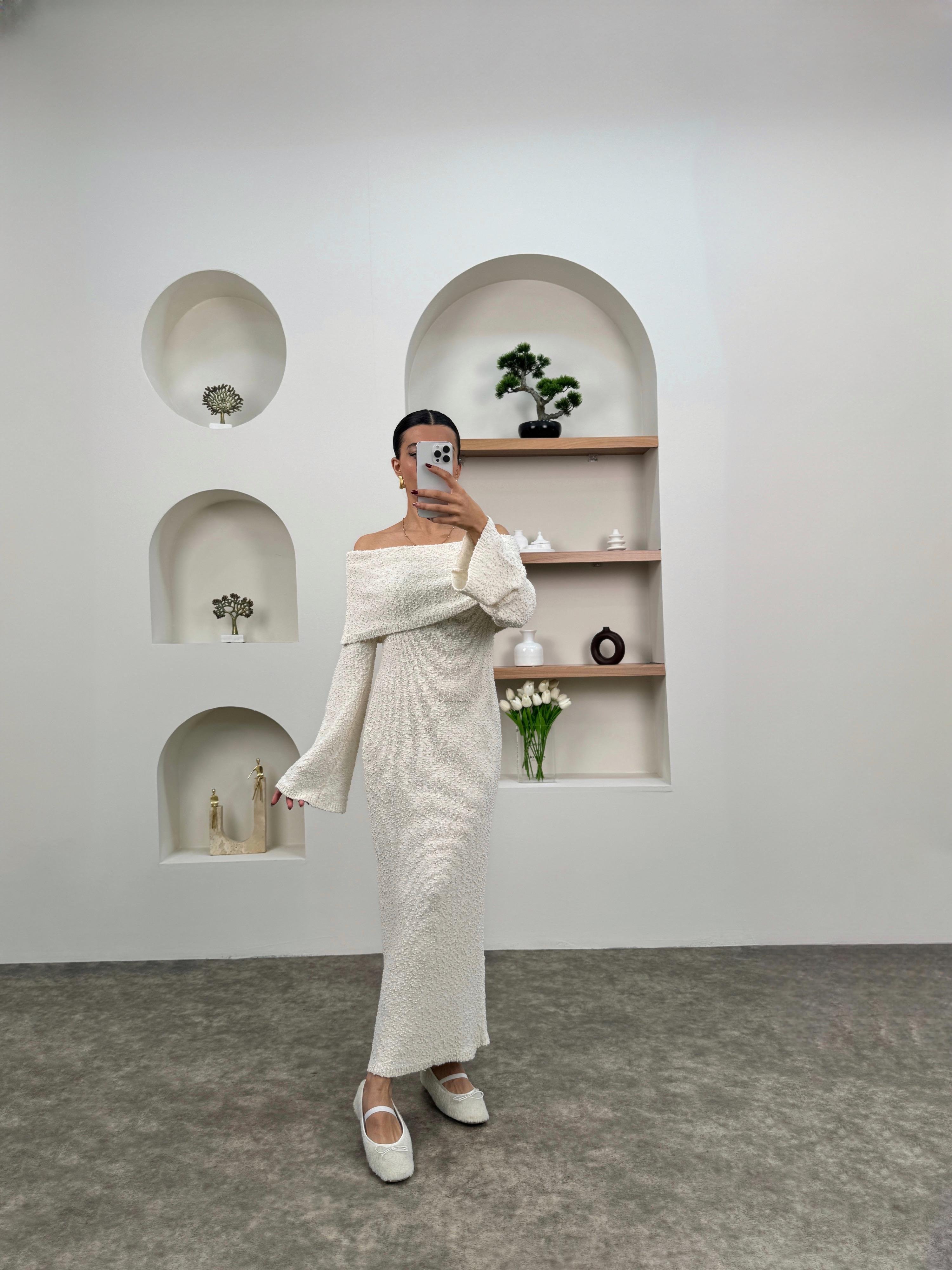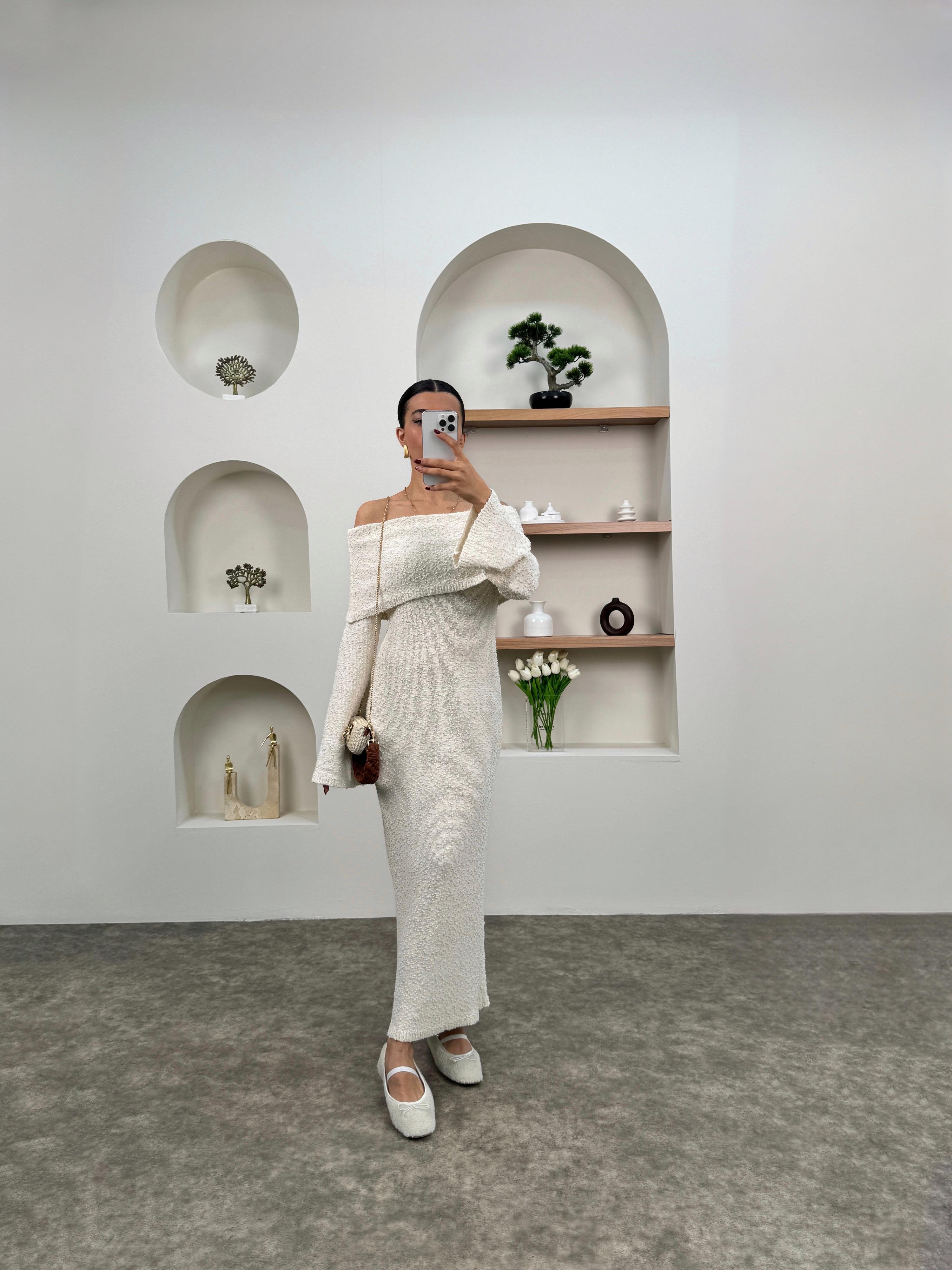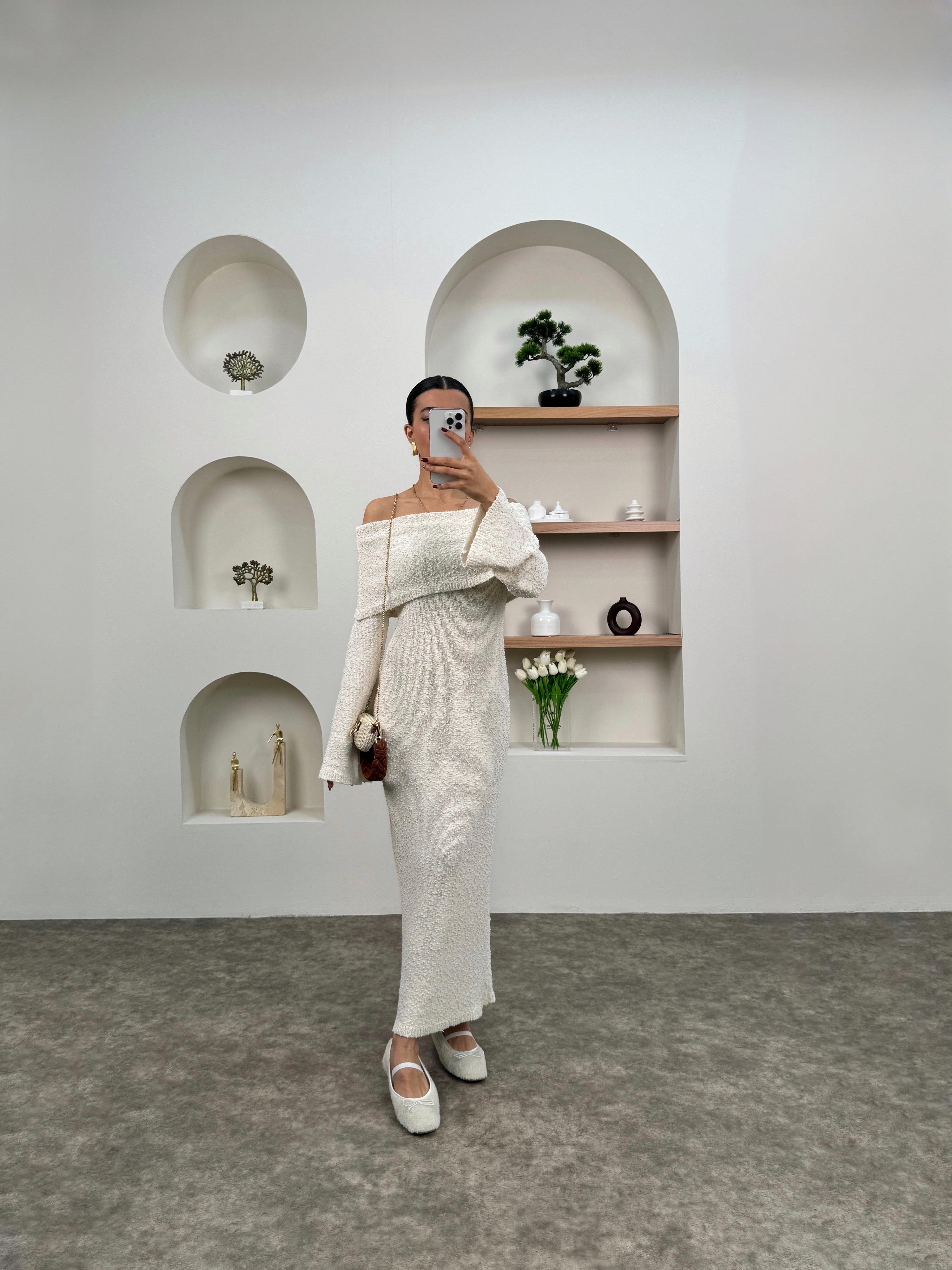 Nancy Ekru Kayık Yaka Triko Tasarım Elbise