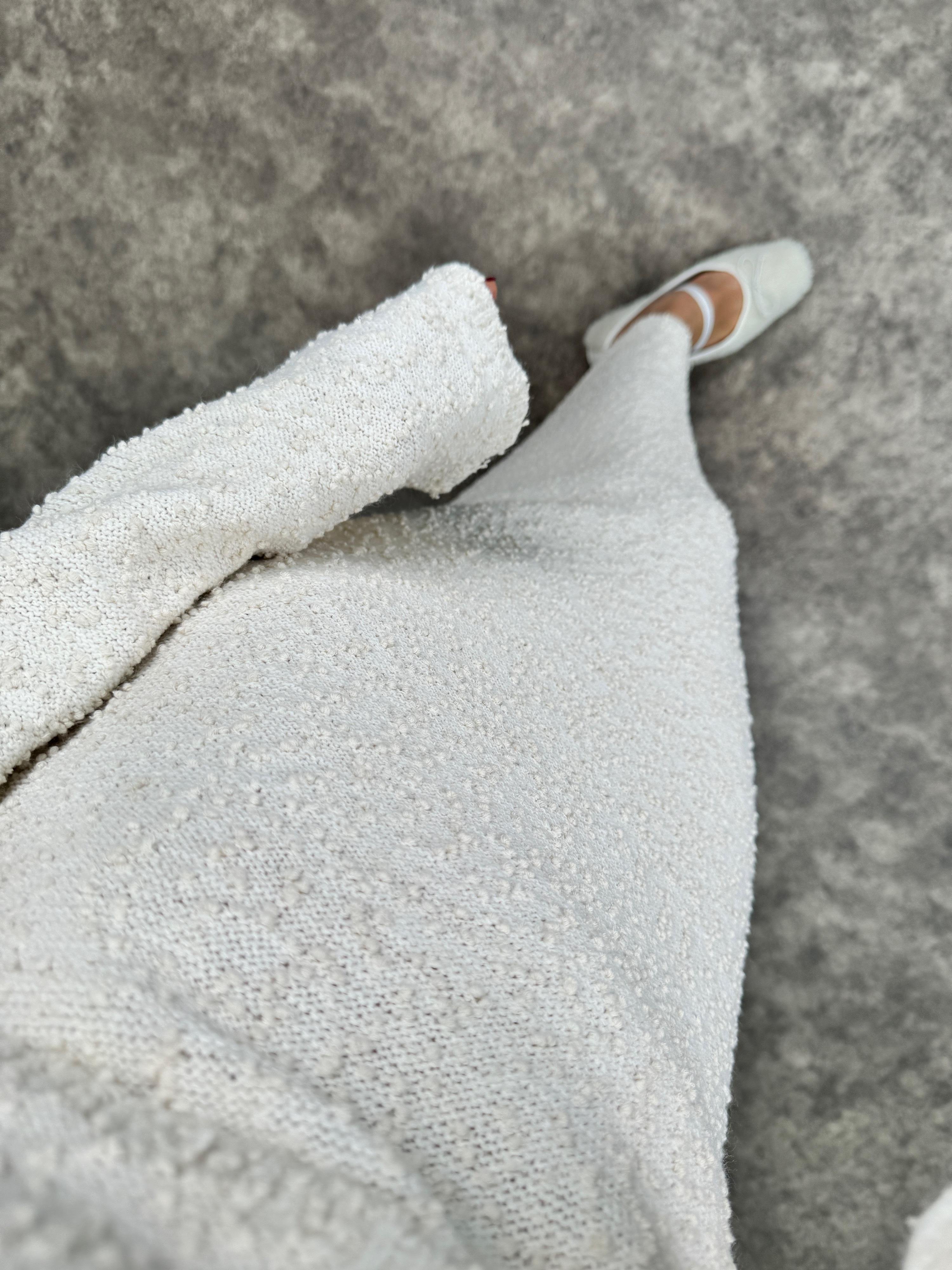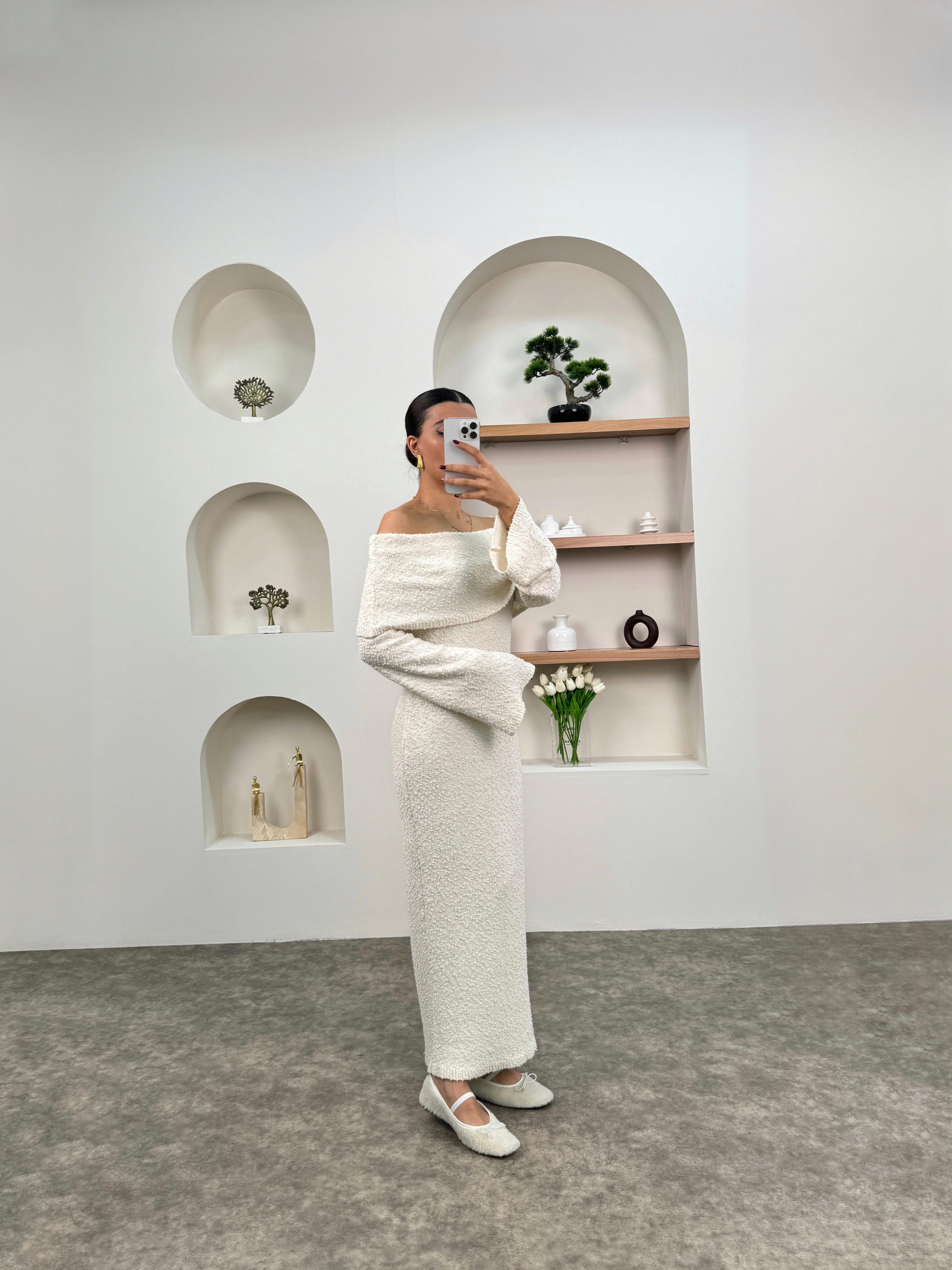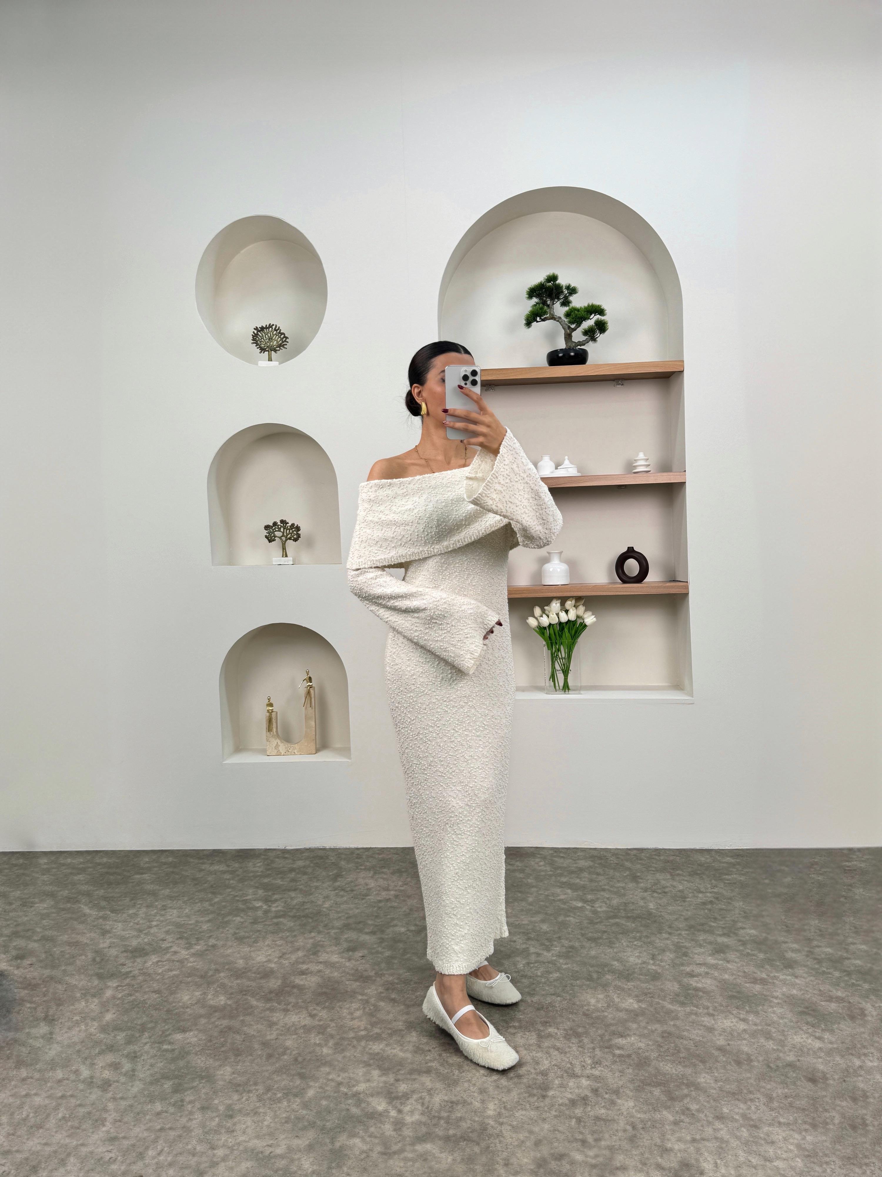 Nancy Ekru Kayık Yaka Triko Tasarım Elbise