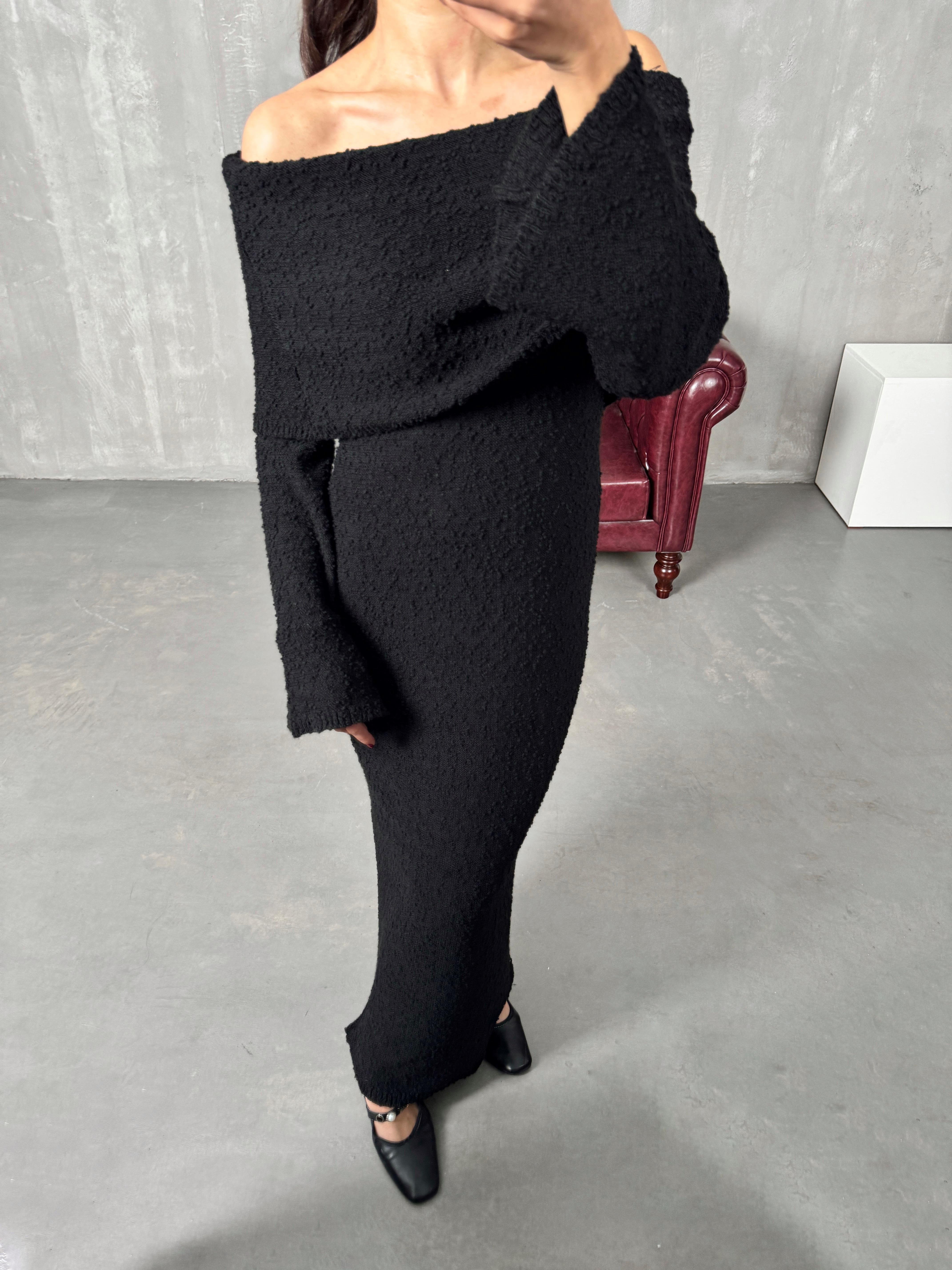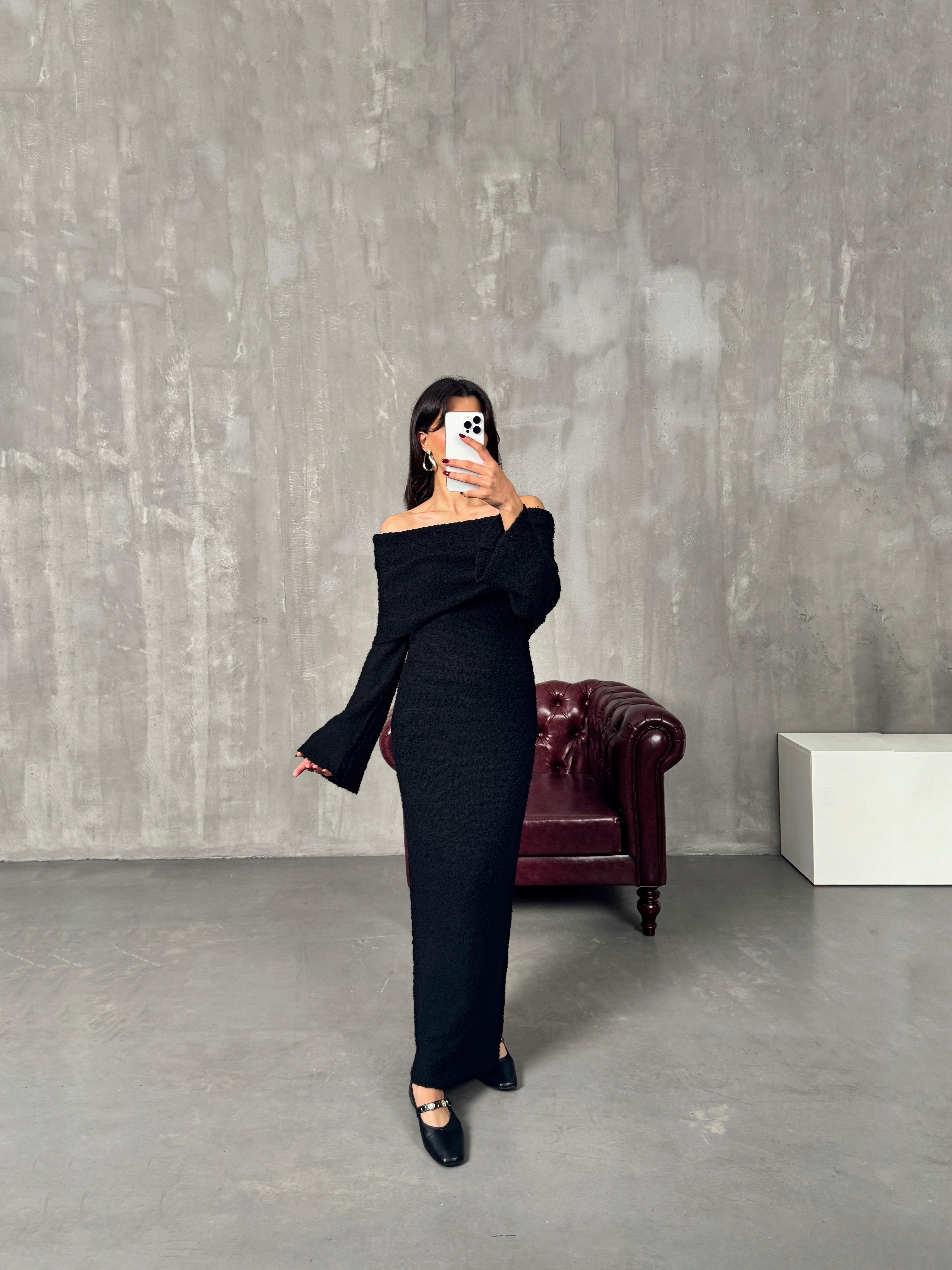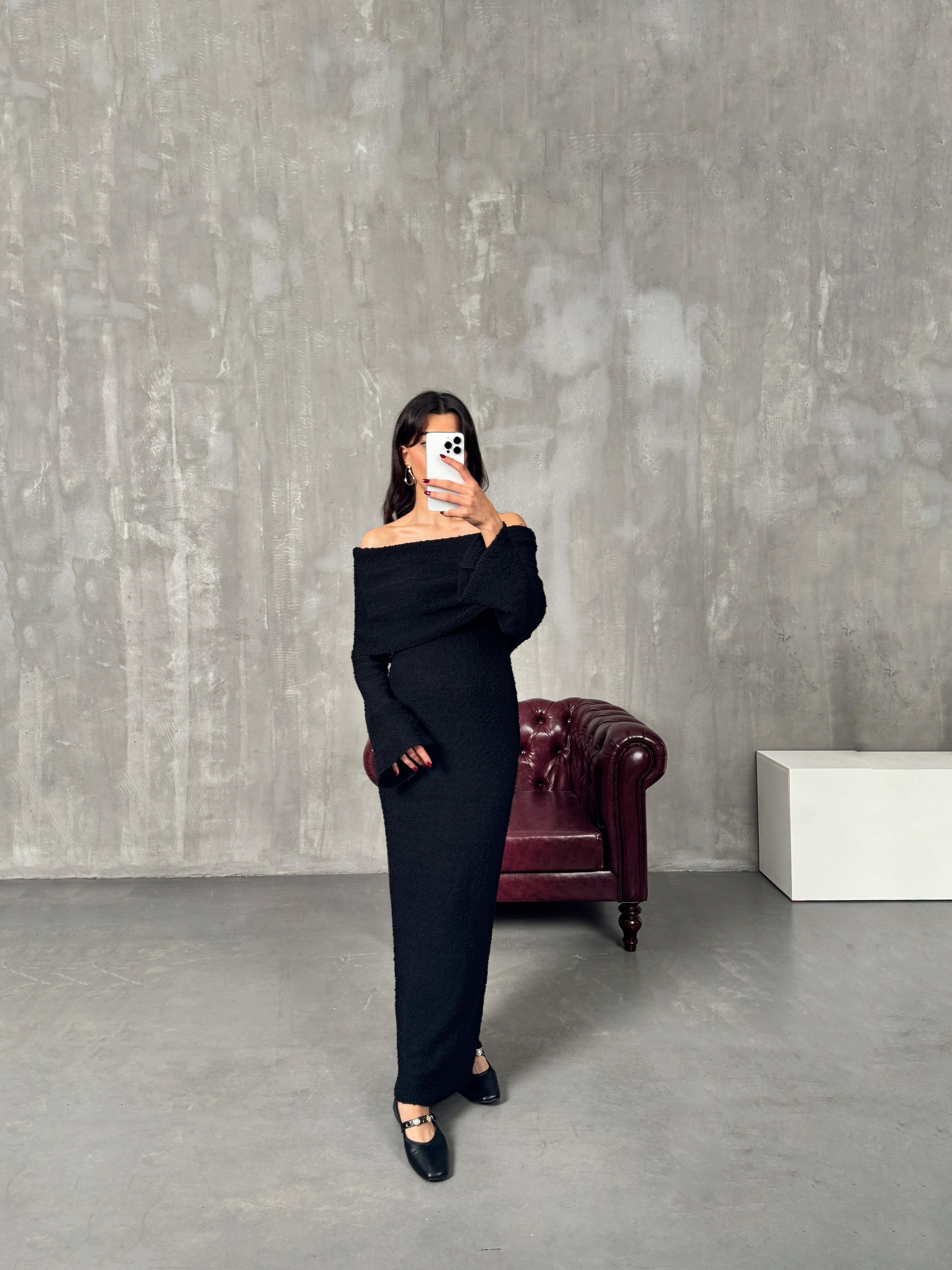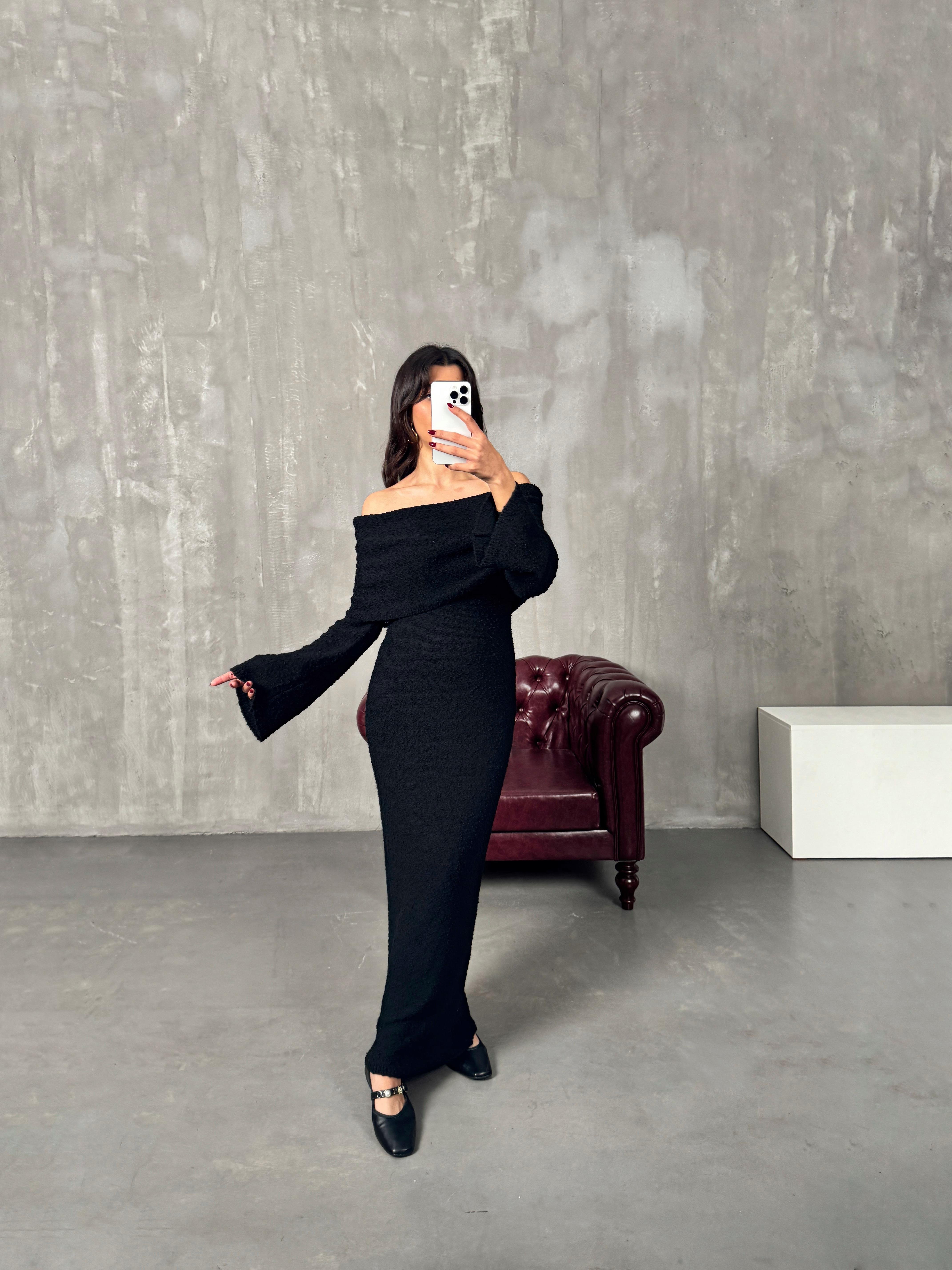 نانسي فستان تريكو أسود بياقة قارب وتصميم عصري