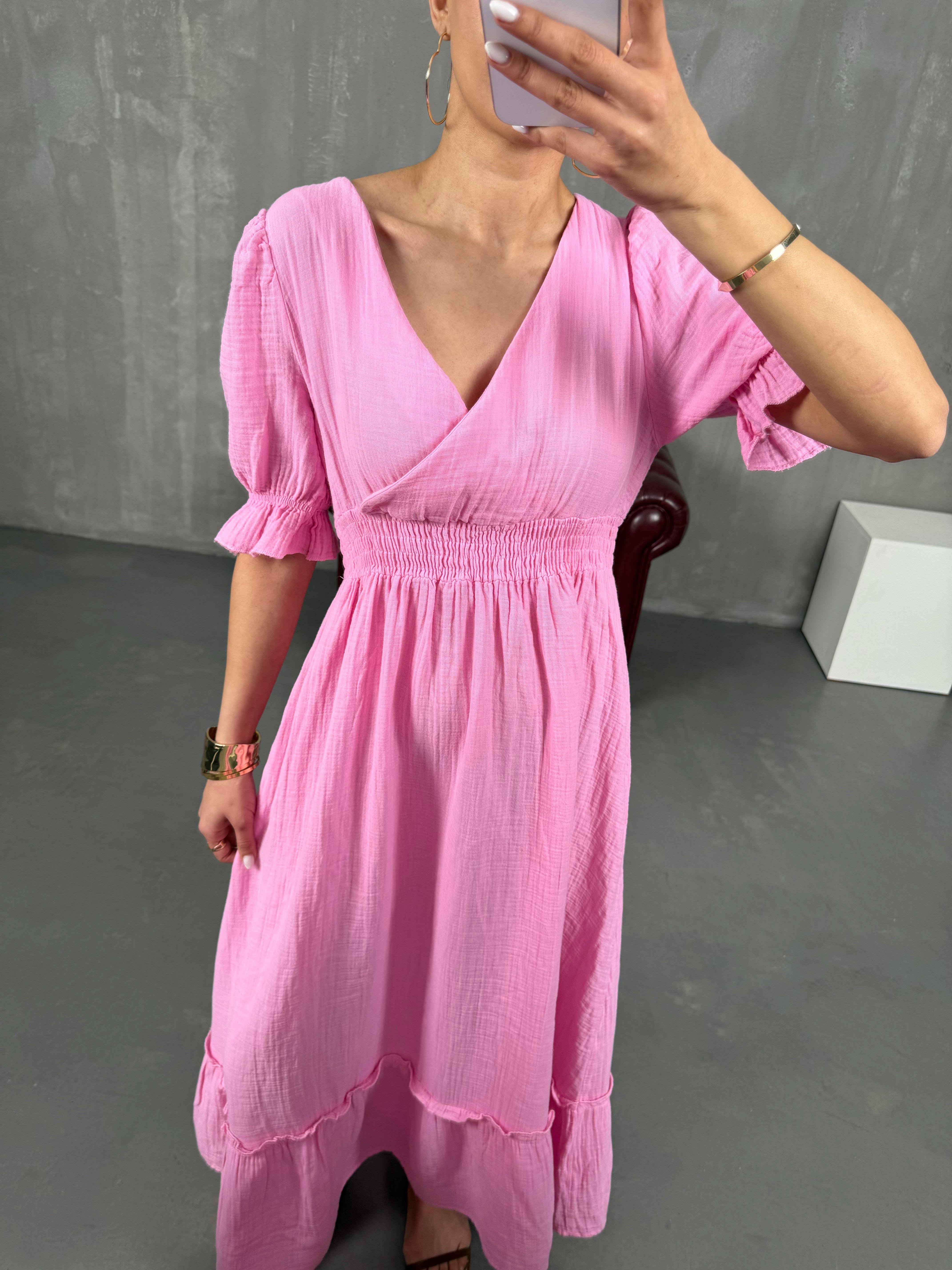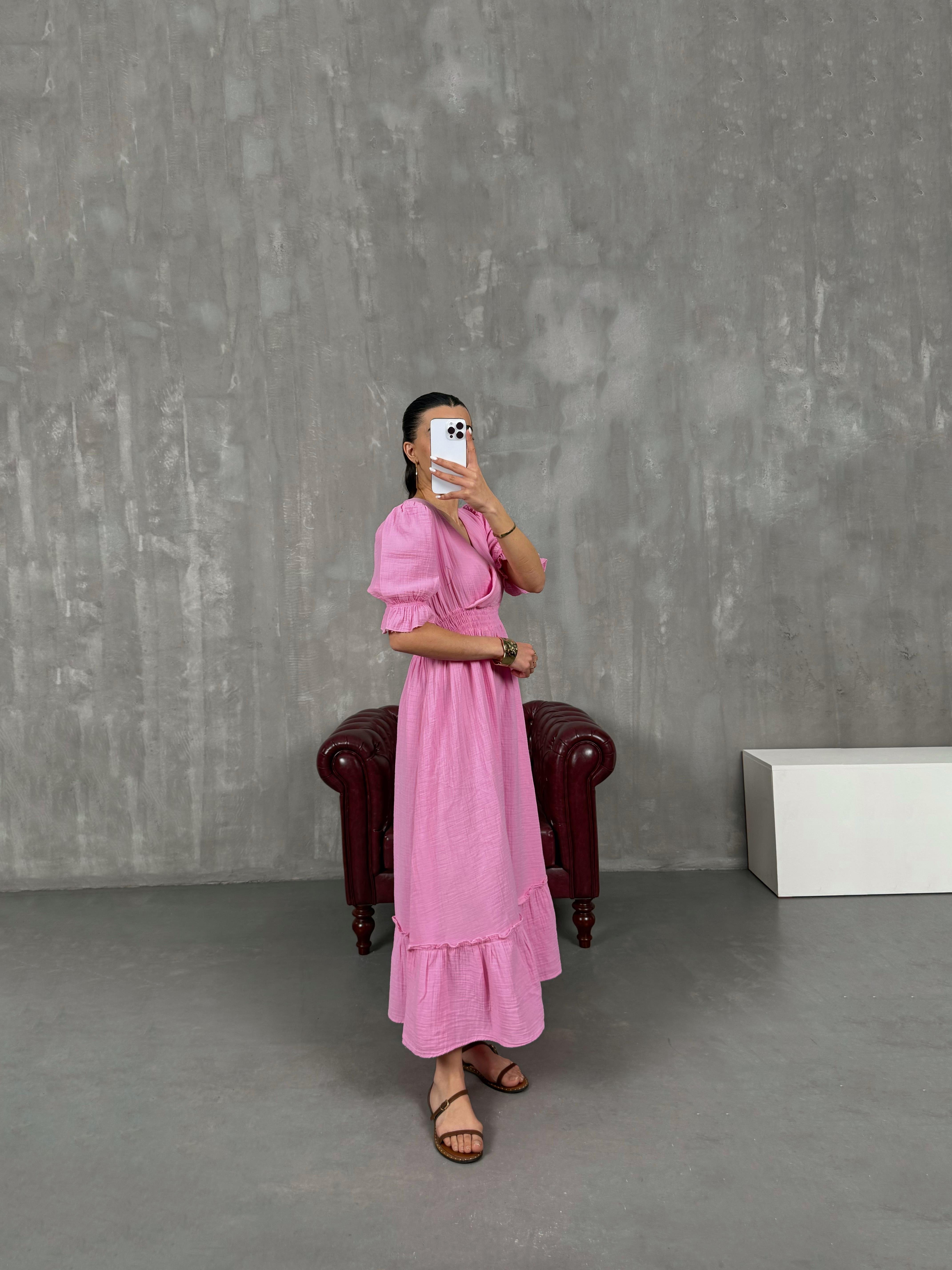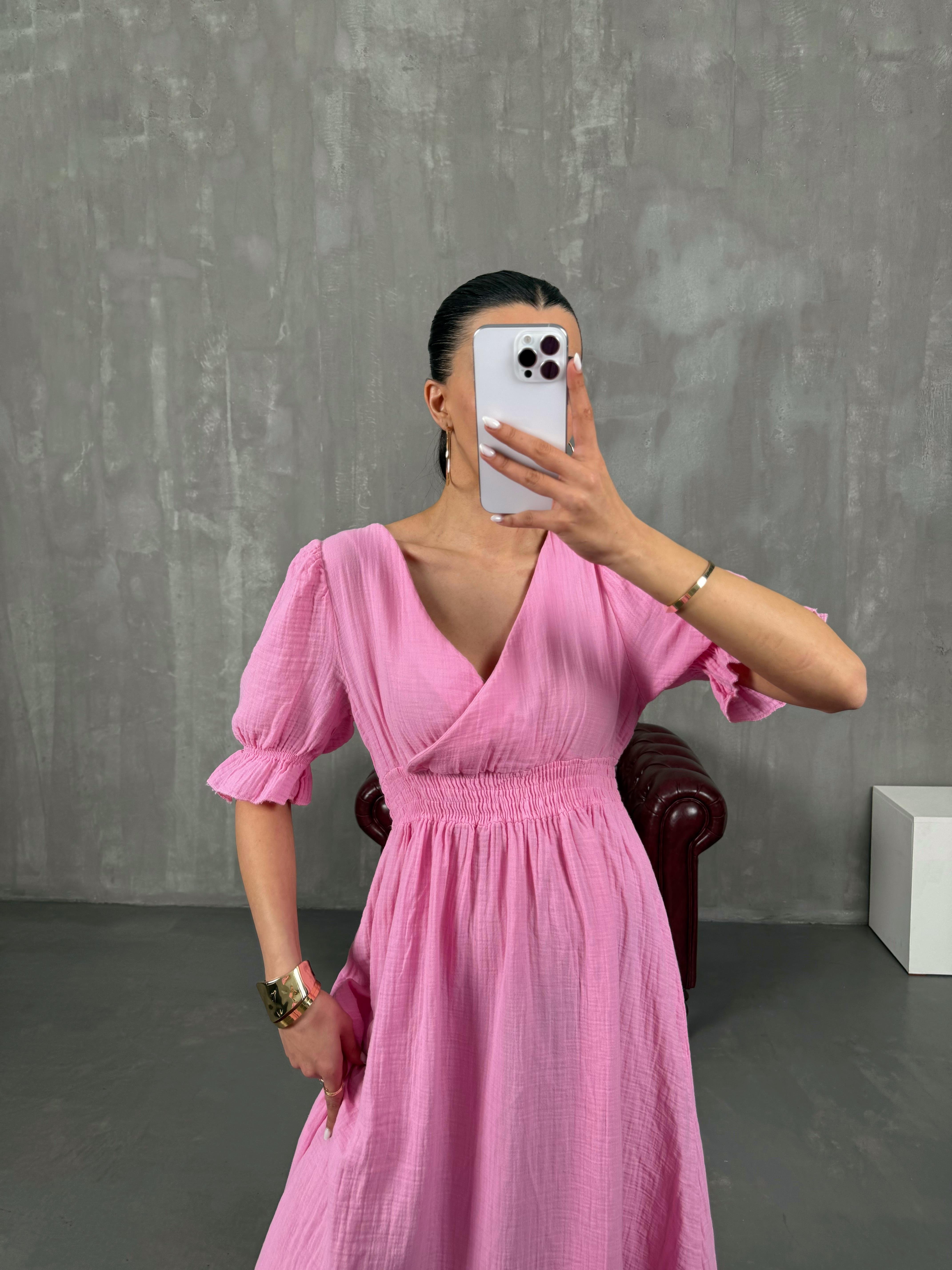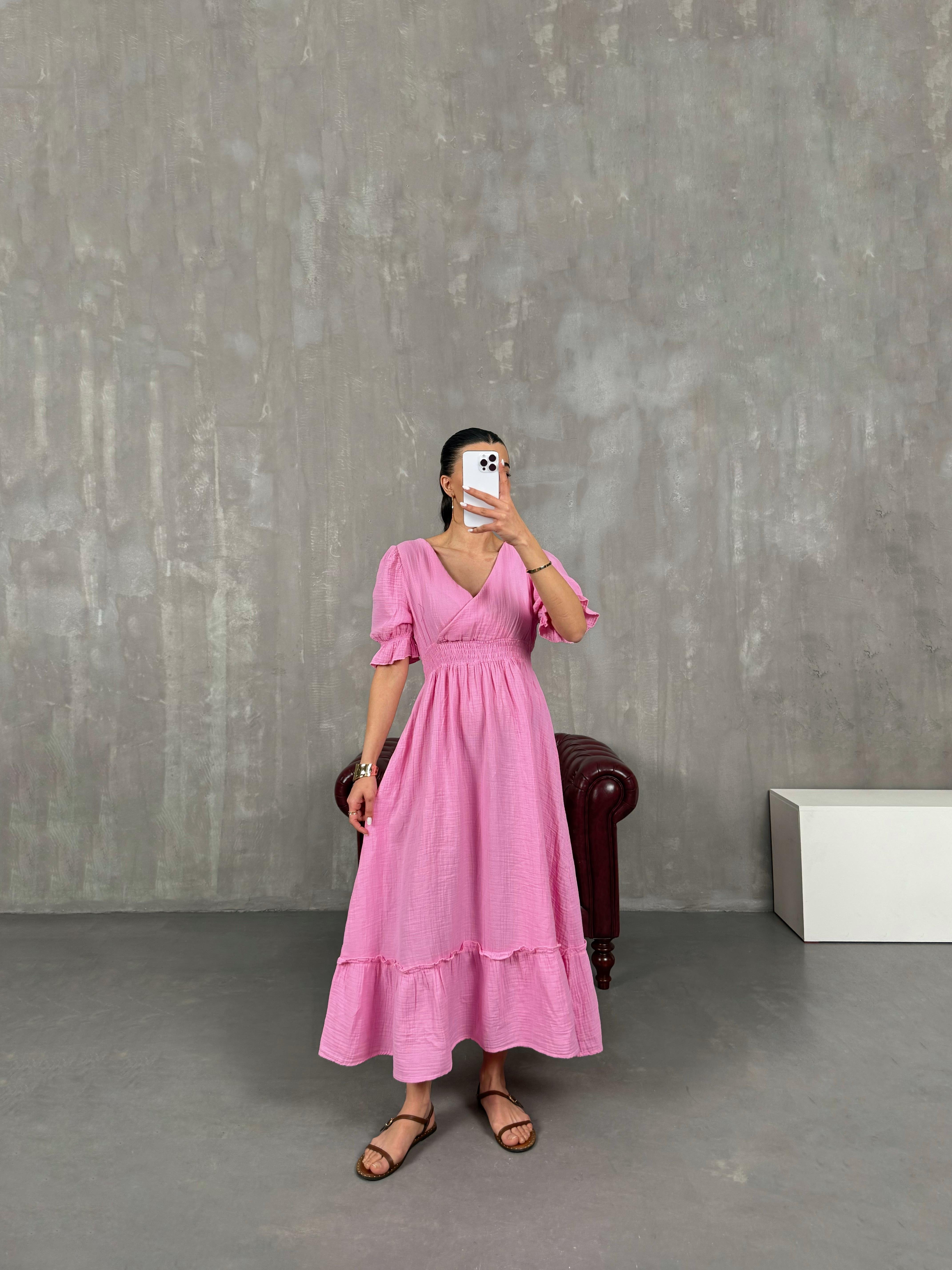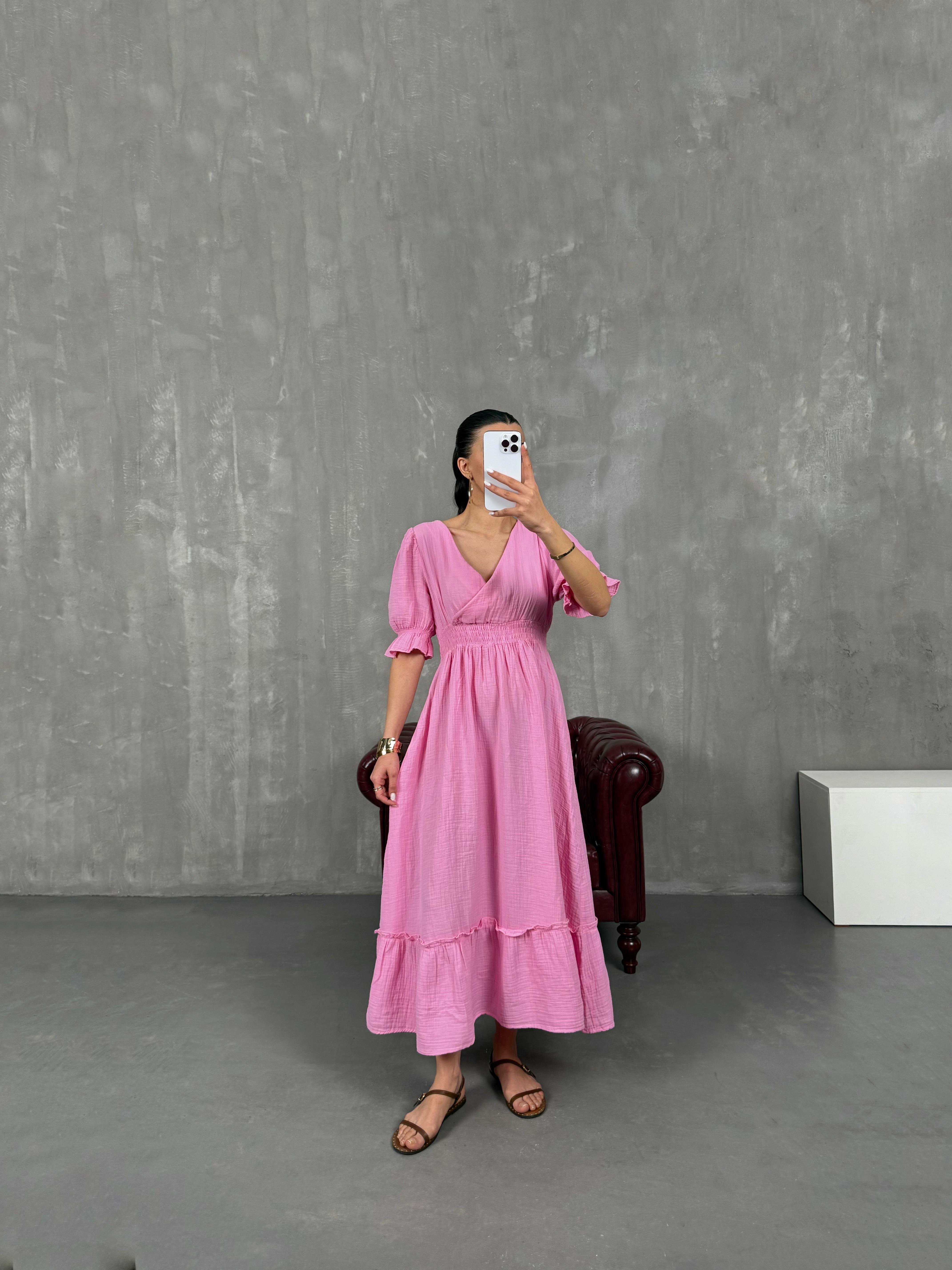 فستان بينتيريست وردي قماش موسلين بثنيات مع خصر مطاطي وياقة شكل V Gaus00022