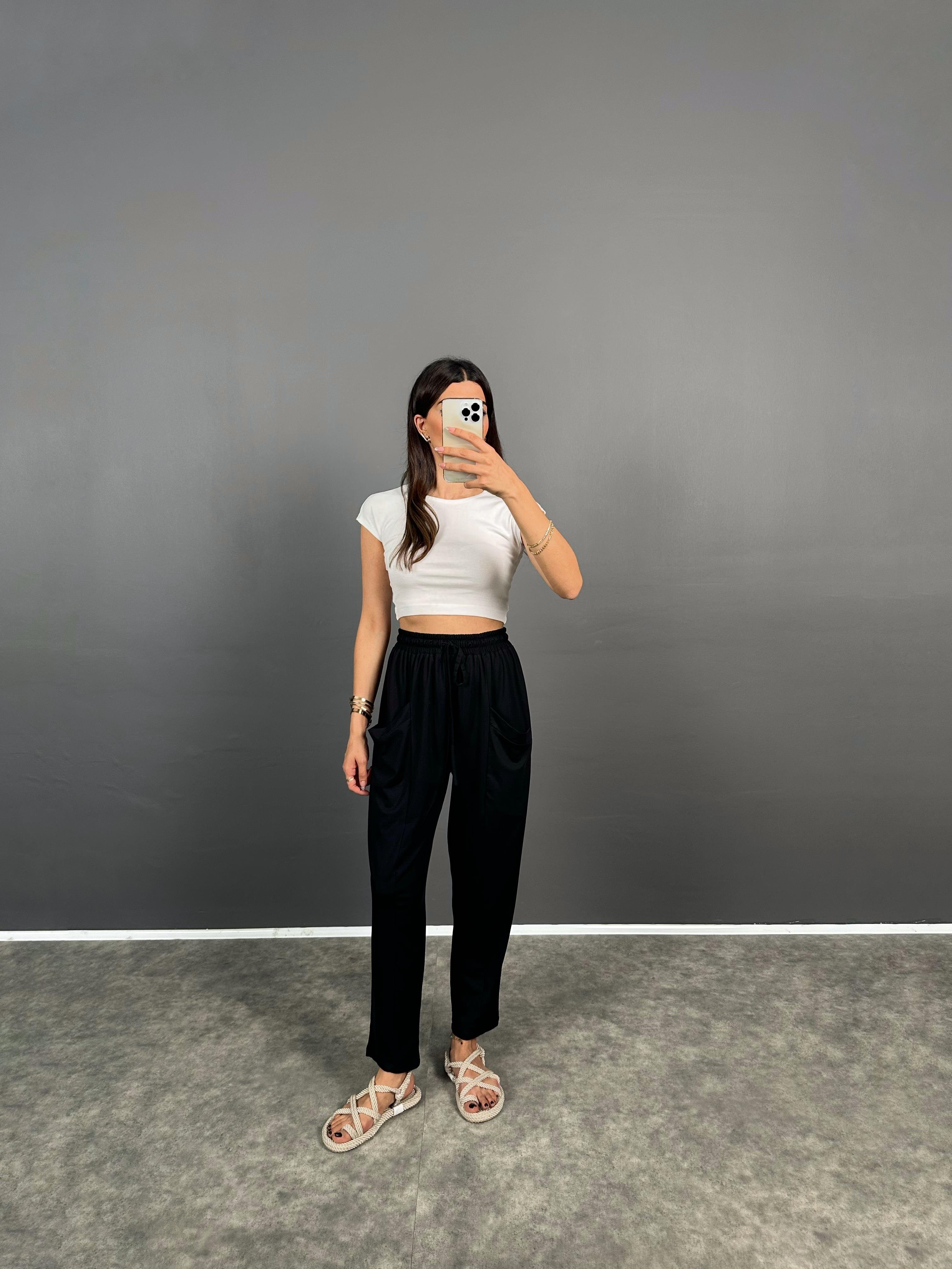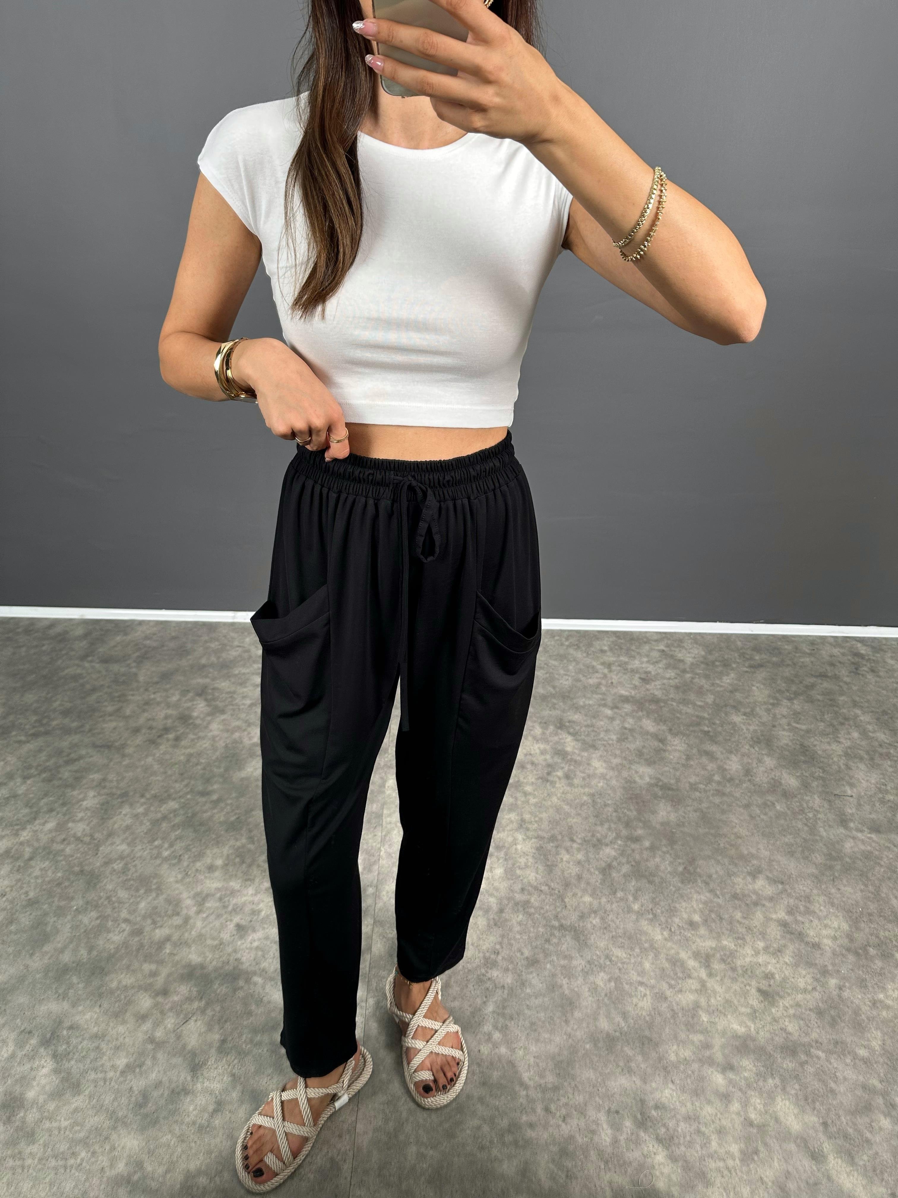 Pilea Beli Lastikli Önden Cepli Rahat Kumaş Siyah Şalvar Pantolon