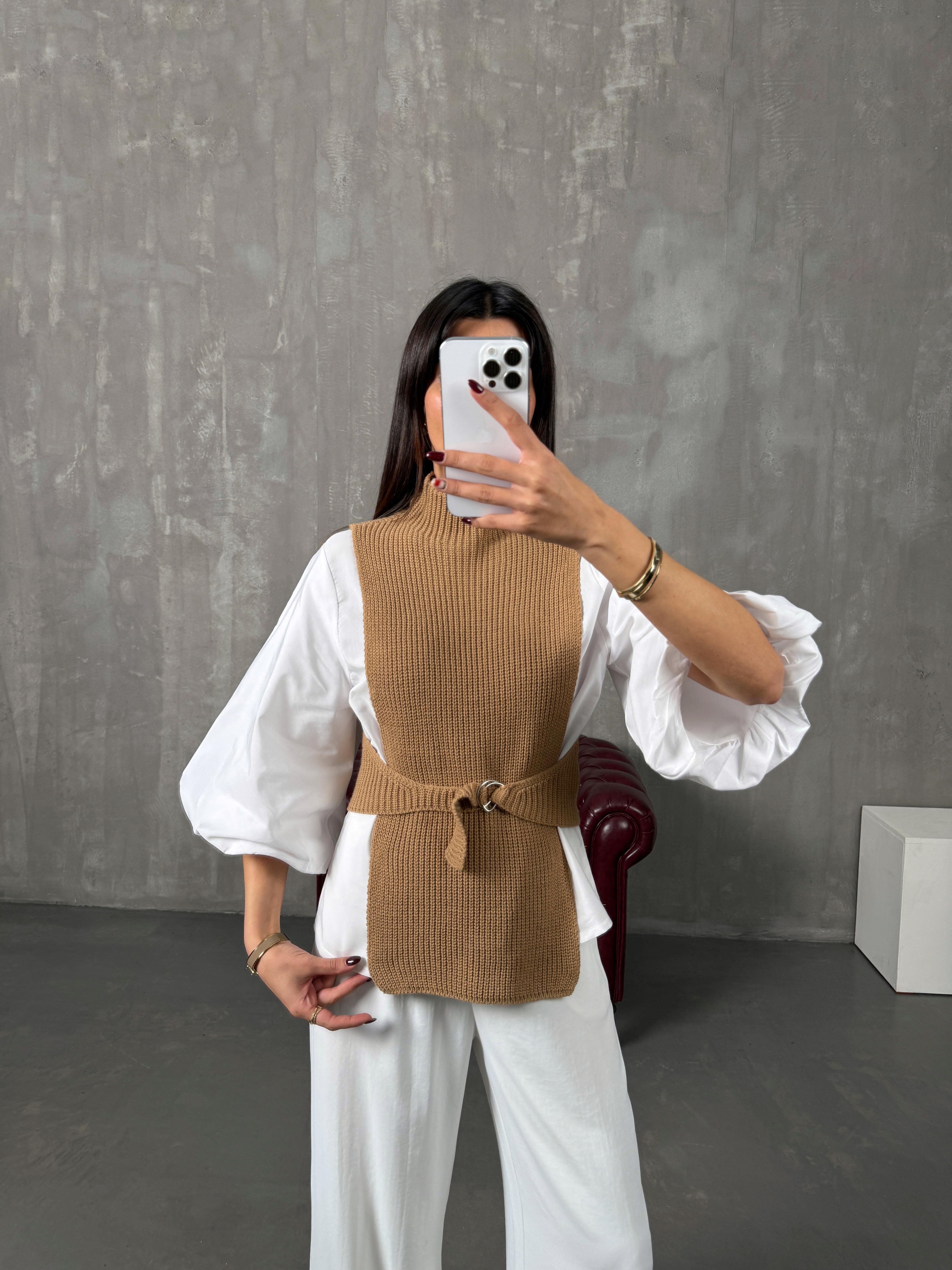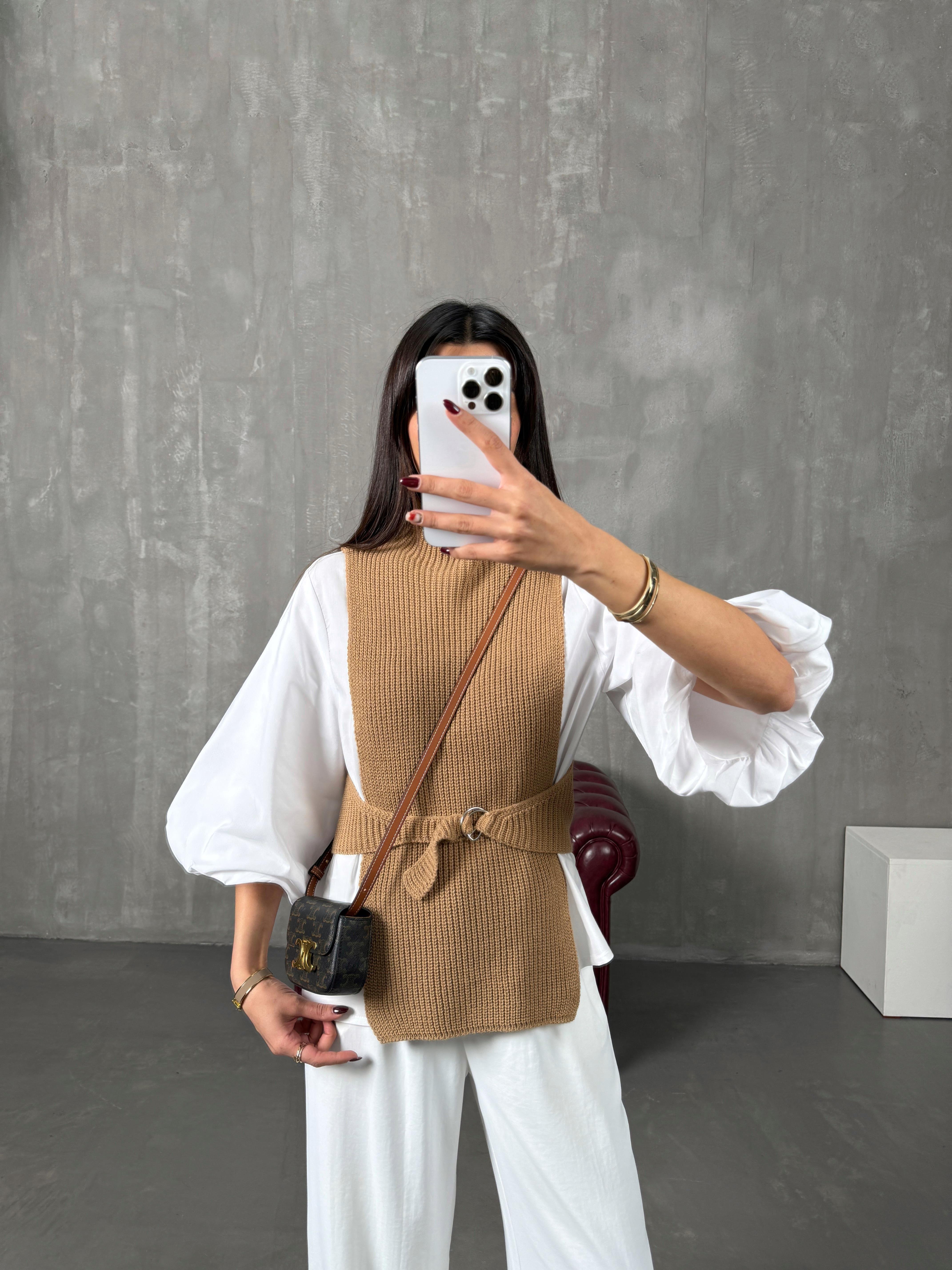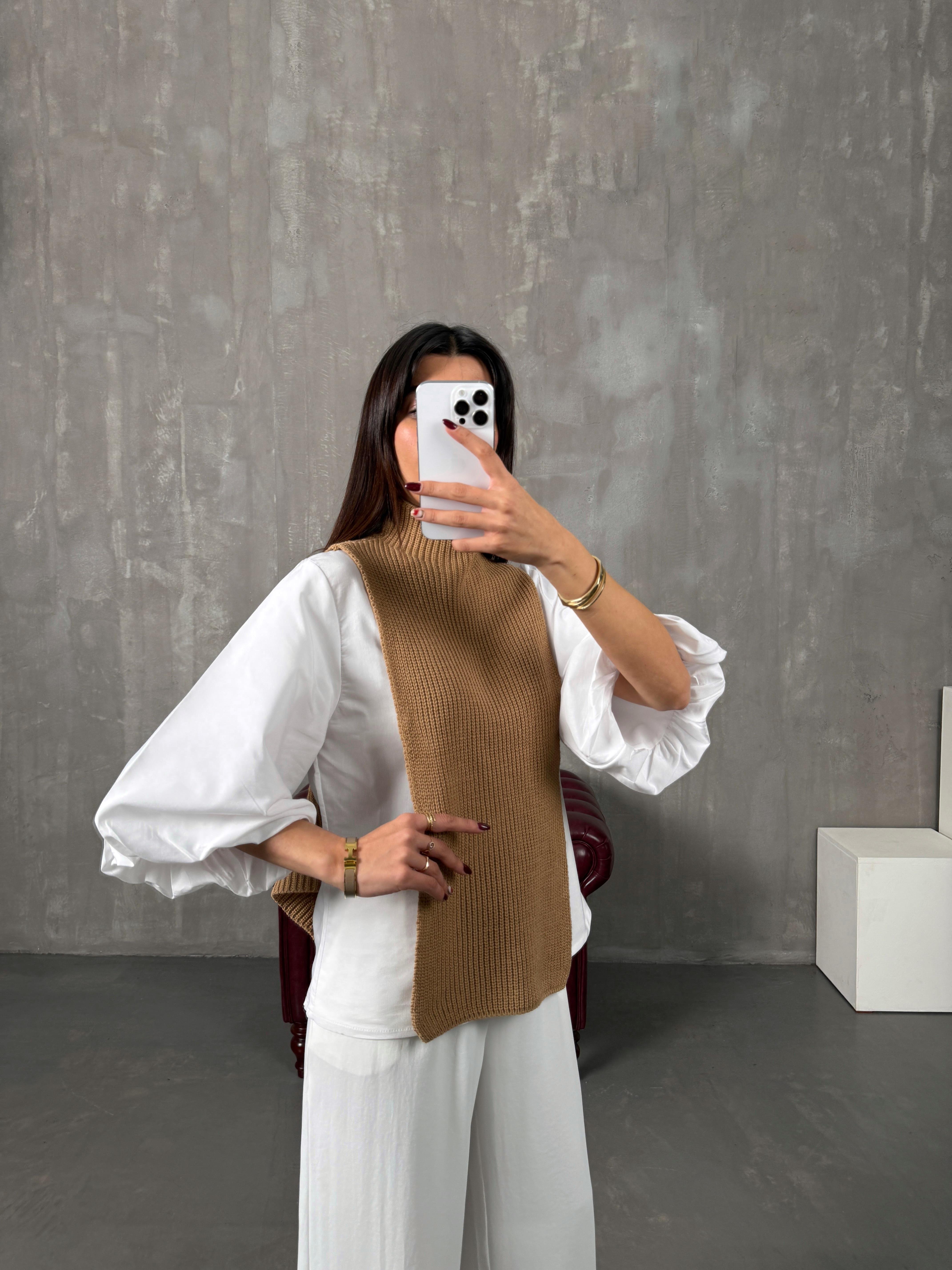 Raysa Camel İkili Balon Kol Gömlek Triko Süveter