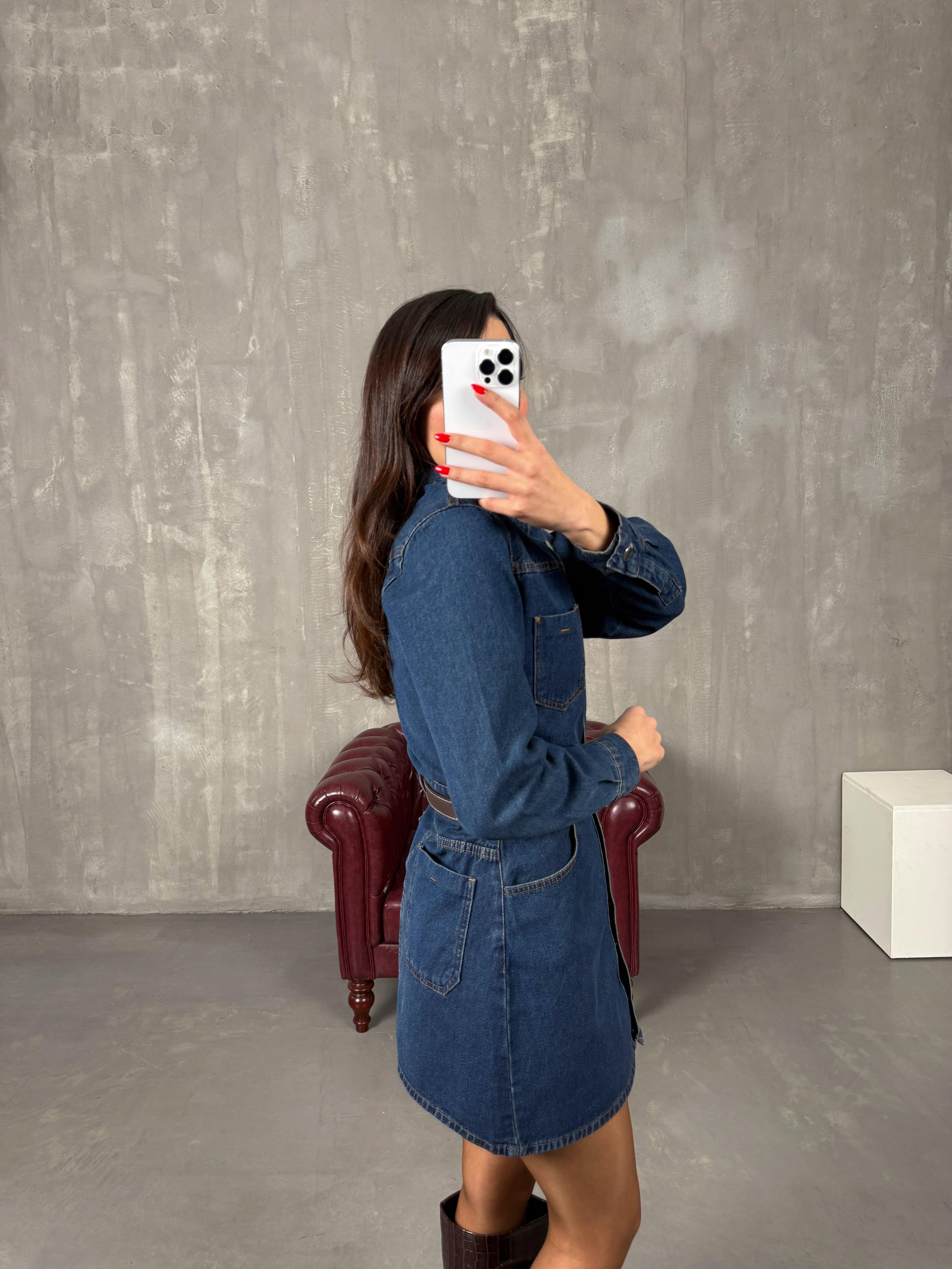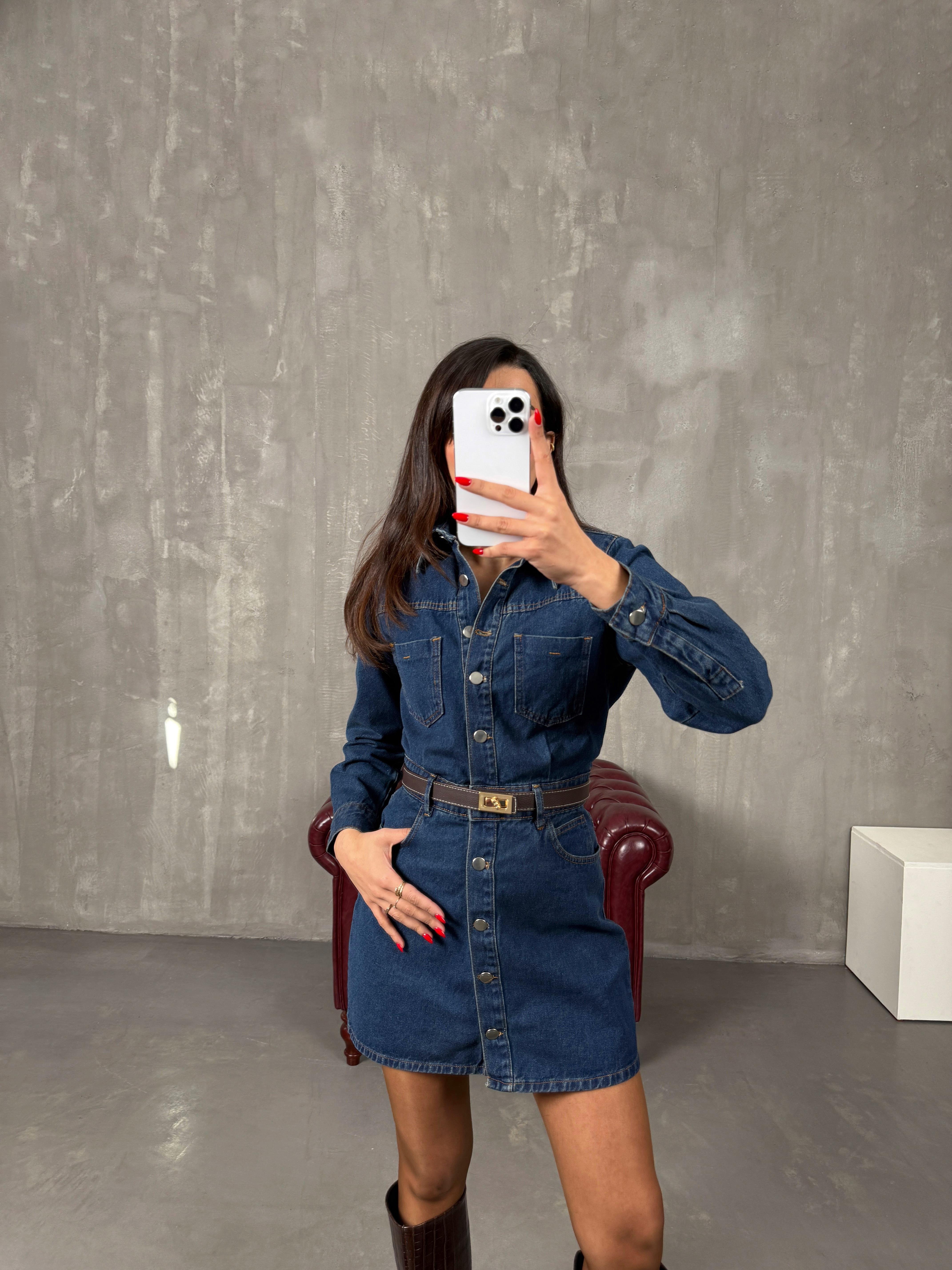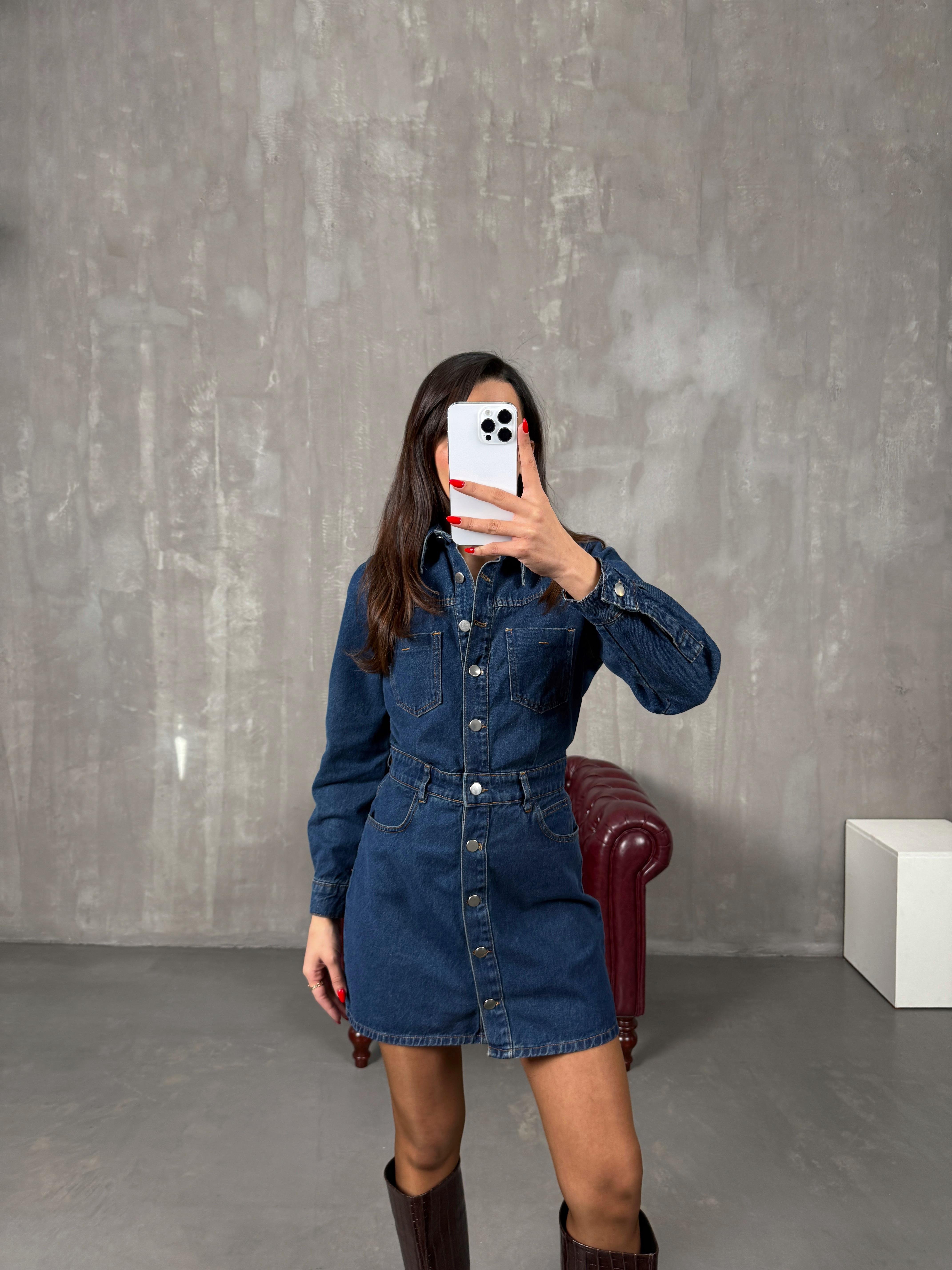 Renita Koyu Mavi Denim Düğmeli Jean Elbise