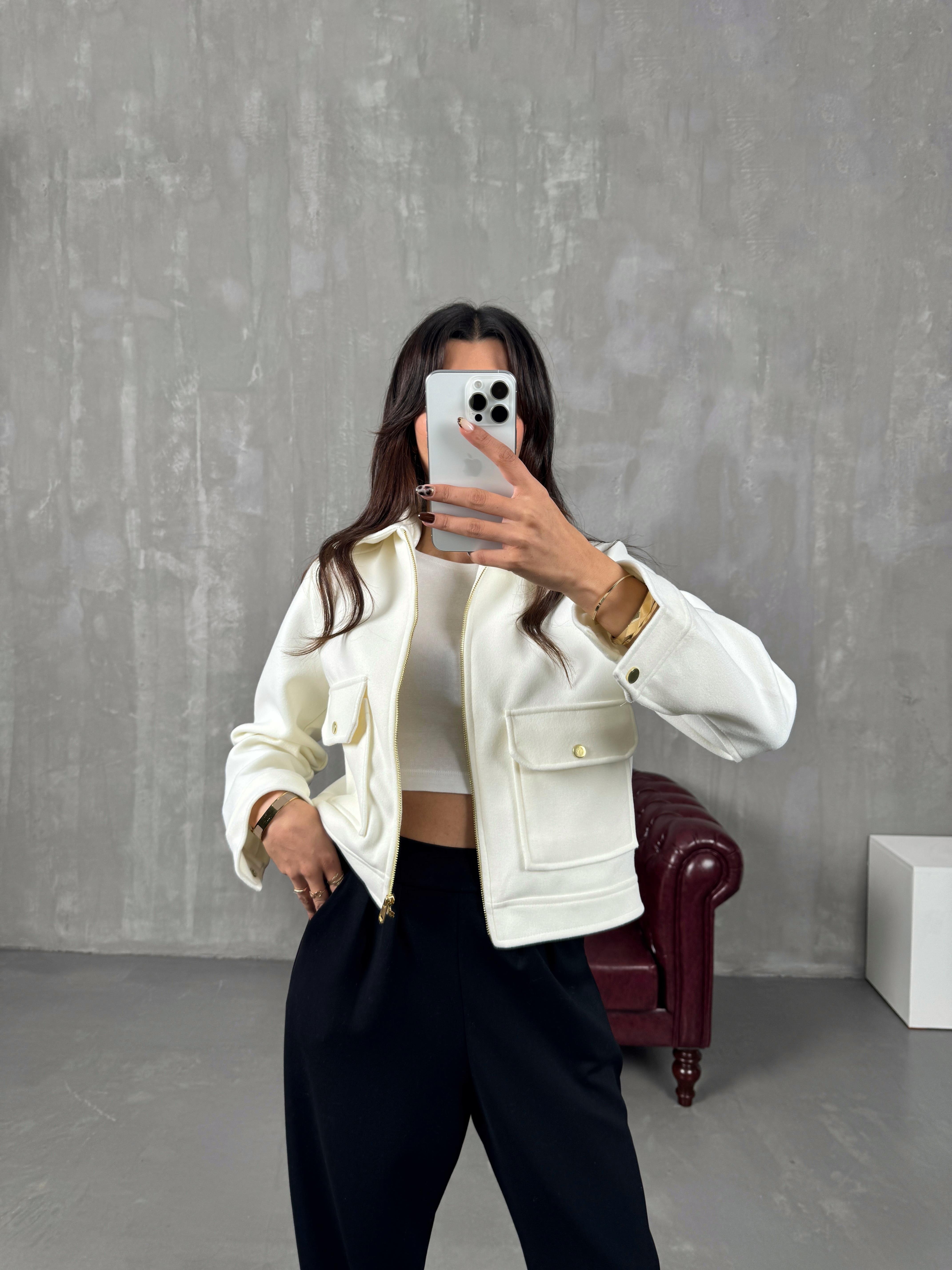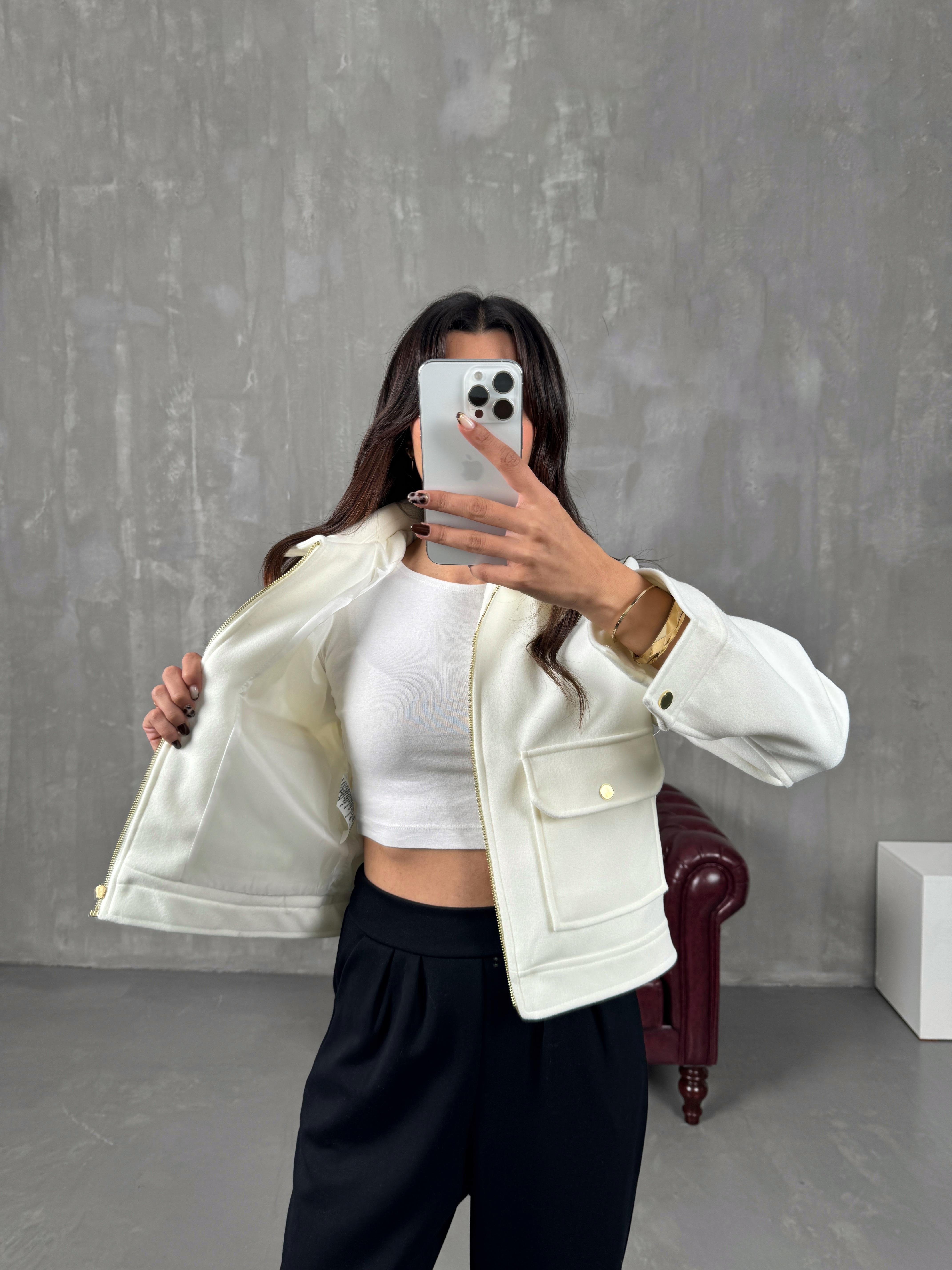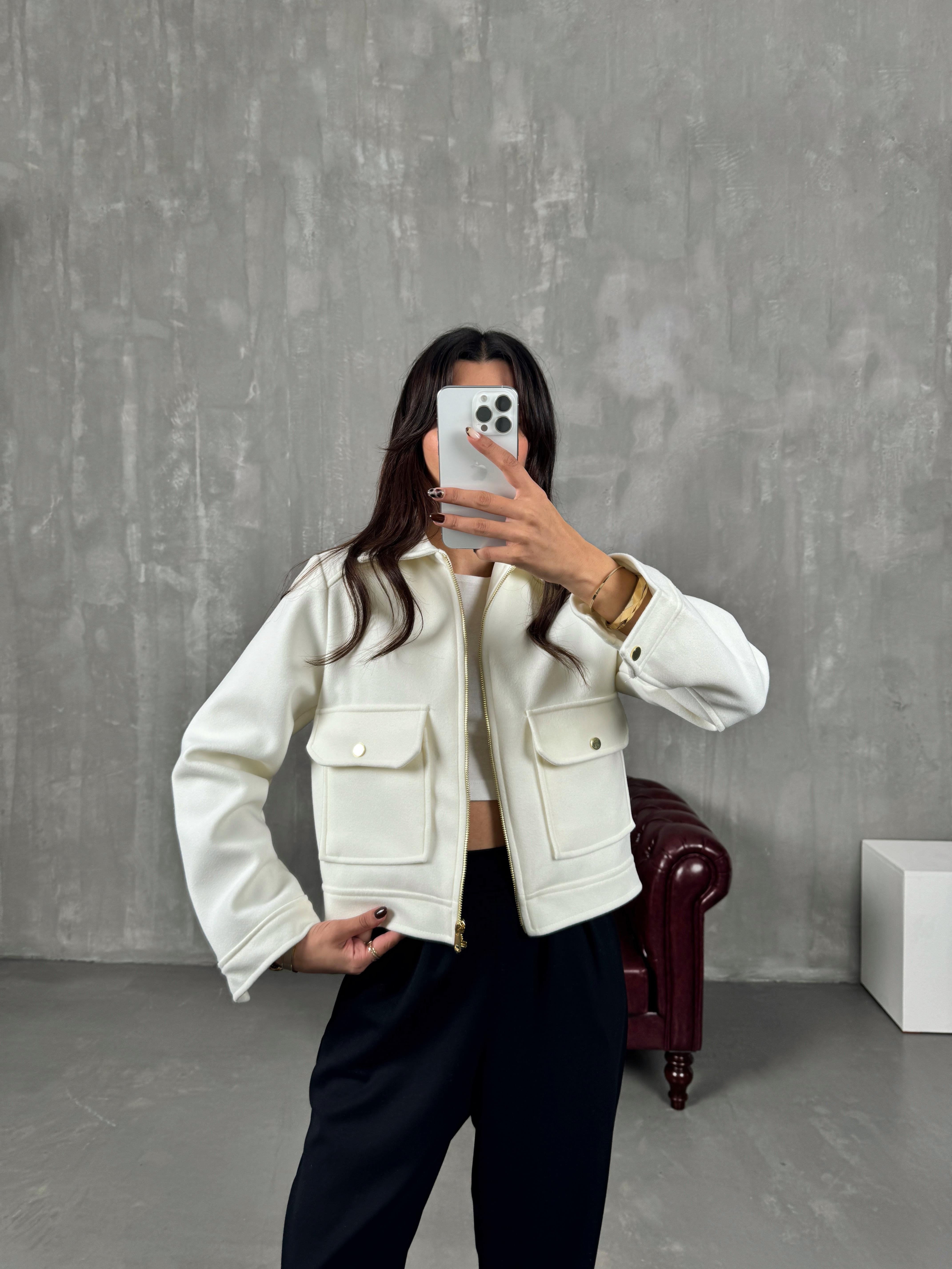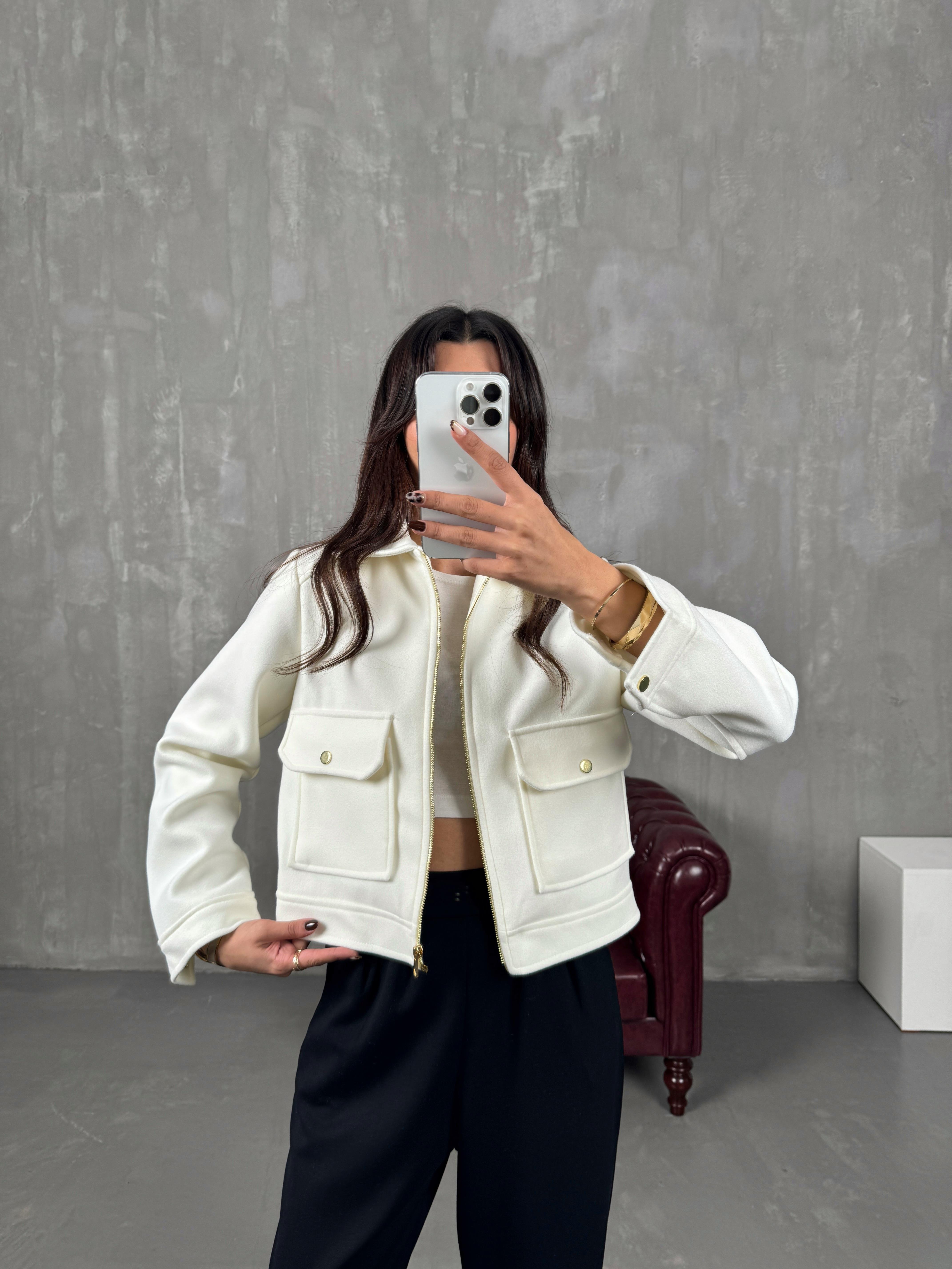 Ressa Beyaz Fermuarlı Astarlı Cepli Kaşe Muadil Ceket
