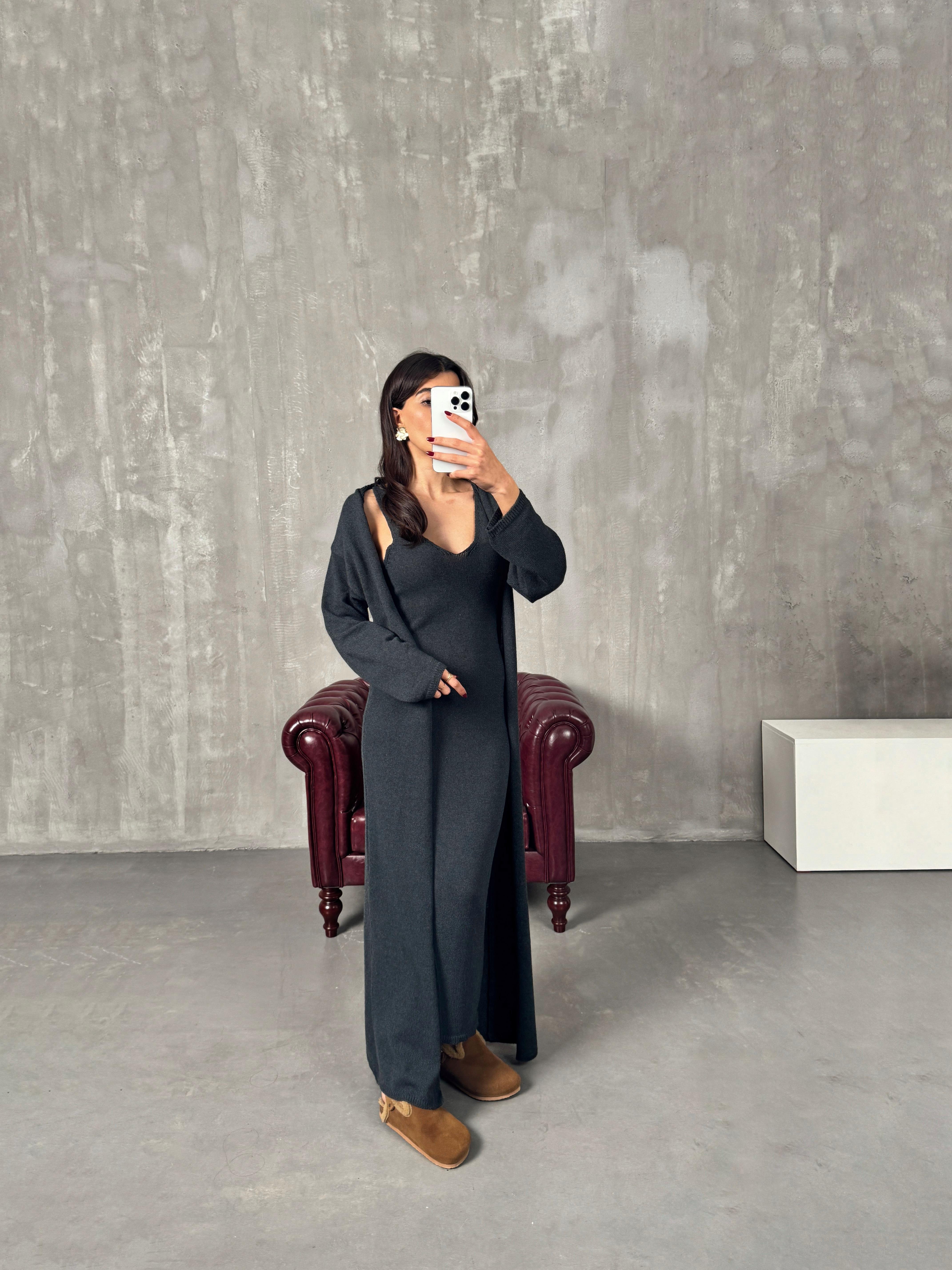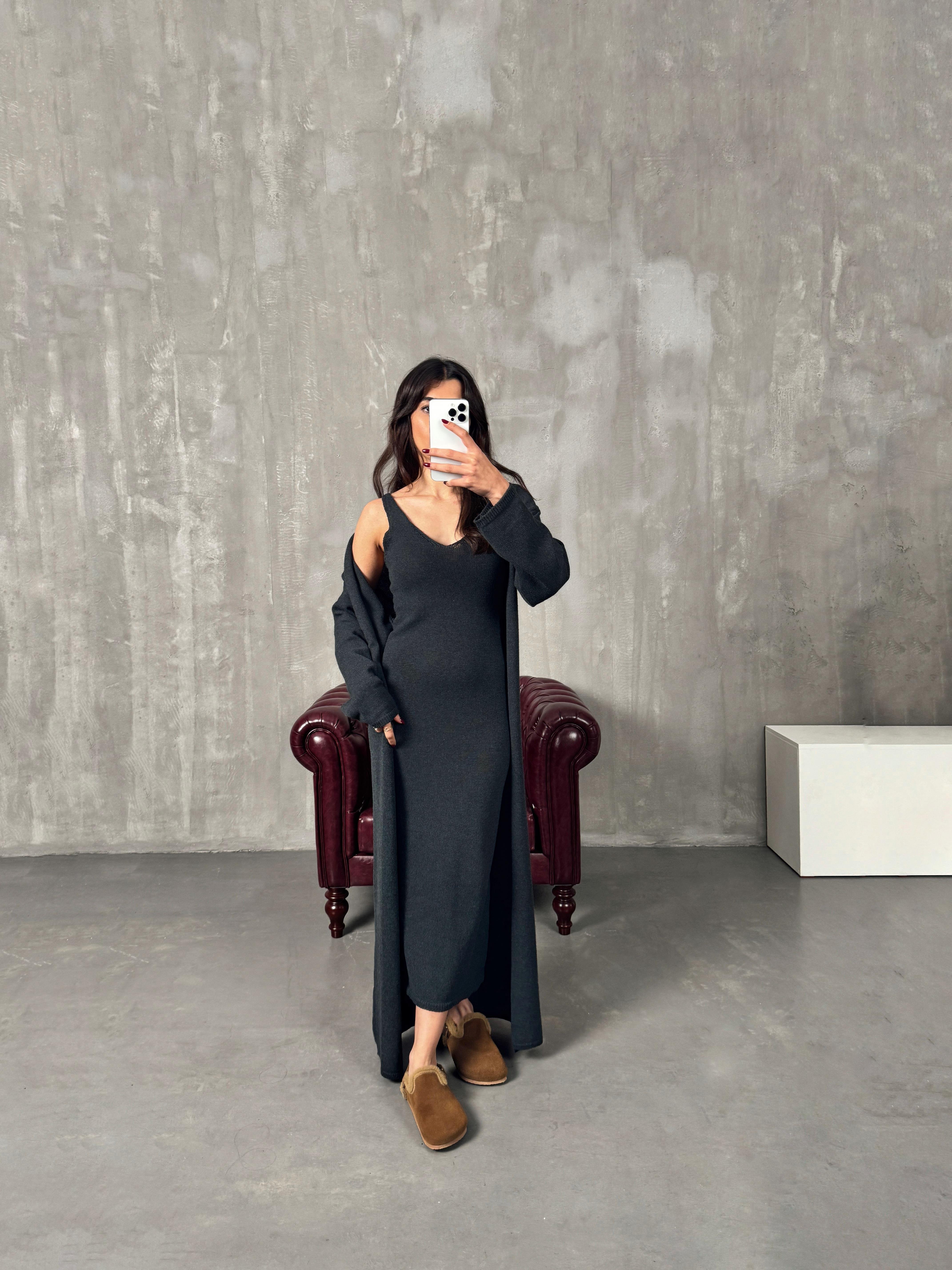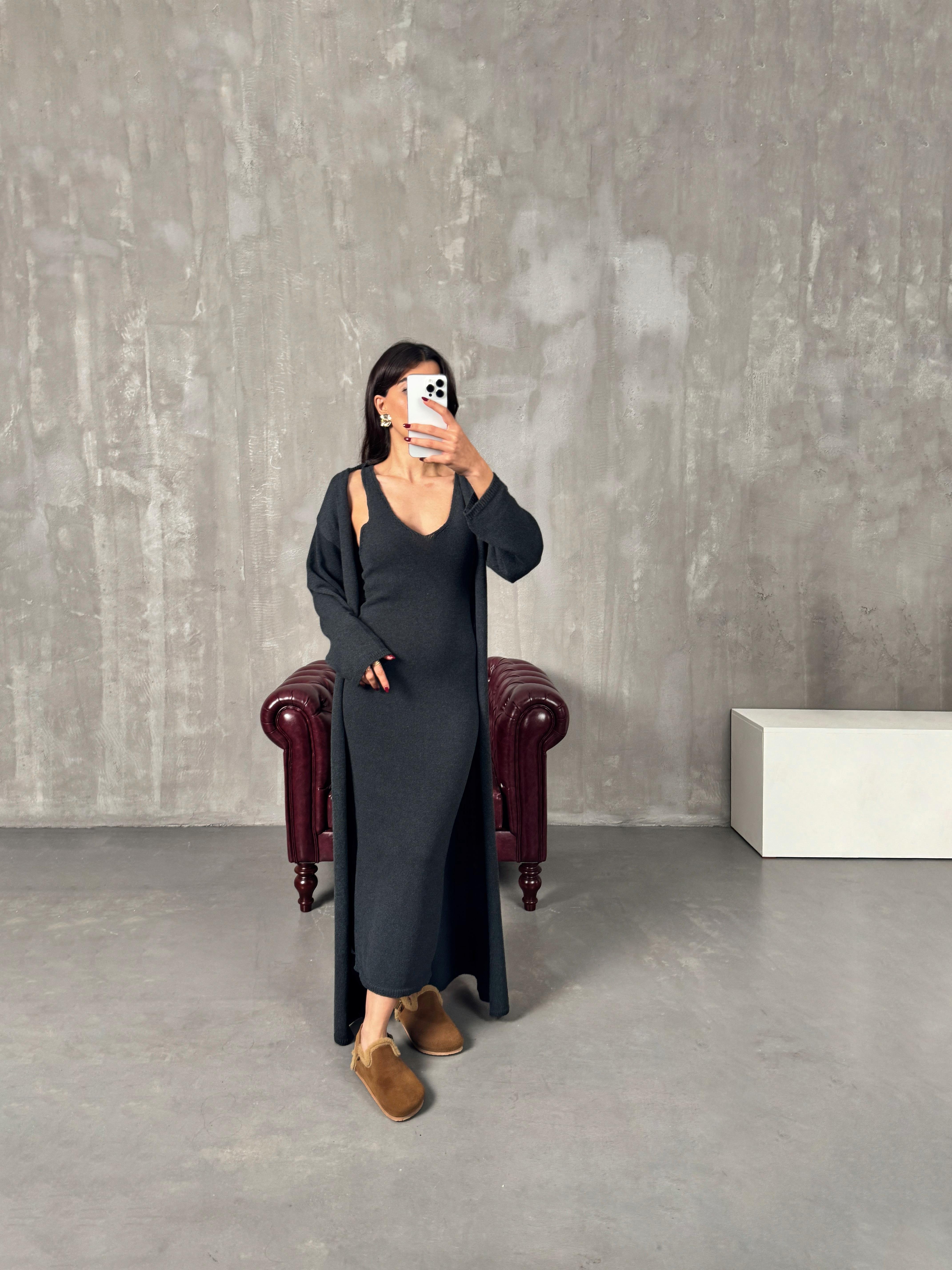 Rila Antrasit Hırkalı Triko Elbise İkili Takım