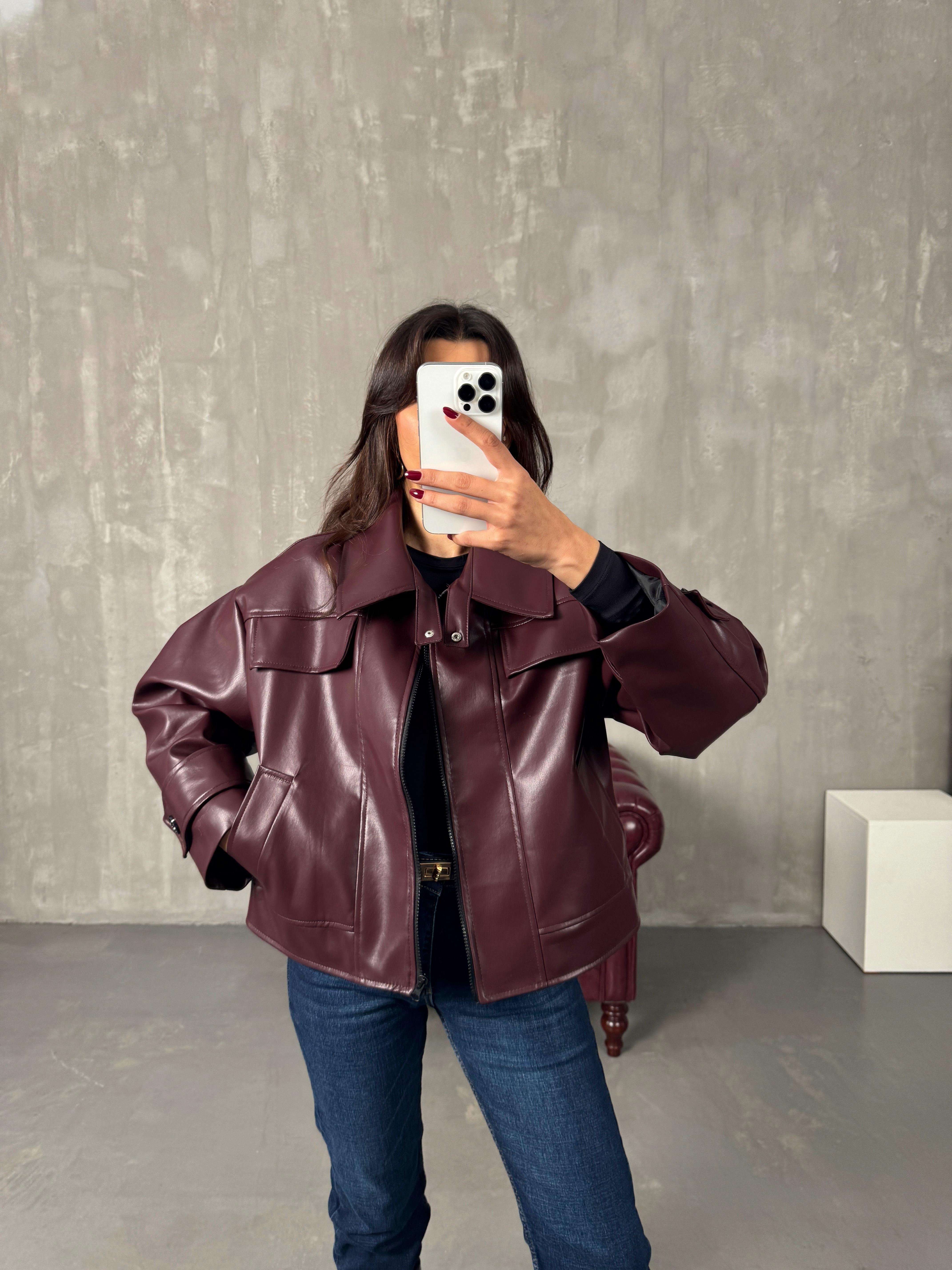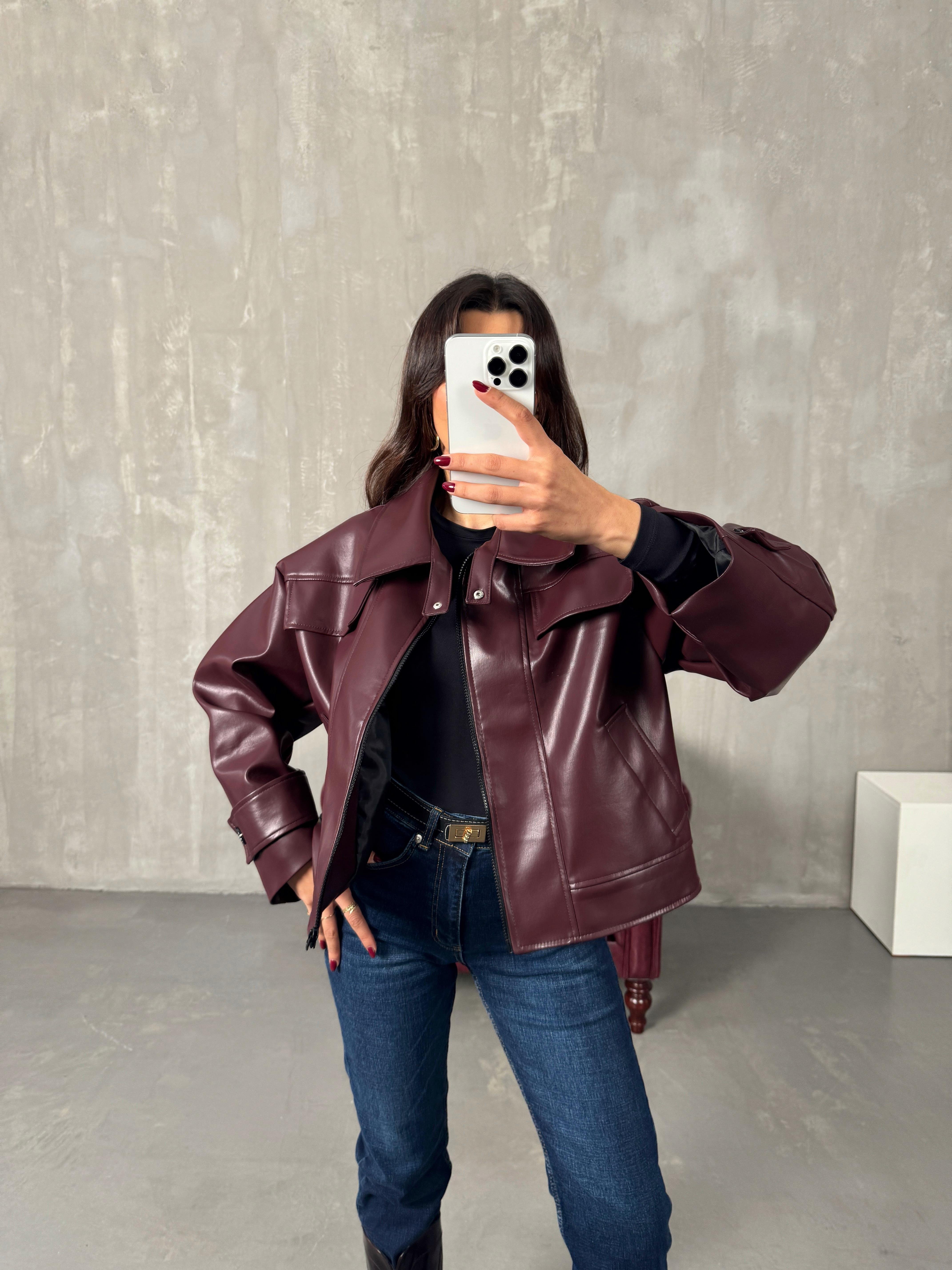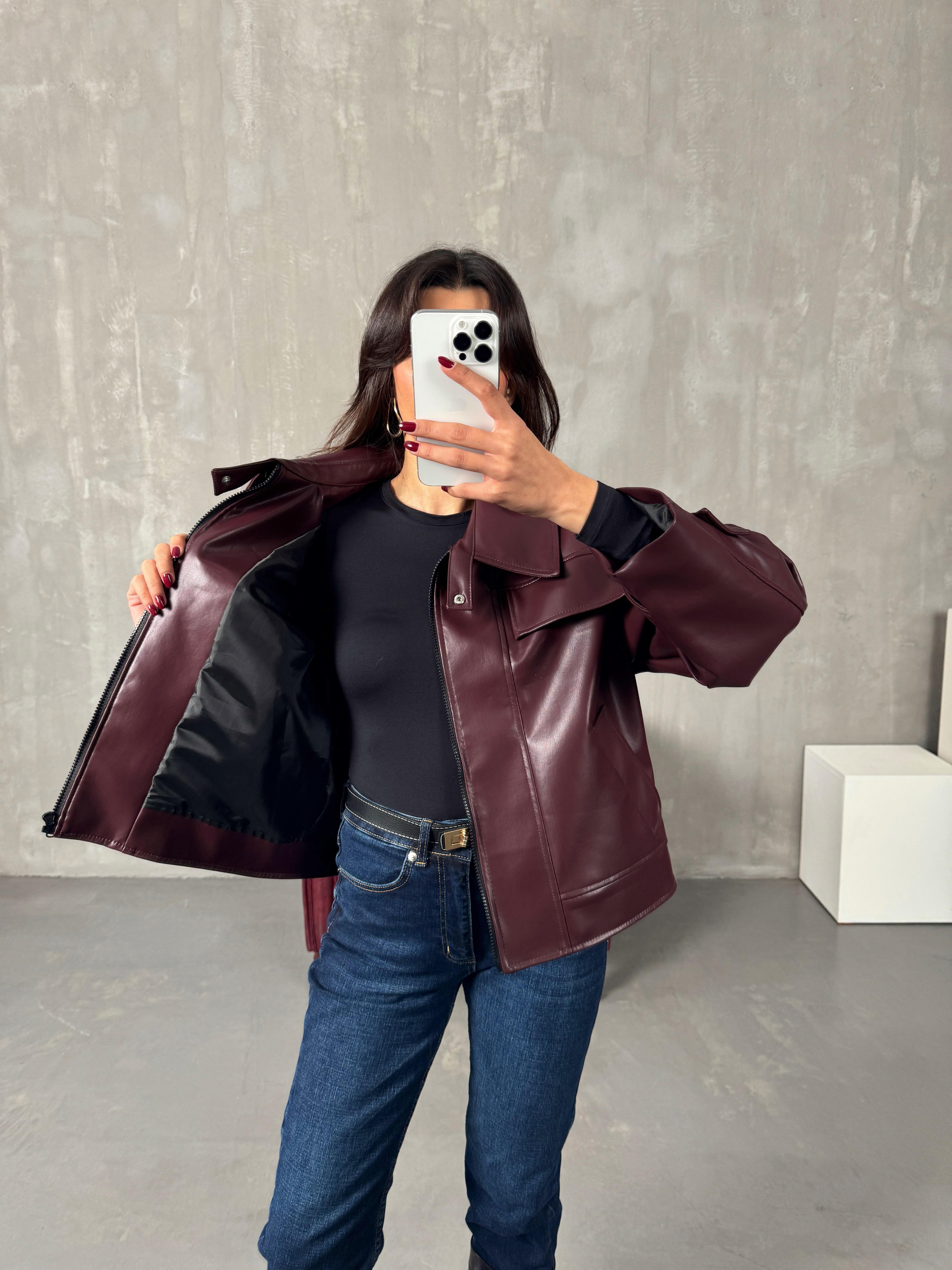 Roland Bordo Fermuarlı Astarlı Deri Ceket
