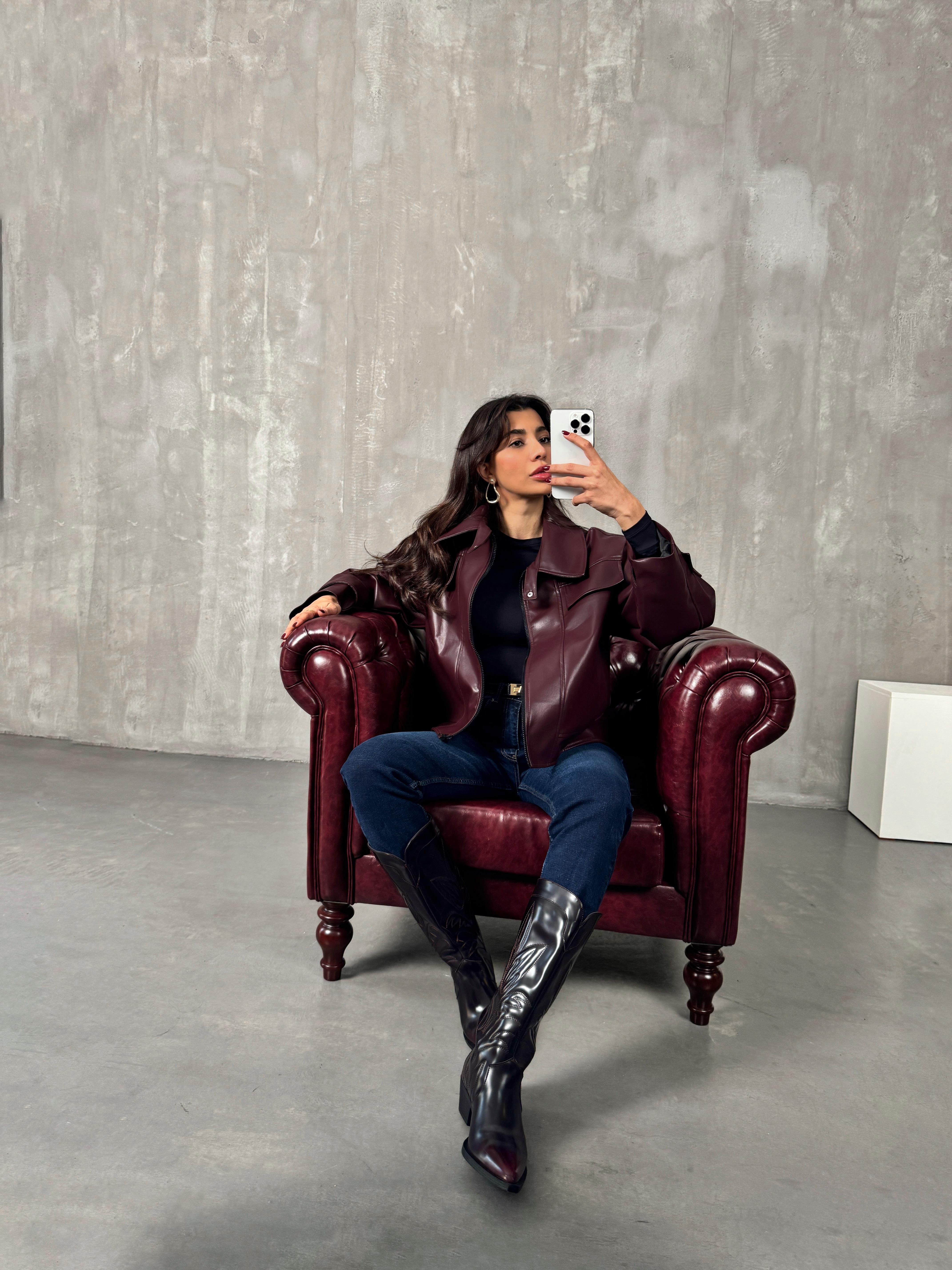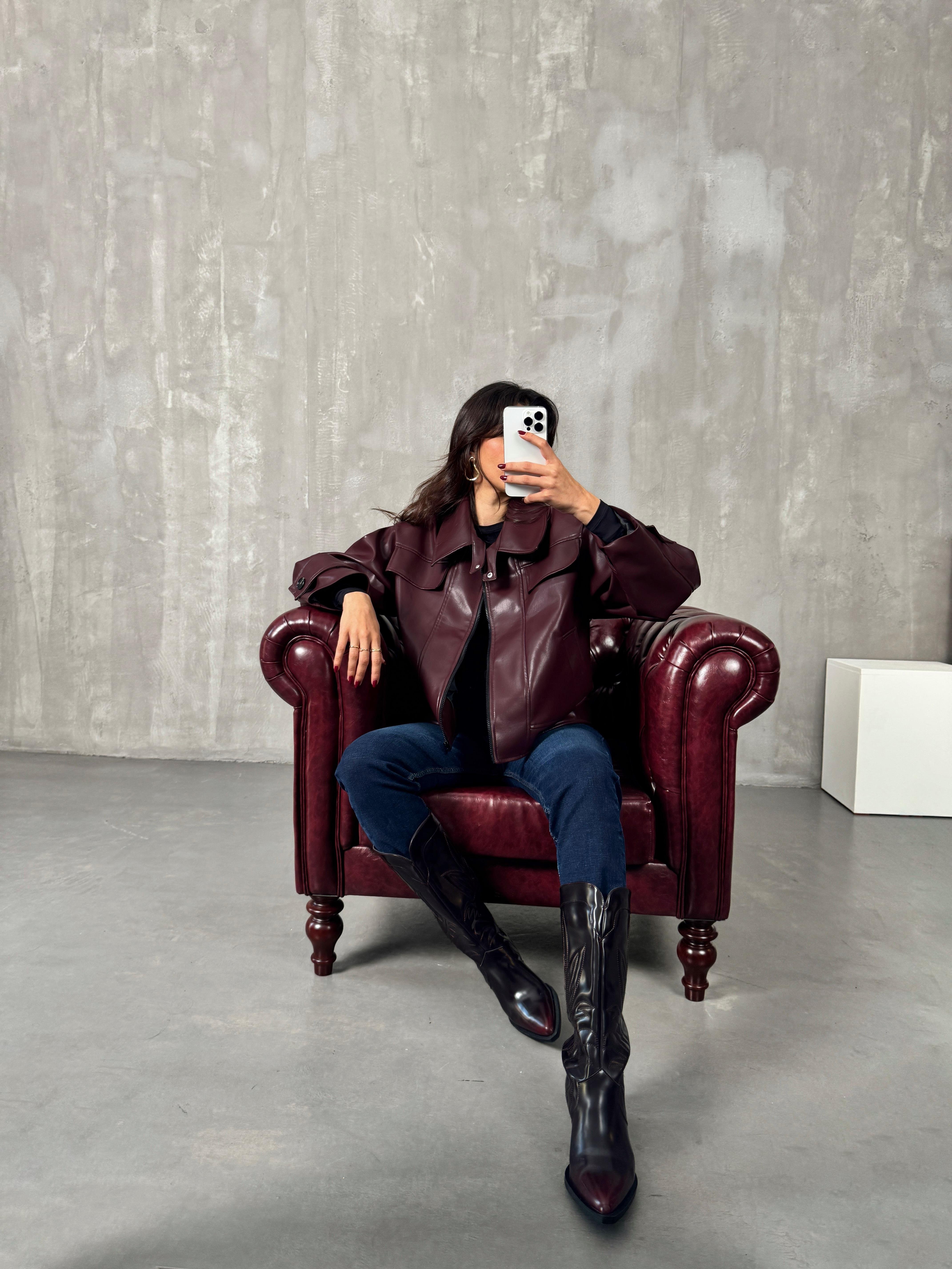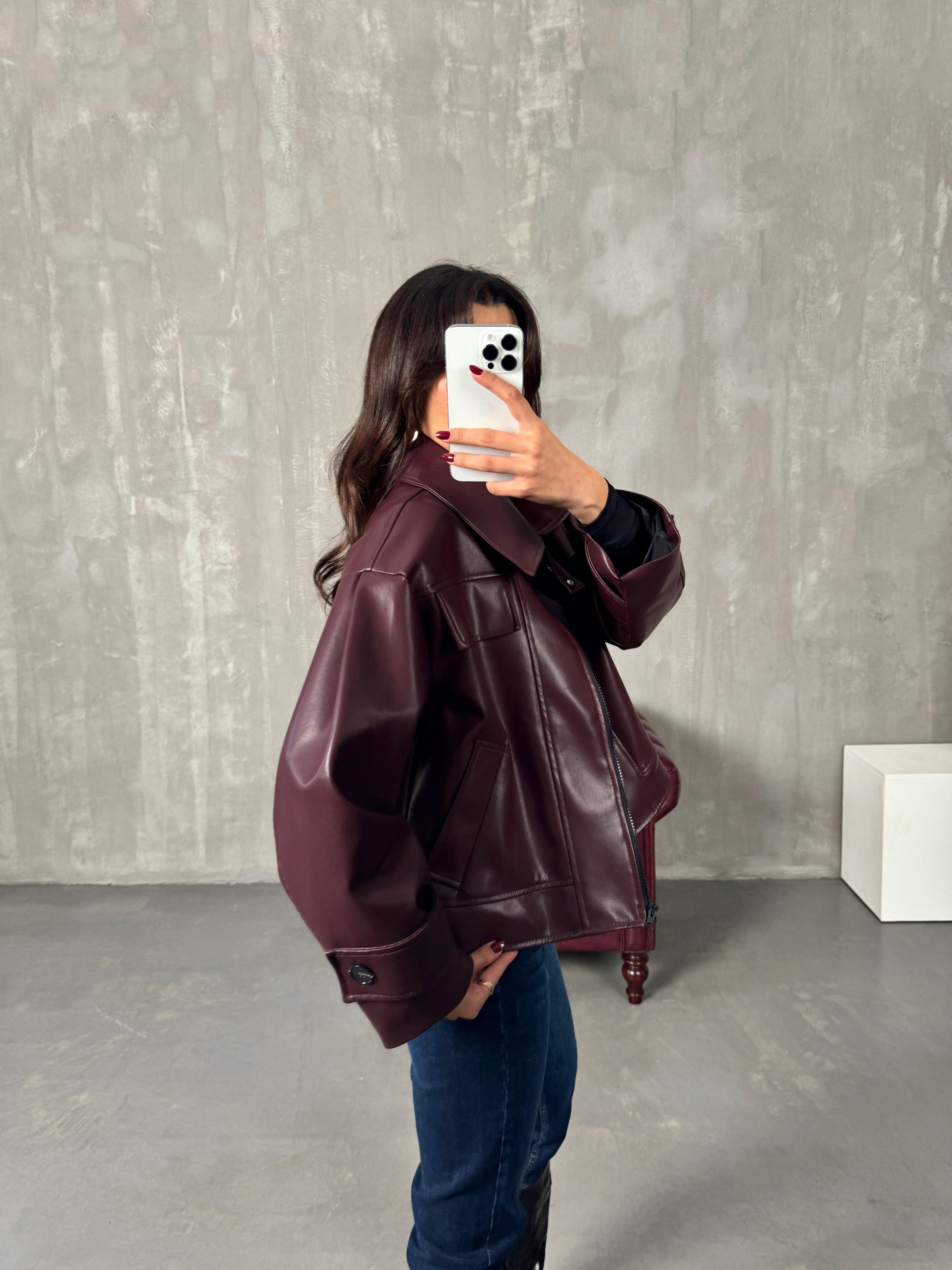 Roland Bordo Fermuarlı Astarlı Deri Ceket