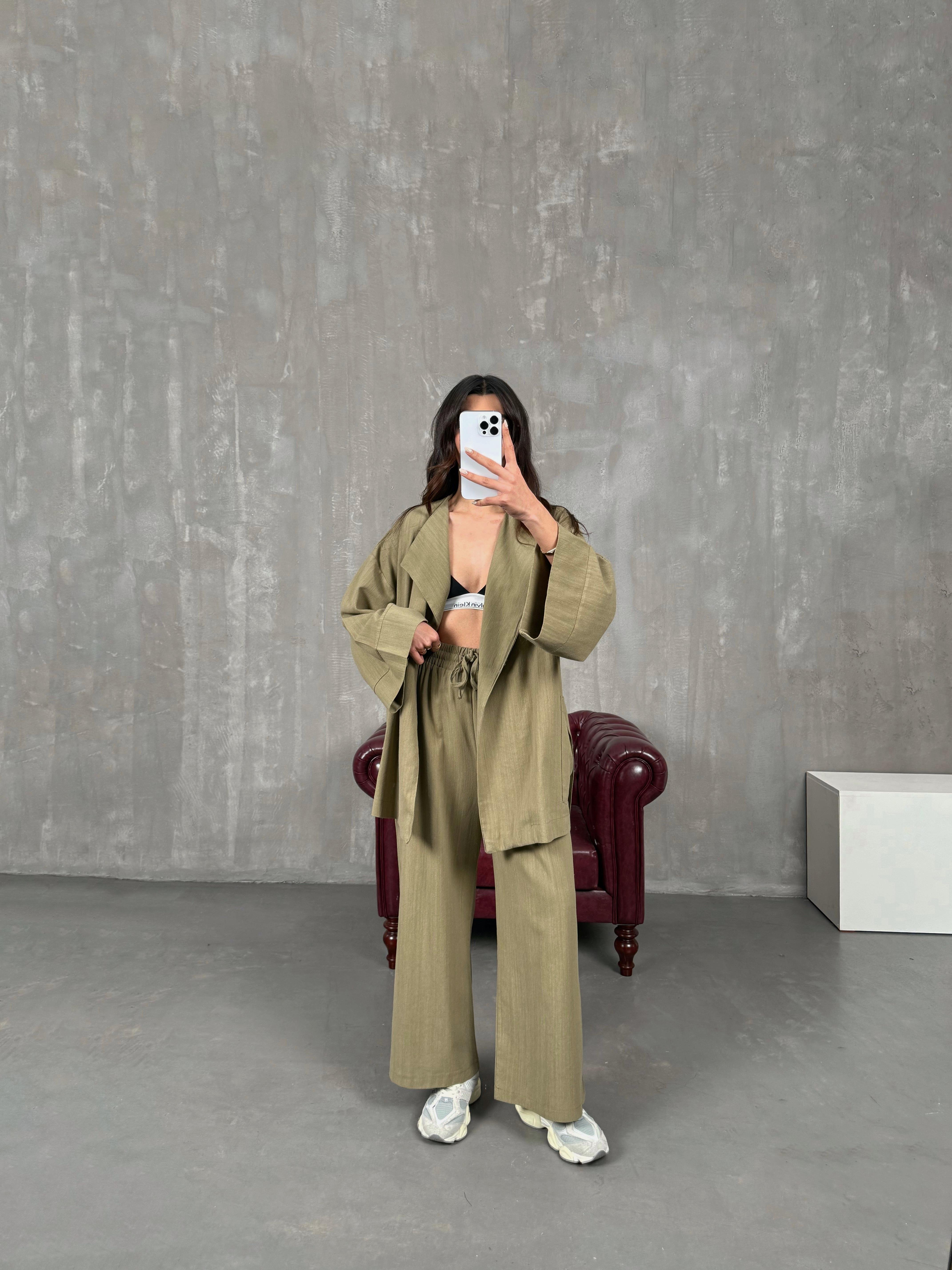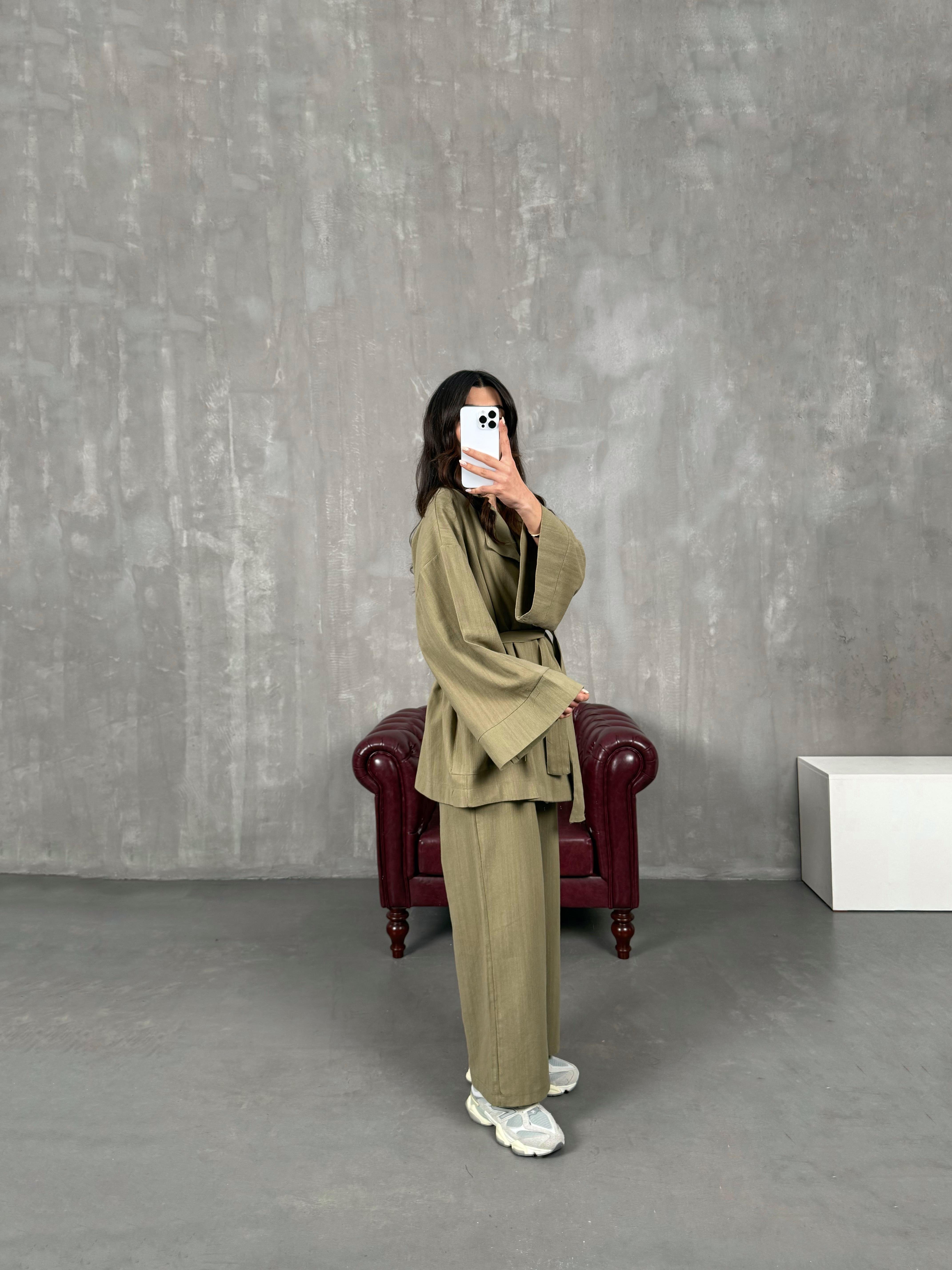 سانسا طقم كيمونو كتان لون كاكي مع زنّار