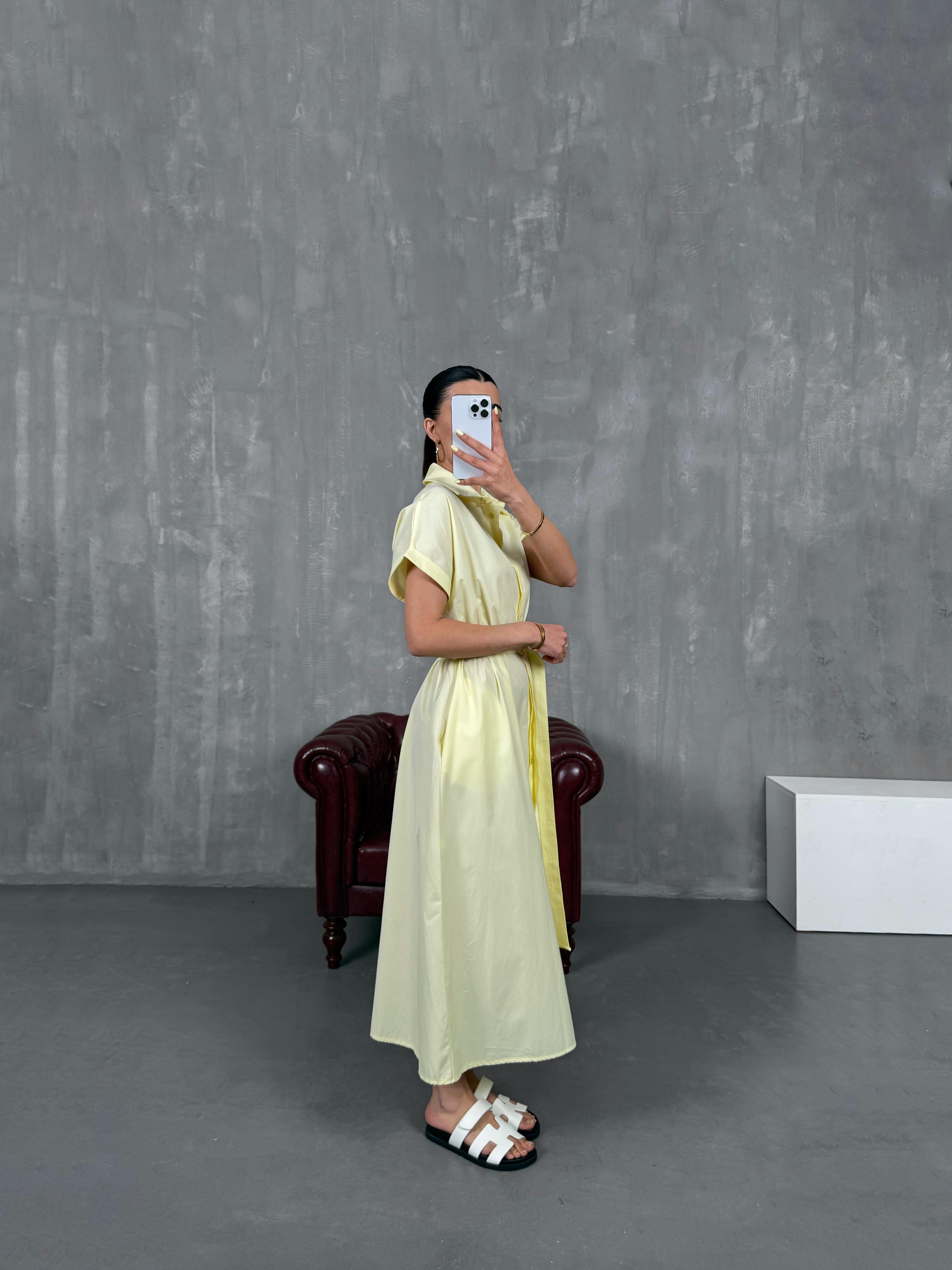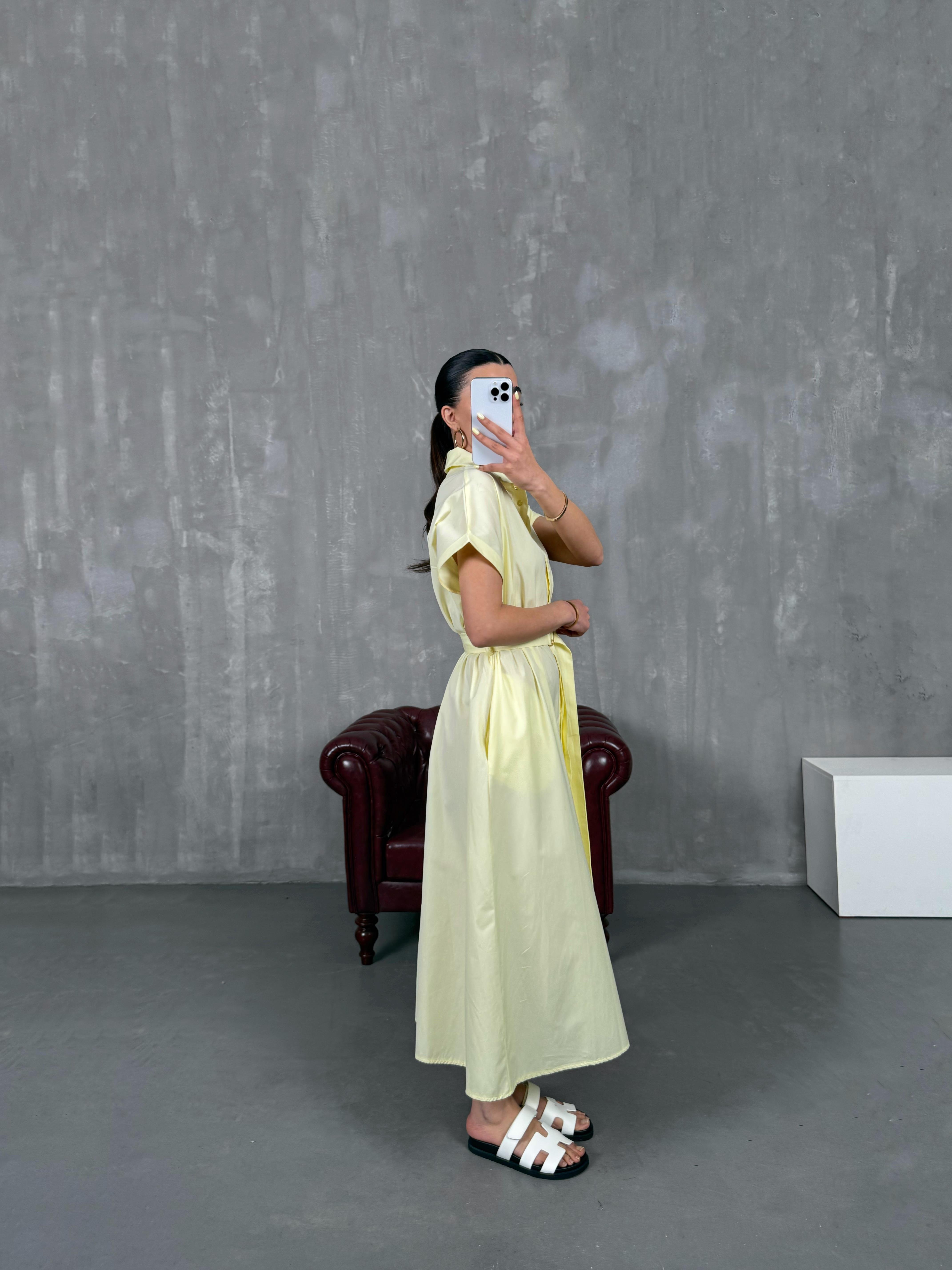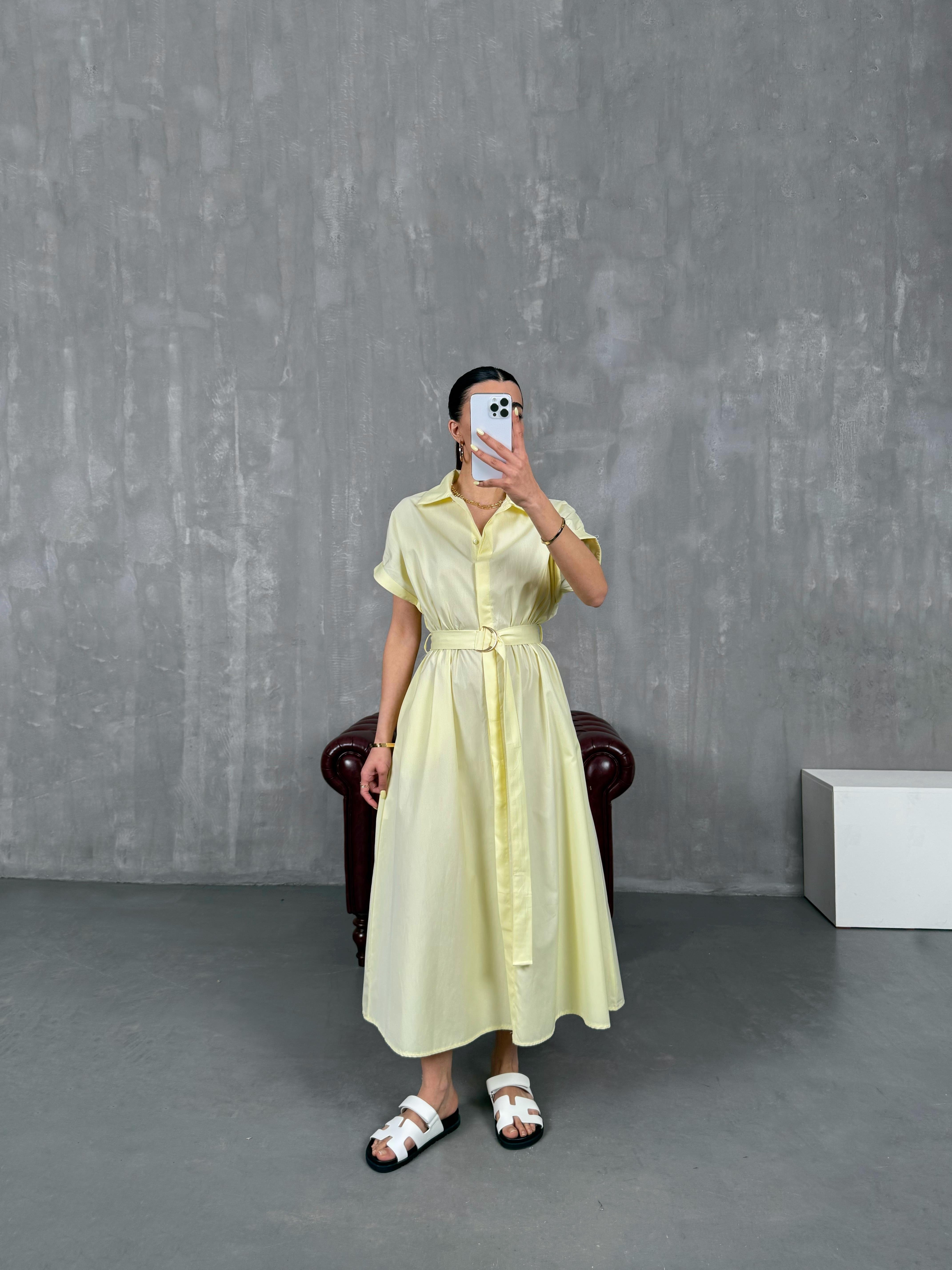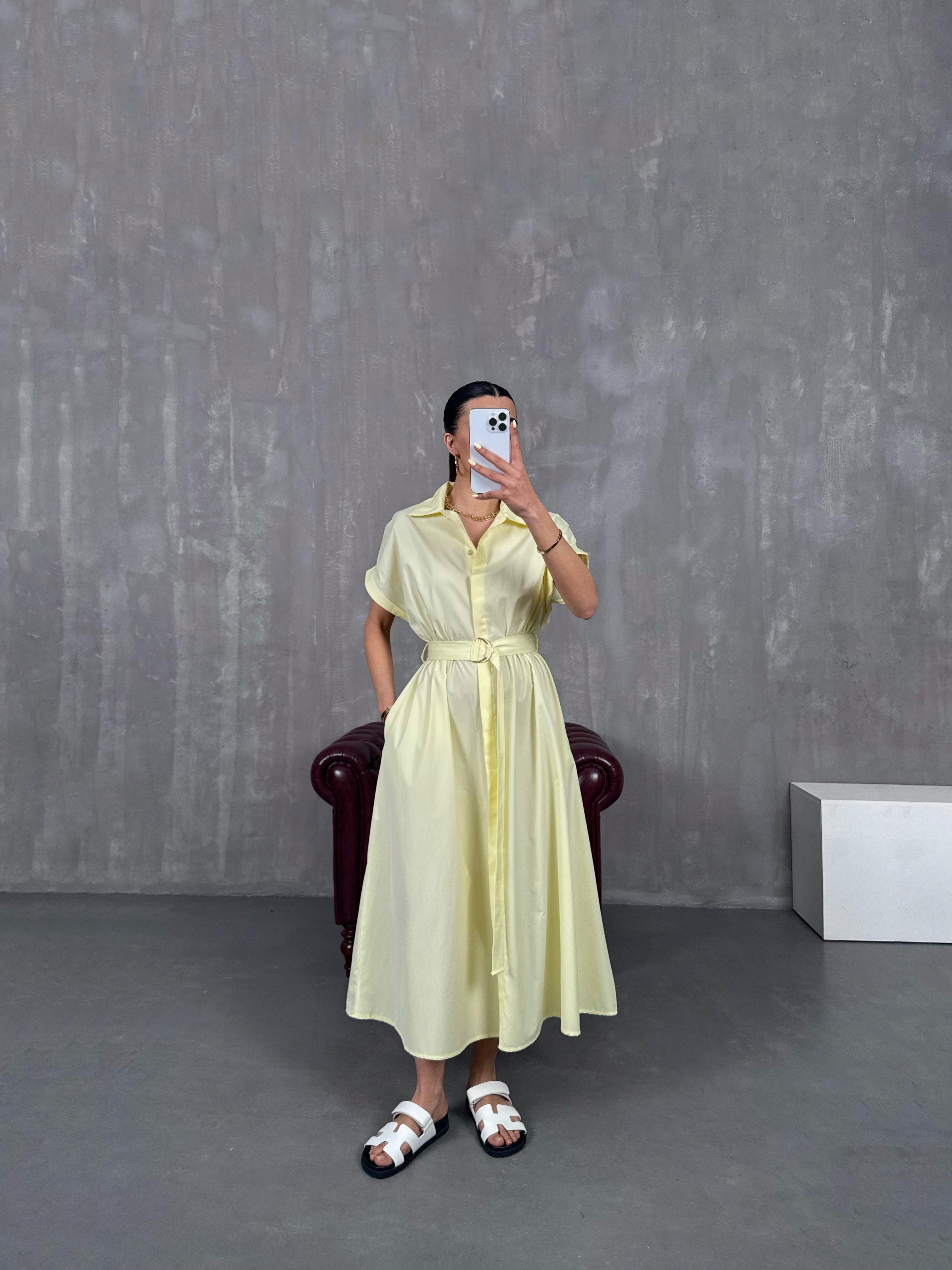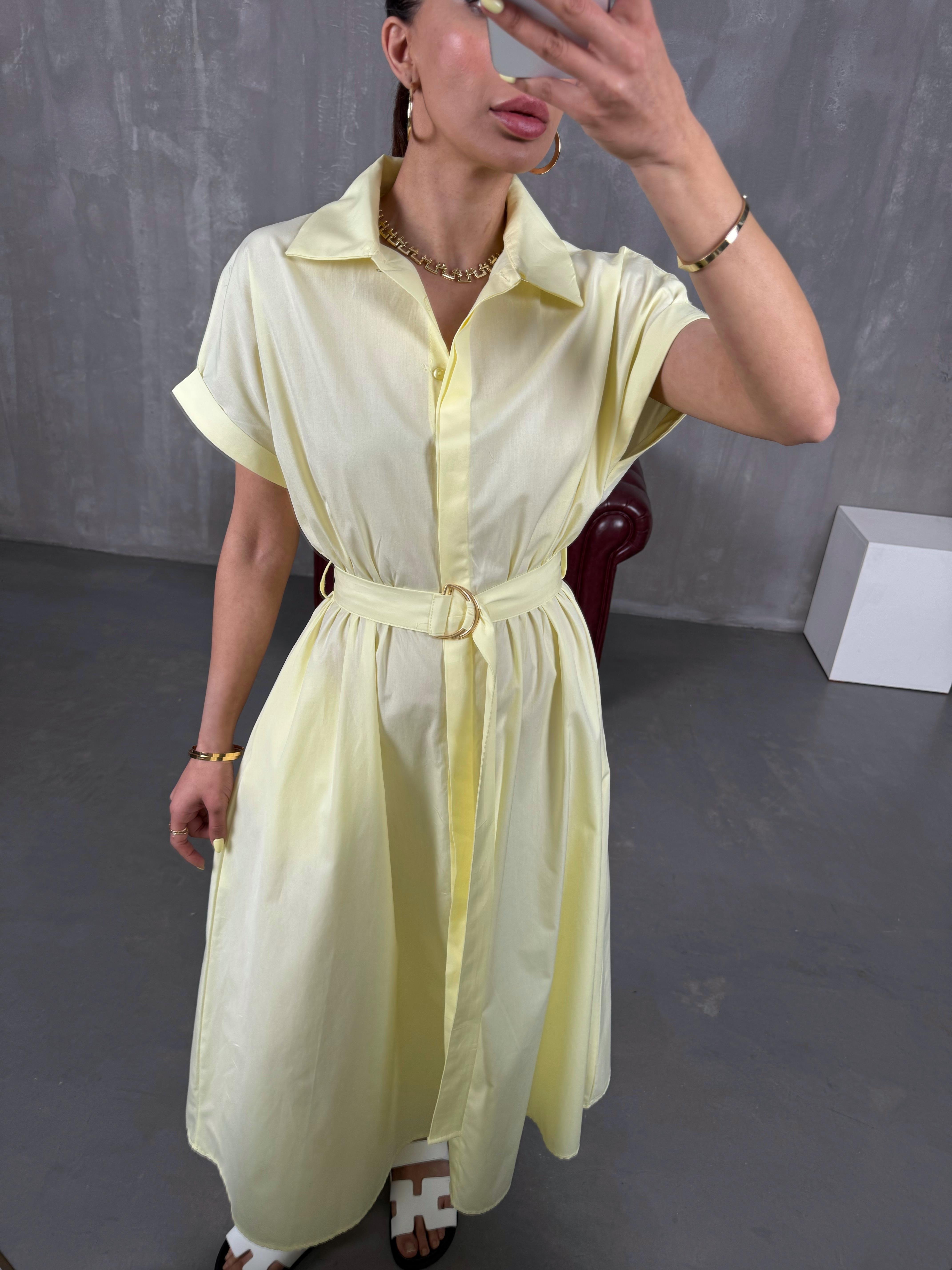 فستان أصفر قميص بوبلين بخصر مطاطي وزنّار Gaus00083