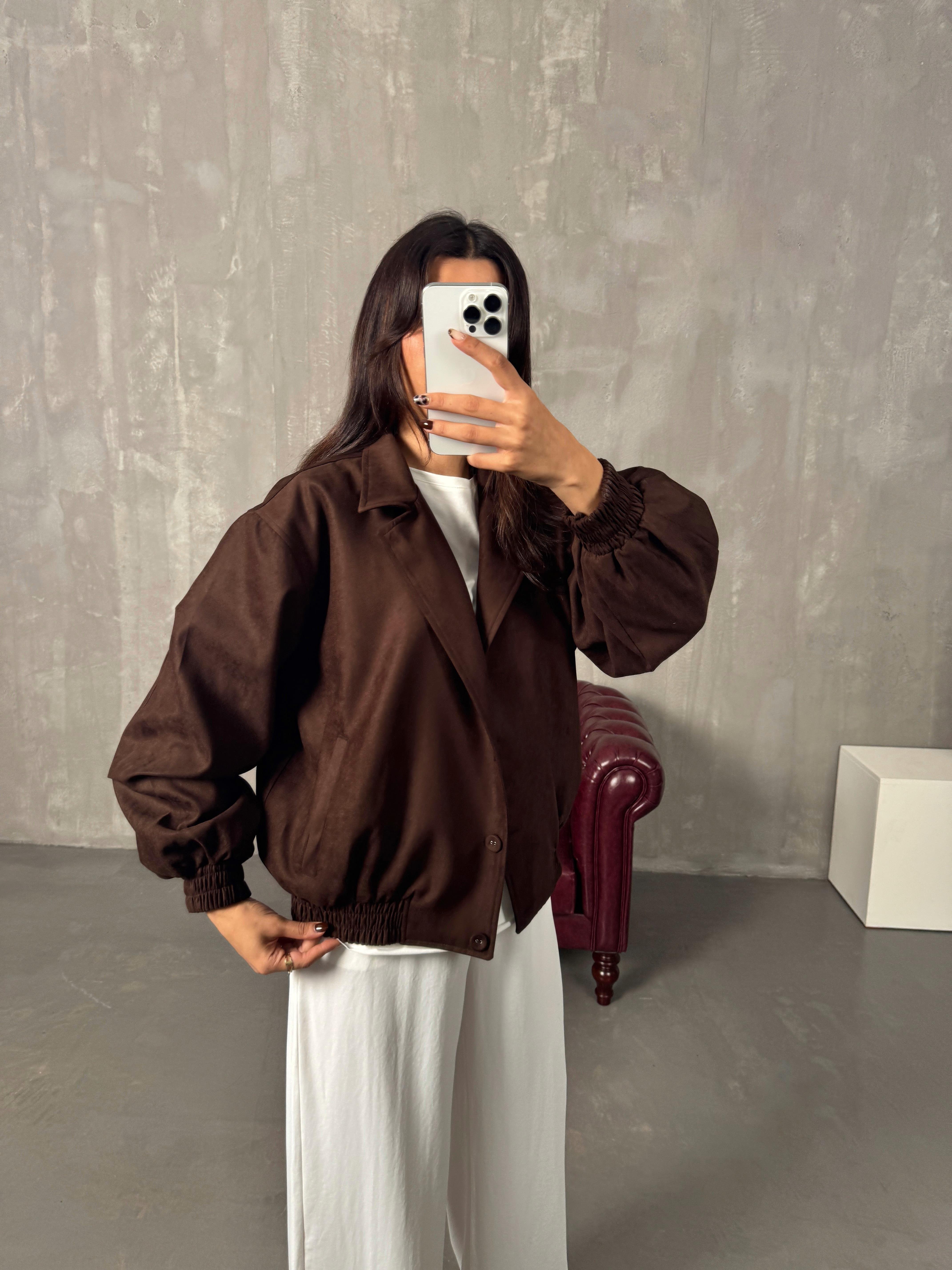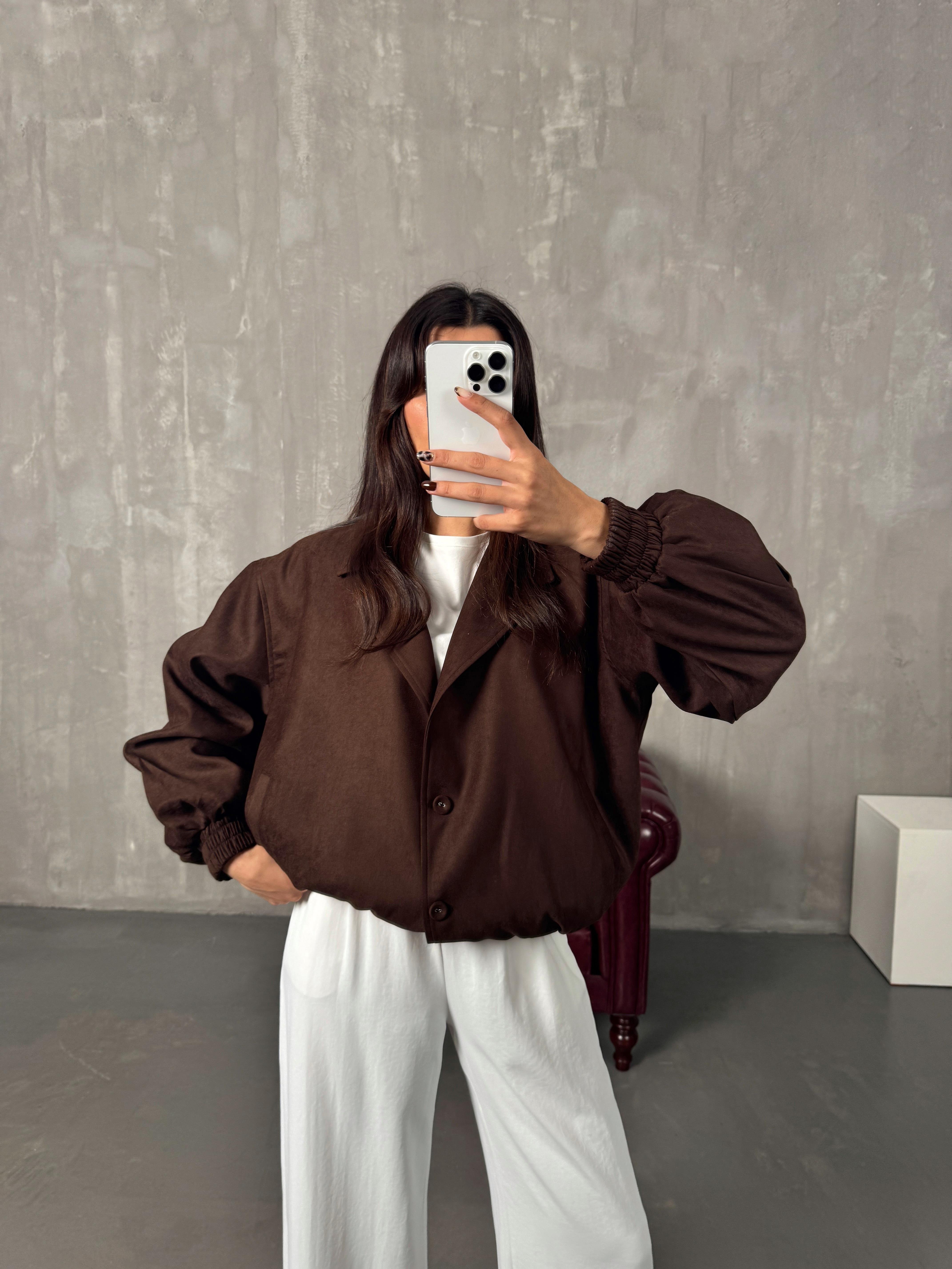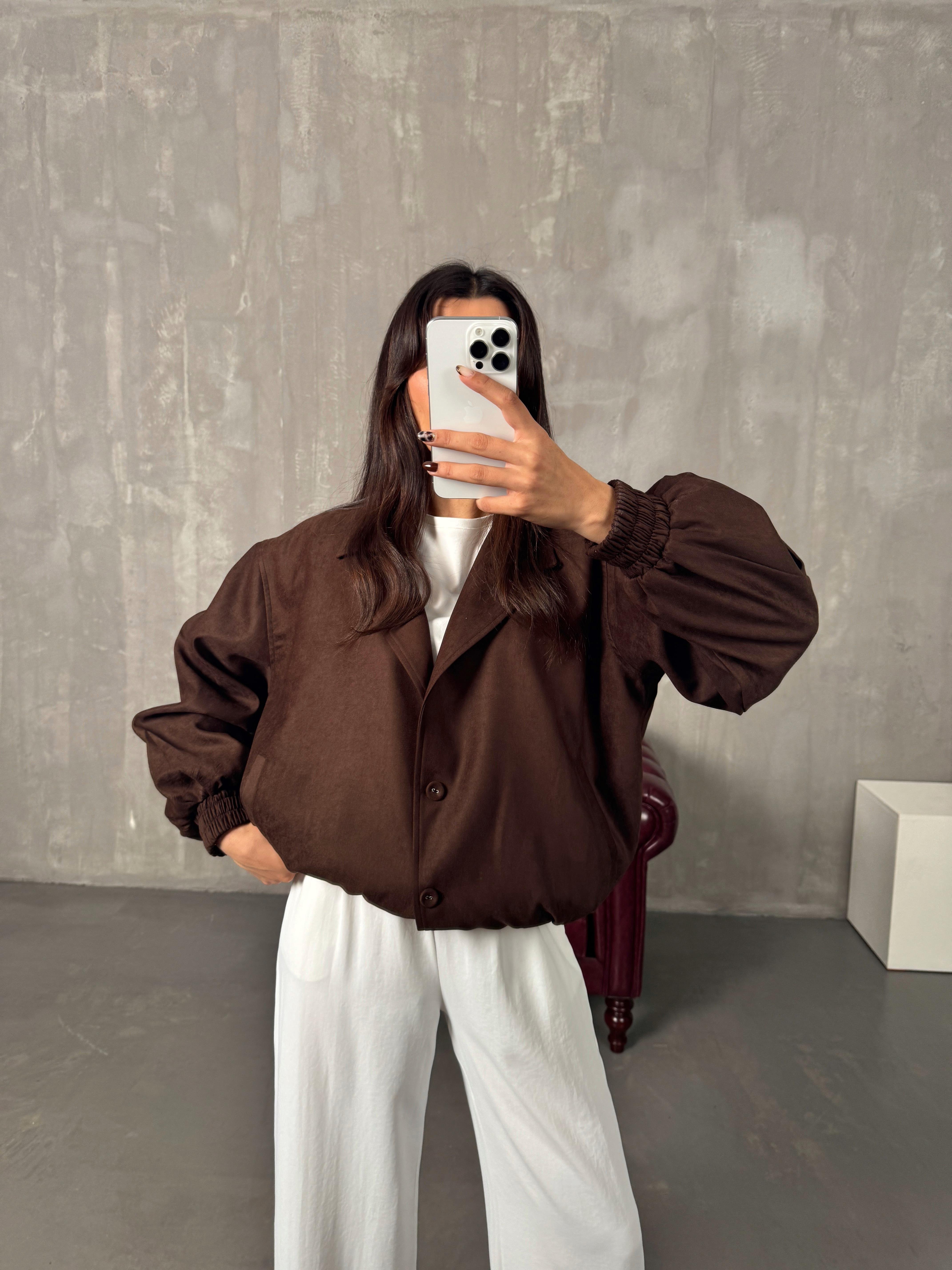 Sely Acı Kahve Astarlı Düğmeli Süet Bomber Ceket