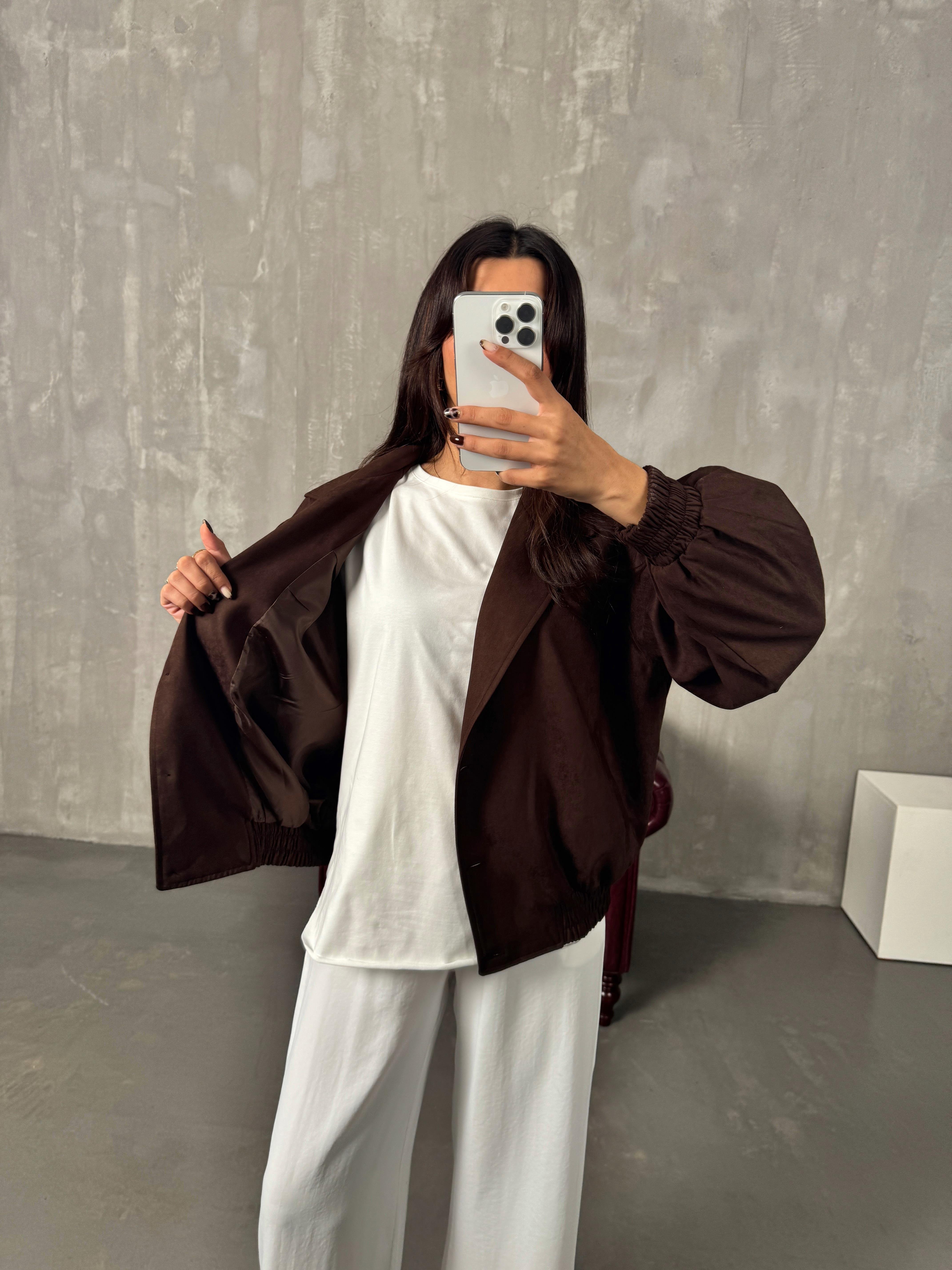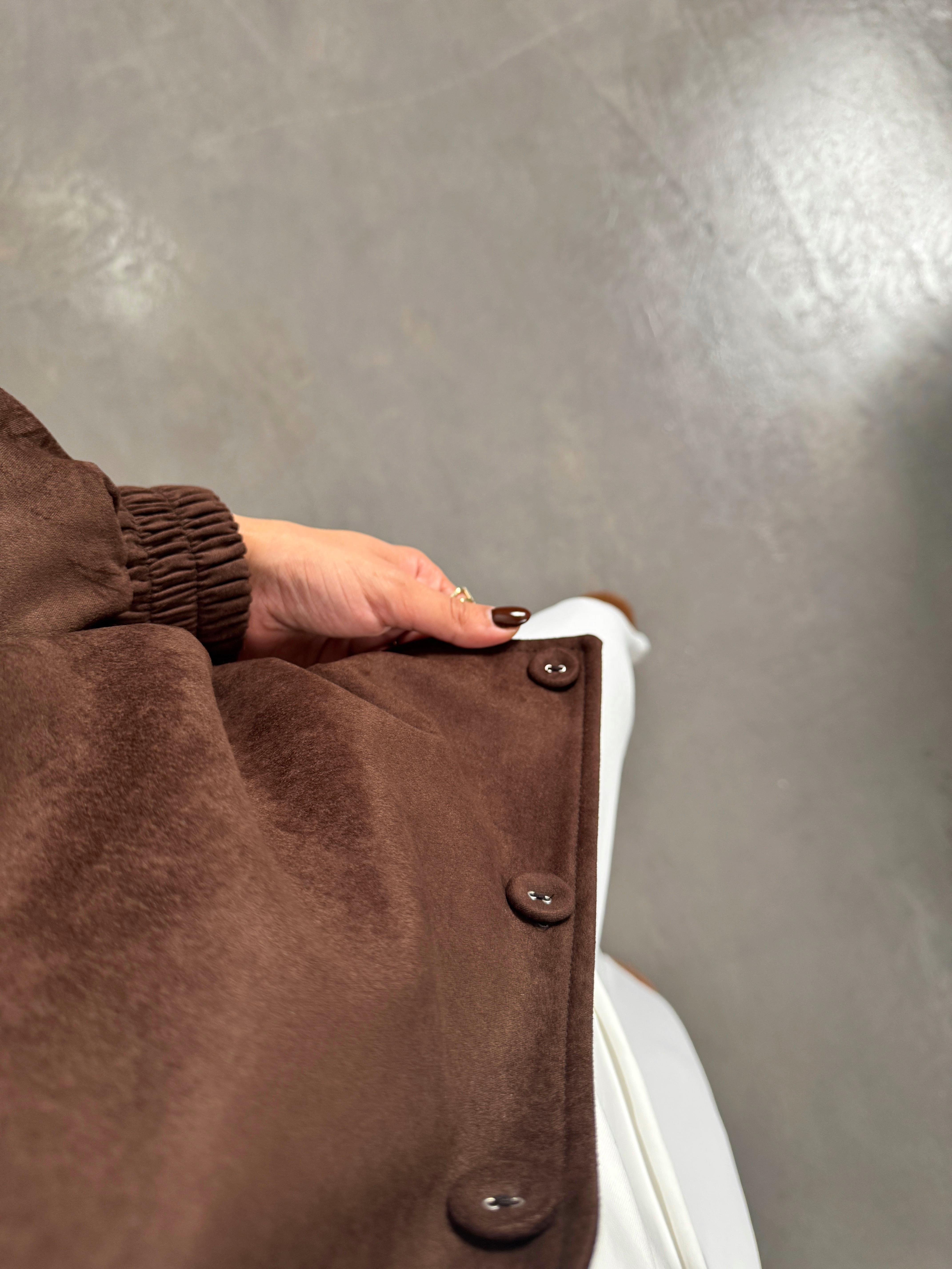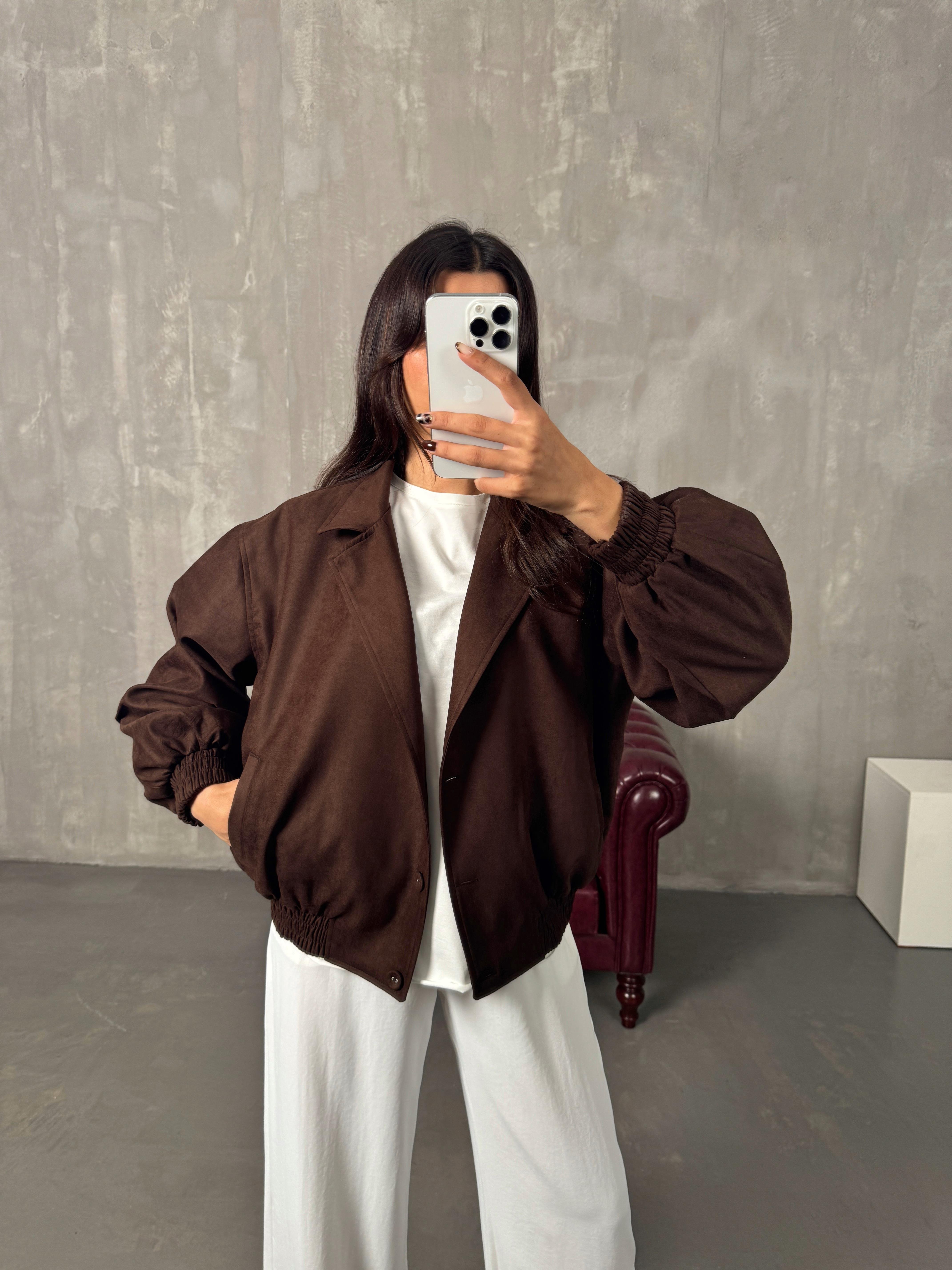 Sely Acı Kahve Astarlı Düğmeli Süet Bomber Ceket