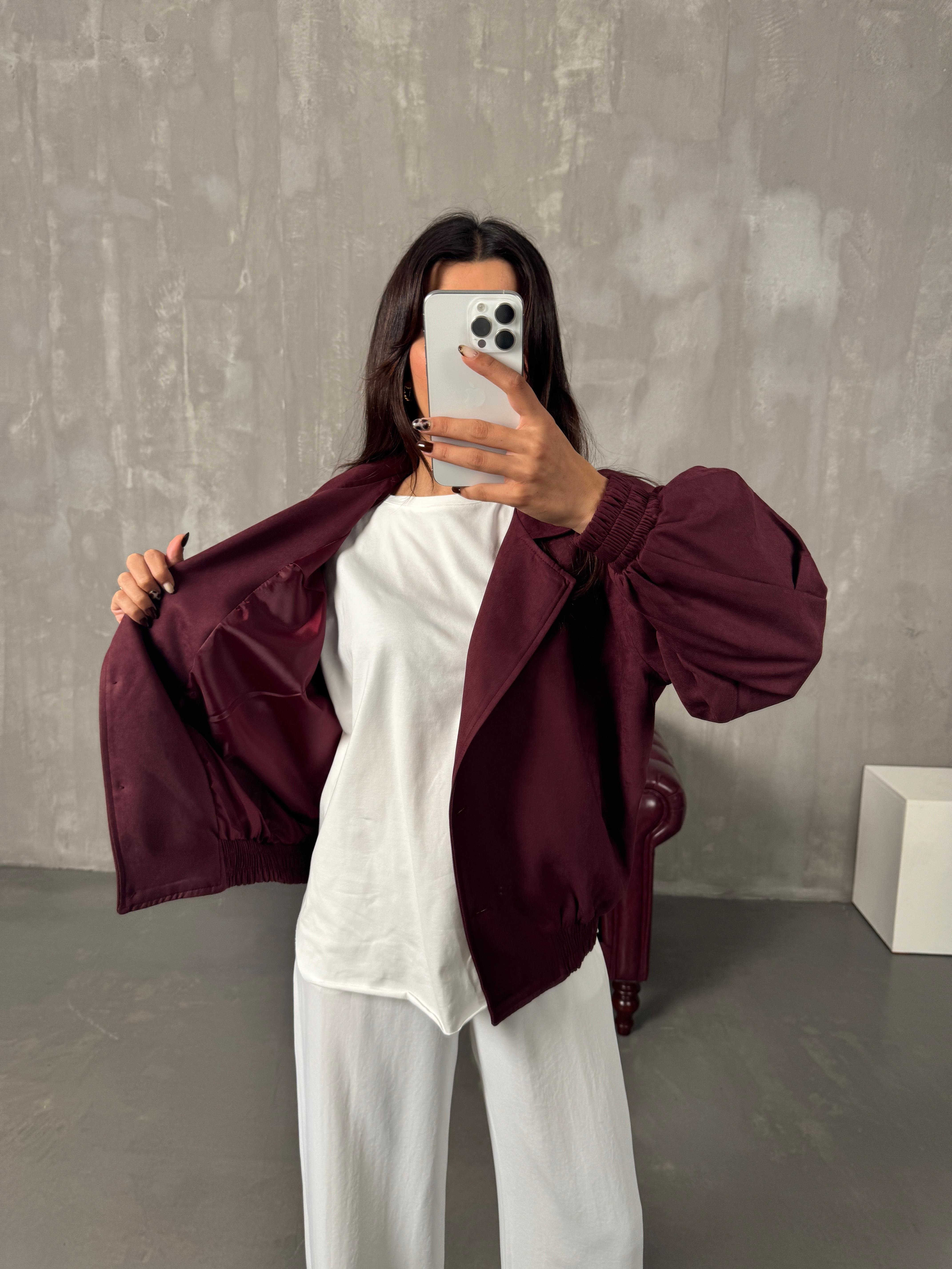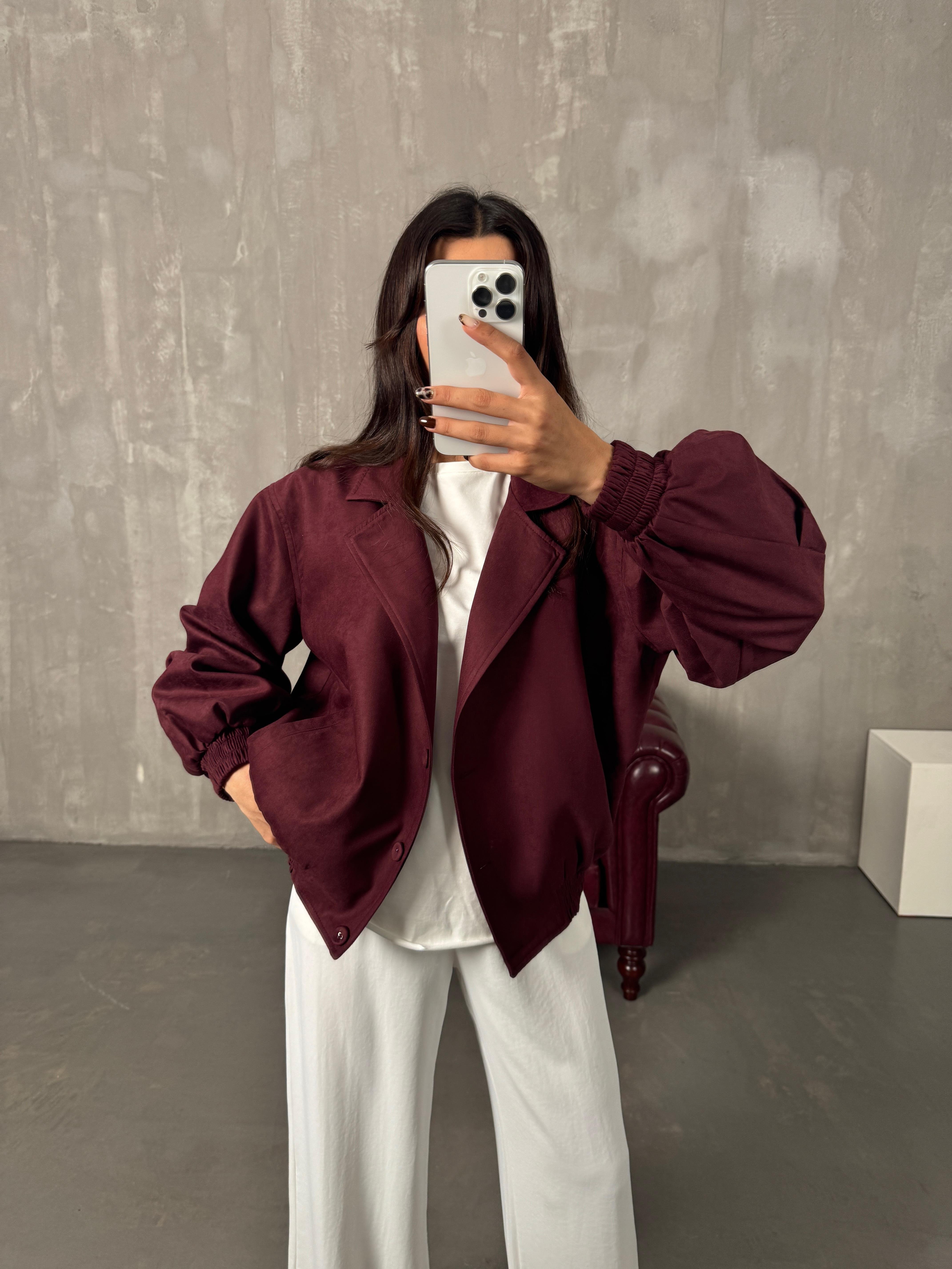 Sely Bordo Astarlı Düğmeli Süet Bomber Ceket