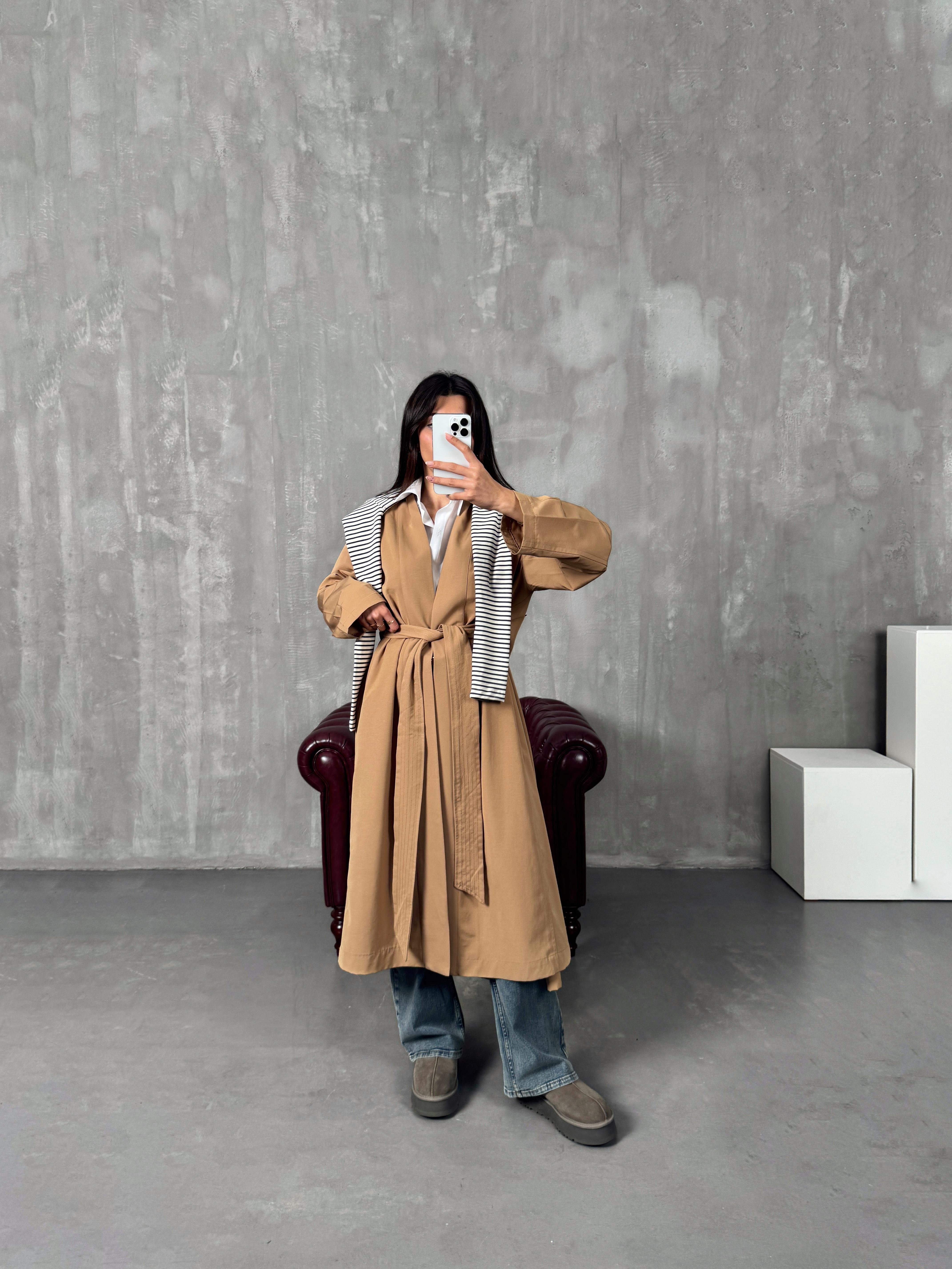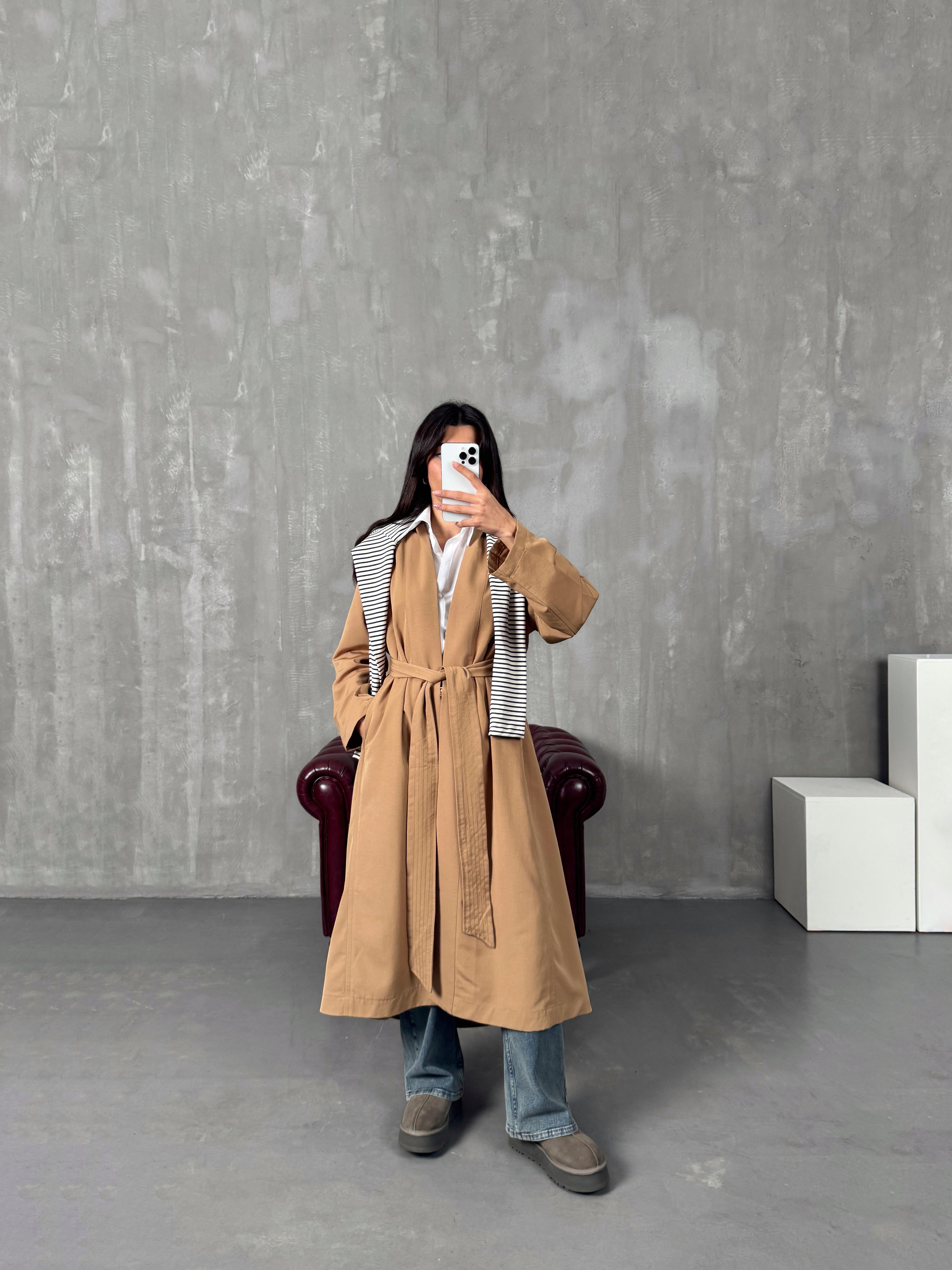 Sindy ZR Camel Muadil Premium Astarsız Kuşaklı Trençkot
