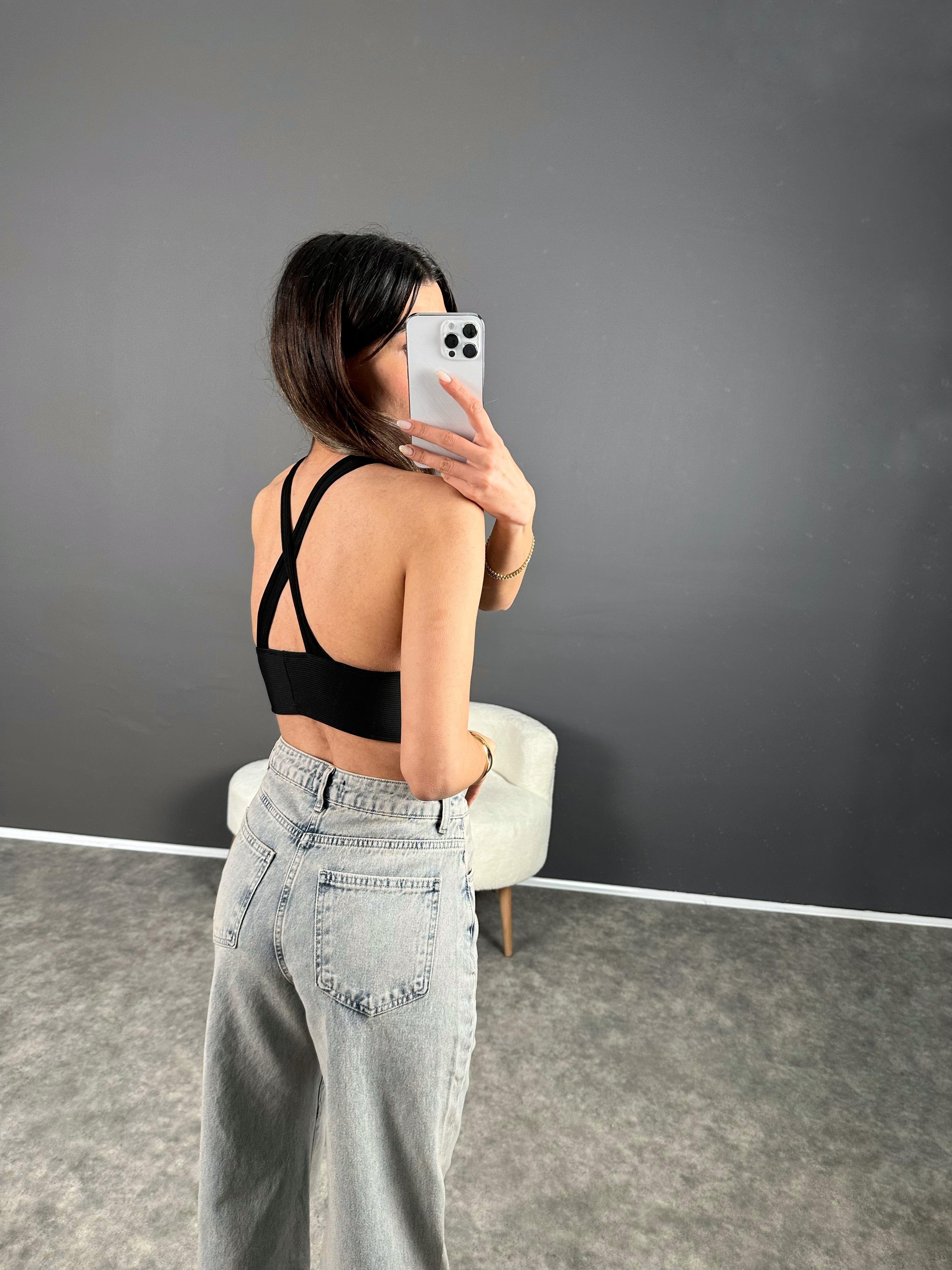 Siyah Arkası Çapraz V Yaka Crop