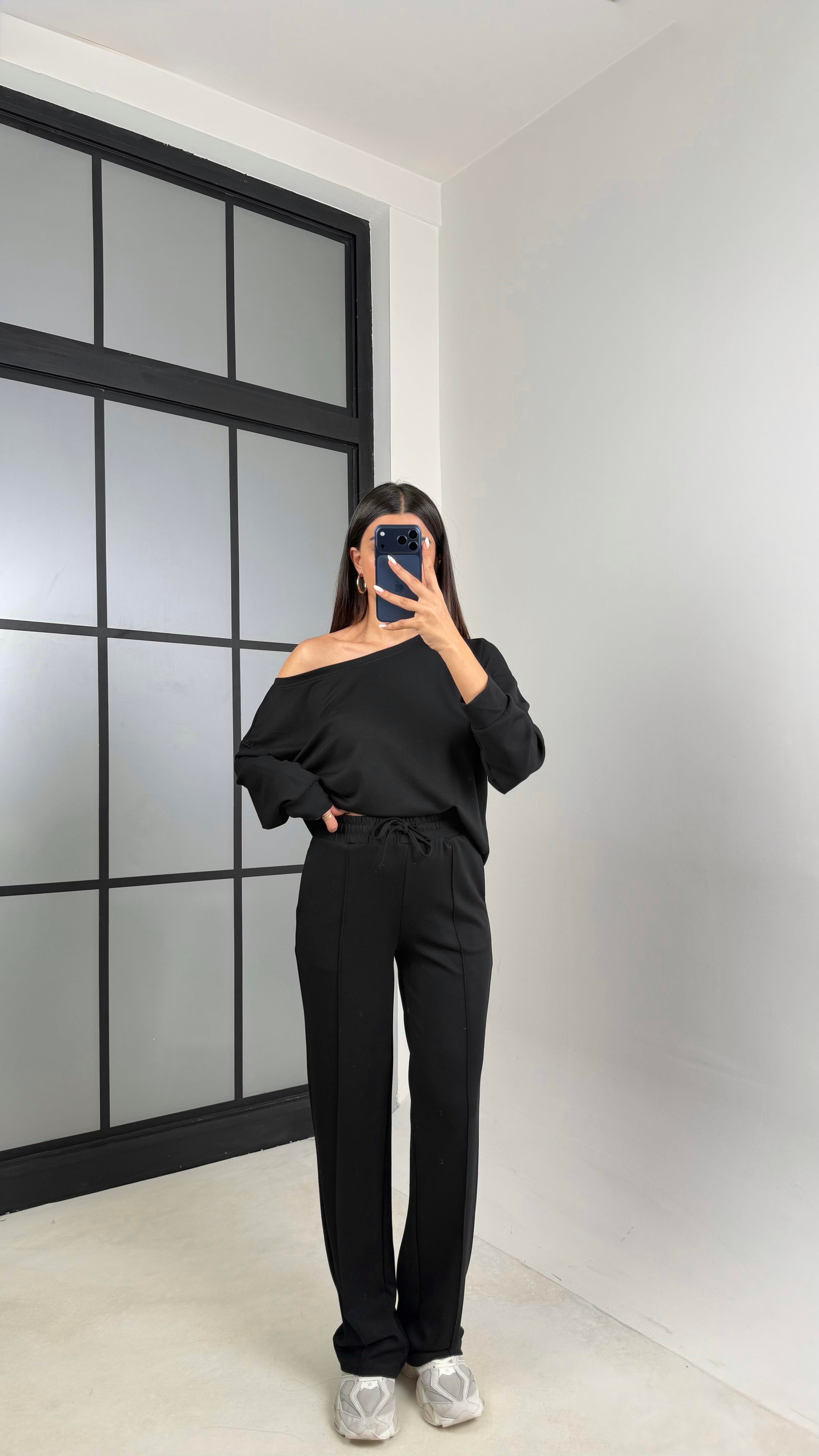 Siyah Asimetrik Yaka Beli Lastikli Çımalı Pantolon Modal Kumaş Takım GAUS-00629GAUSTAKIMGAUS-00629