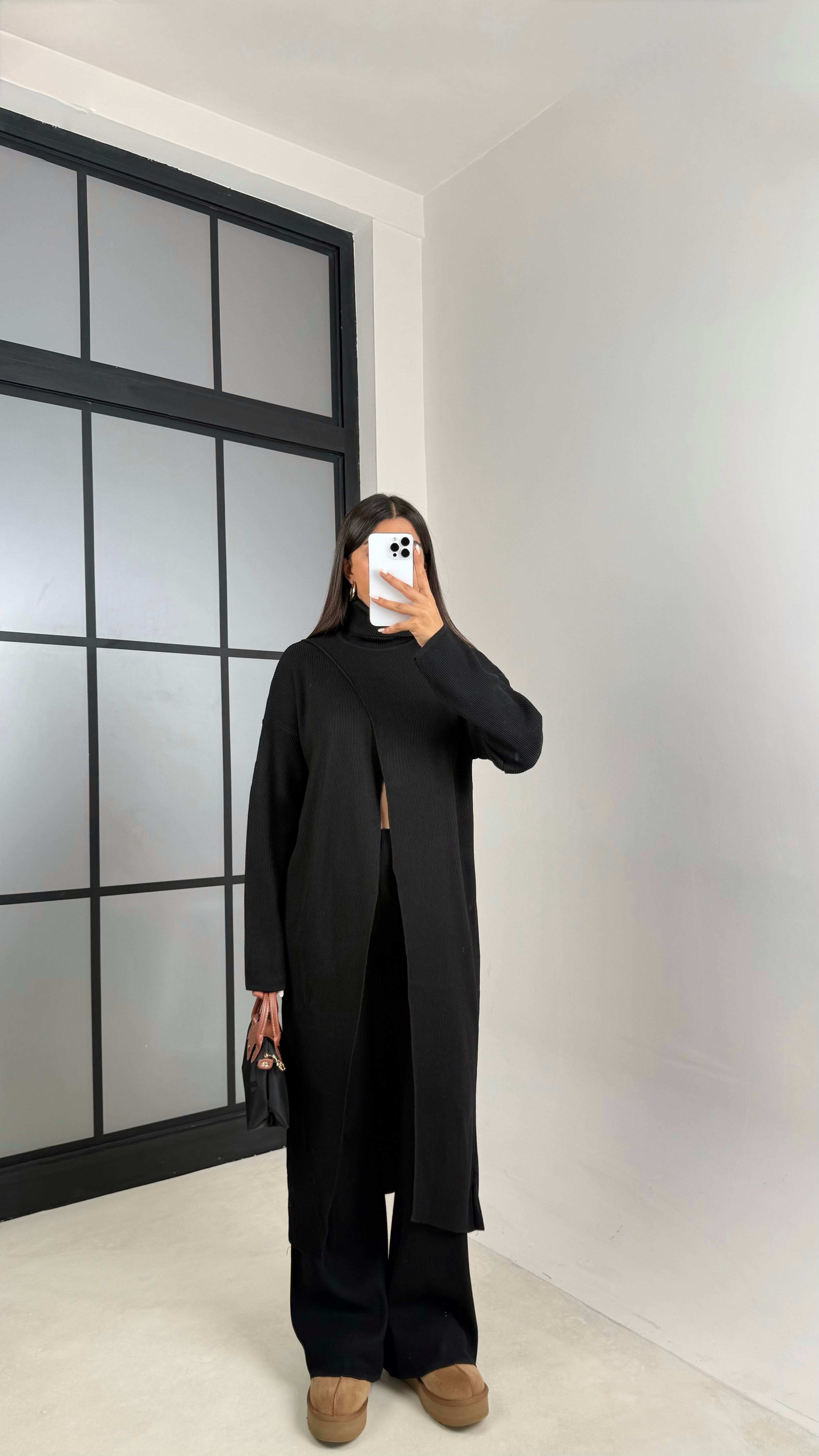 Siyah Balıkçı Yaka Asimetrik Kesim Kazak Beli Lastikli Pantolon İkili Triko Takım GAUS-00591GAUSTAKIMGAUS-00591