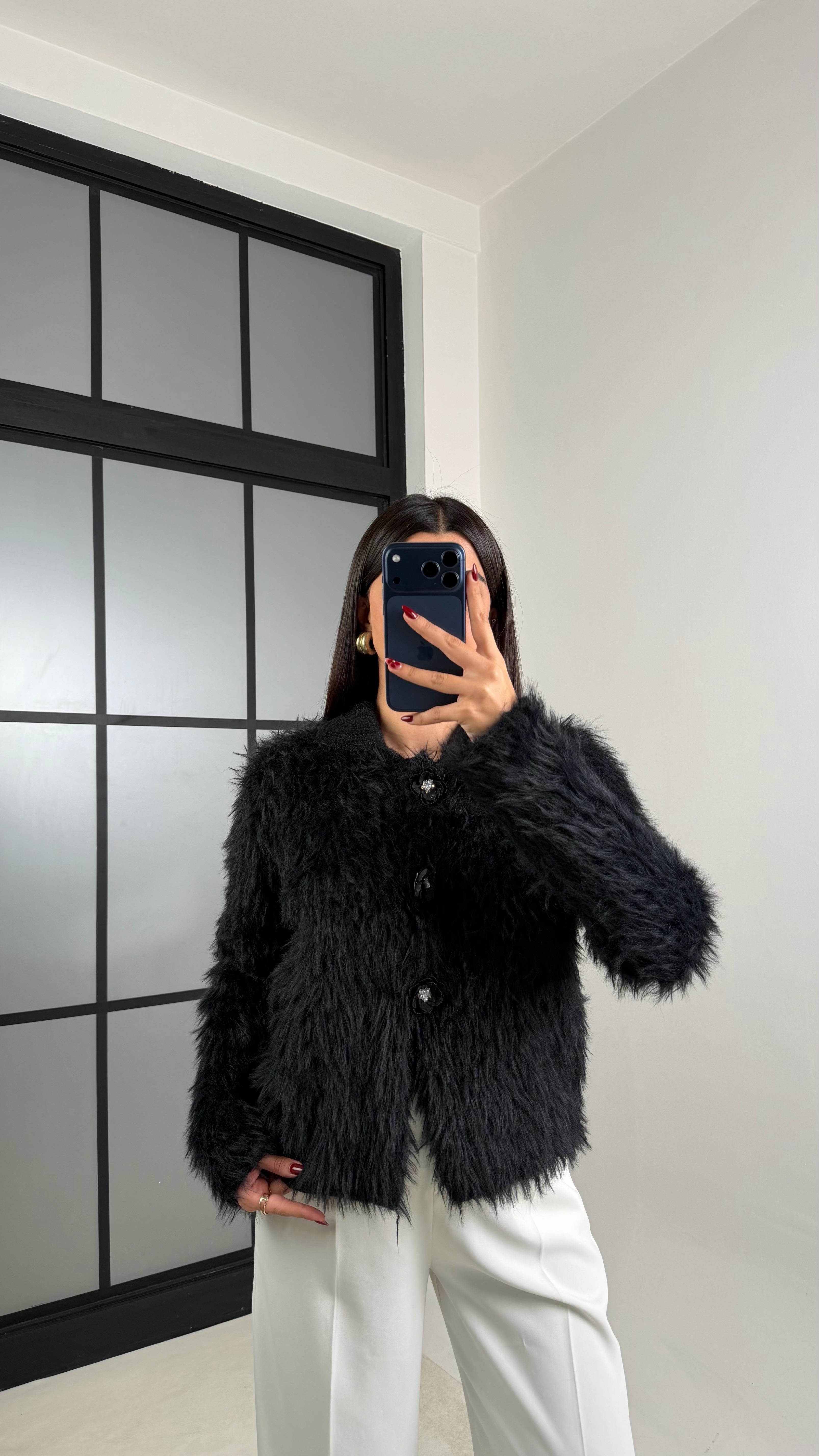 Siyah Çiçek Düğmeli Sakallı Triko Hırka GAUS-00709