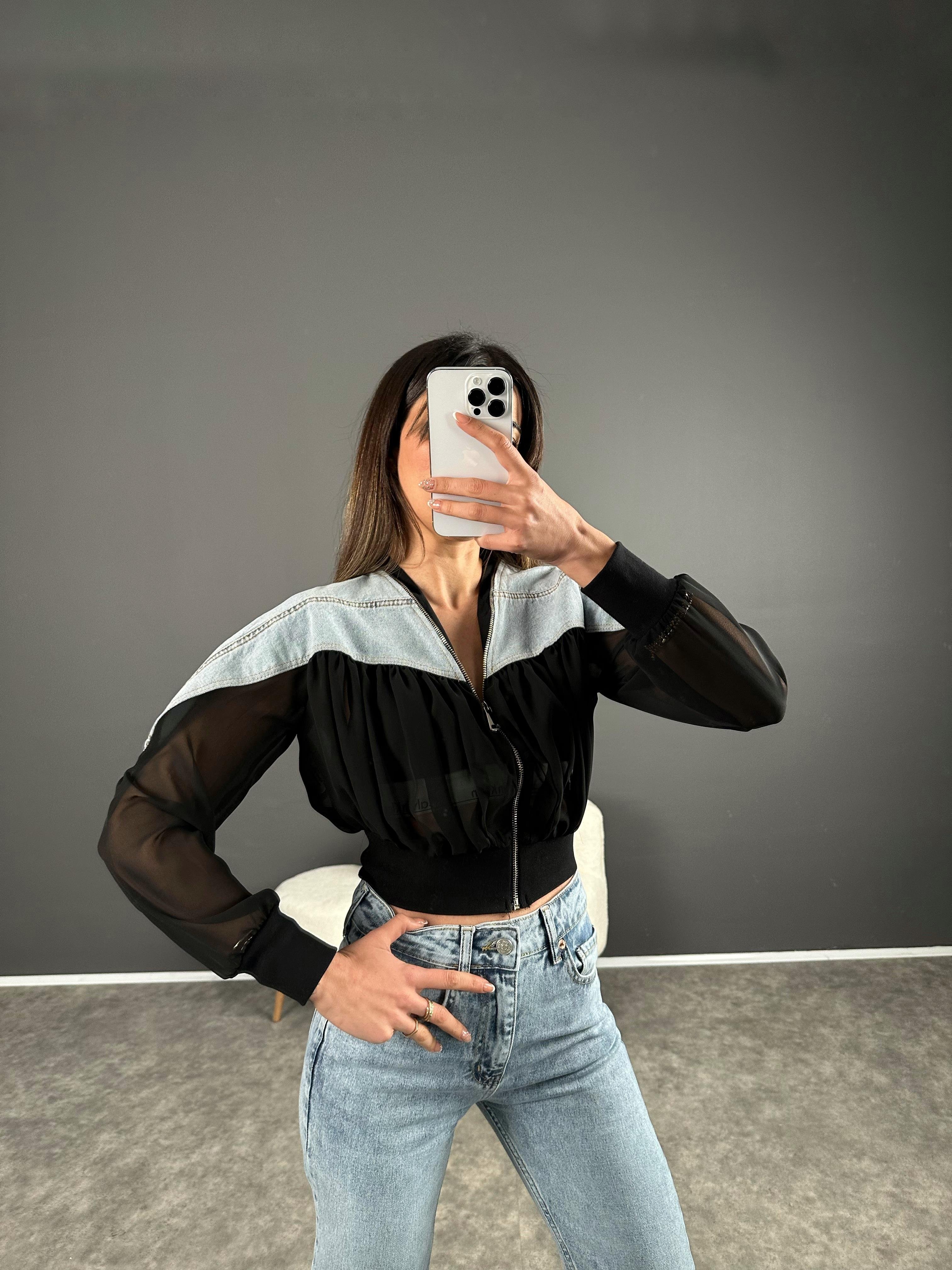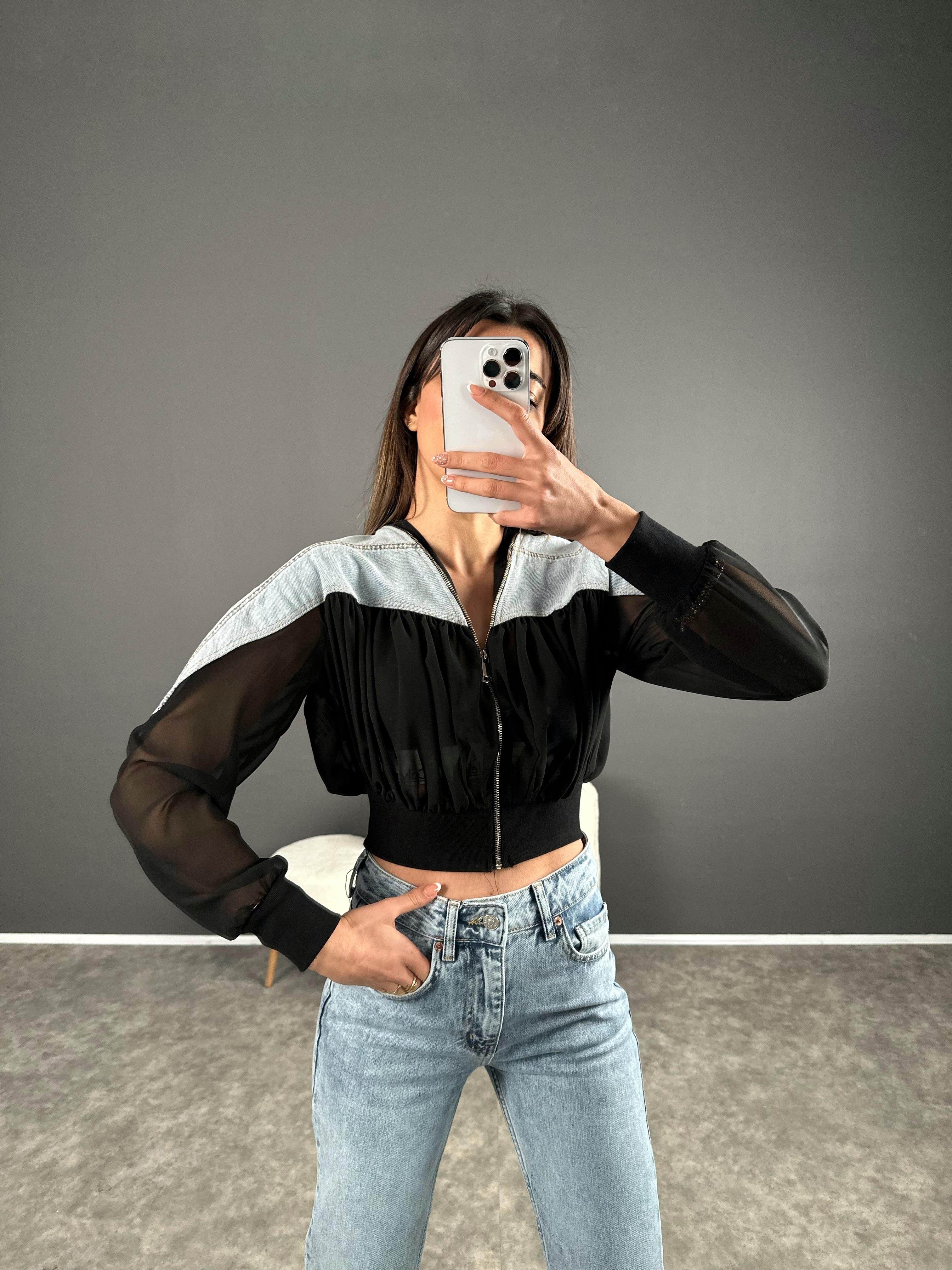 Siyah Denim Detaylı Tül Ceket