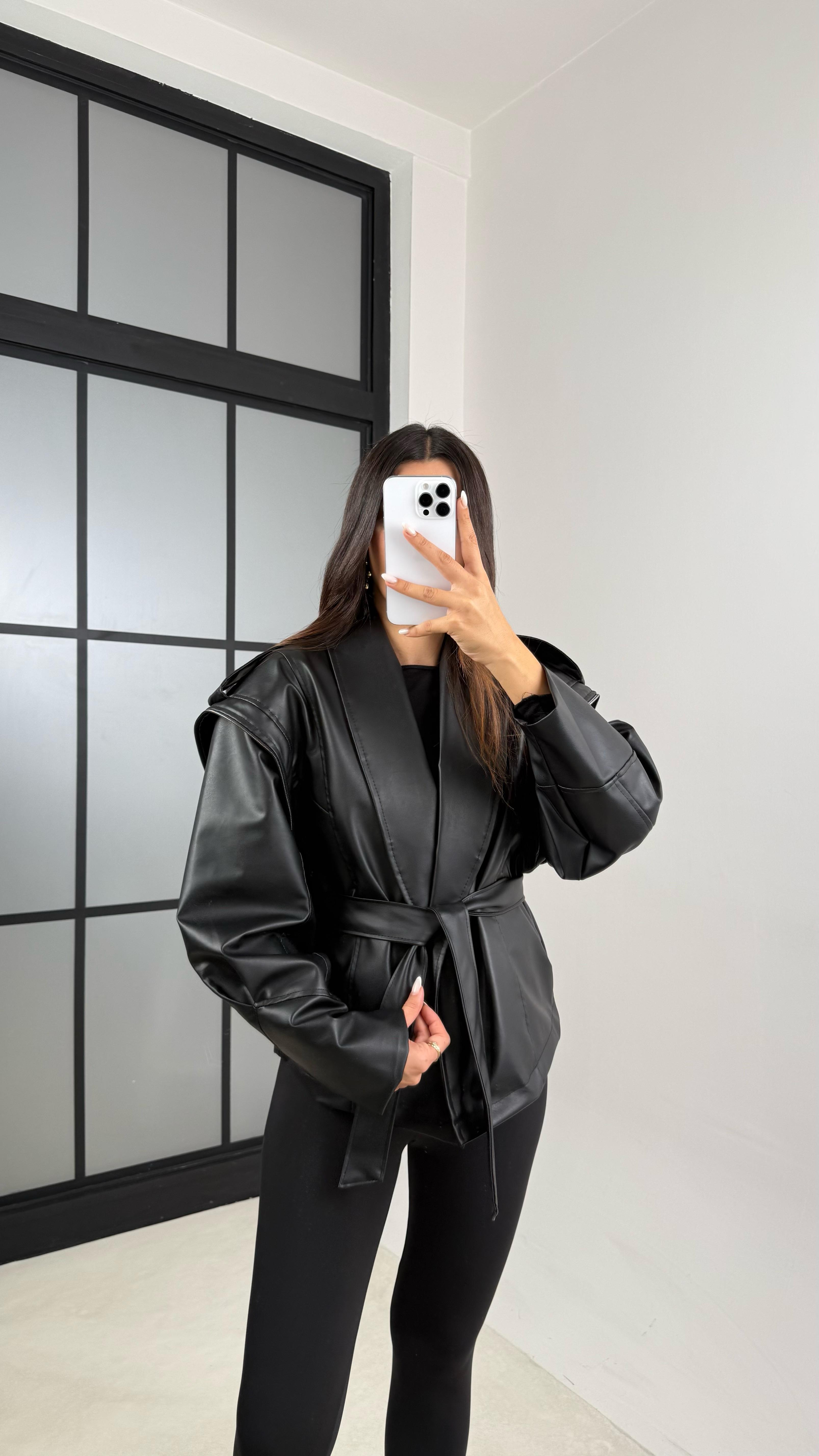 Siyah Fermuar Detaylı Astarlı Kuşaklı Tasarım Deri Ceket GAUS-00599