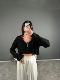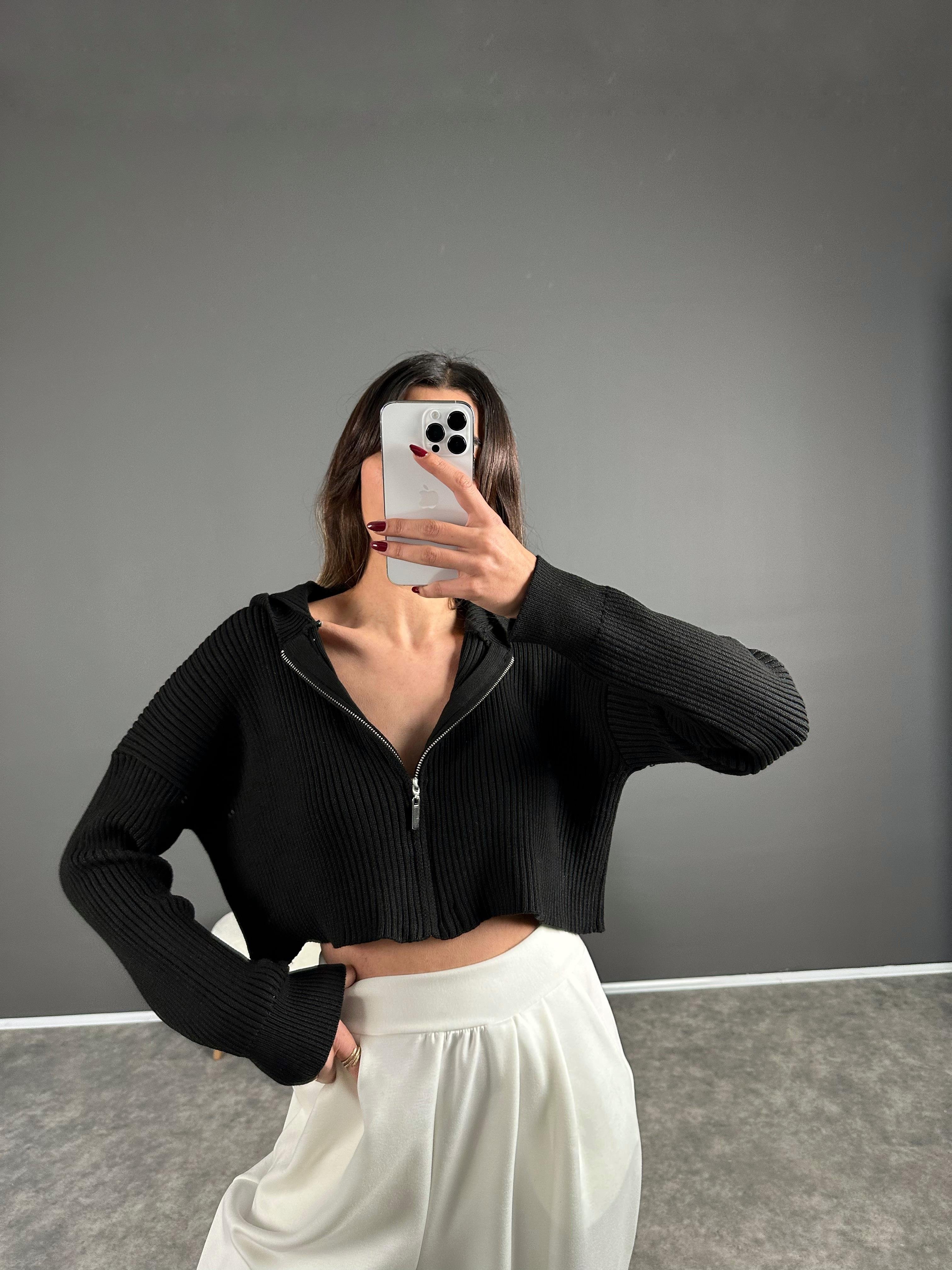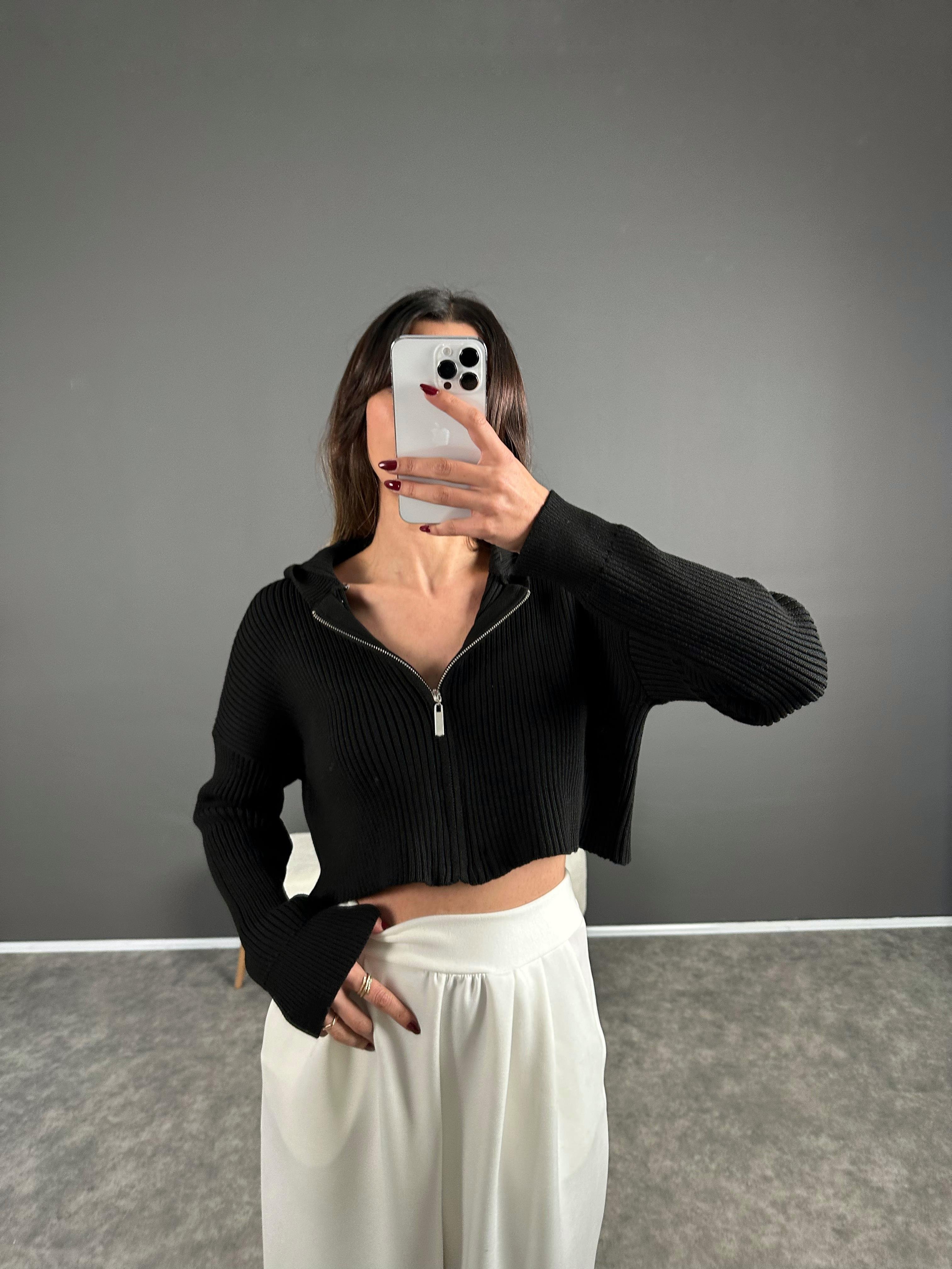 Siyah Fermuarlı Kapüşonlu Crop Ceket