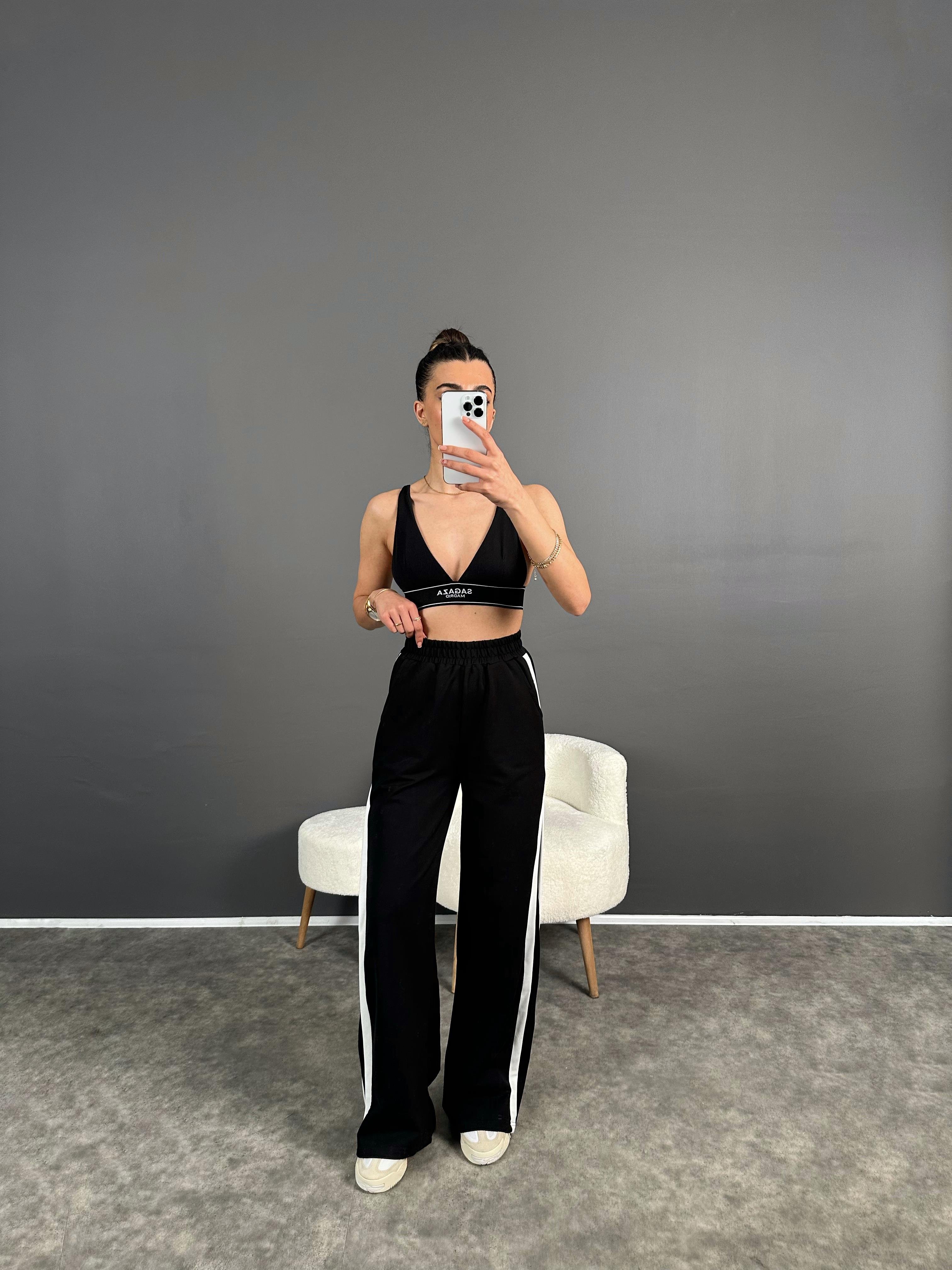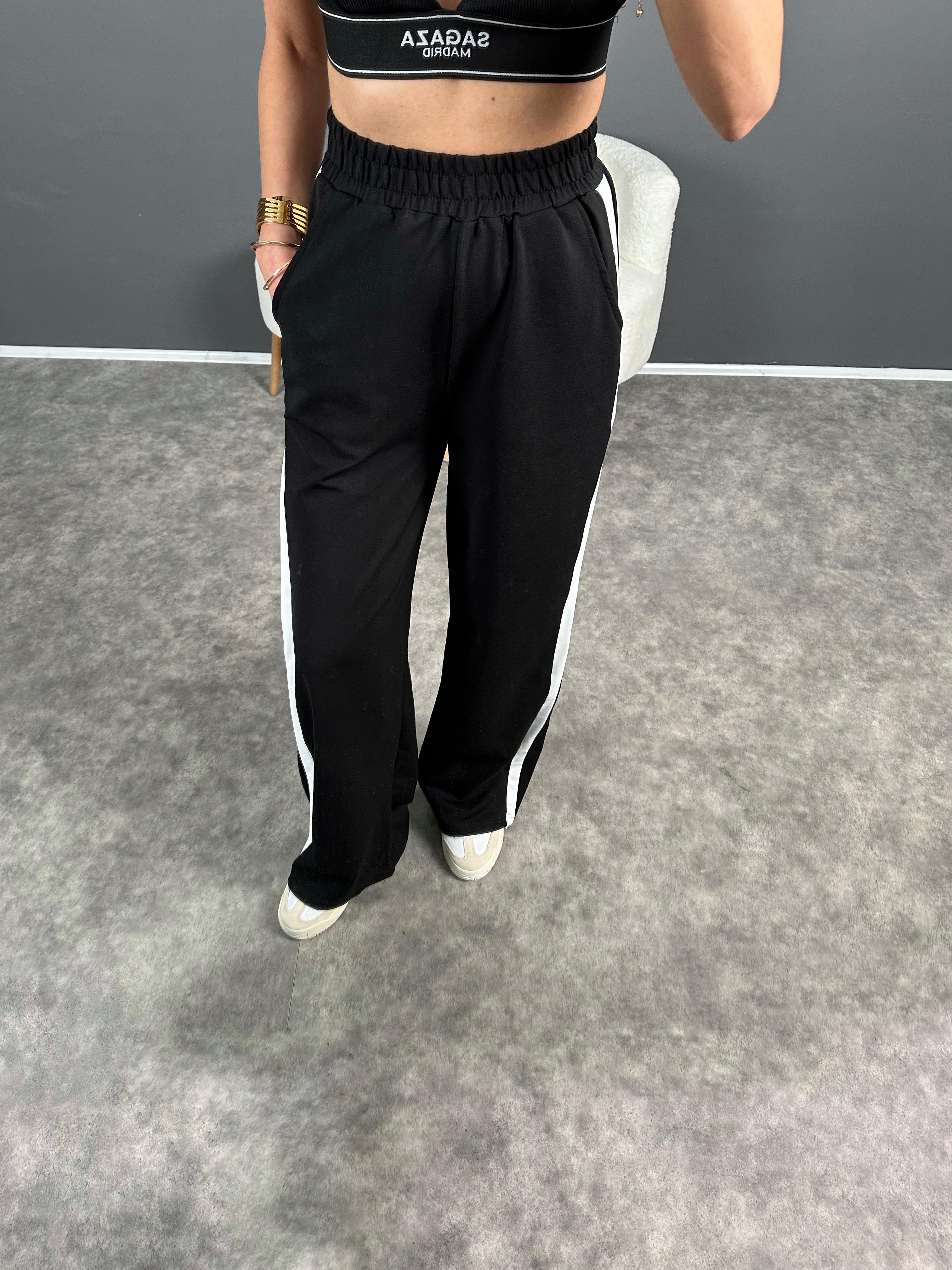 Siyah İki İplik Çelik Şeritli Beli Lastikli Pantolon