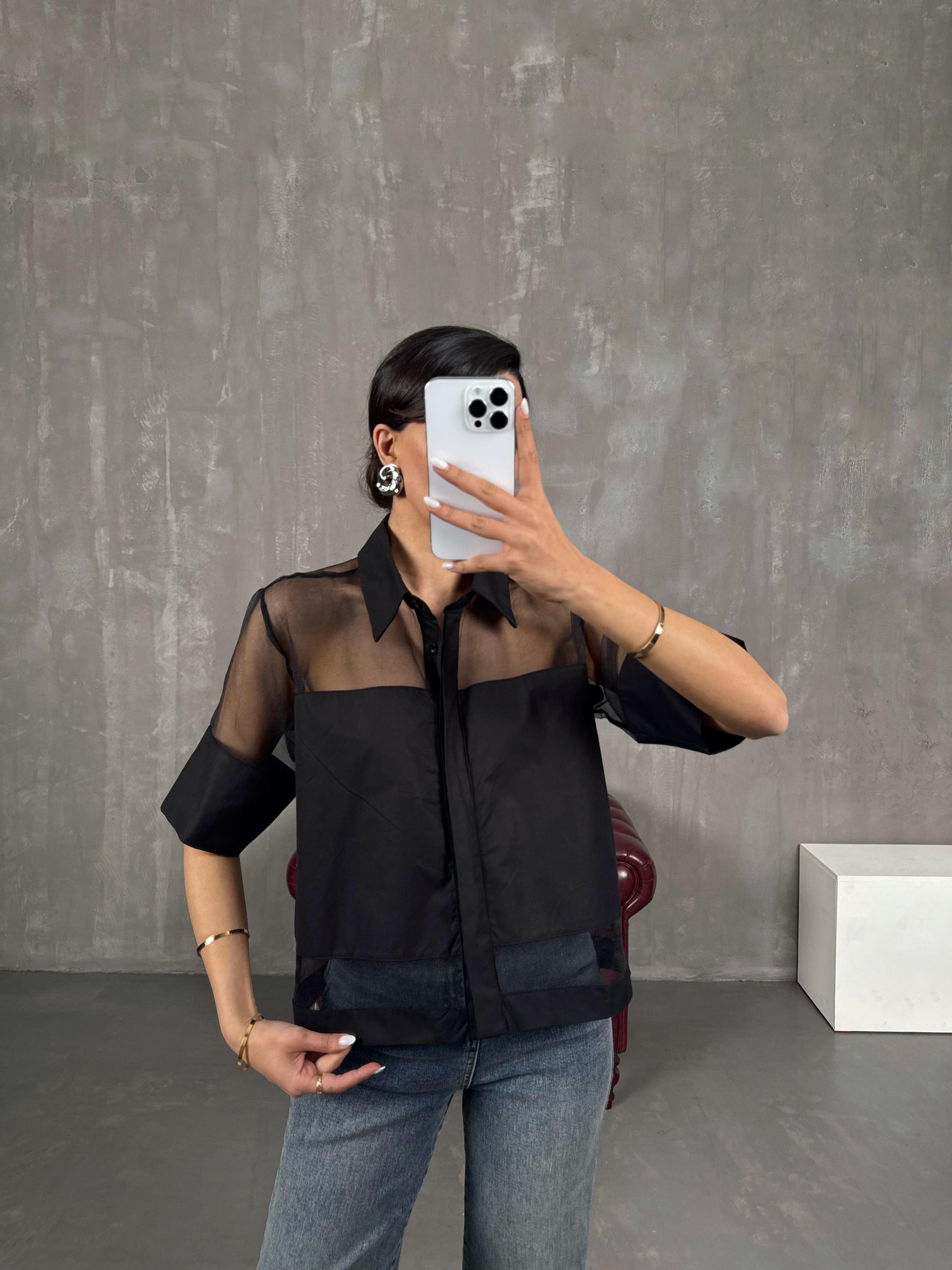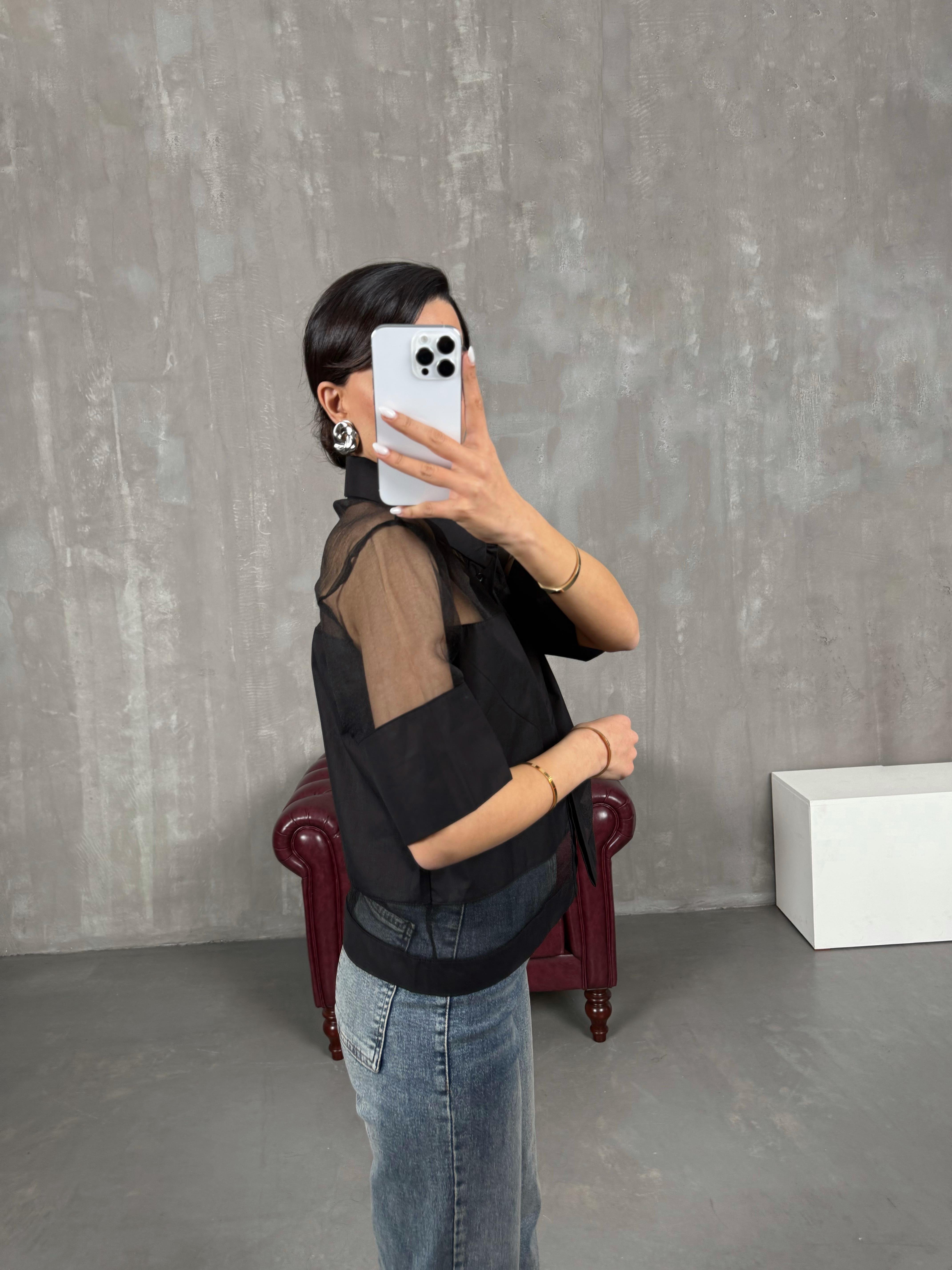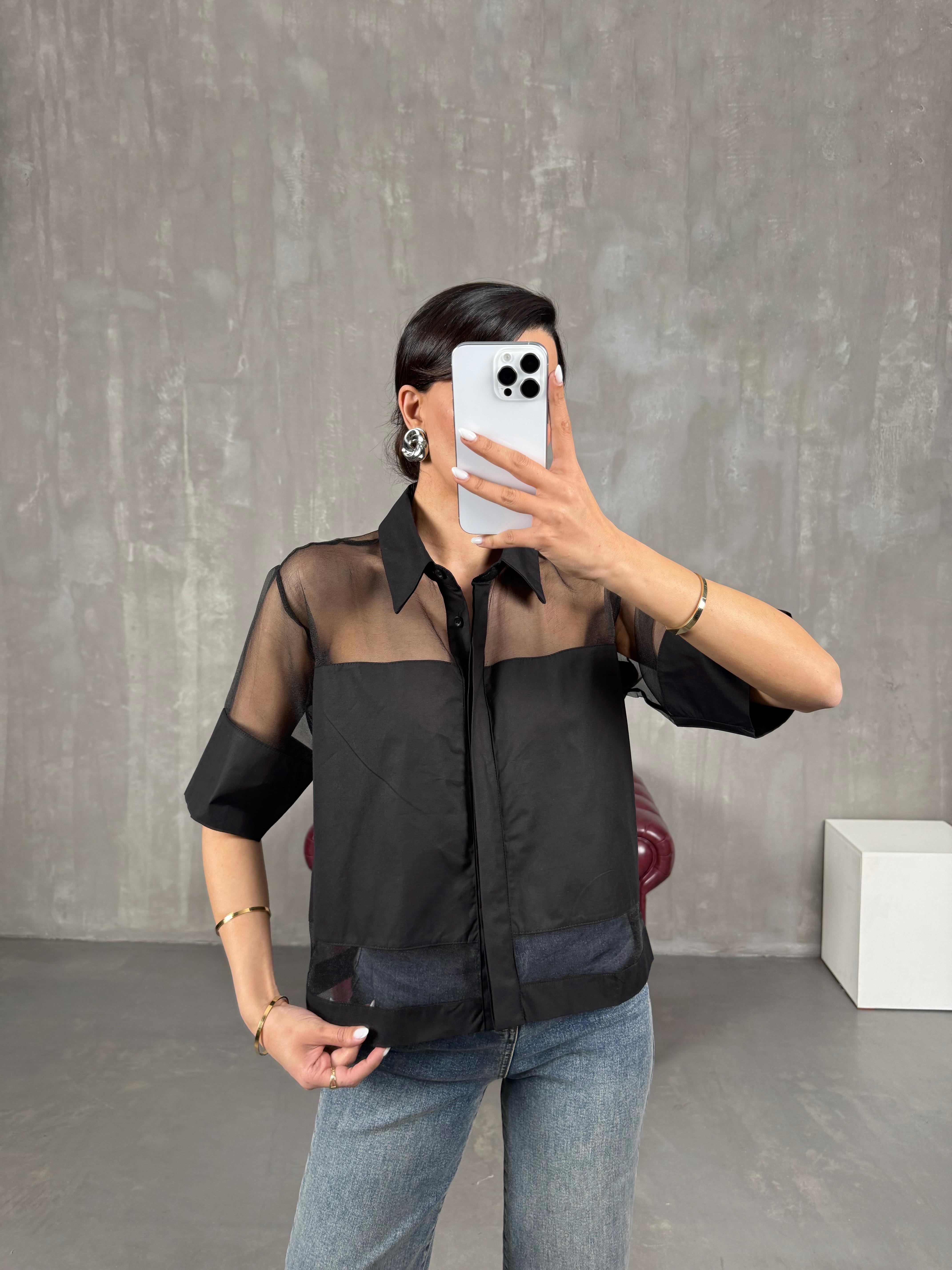 قميص أسود بأكمام قصيرة وتفاصيل شفافة Gaus00040