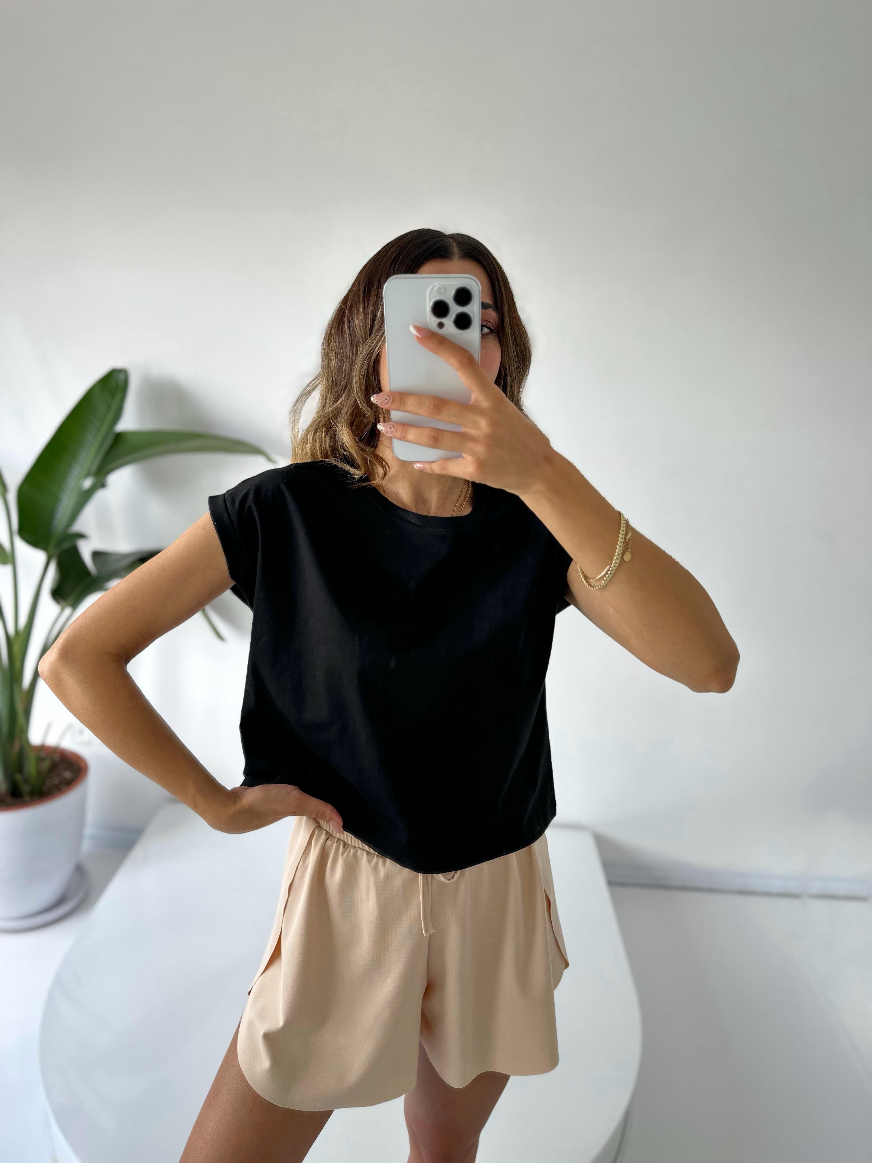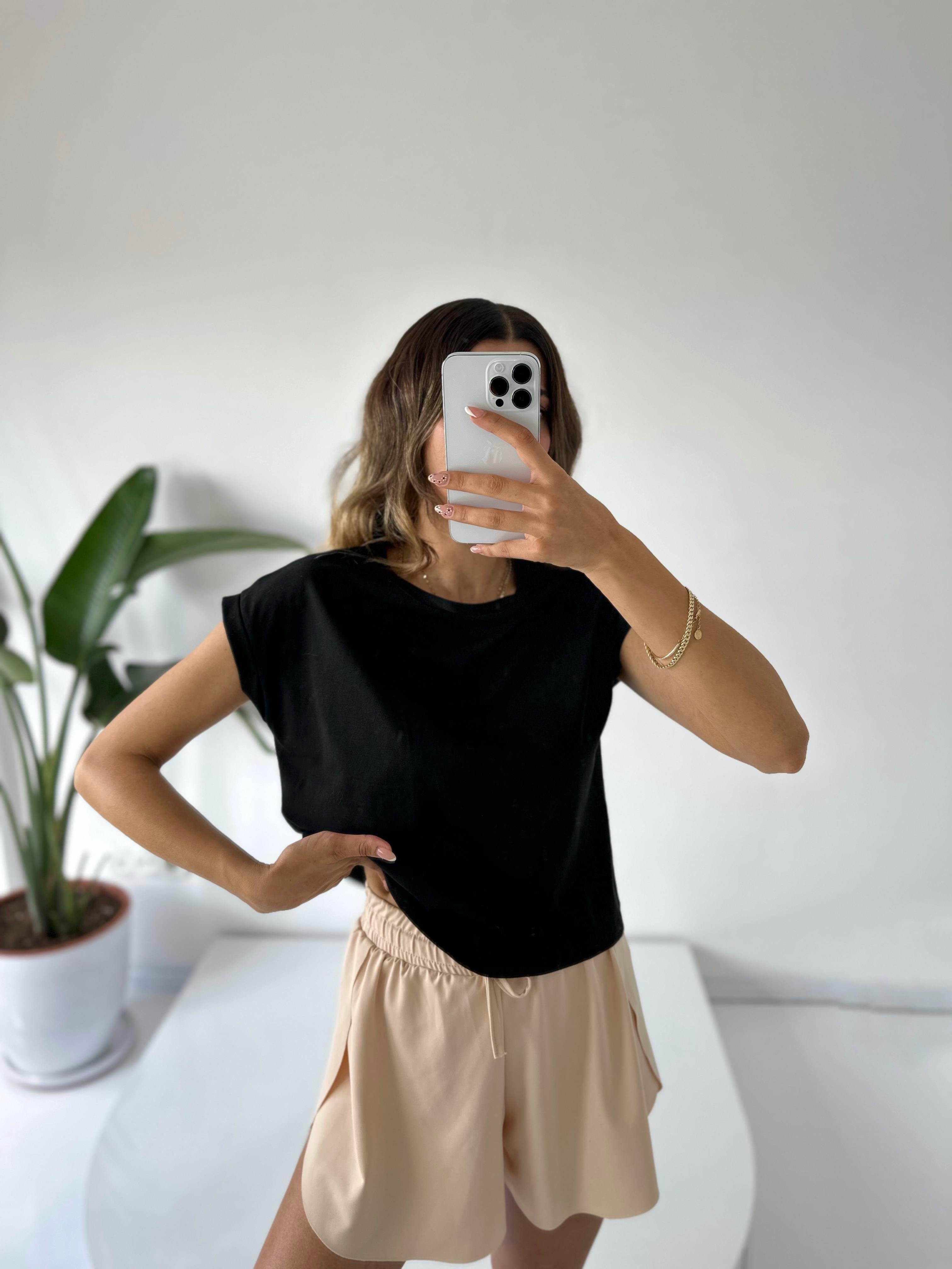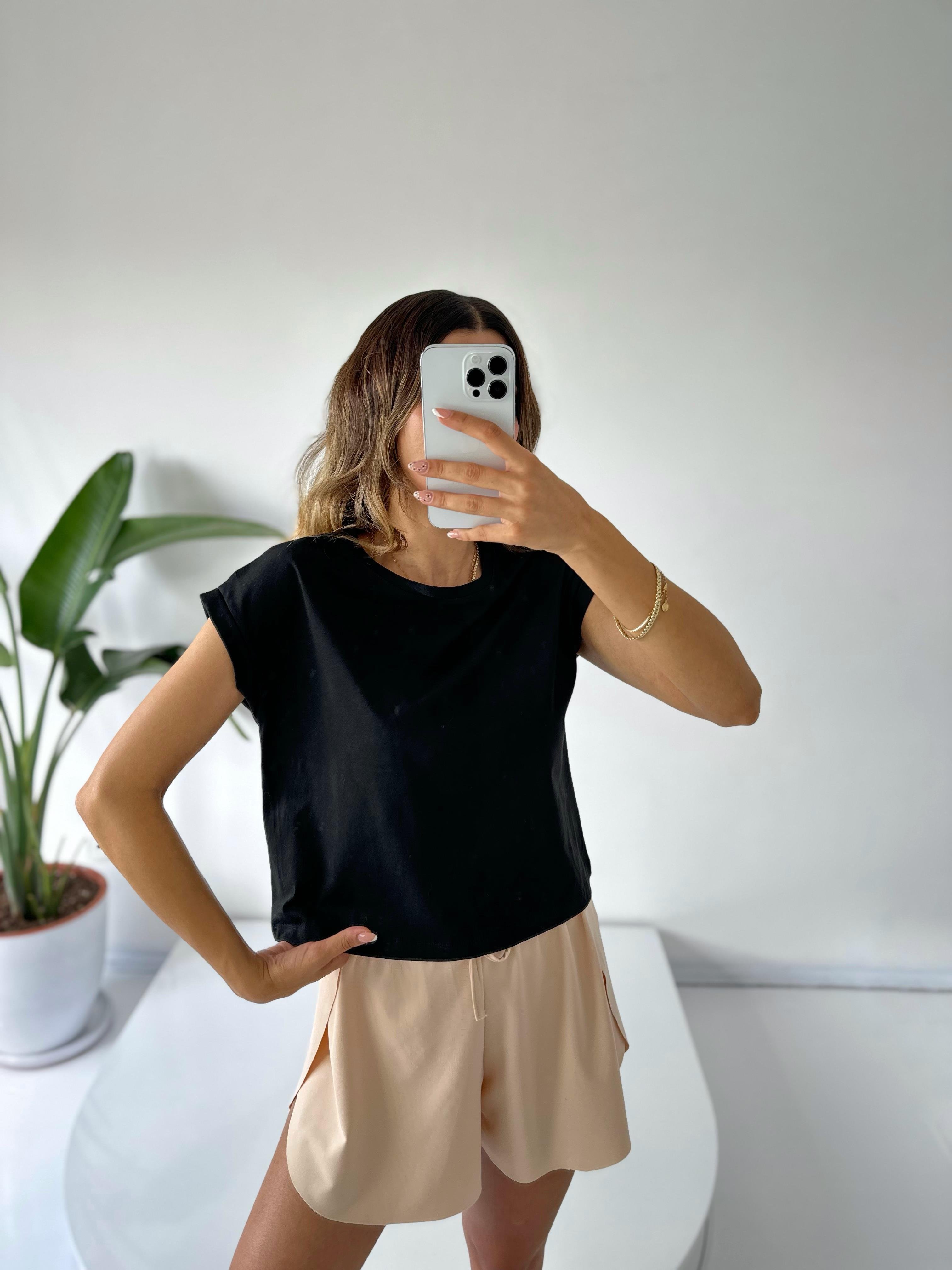 تي شيرت بيسيك أسود بأكمام قابلة للطي