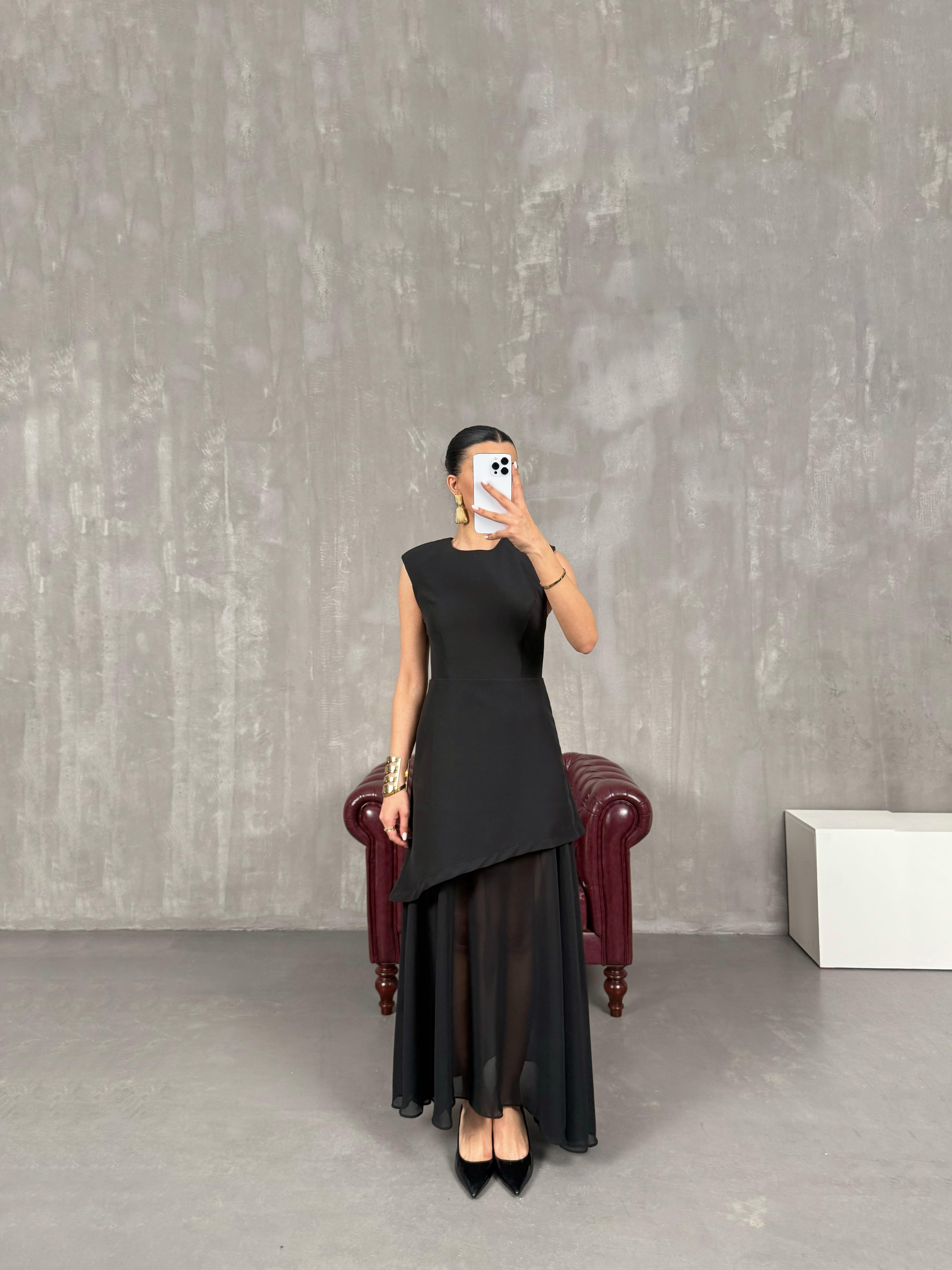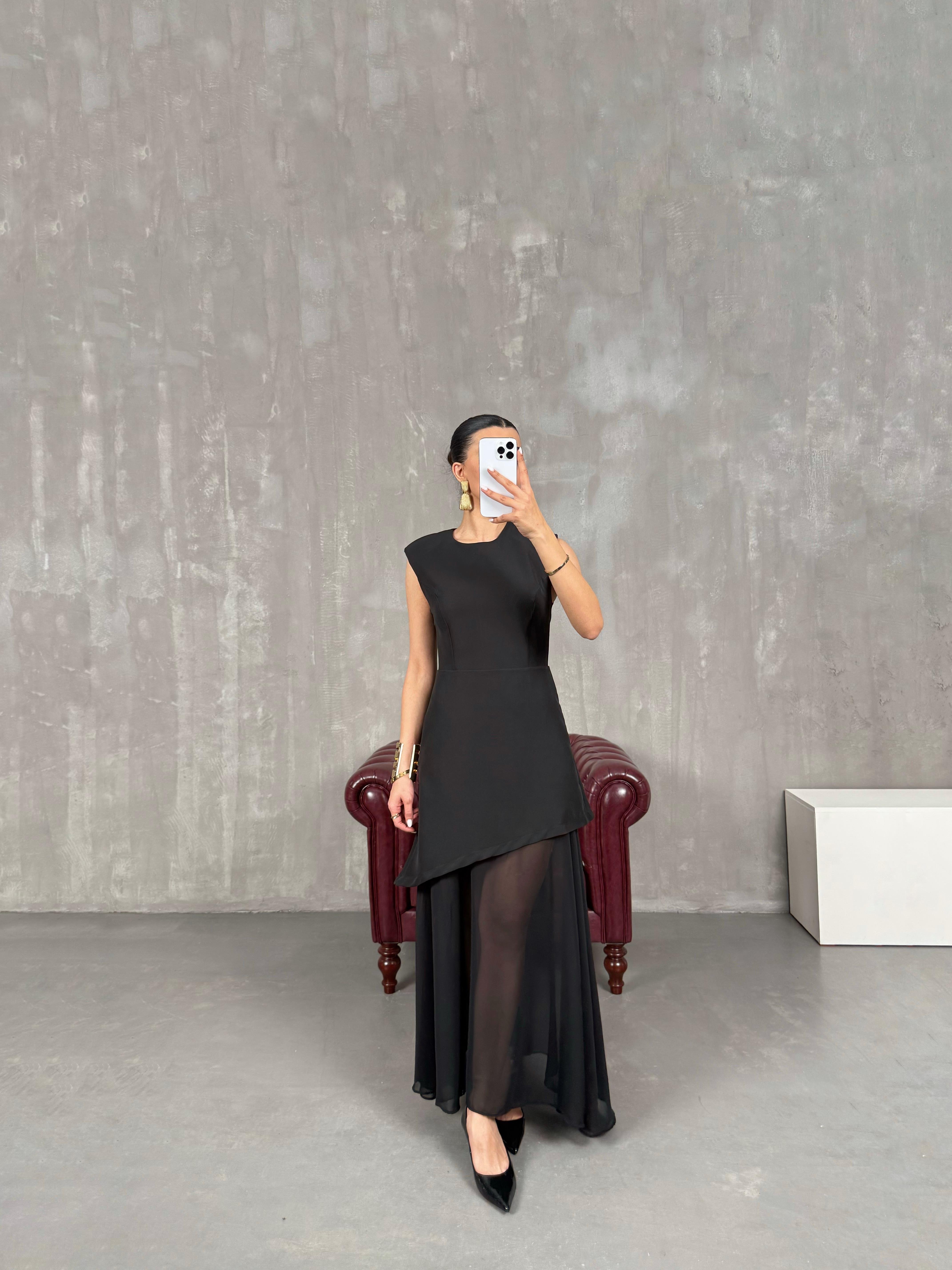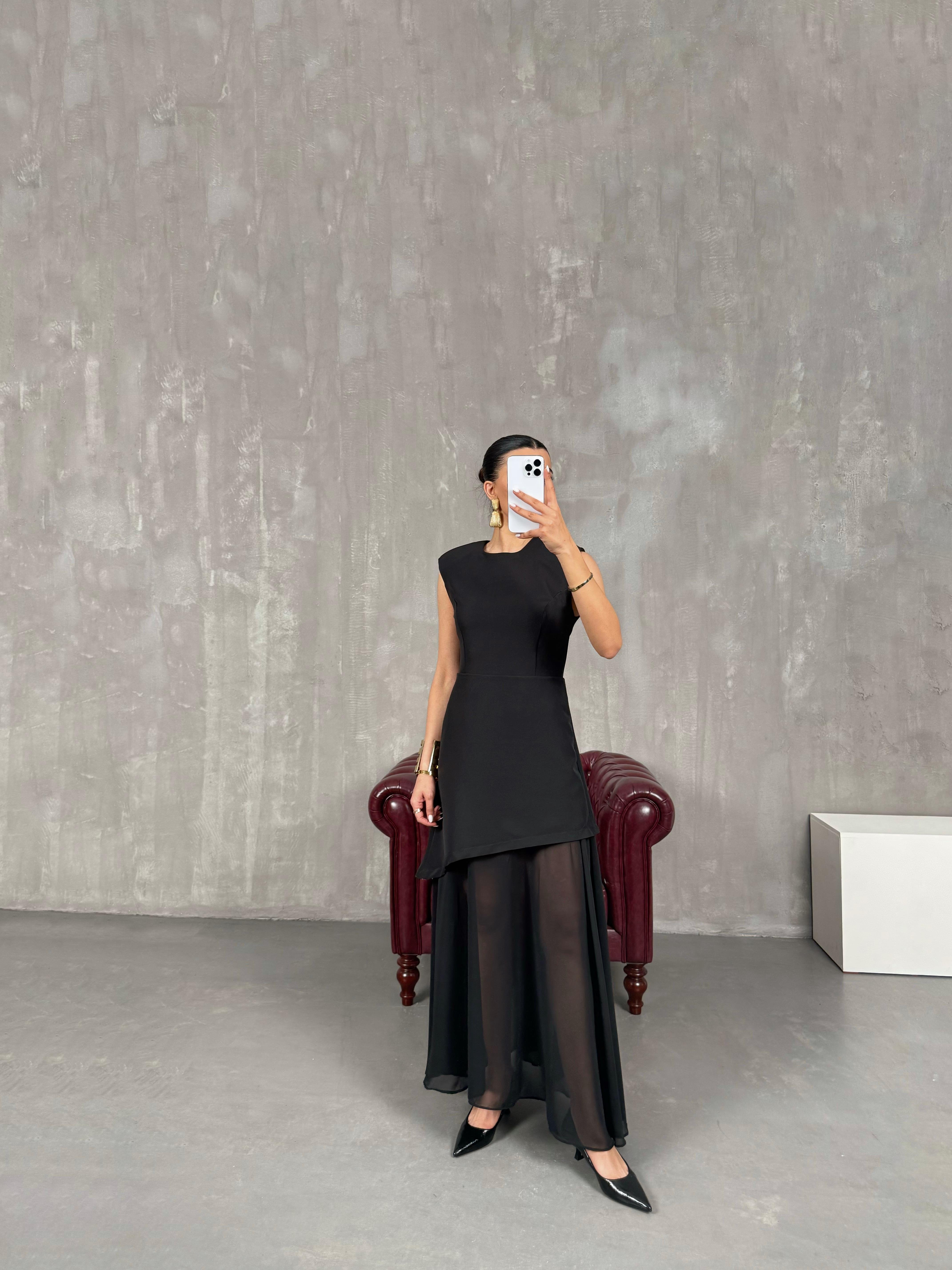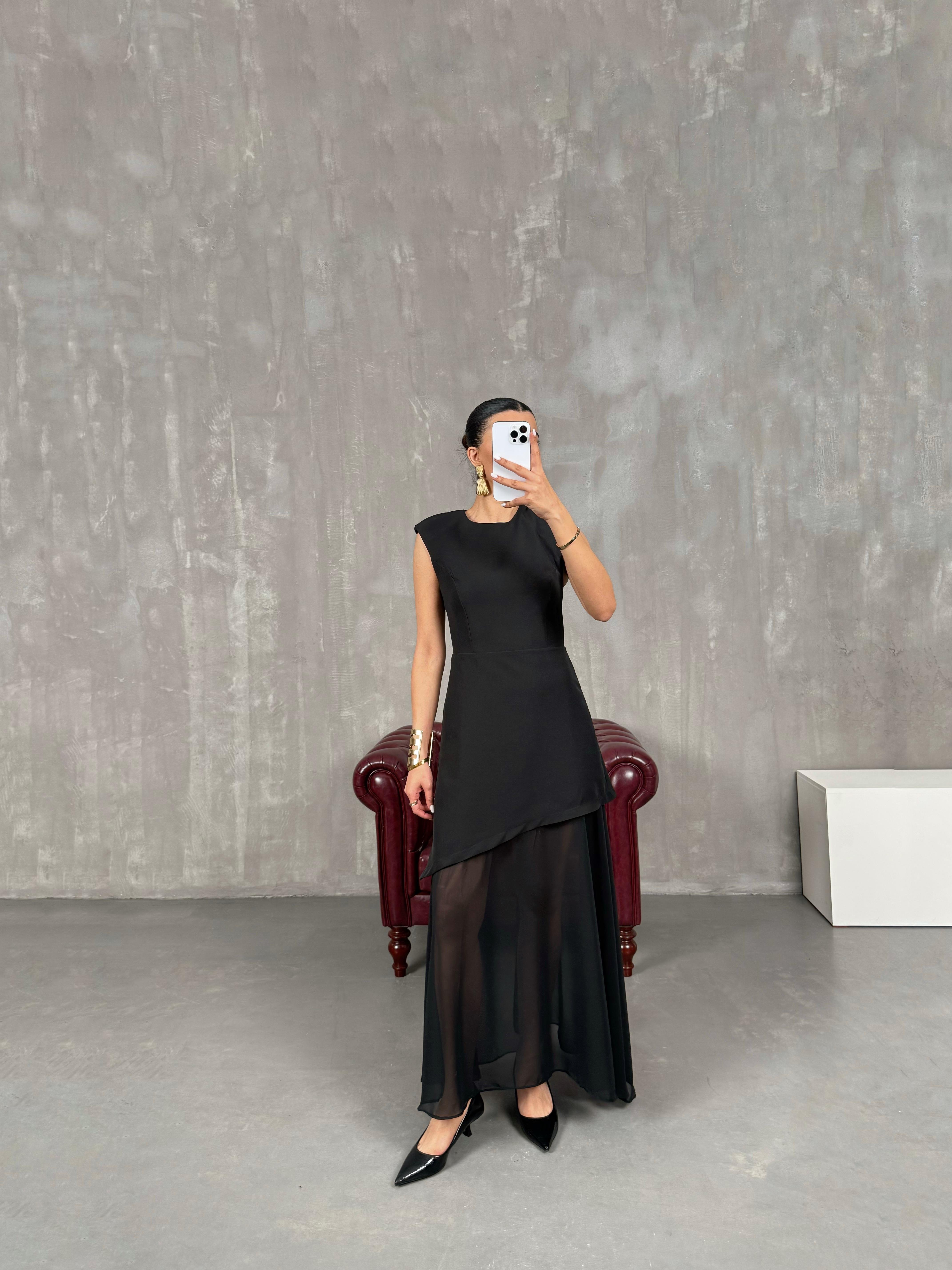فستان أسود بأكمام صفرية وأكتاف مبطنة وتفاصيل تول سفلية Gaus00011
