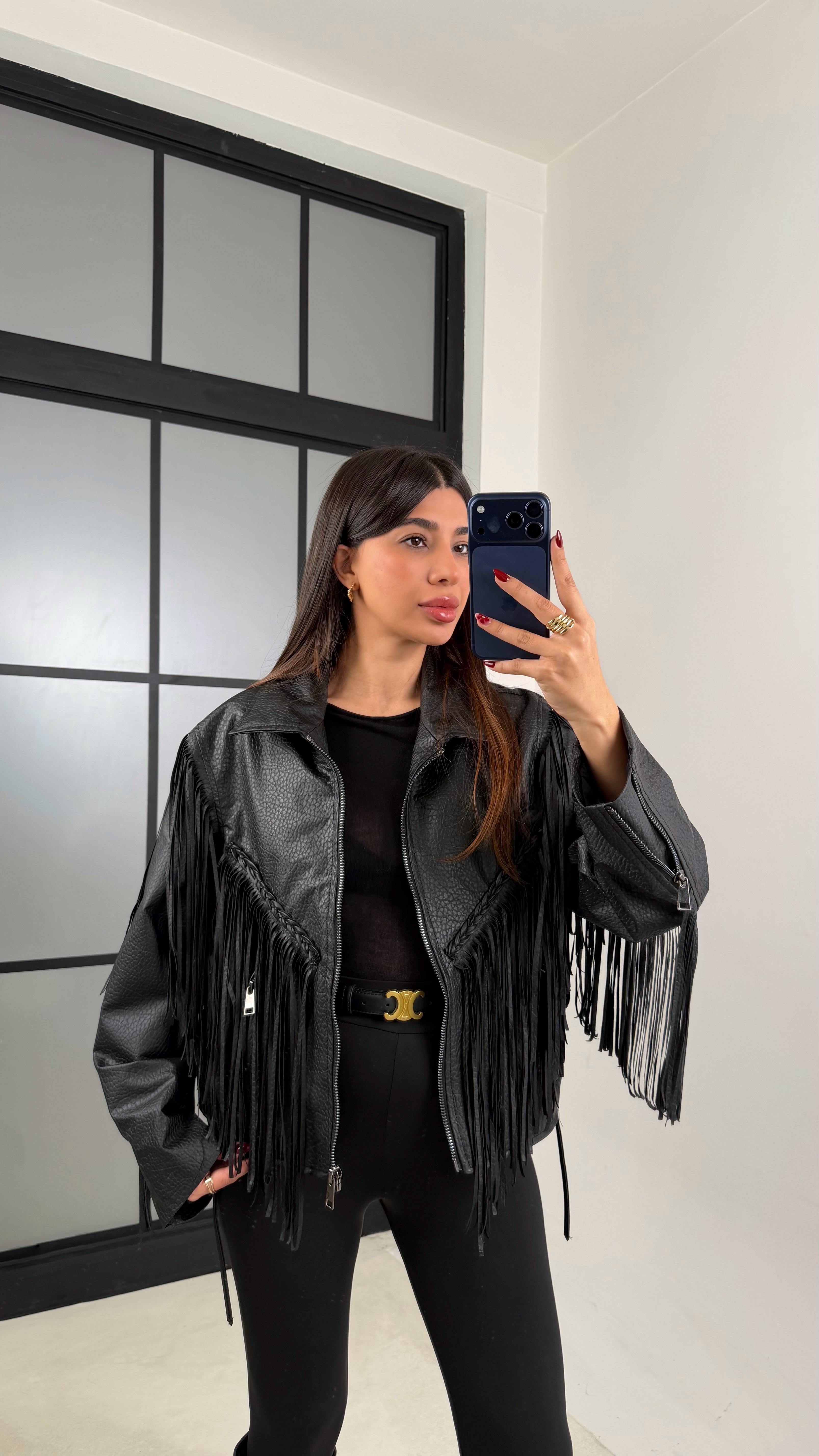 Siyah Yılan Derisi Desenli Astarlı Püsküllü Deri Ceket GAUS-00668
